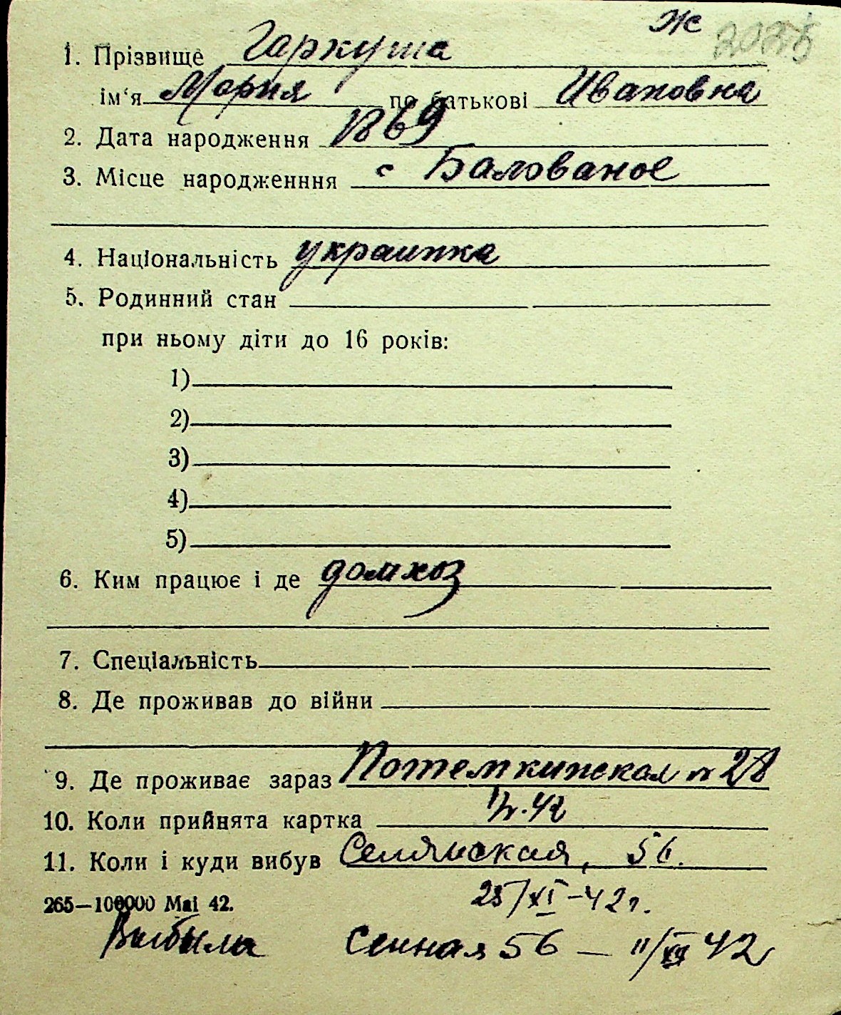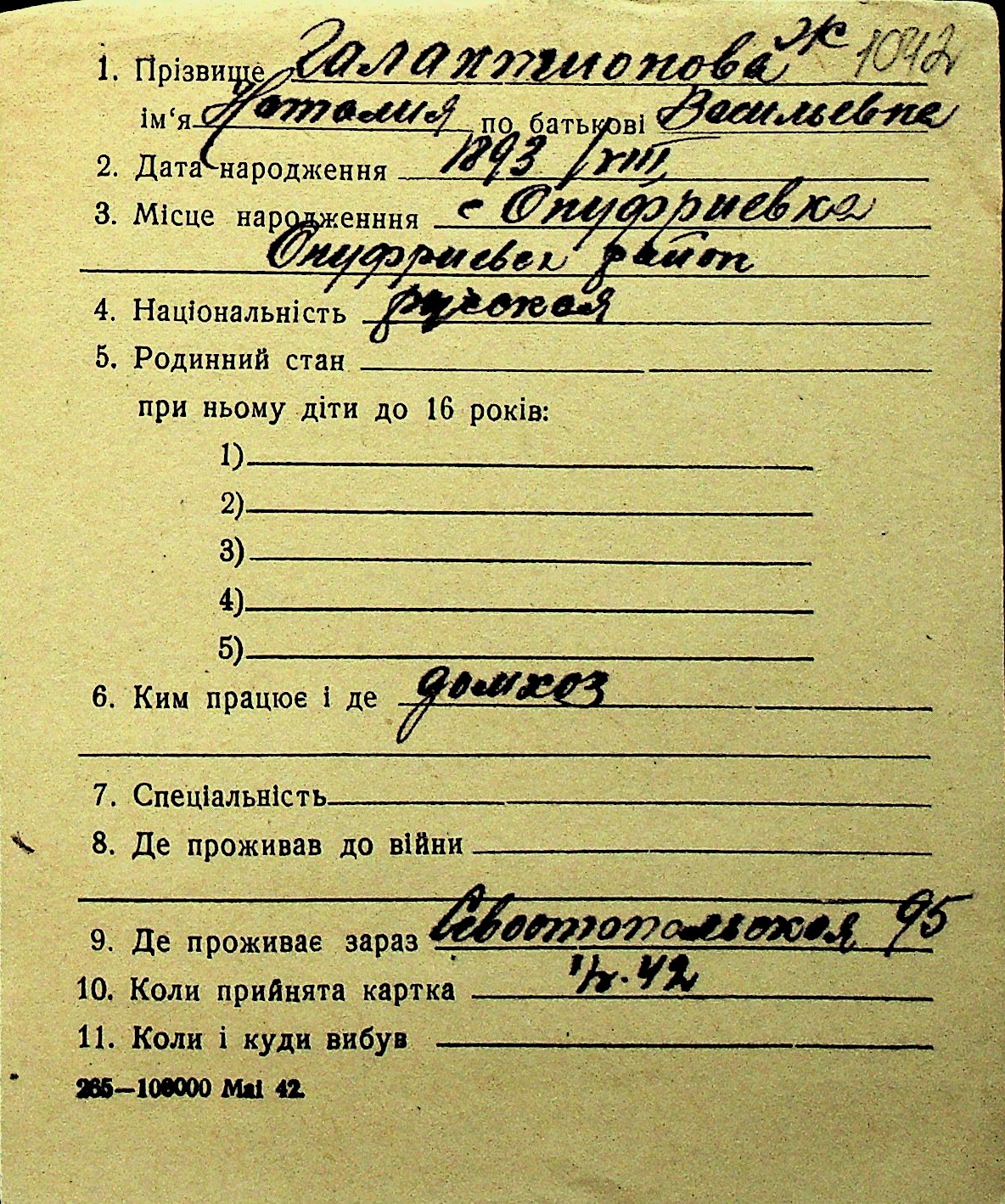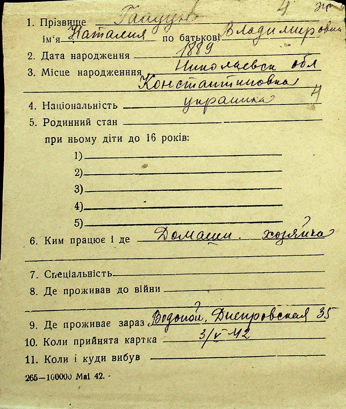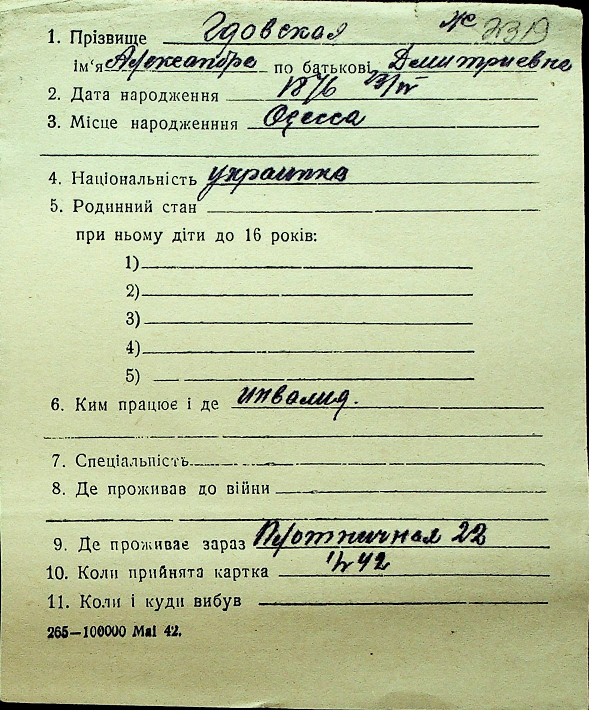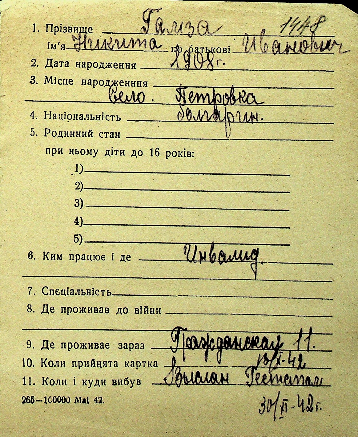 • • Перелік карток до фонду № Н-1016