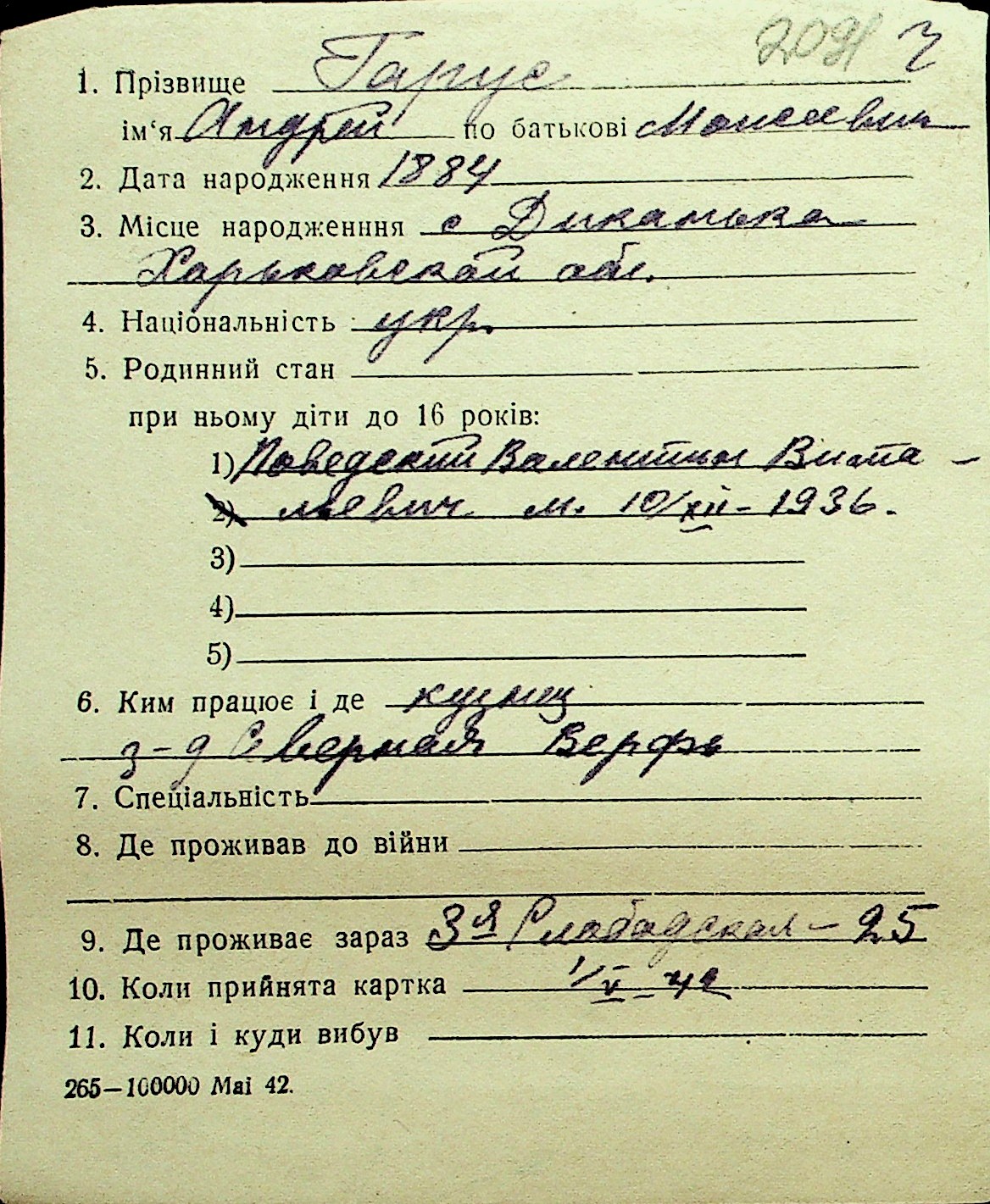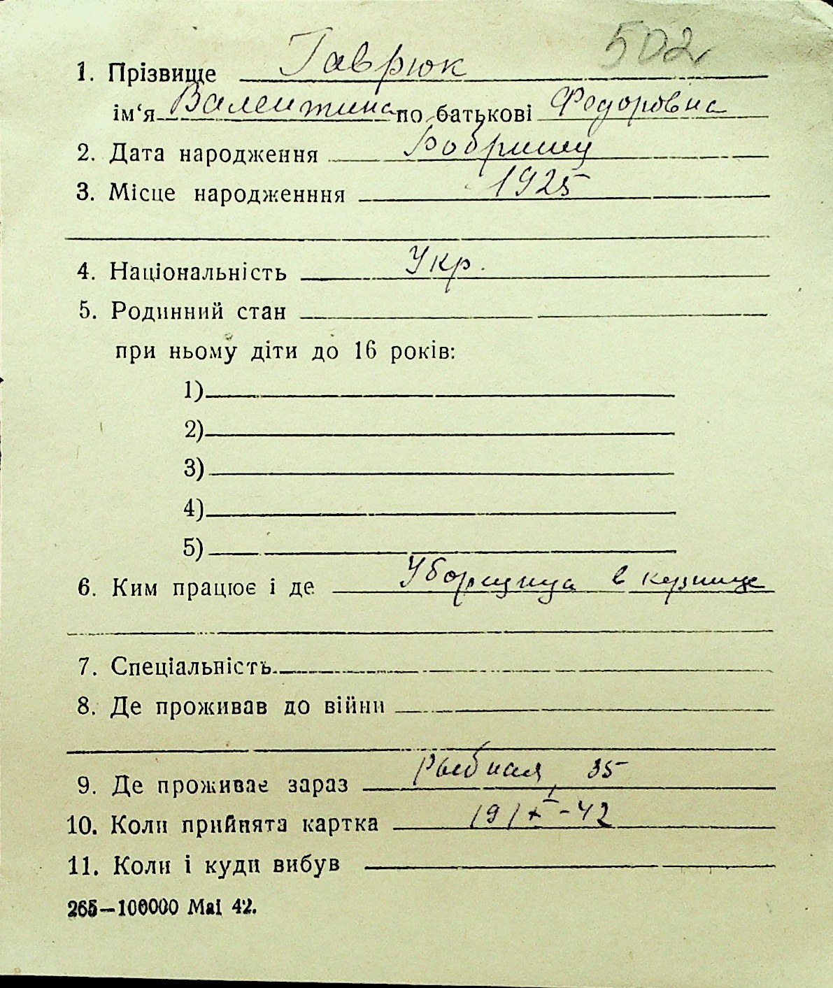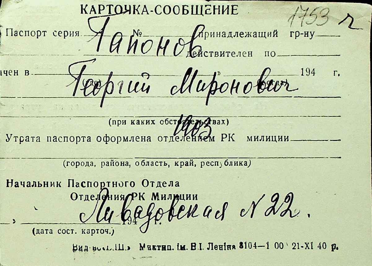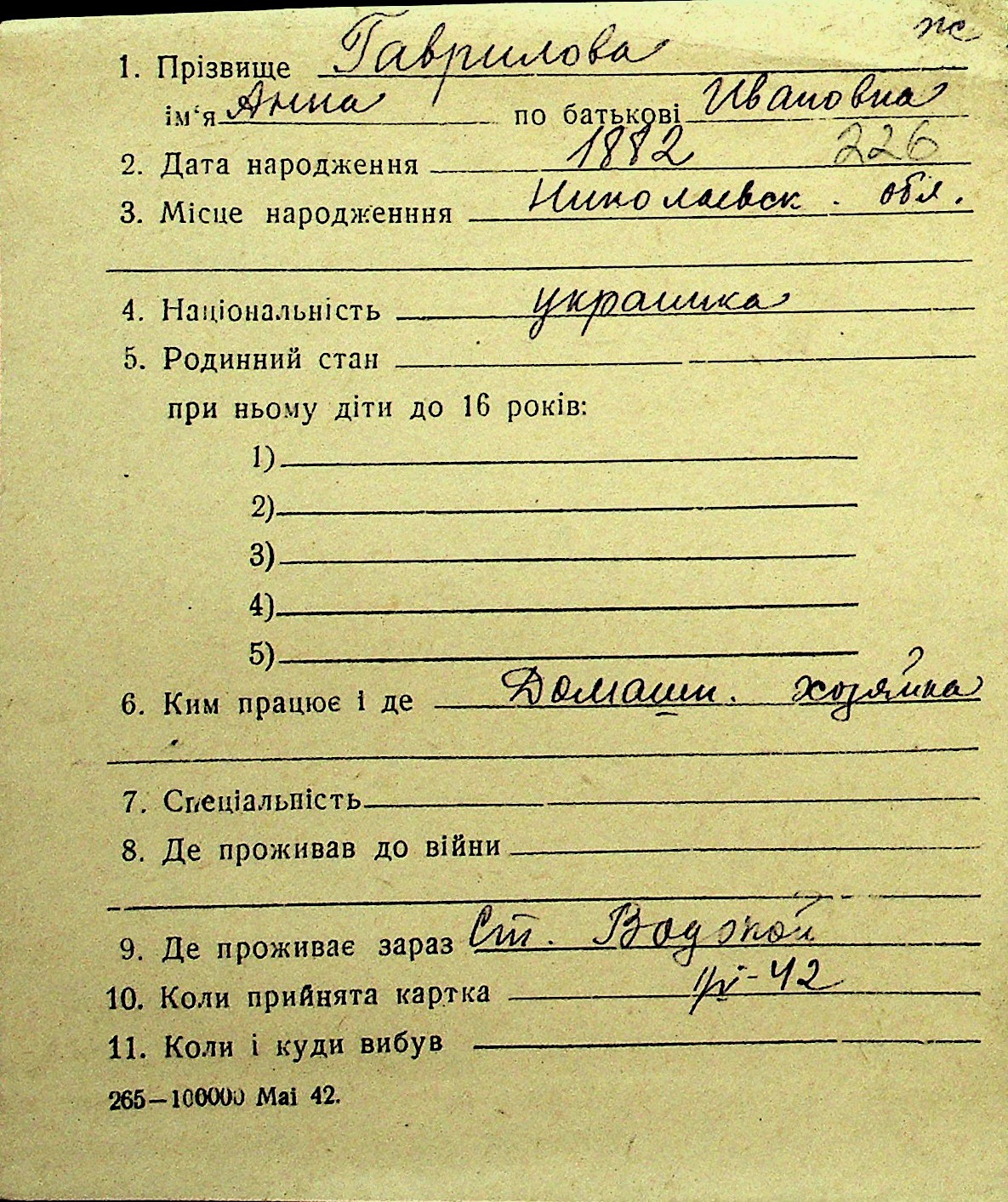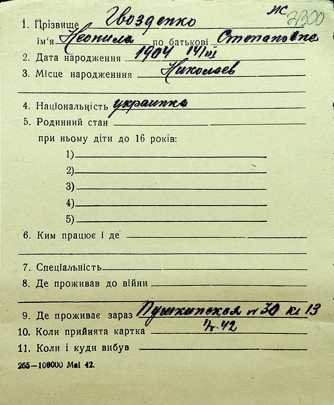 • • Перелік карток до фонду № Н-1016