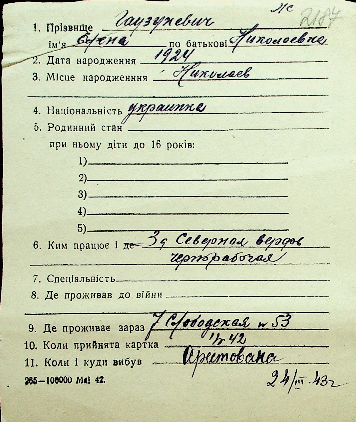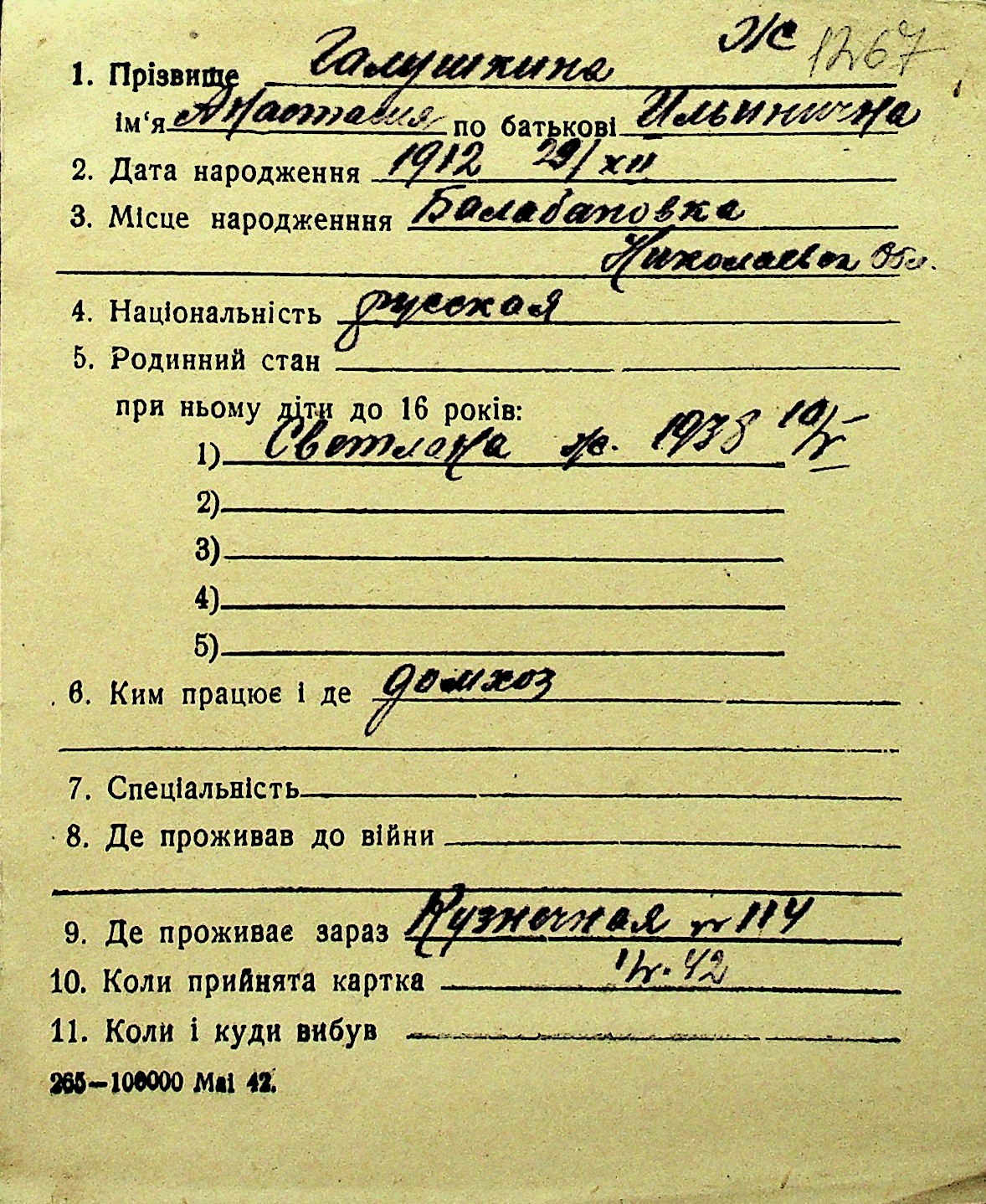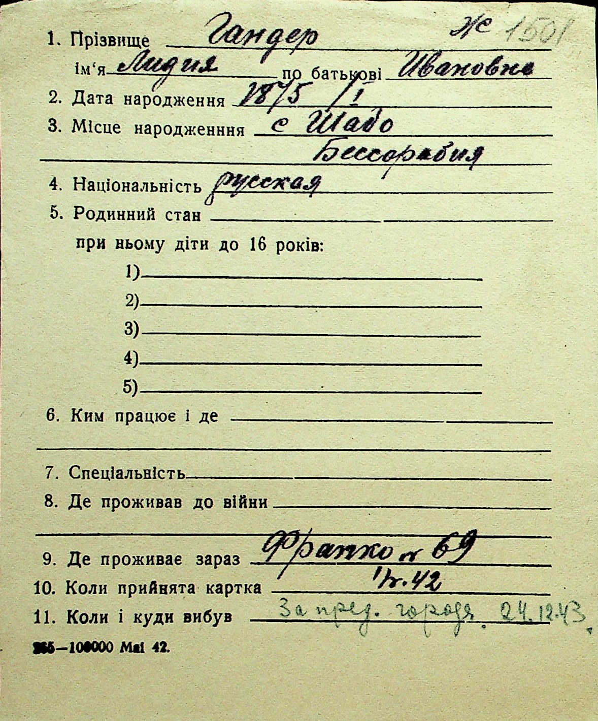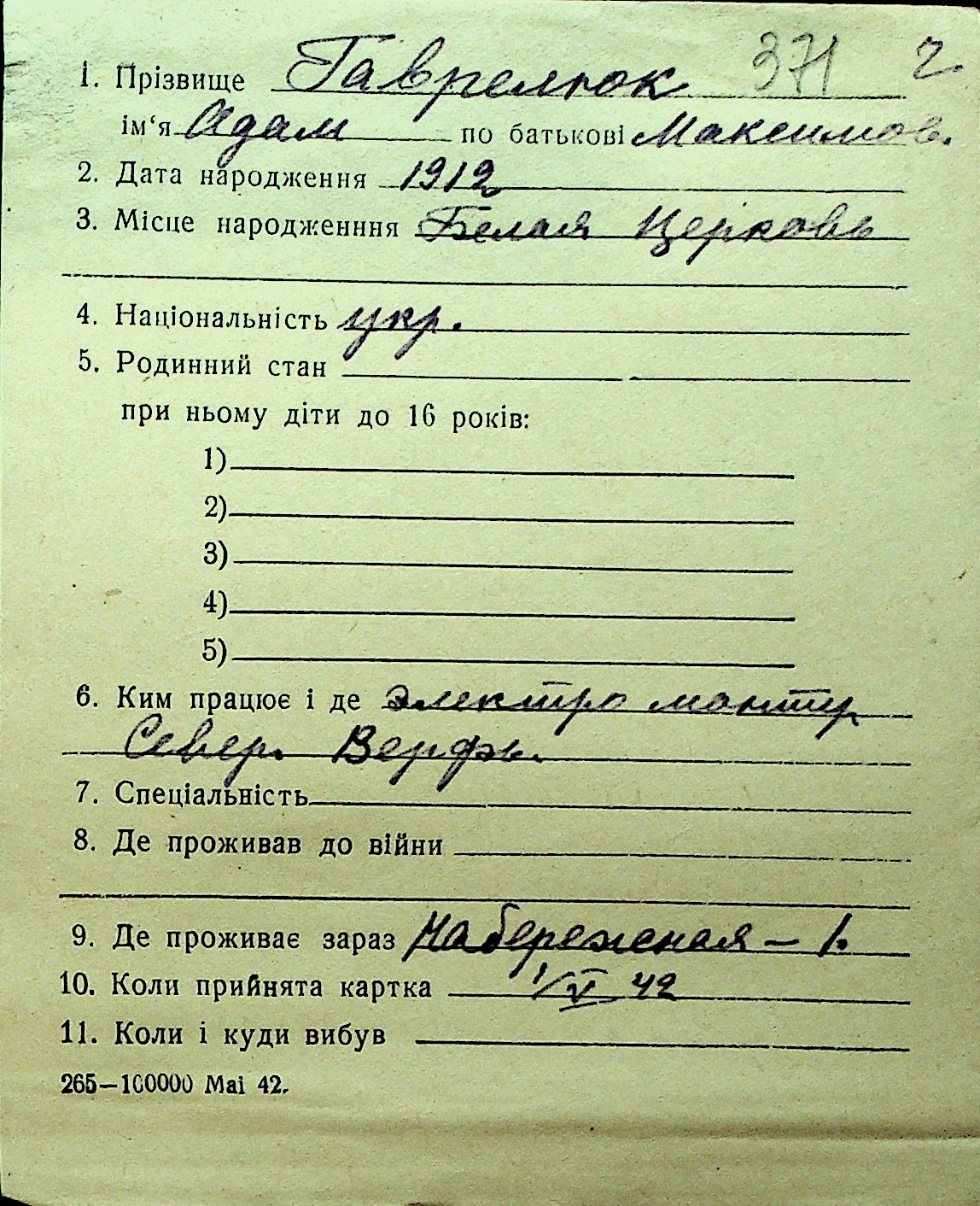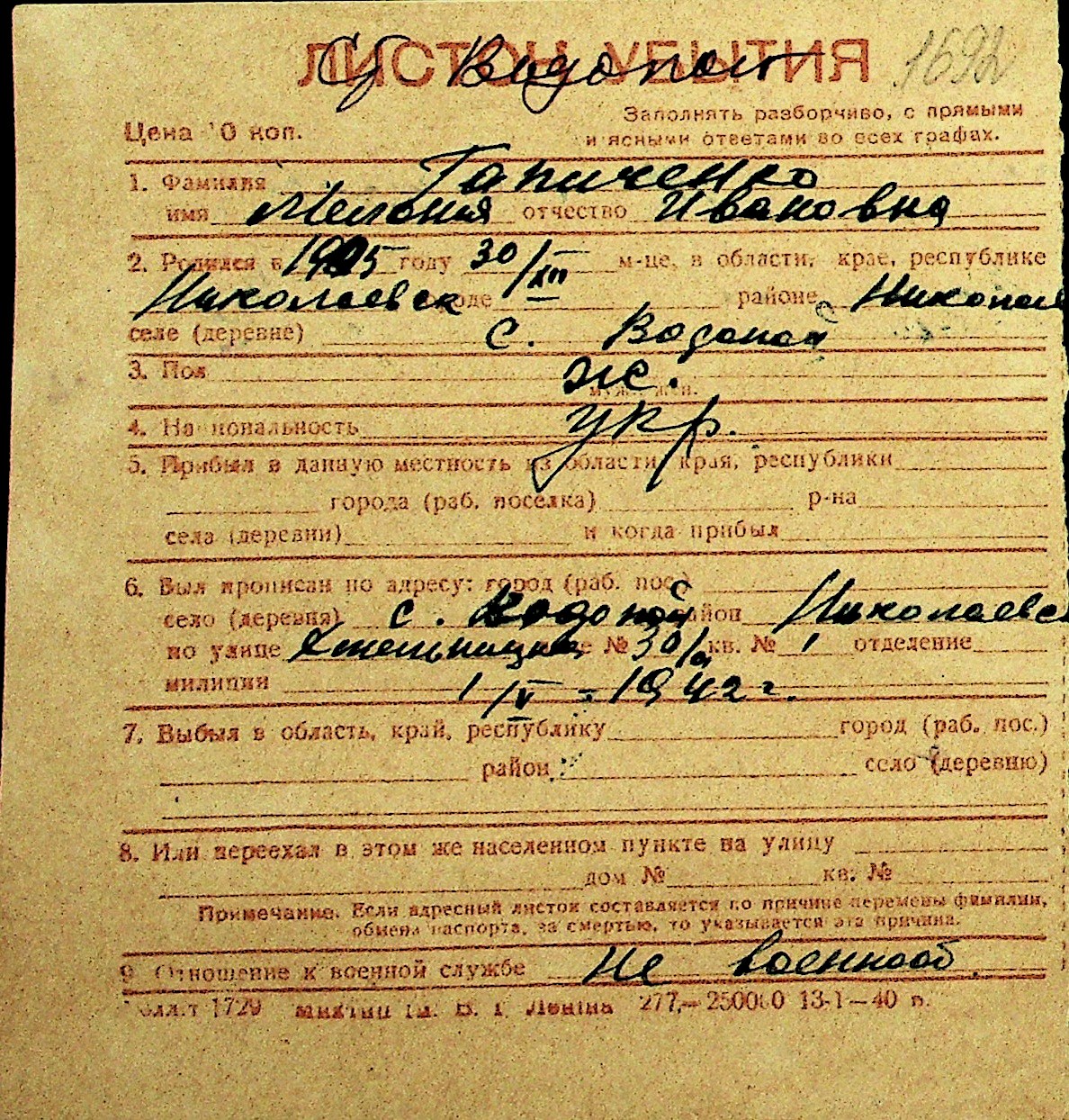 • • Перелік карток до фонду № Н-1016