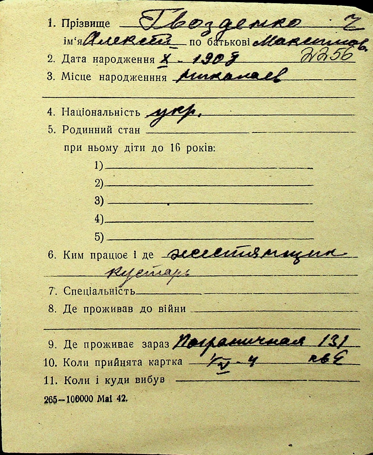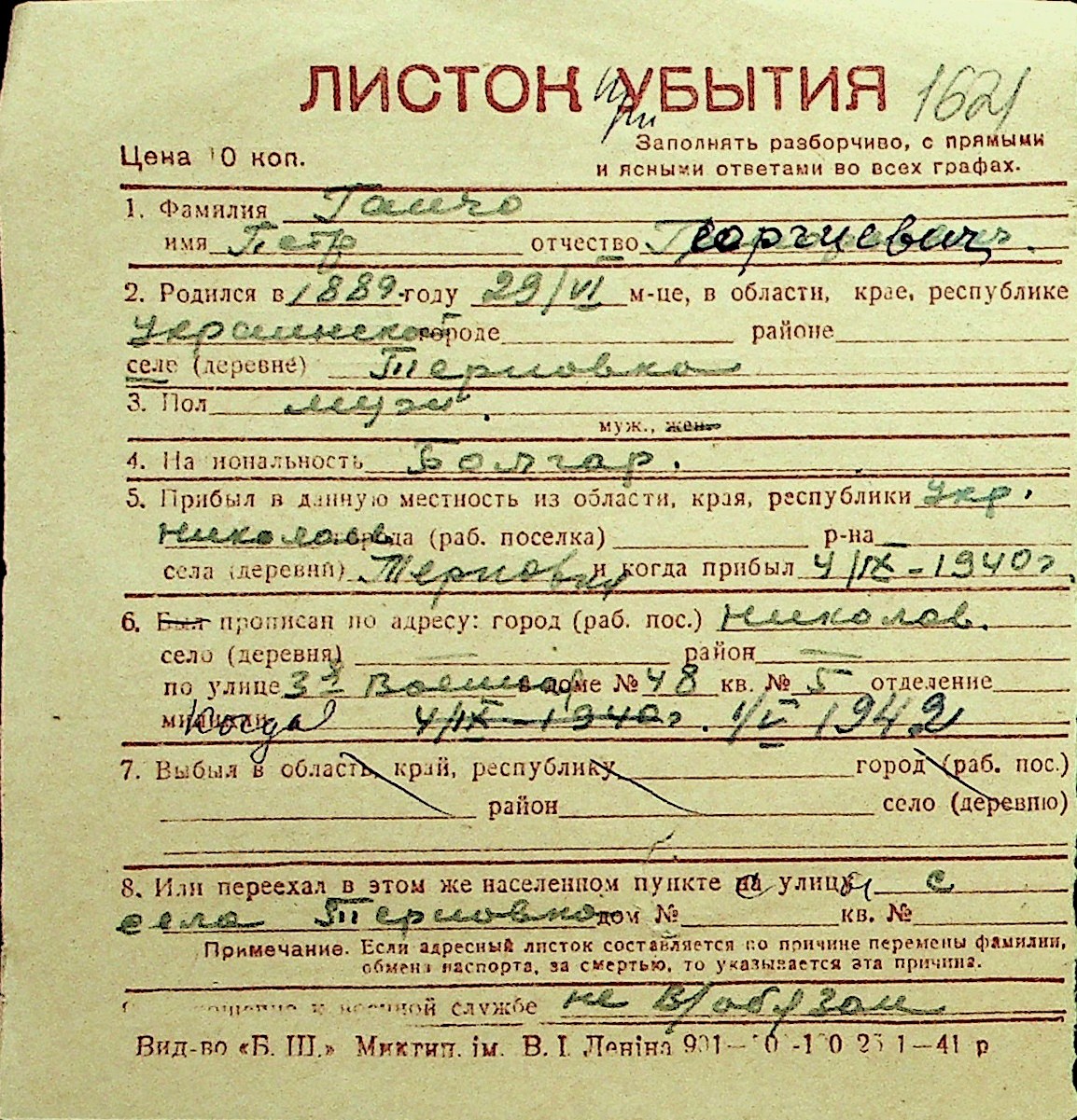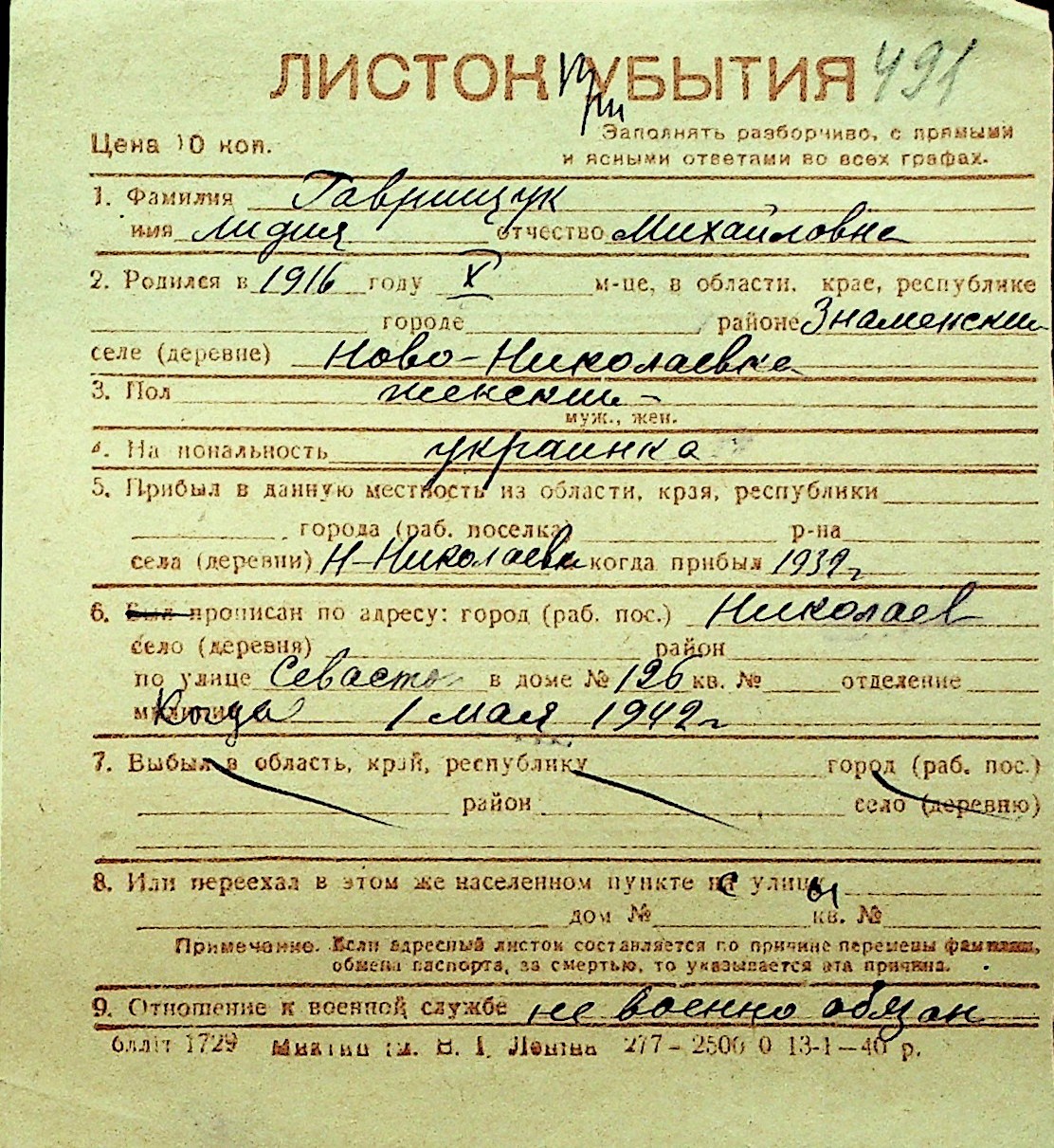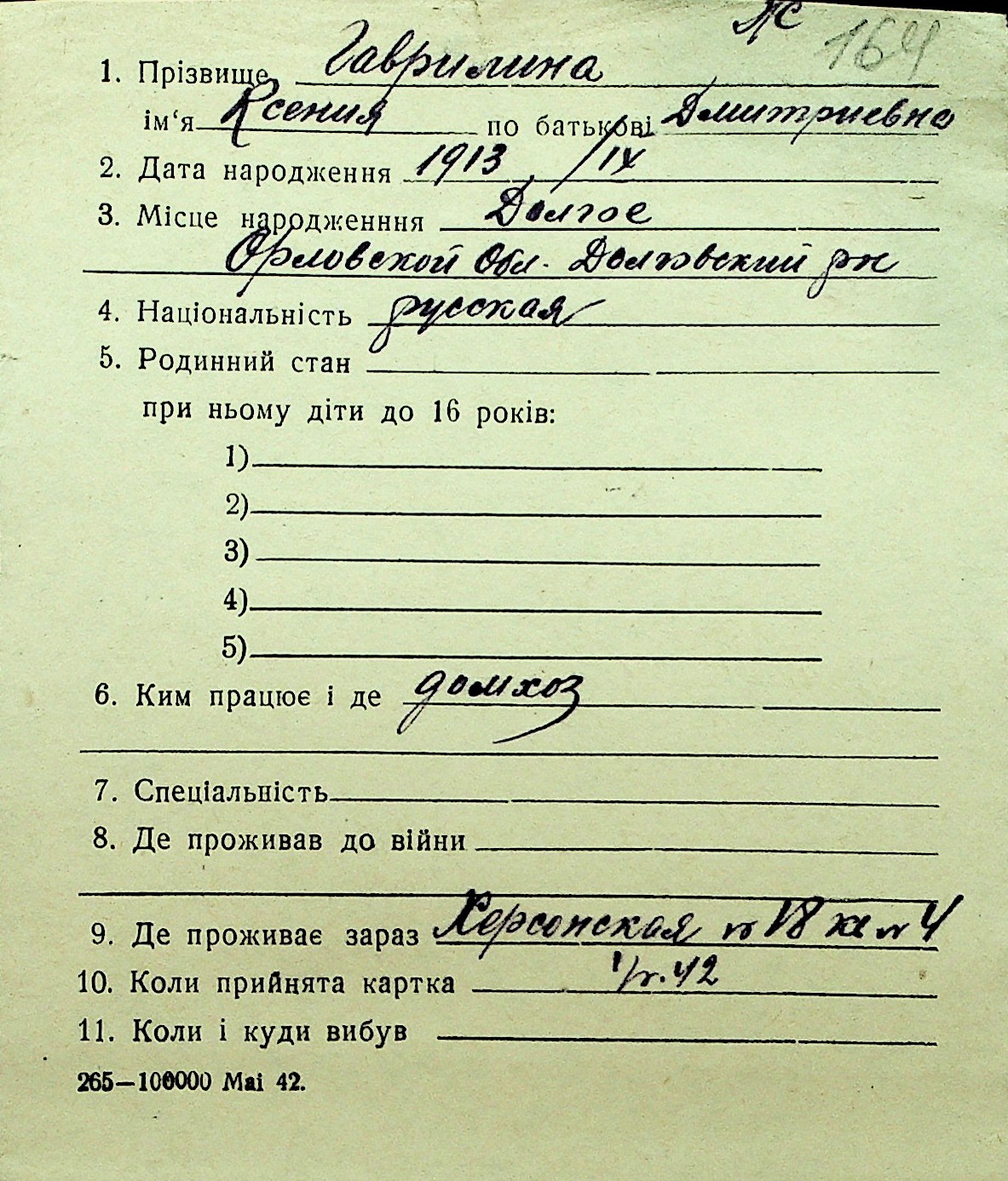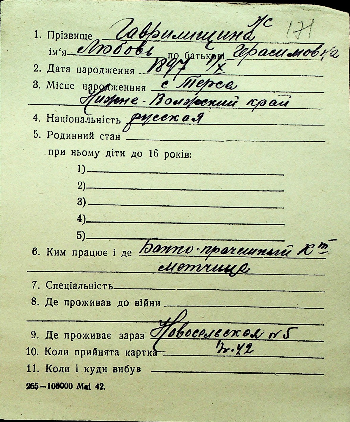 • • Перелік карток до фонду № Н-1016
