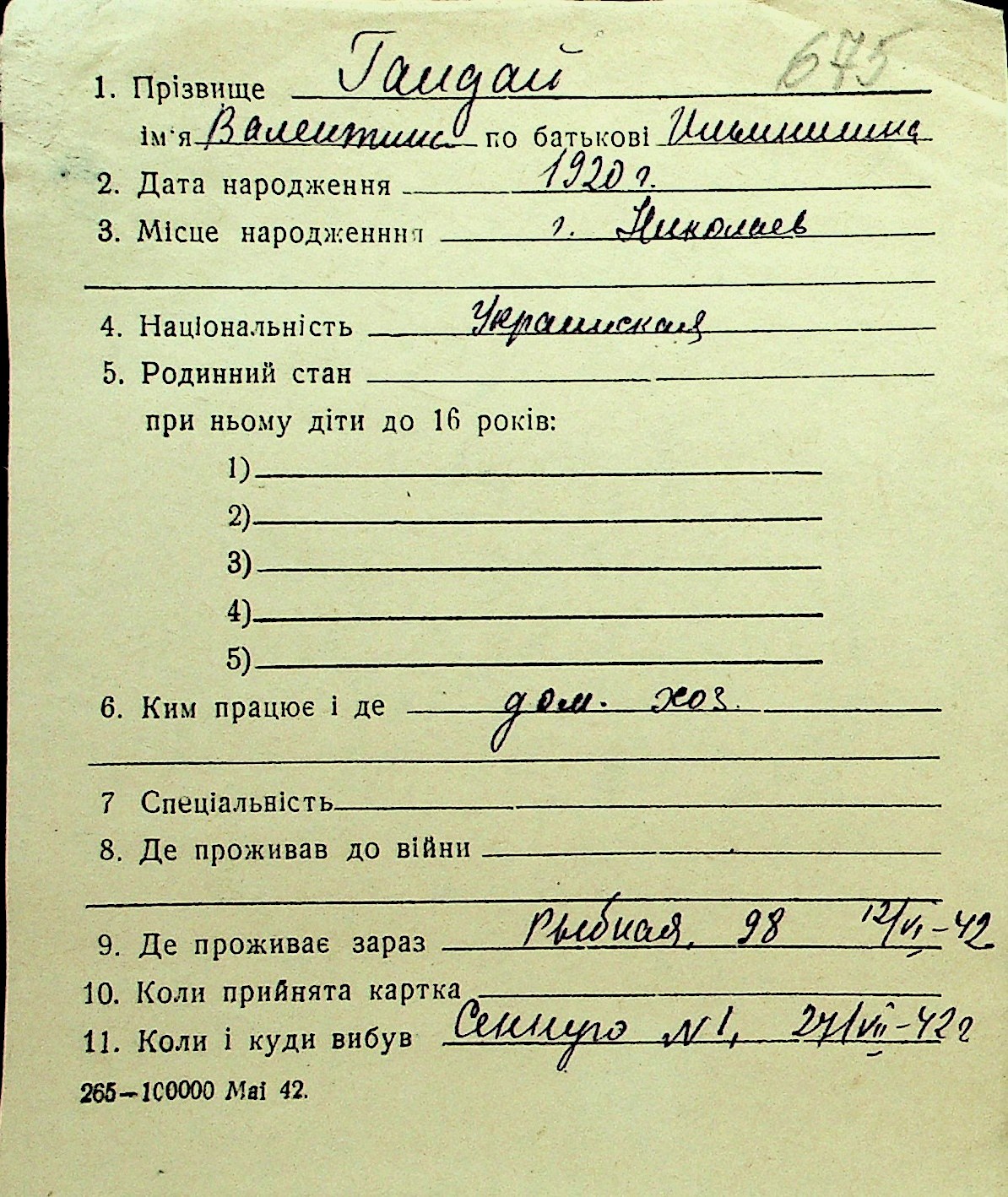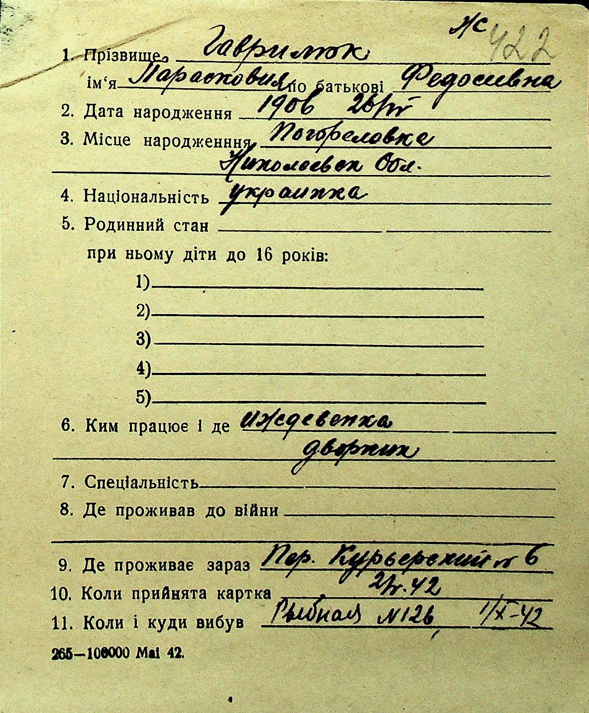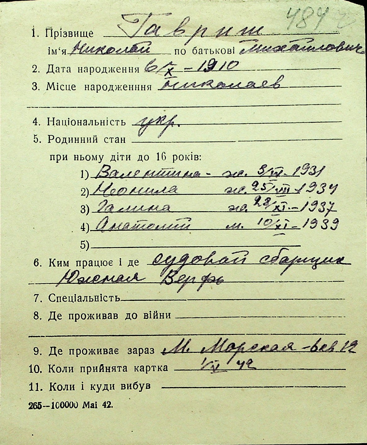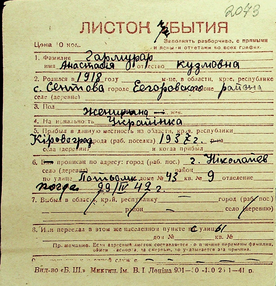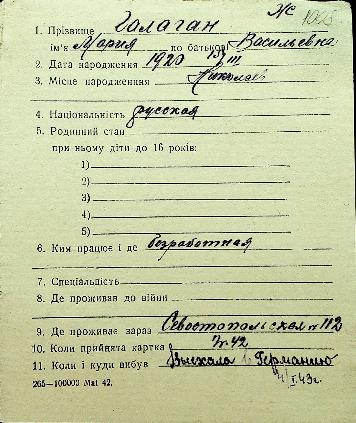 • • Перелік карток до фонду № Н-1016