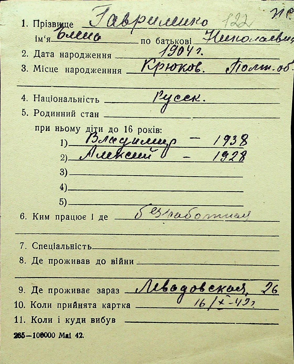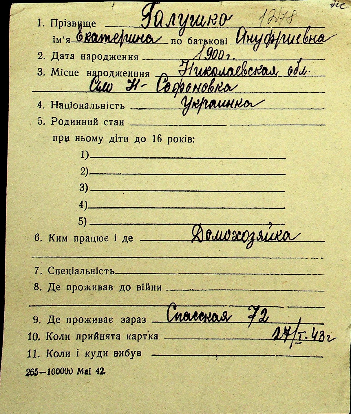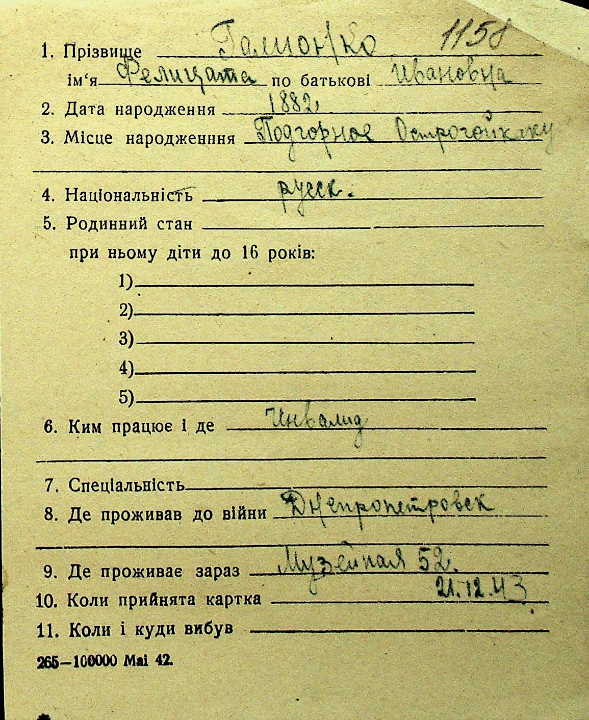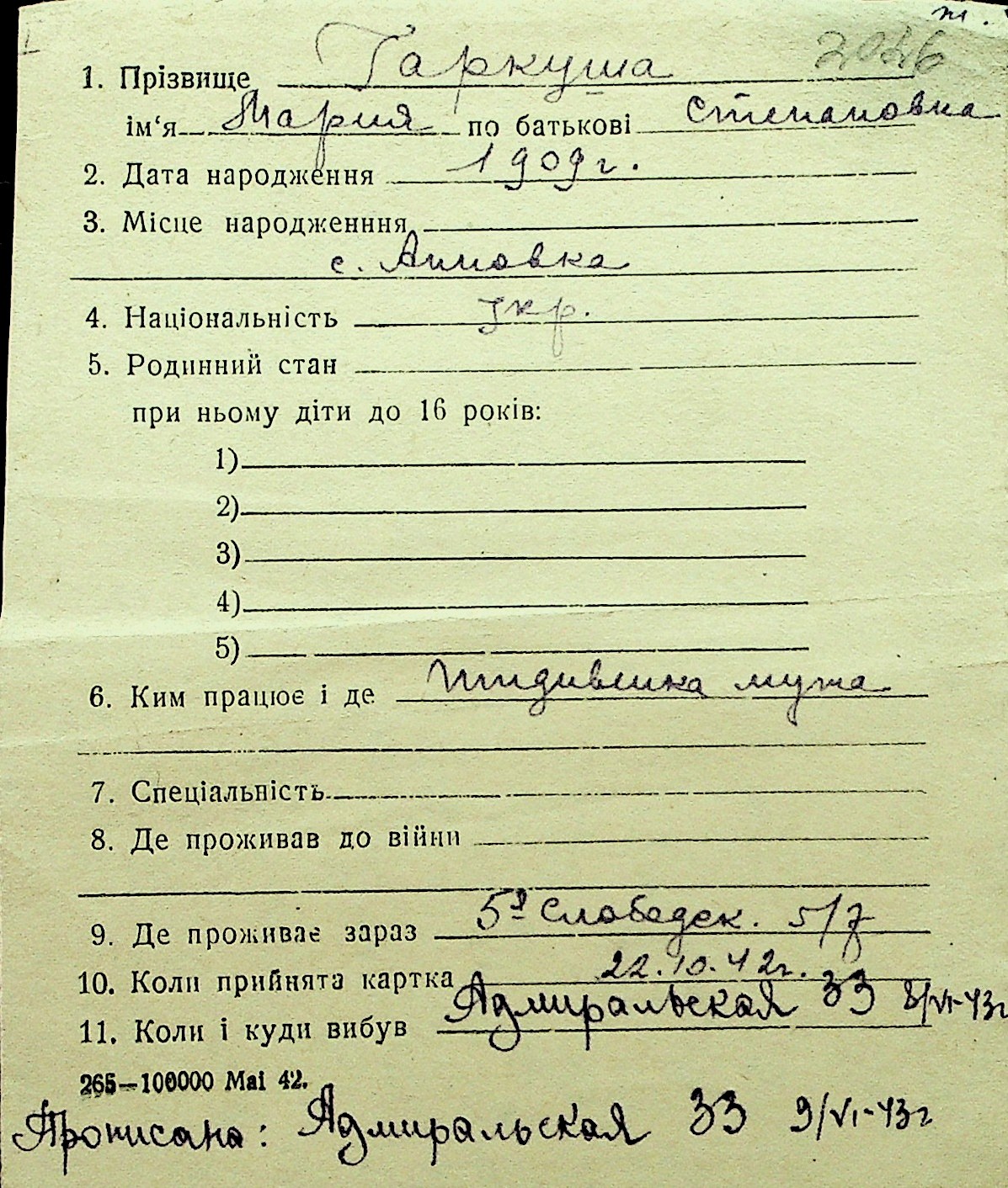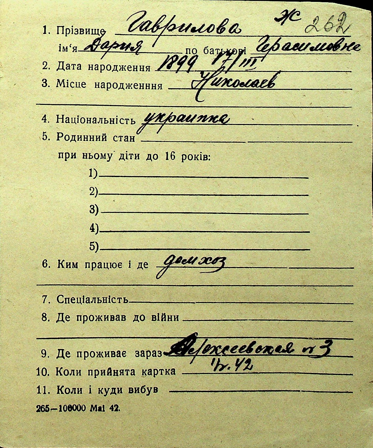 • • Перелік карток до фонду № Н-1016
