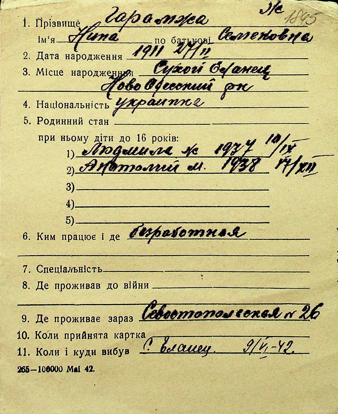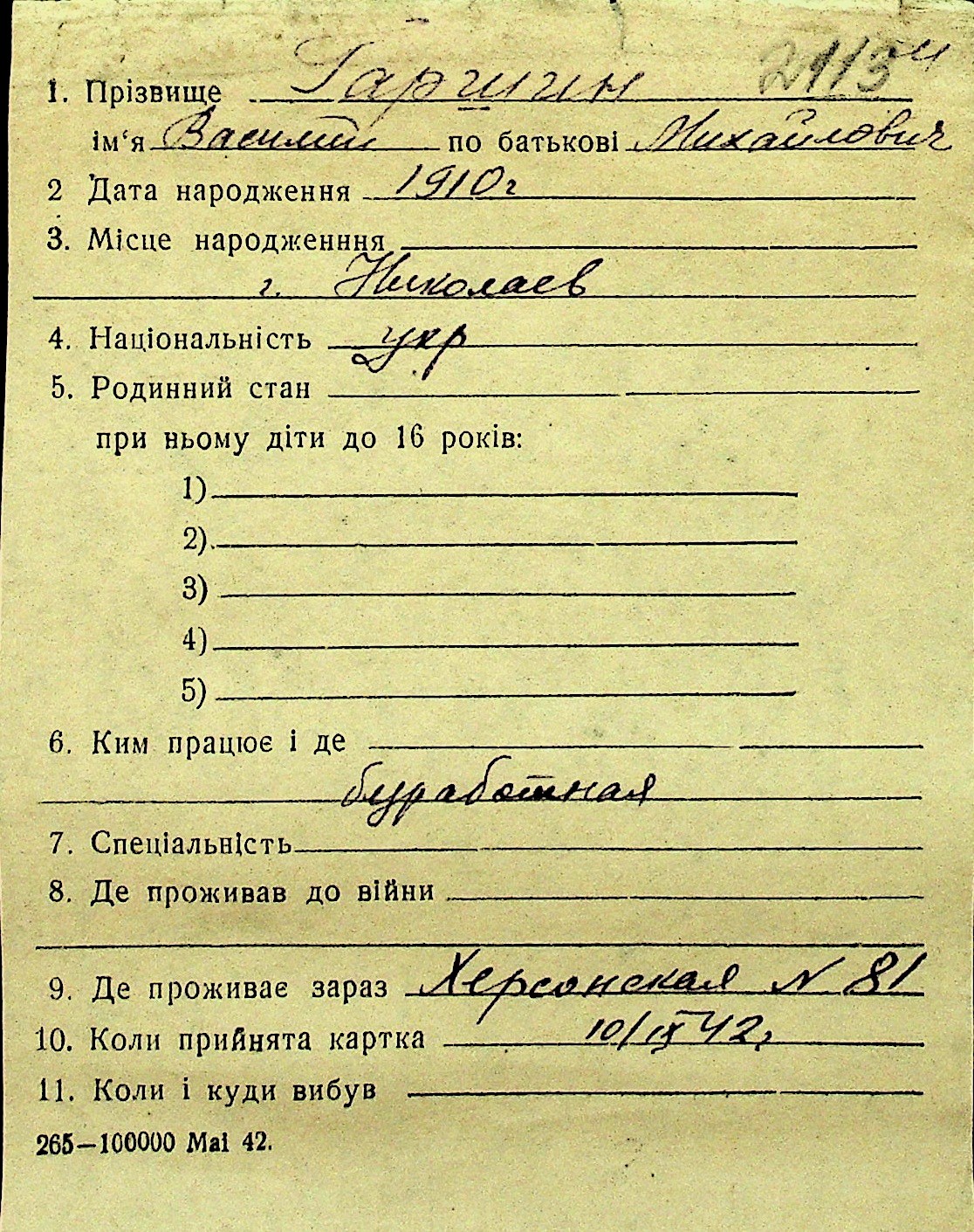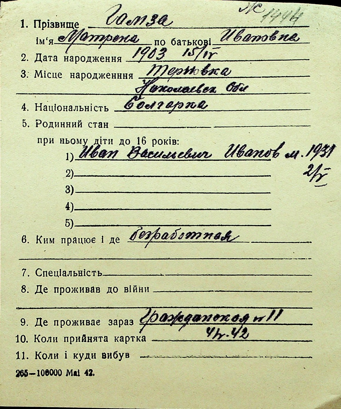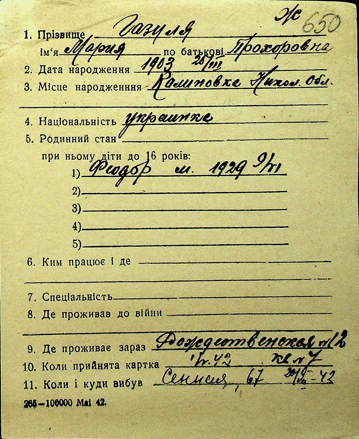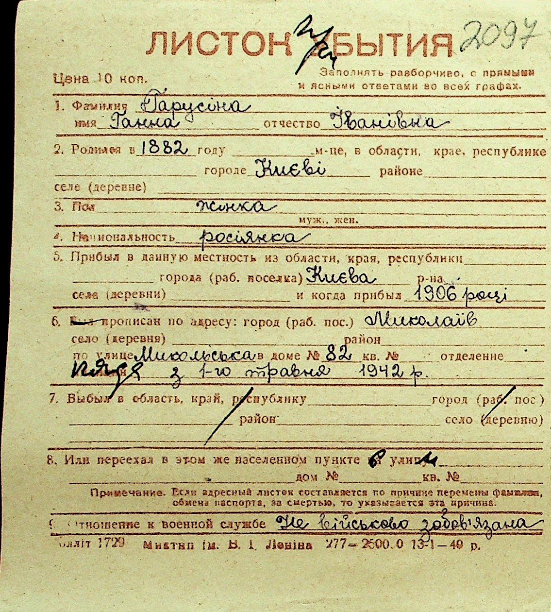 • • Перелік карток до фонду № Н-1016