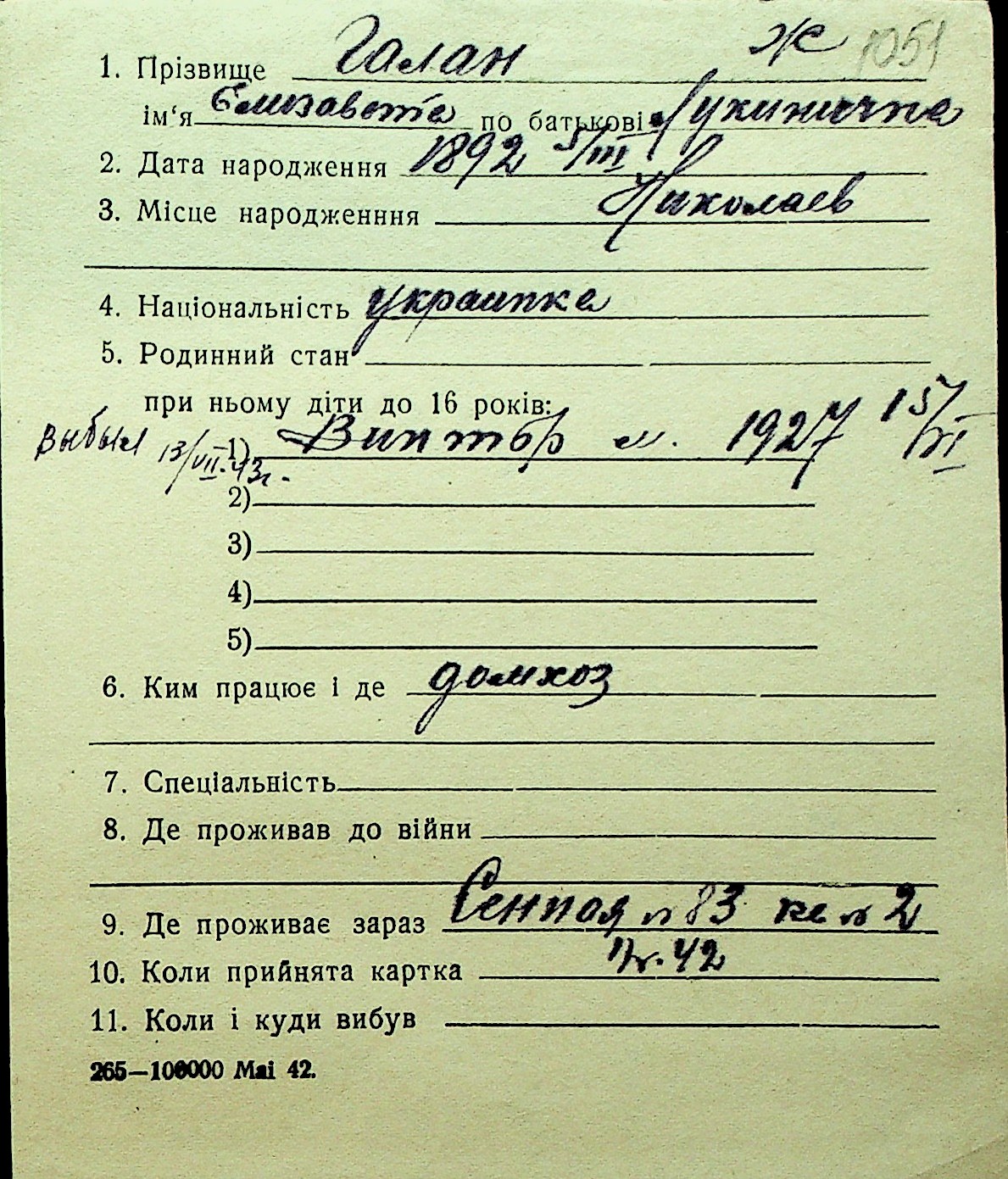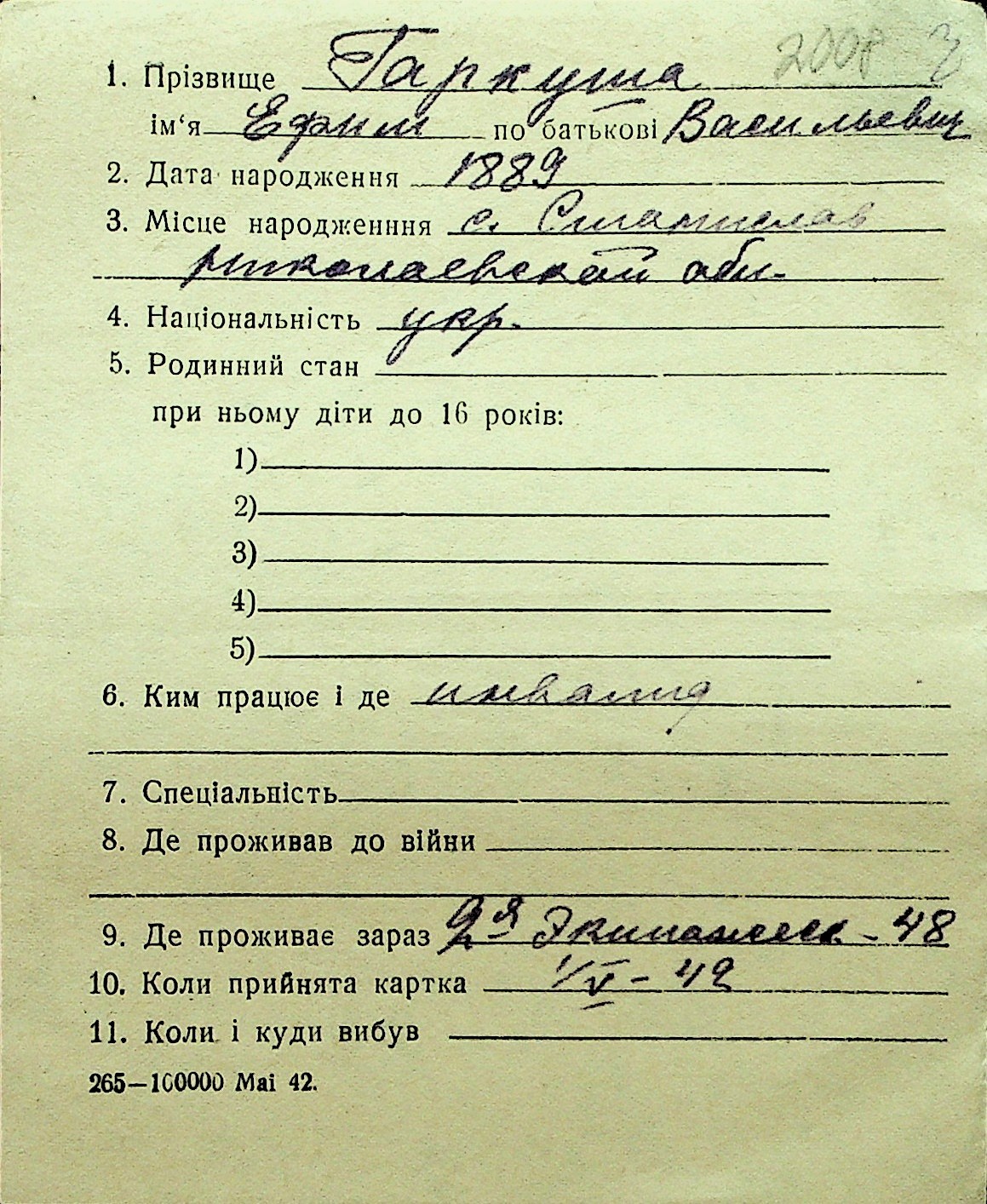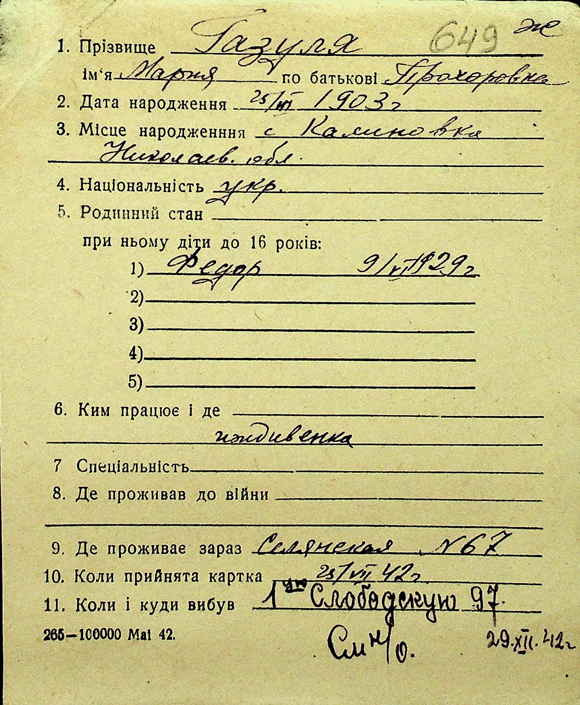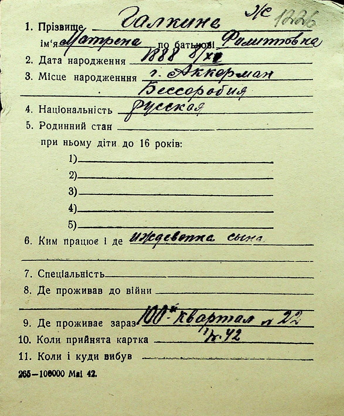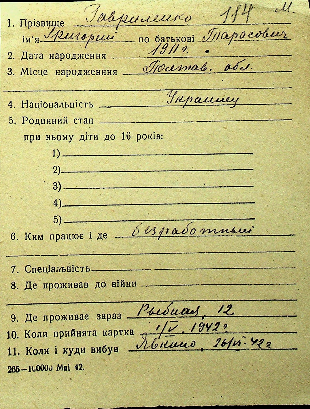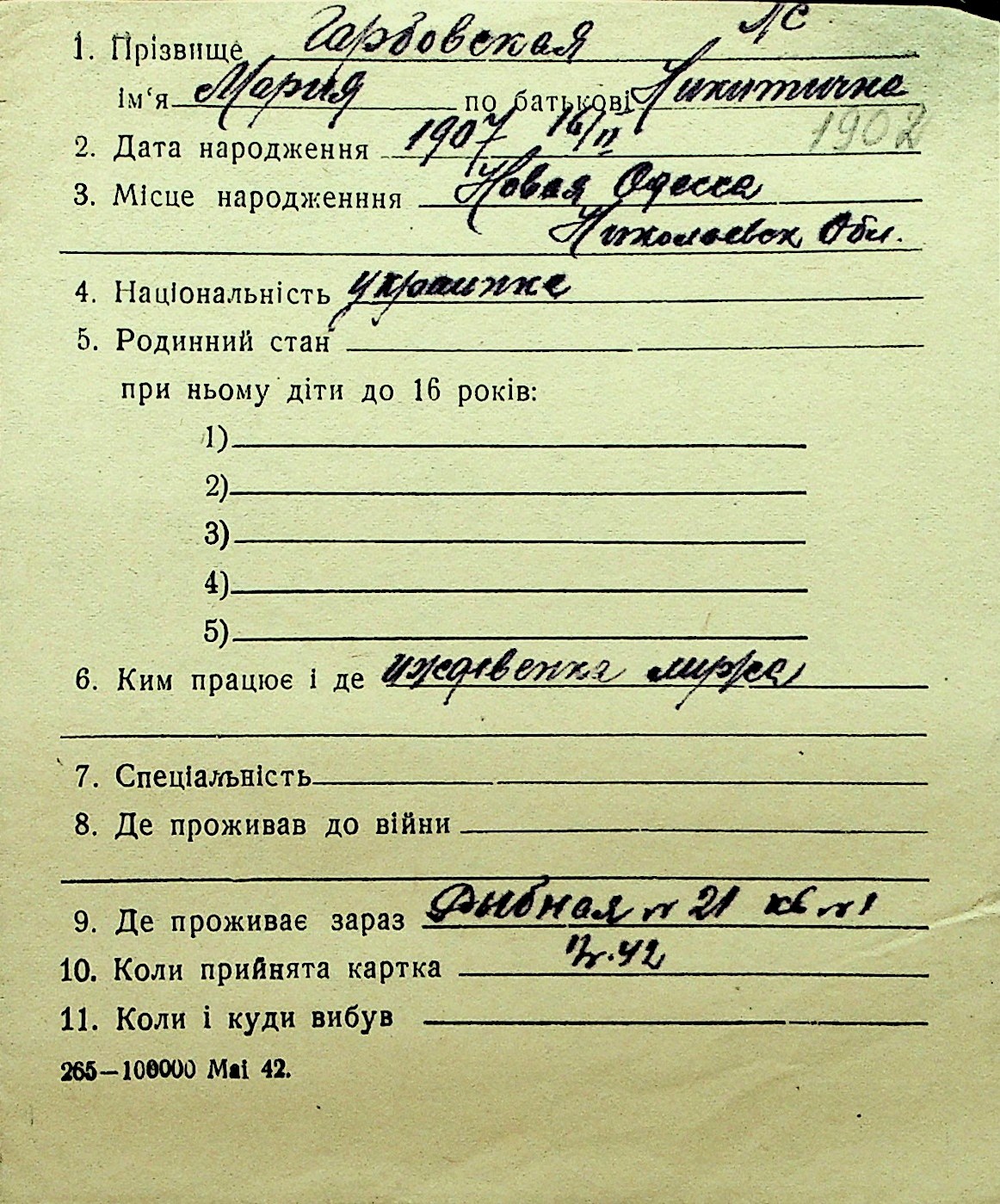 • • Перелік карток до фонду № Н-1016
