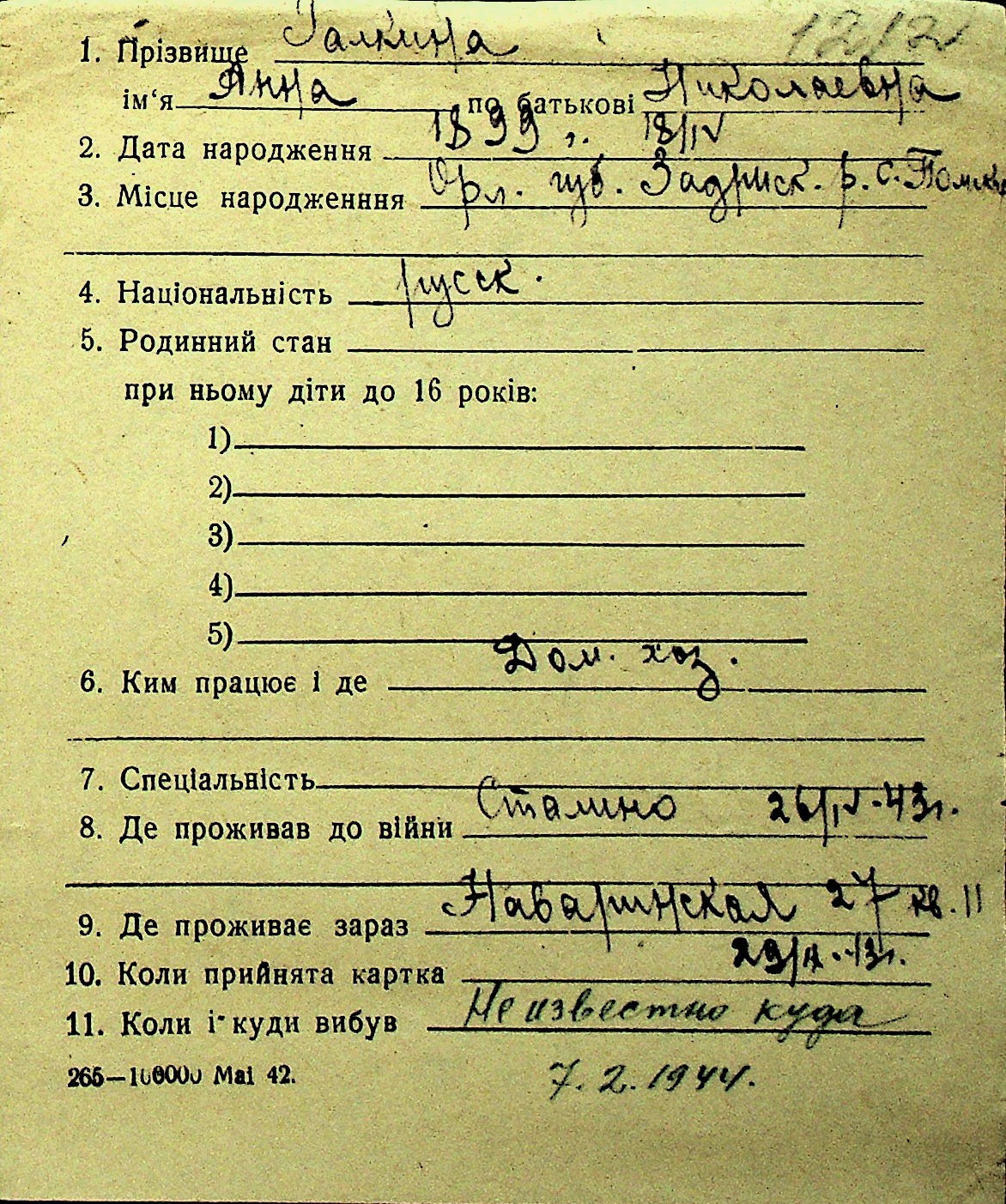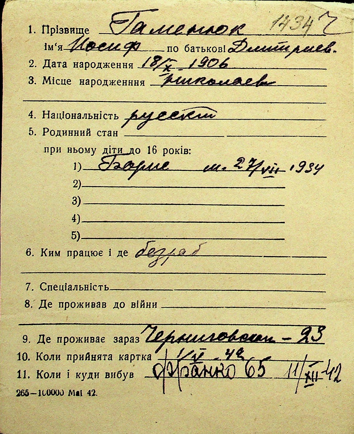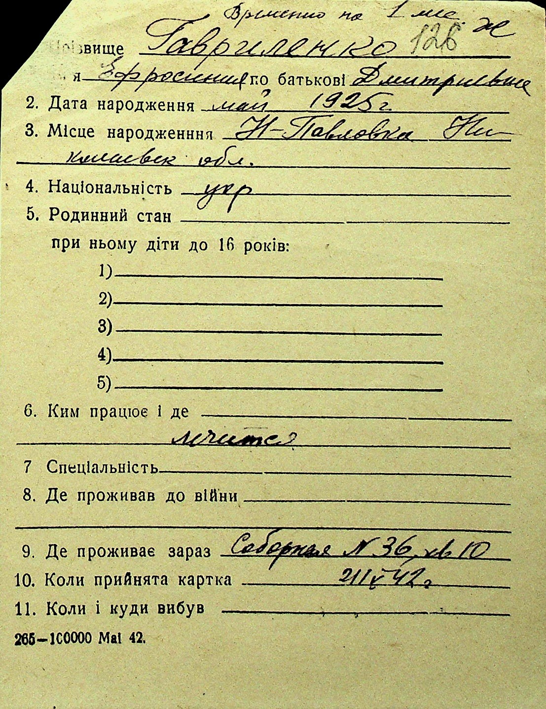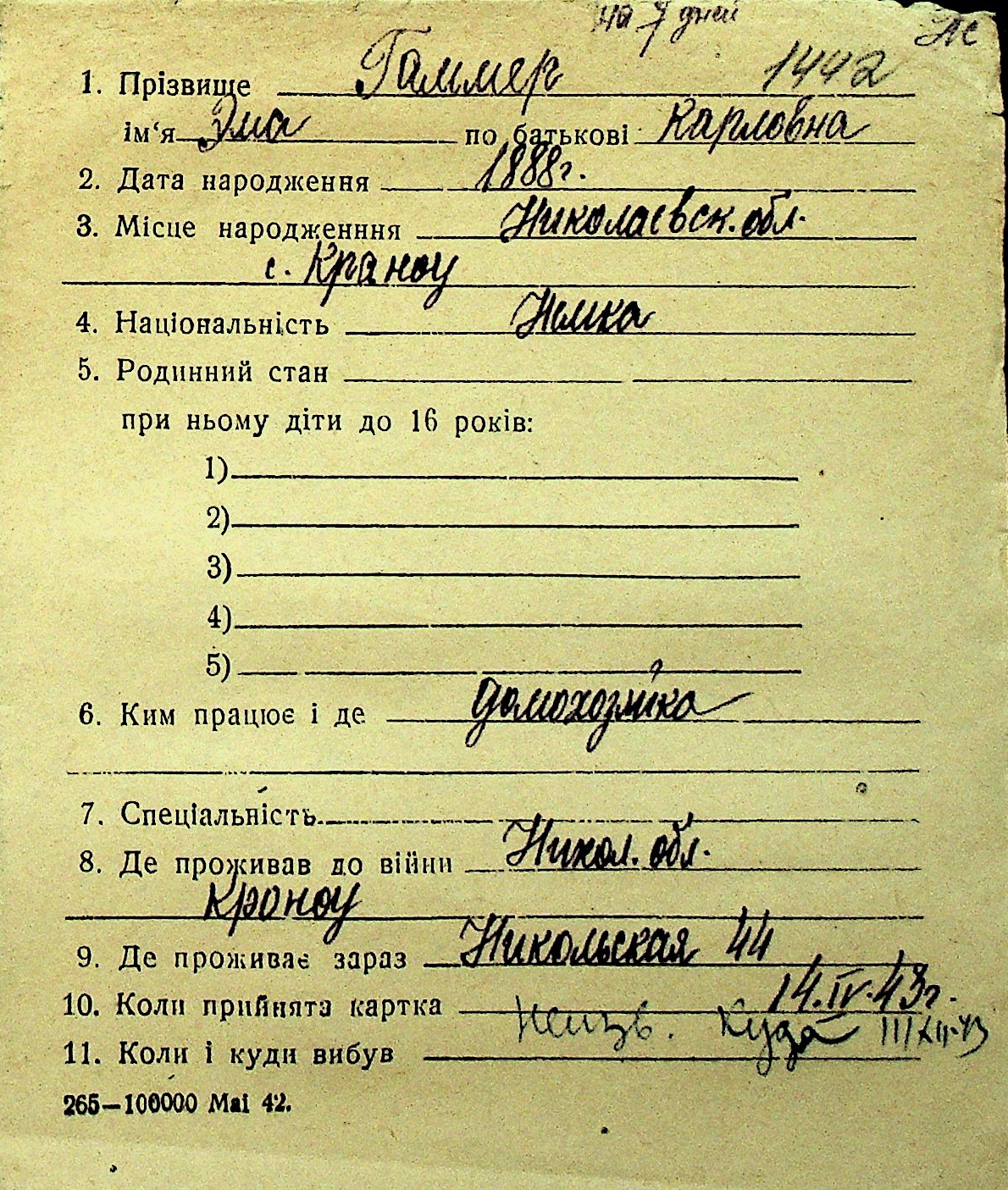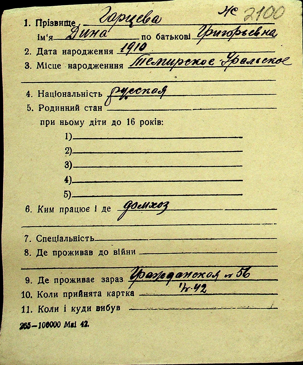 • • Перелік карток до фонду № Н-1016