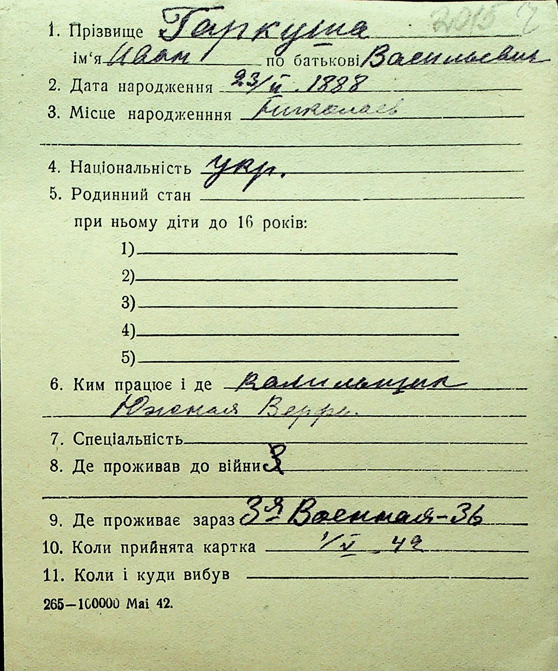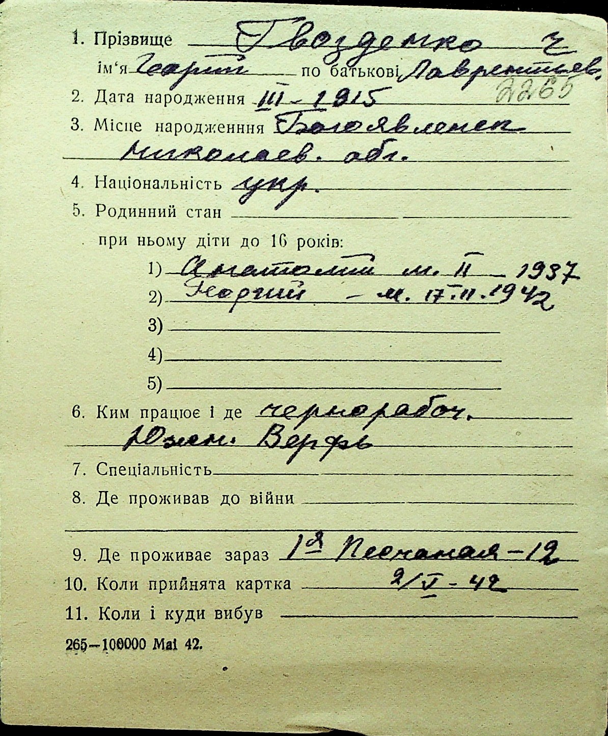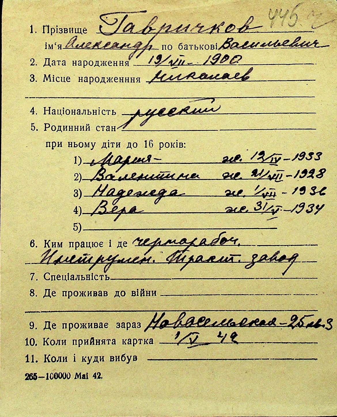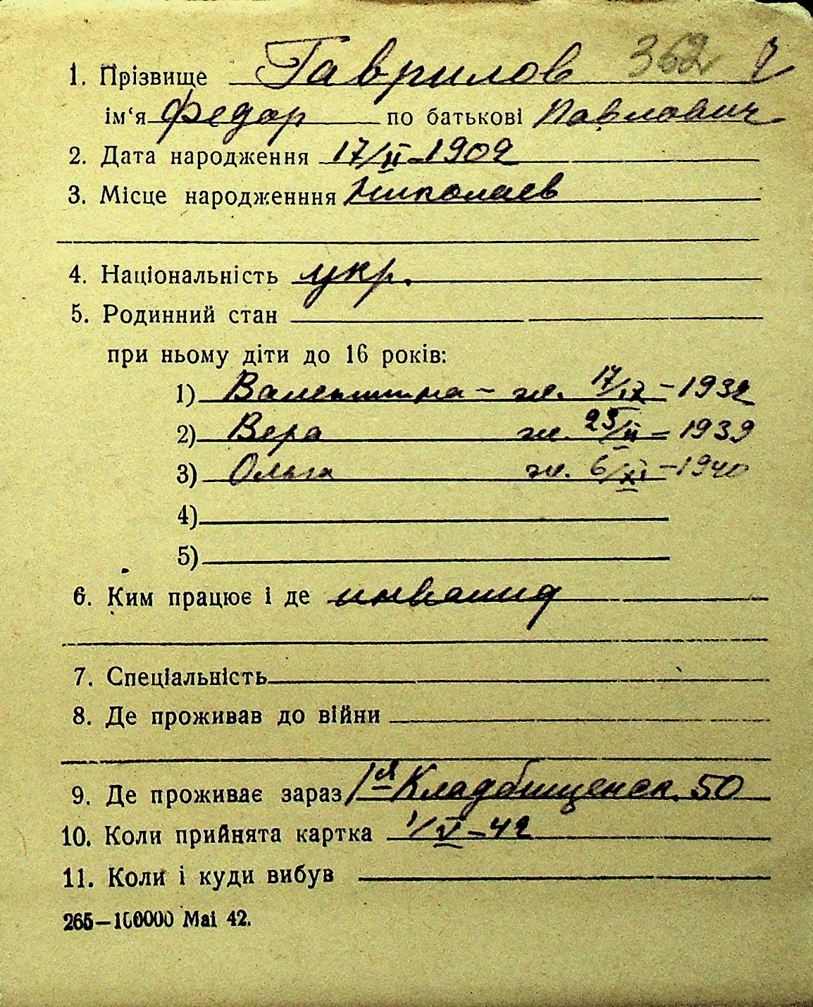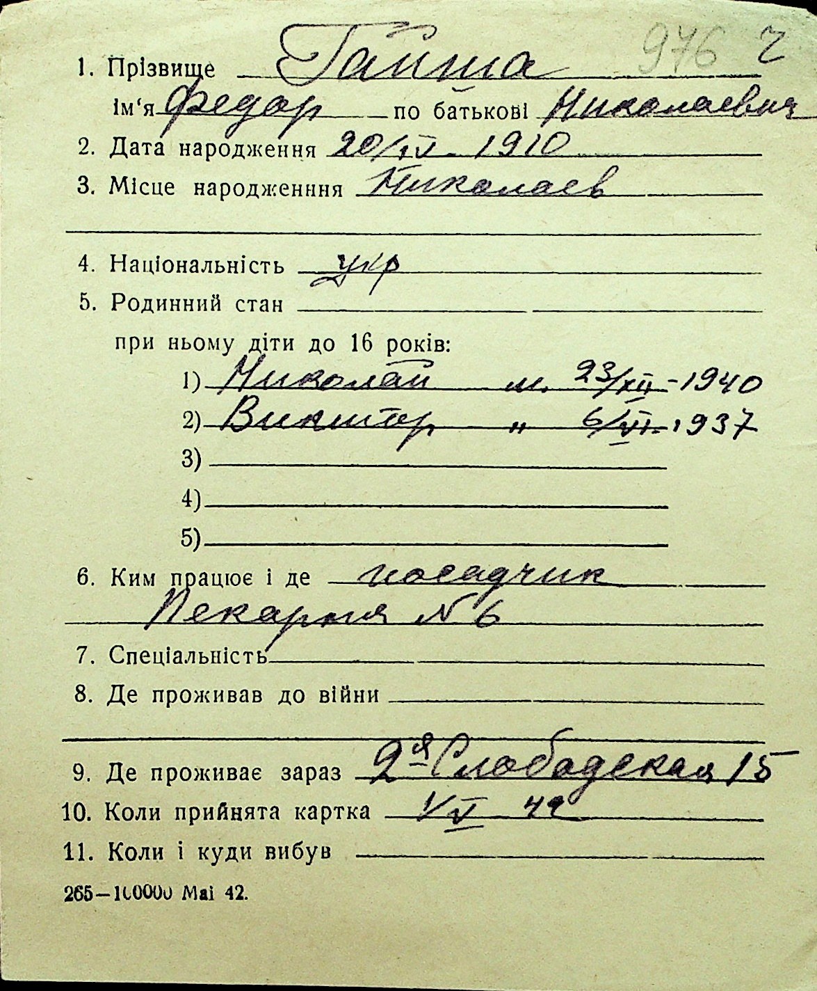• • Перелік карток до фонду № Н-1016
