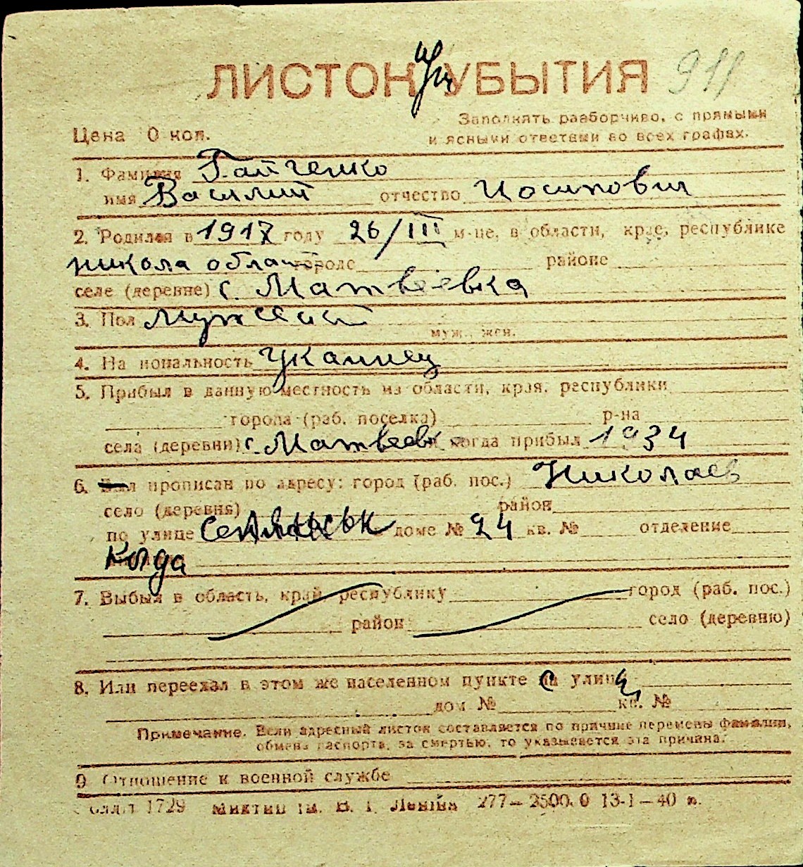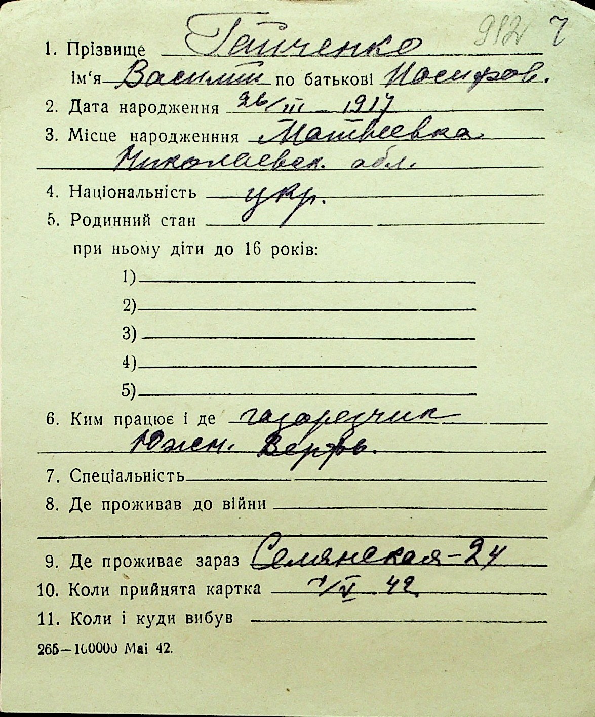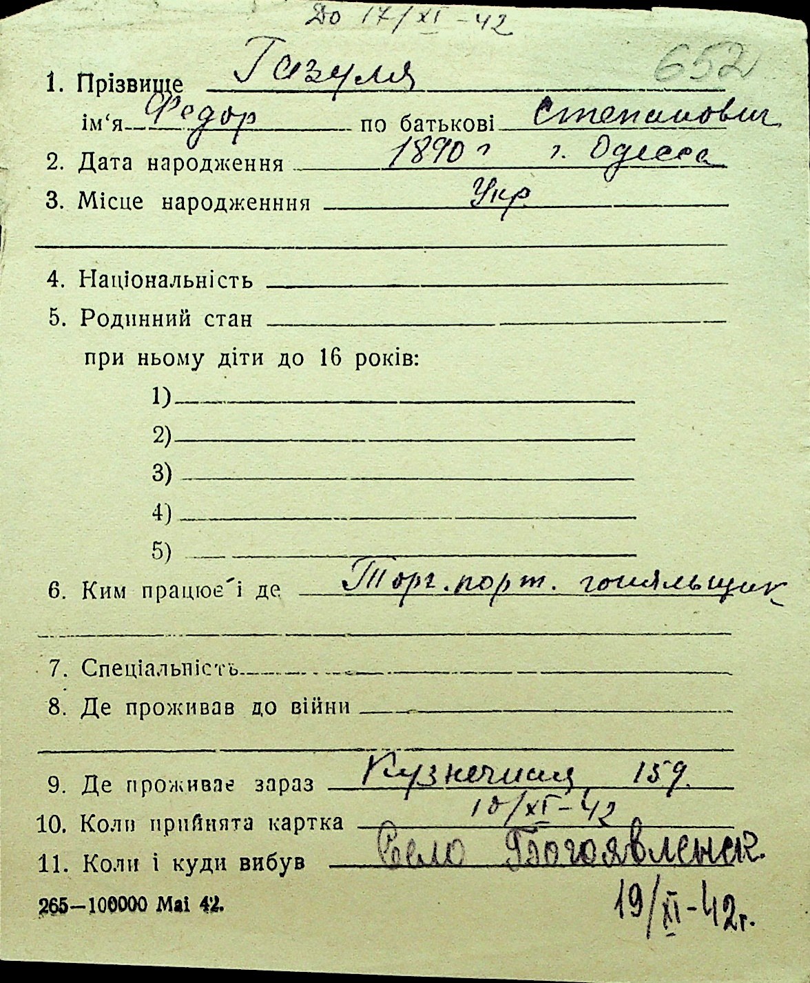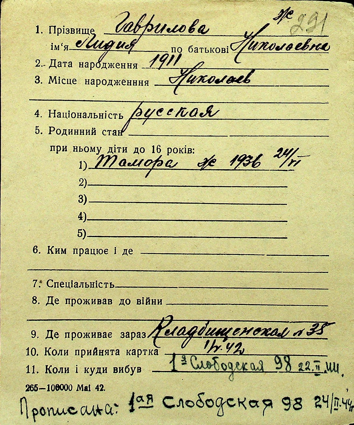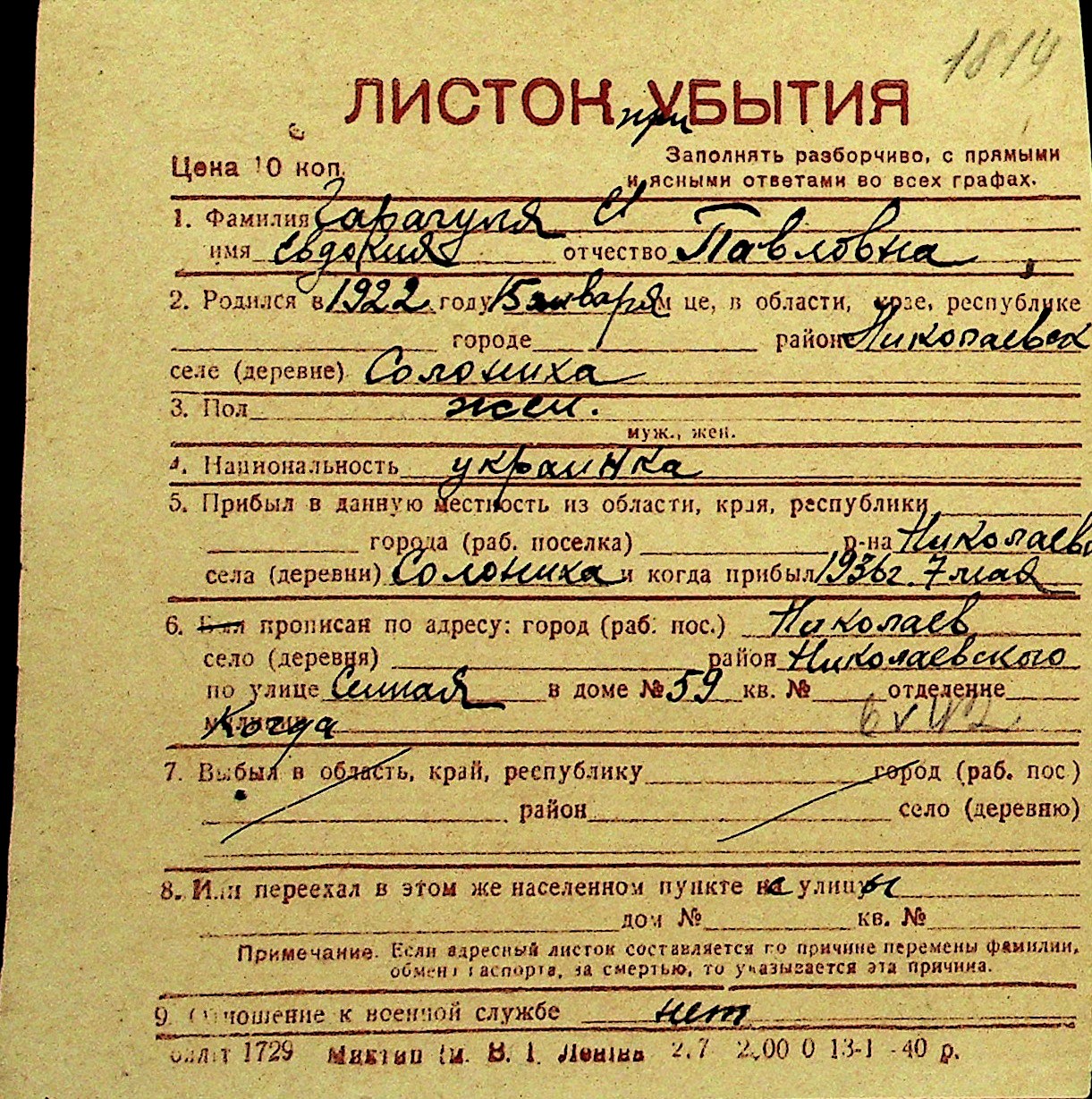 • • Перелік карток до фонду № Н-1016