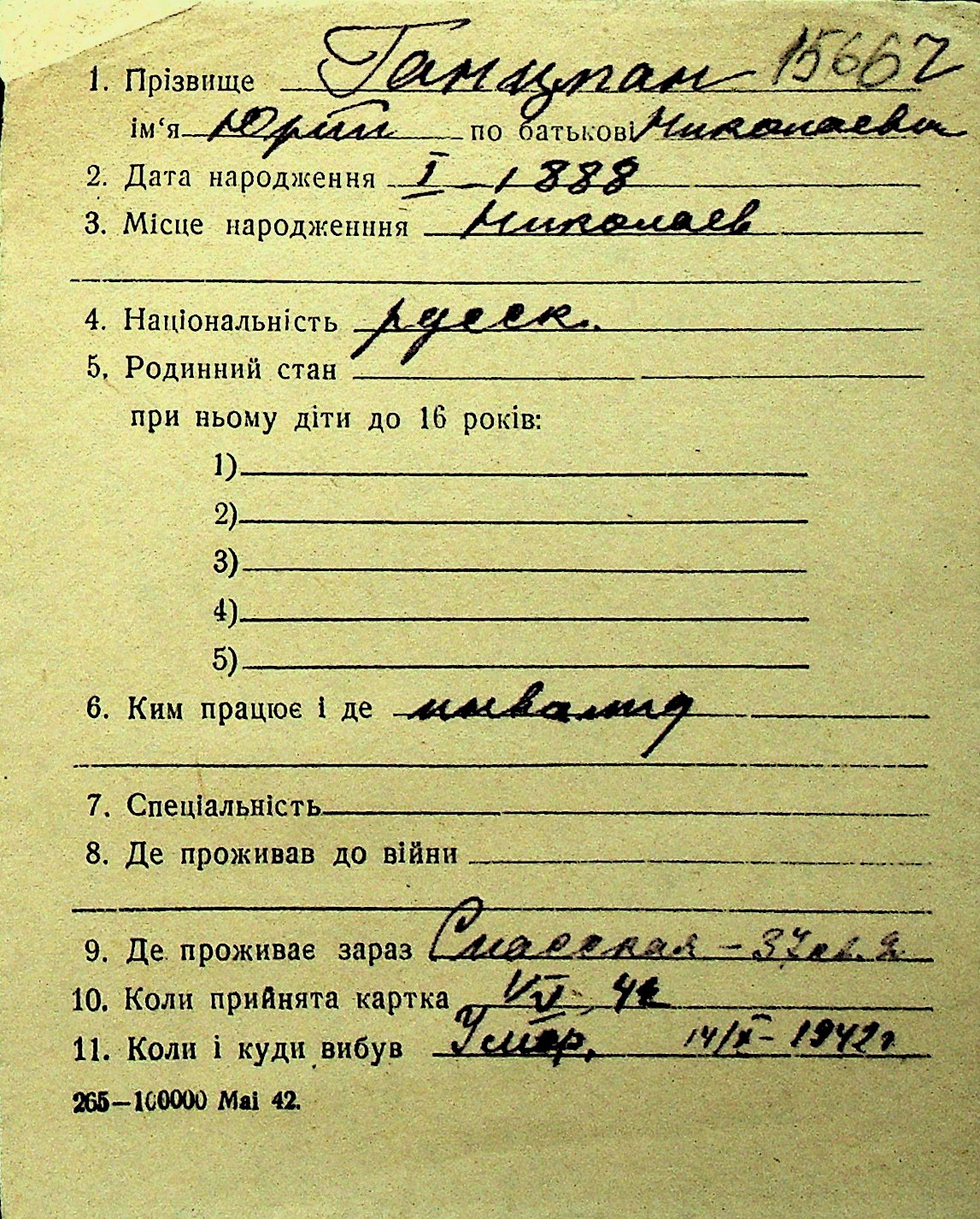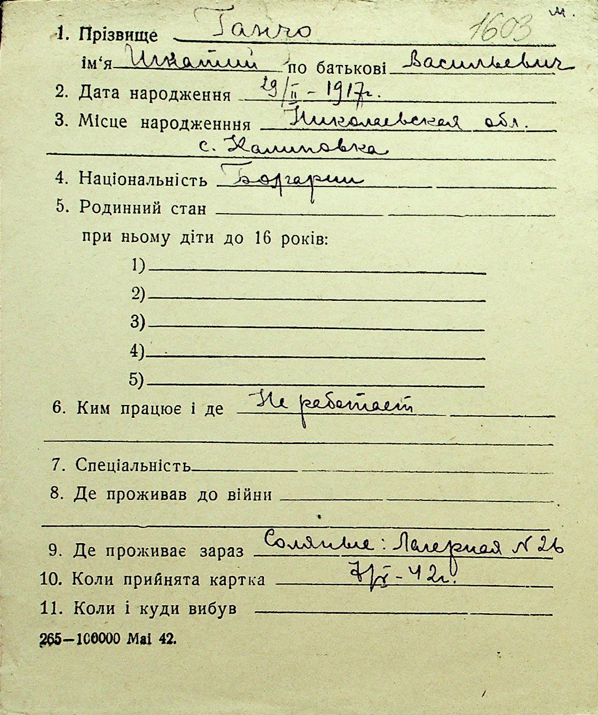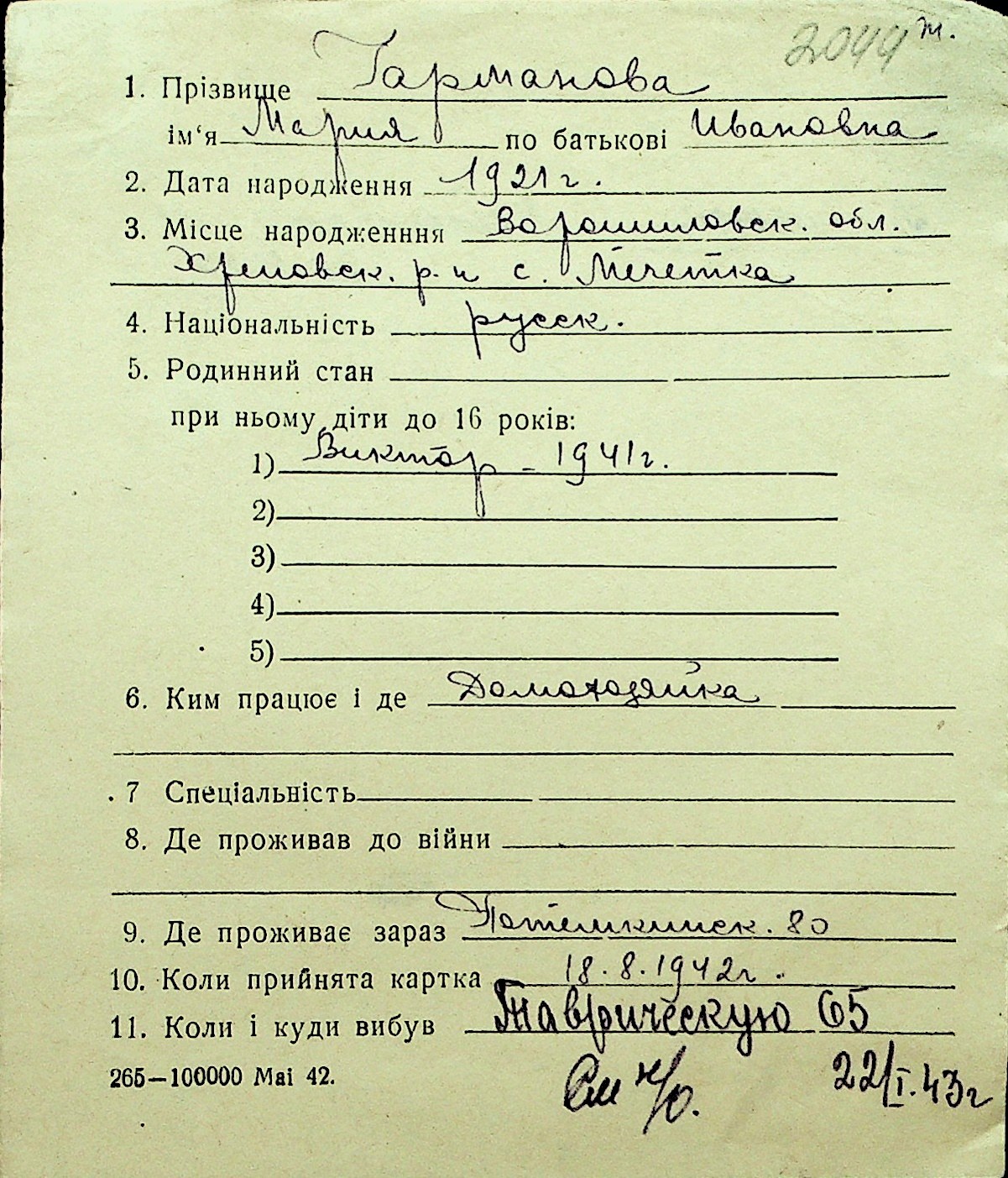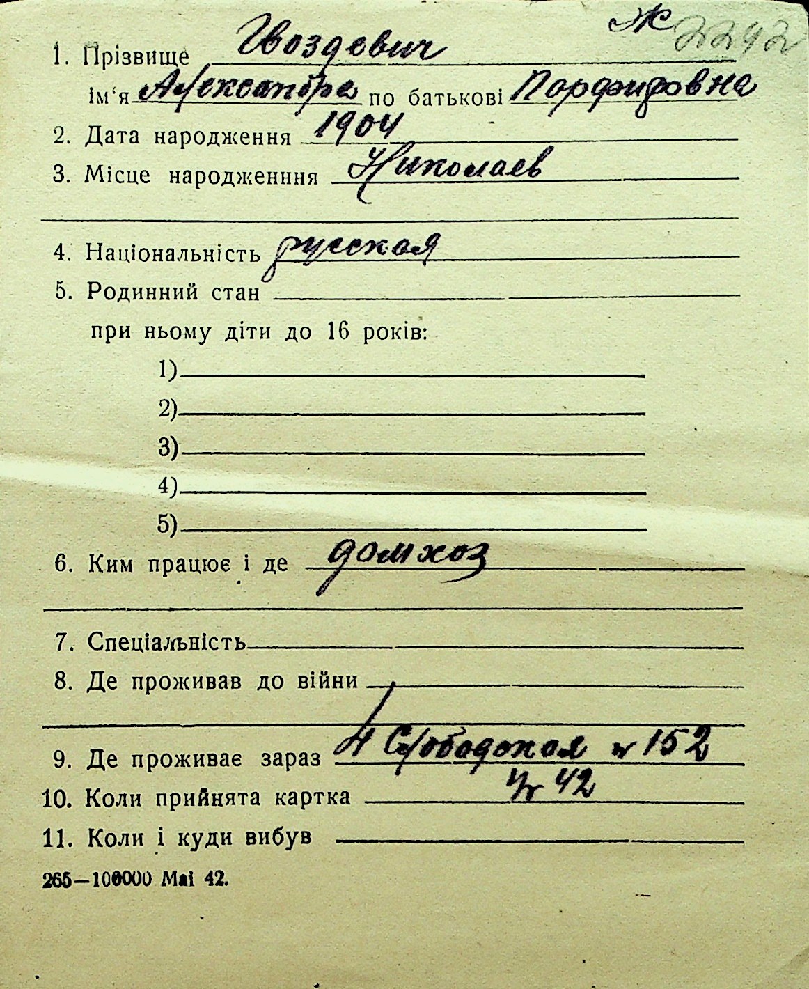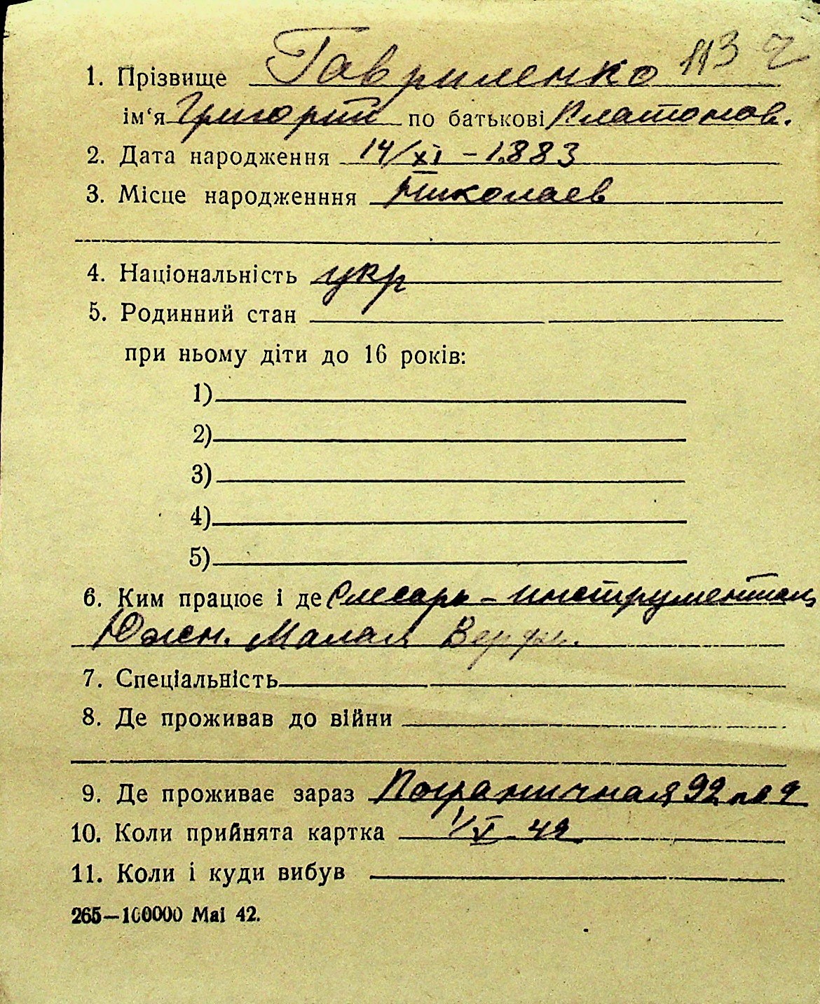 • • Перелік карток до фонду № Н-1016