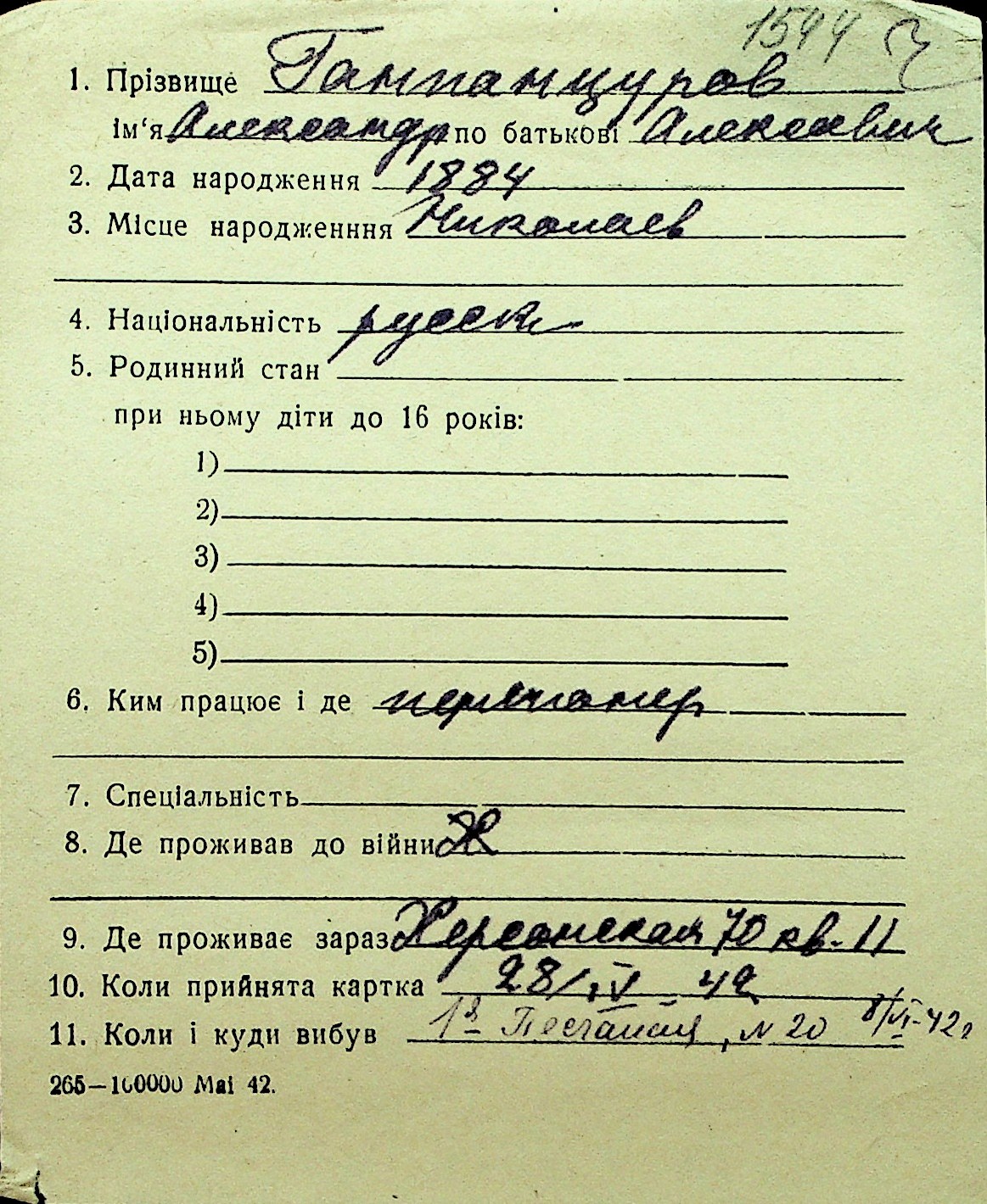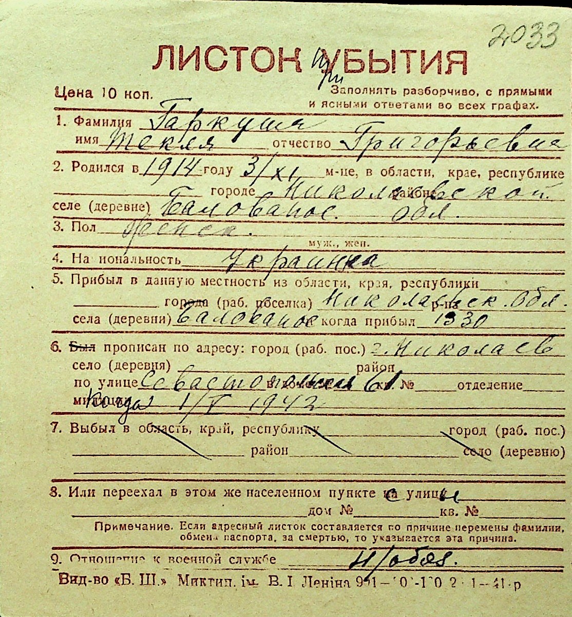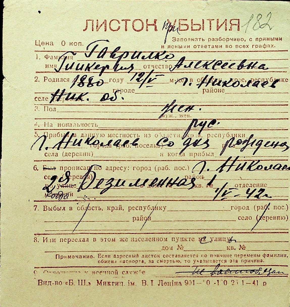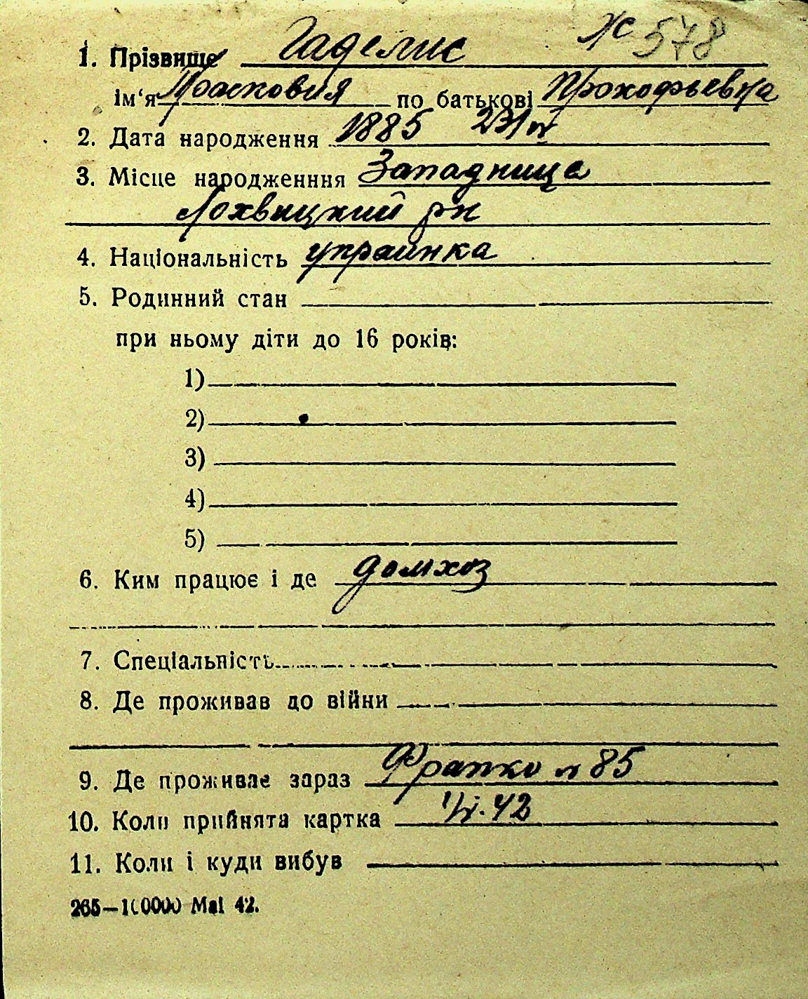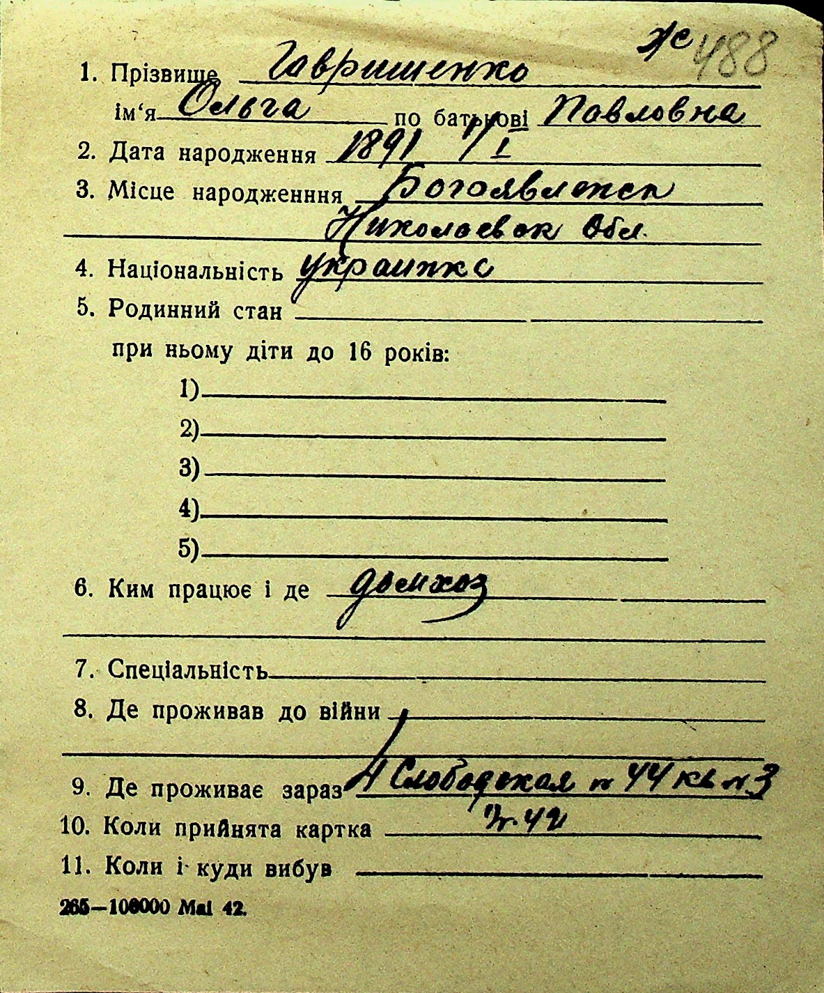 • • Перелік карток до фонду № Н-1016