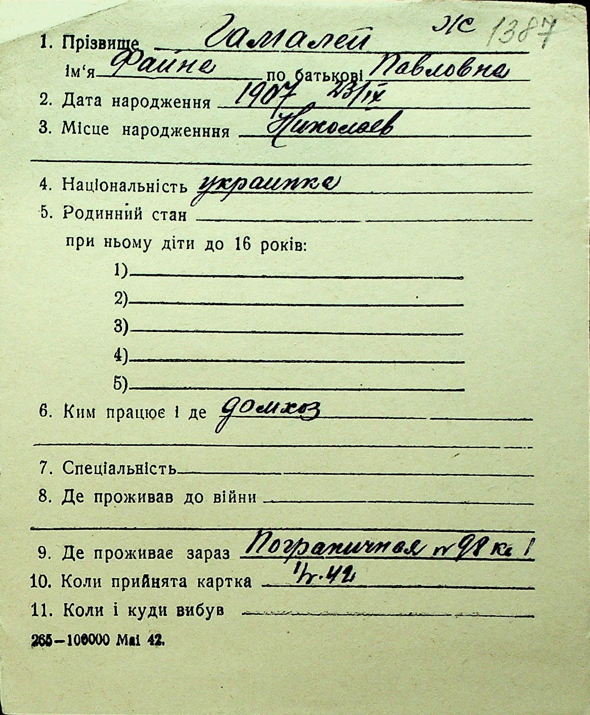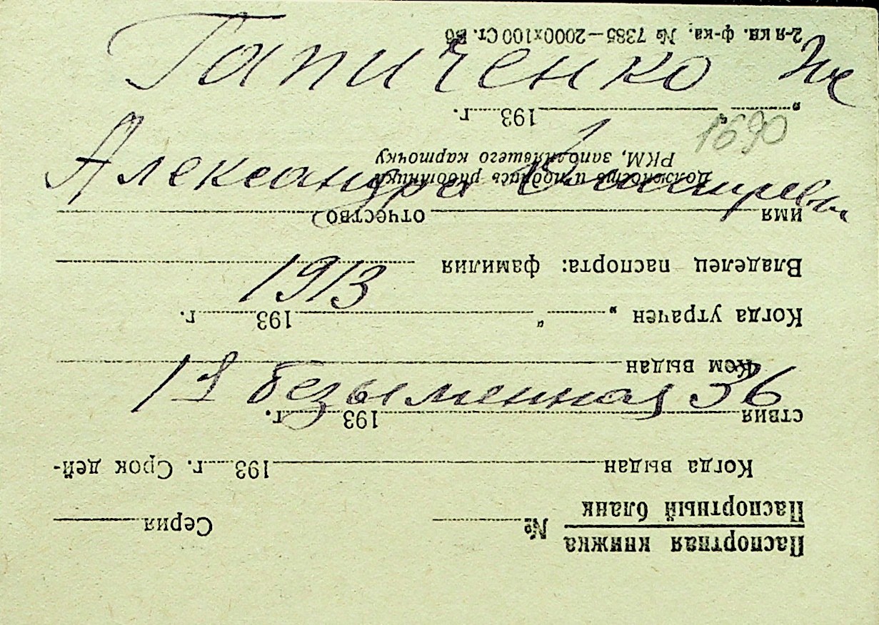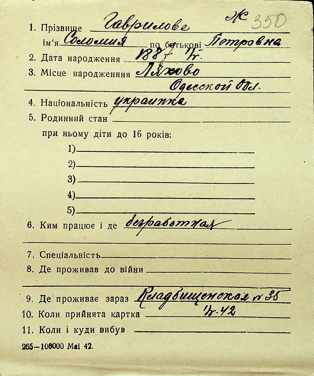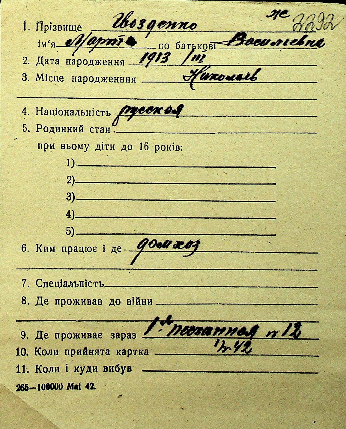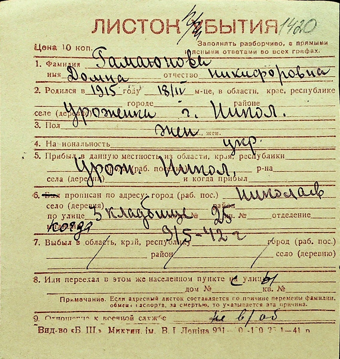 • • Перелік карток до фонду № Н-1016