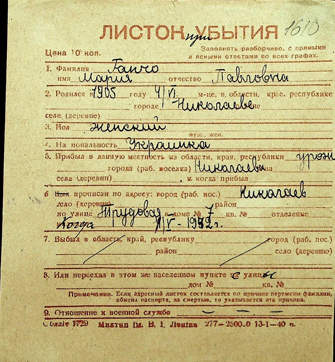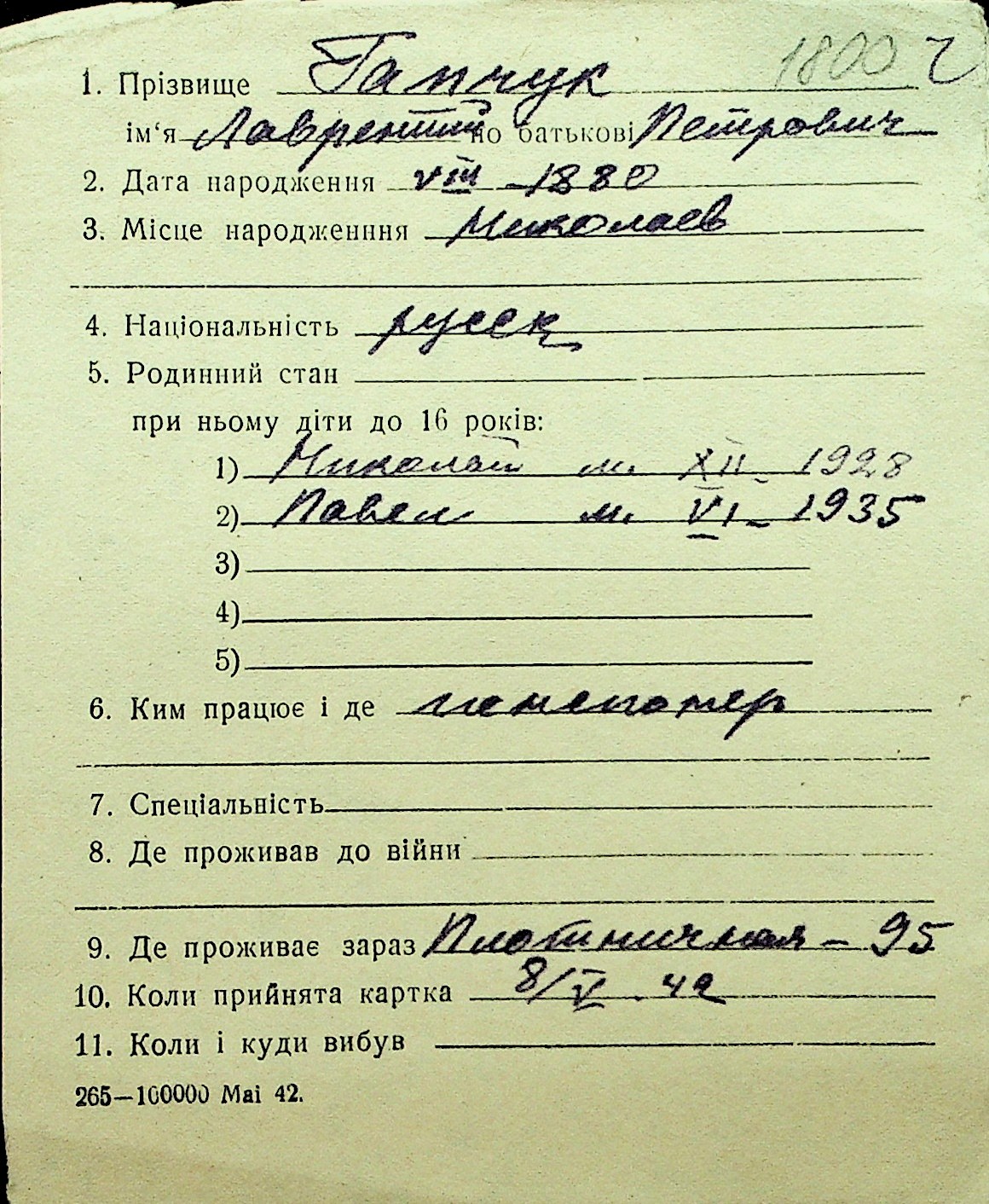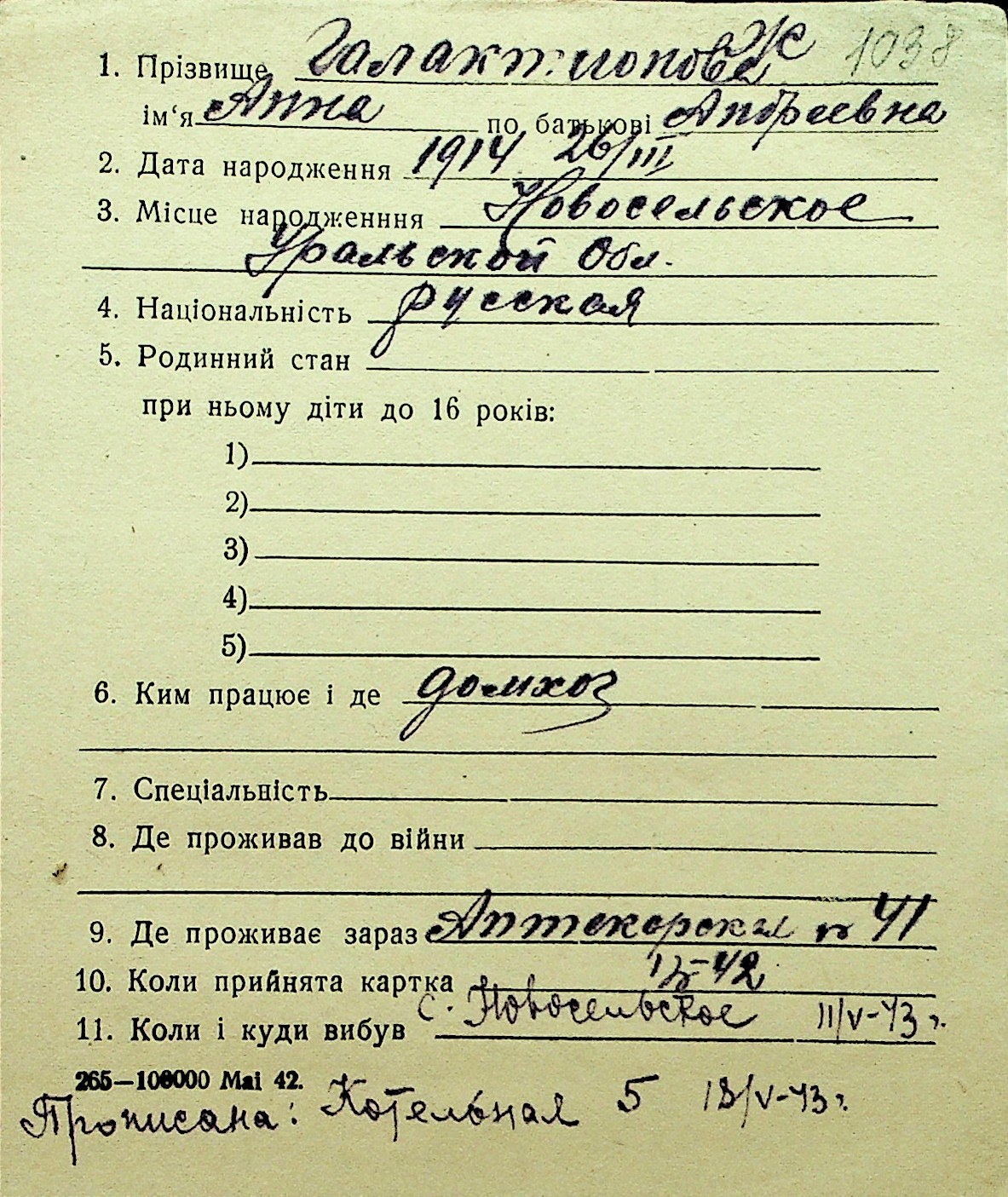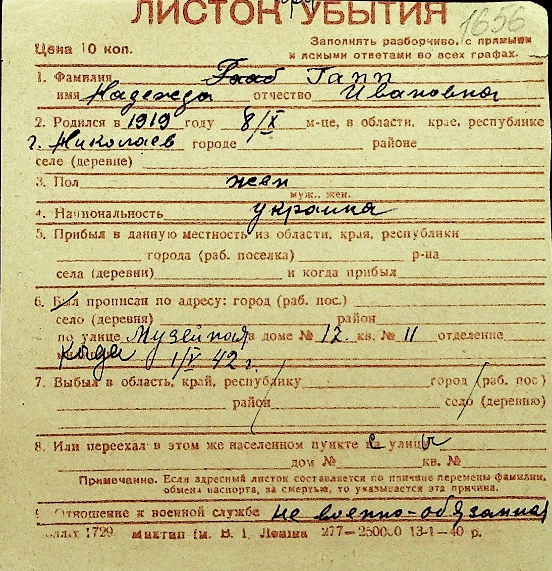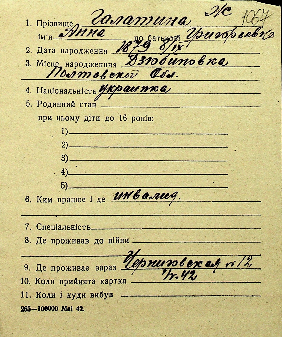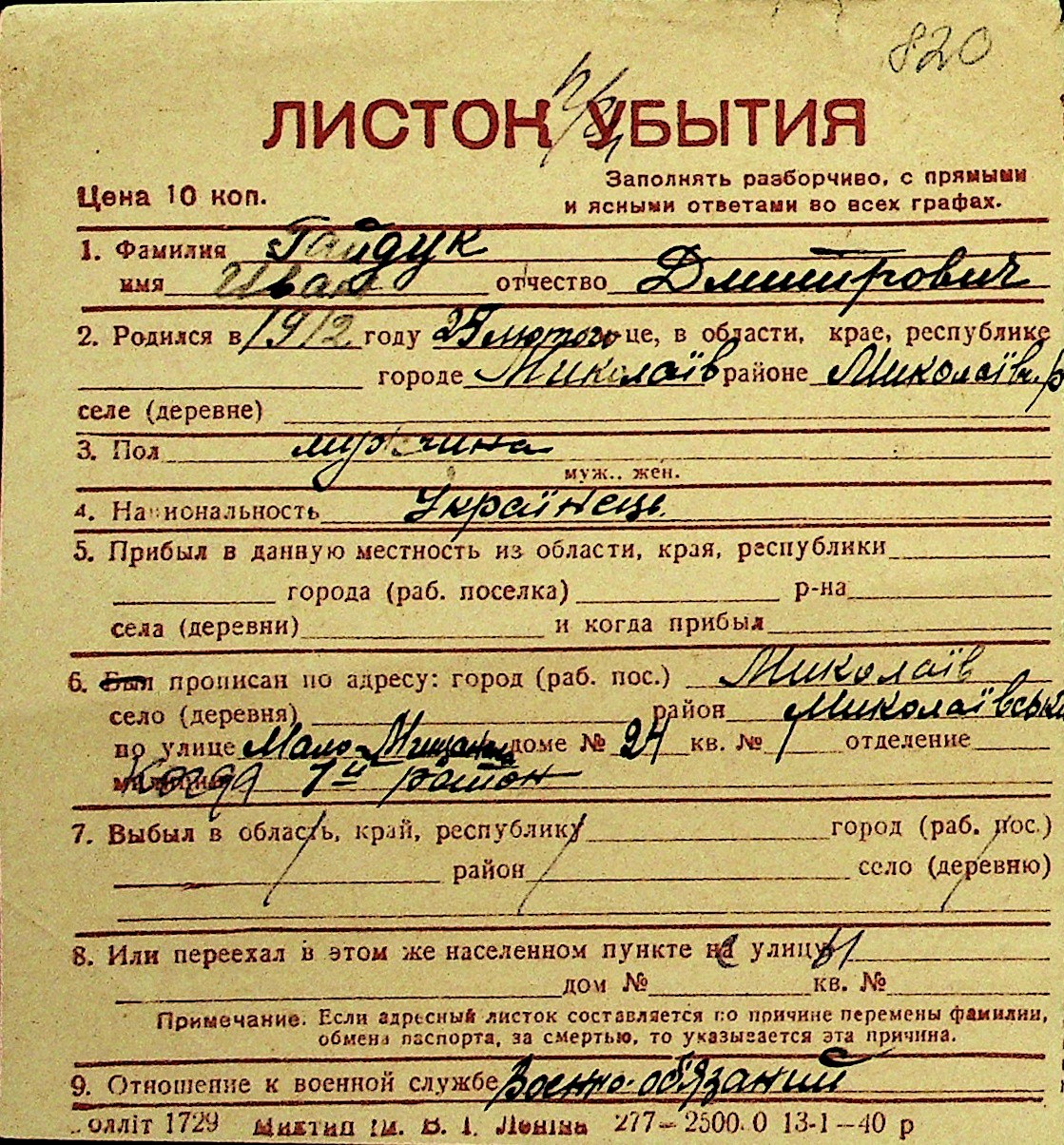 • • Перелік карток до фонду № Н-1016