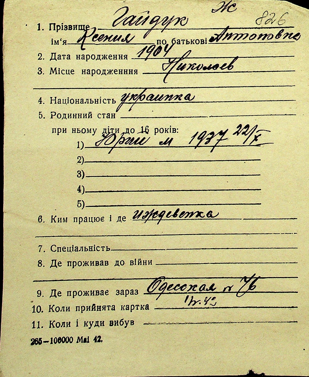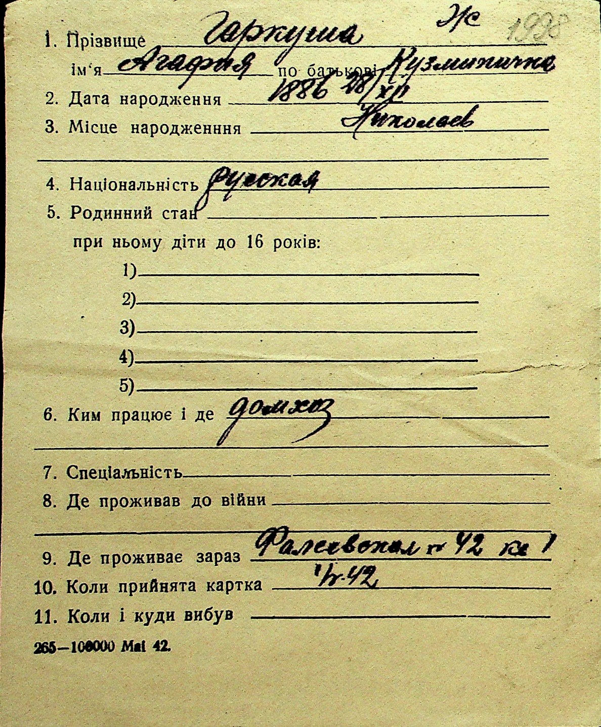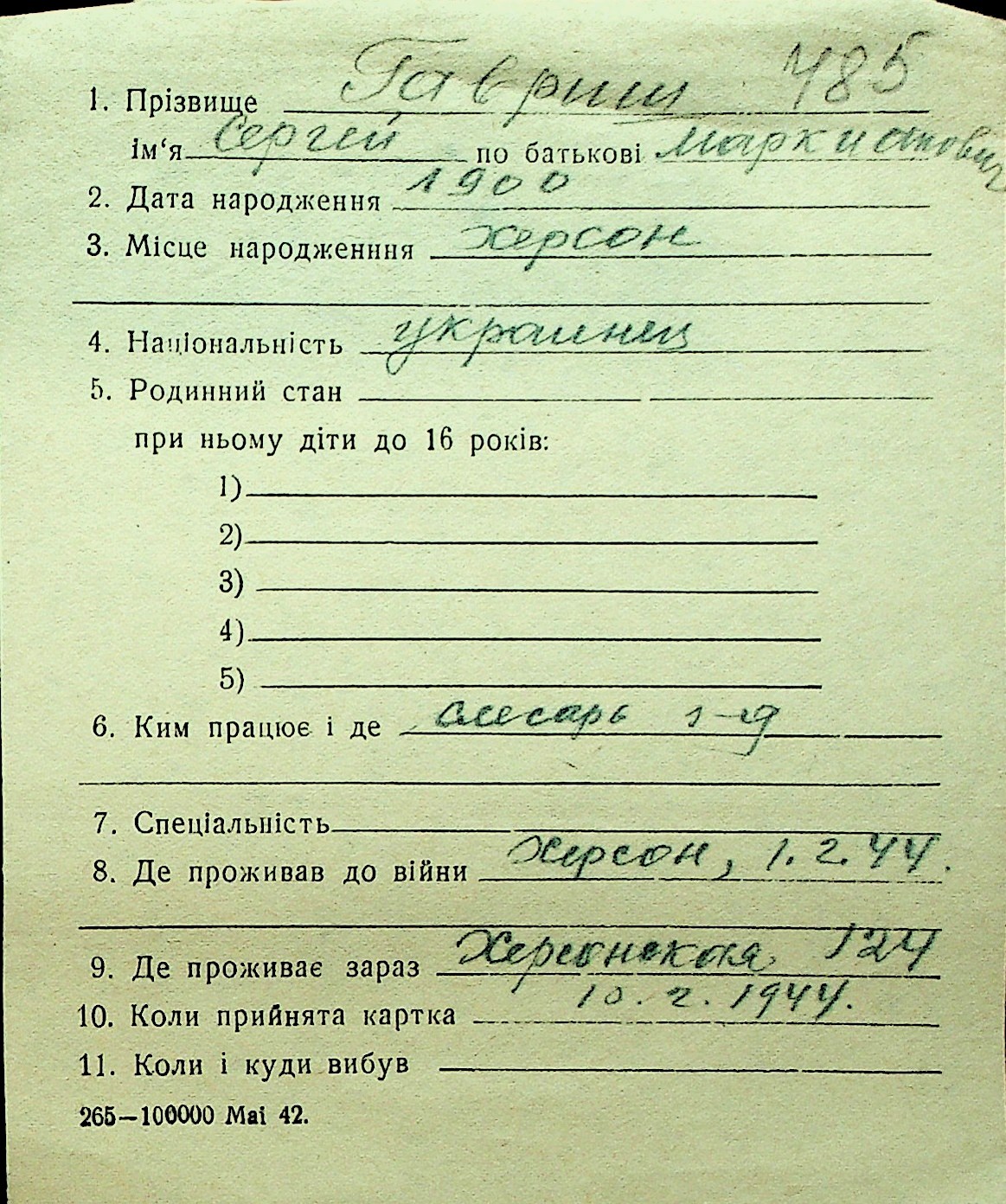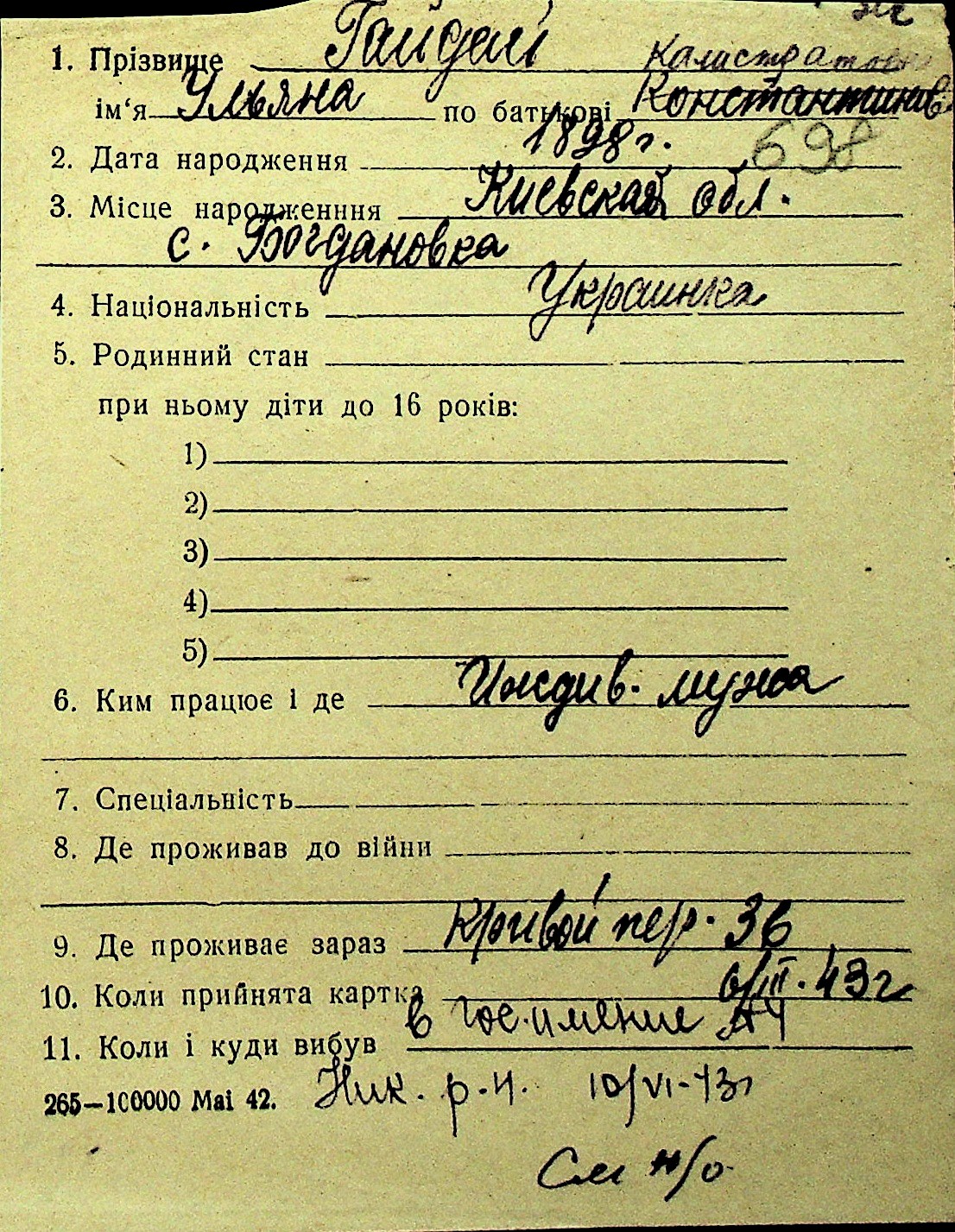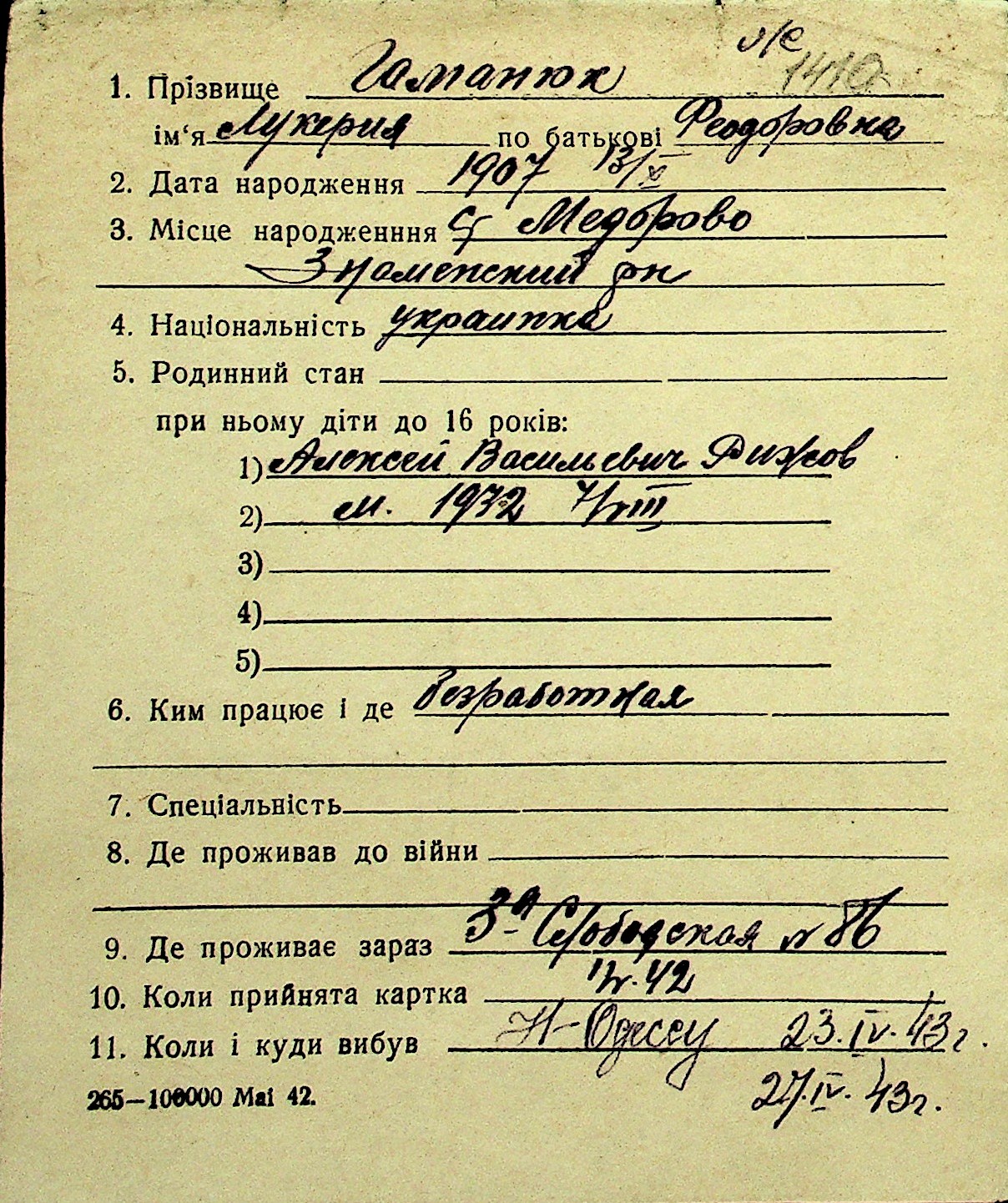 • • Перелік карток до фонду № Н-1016