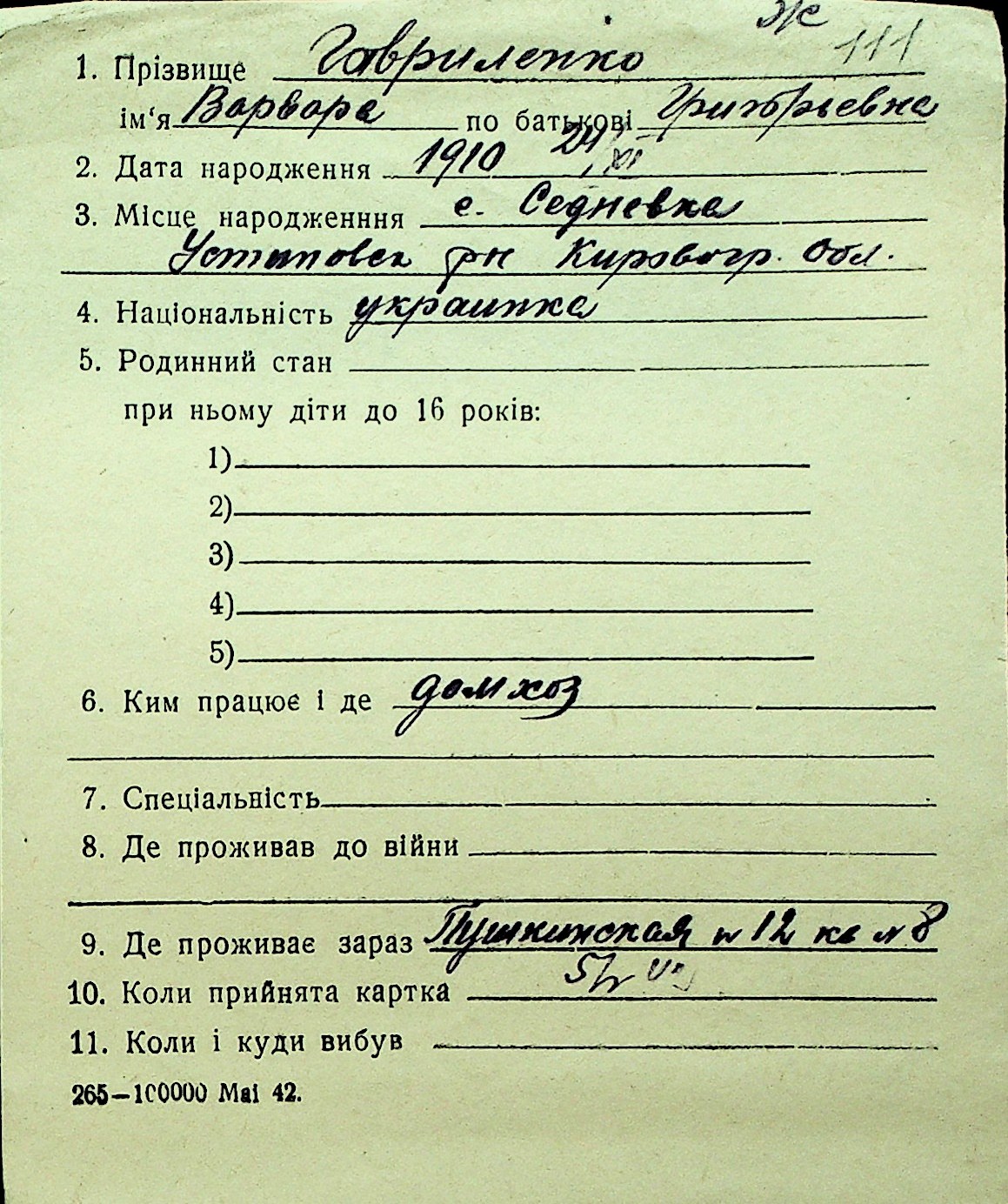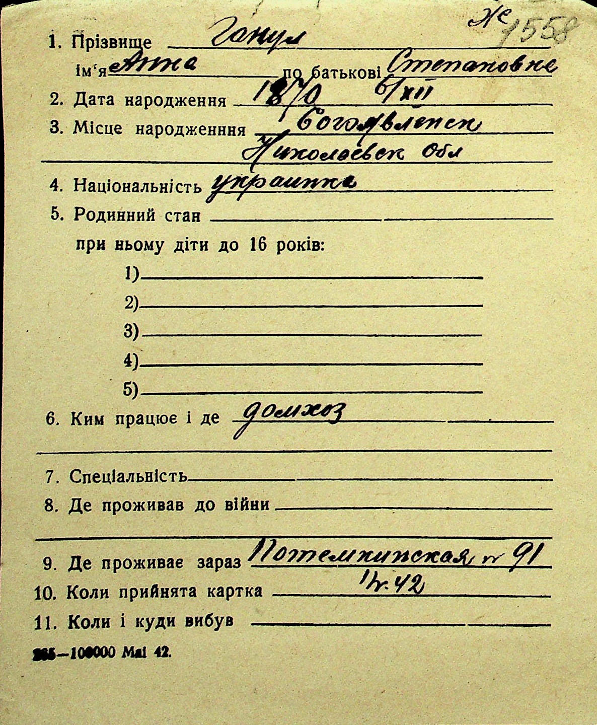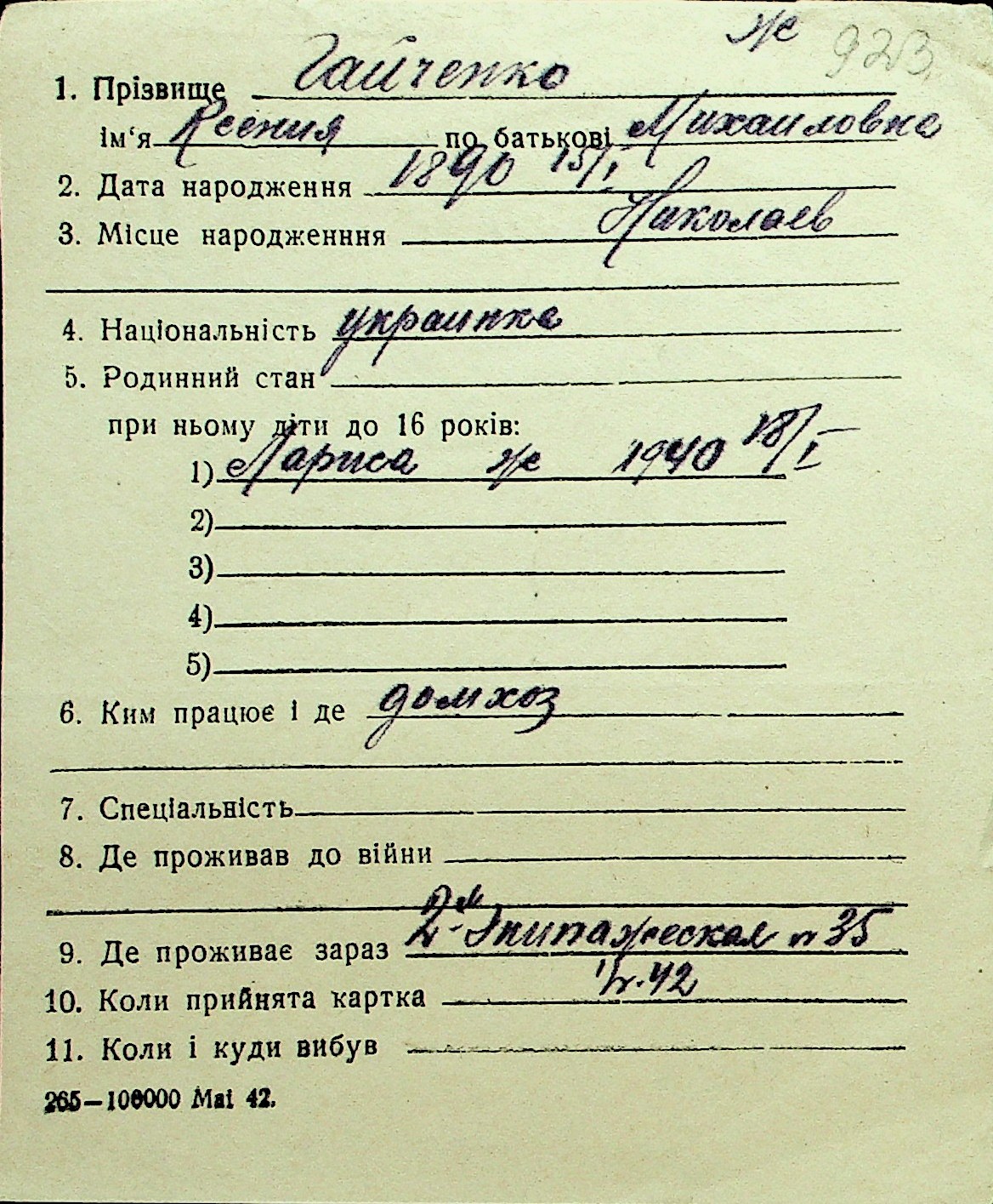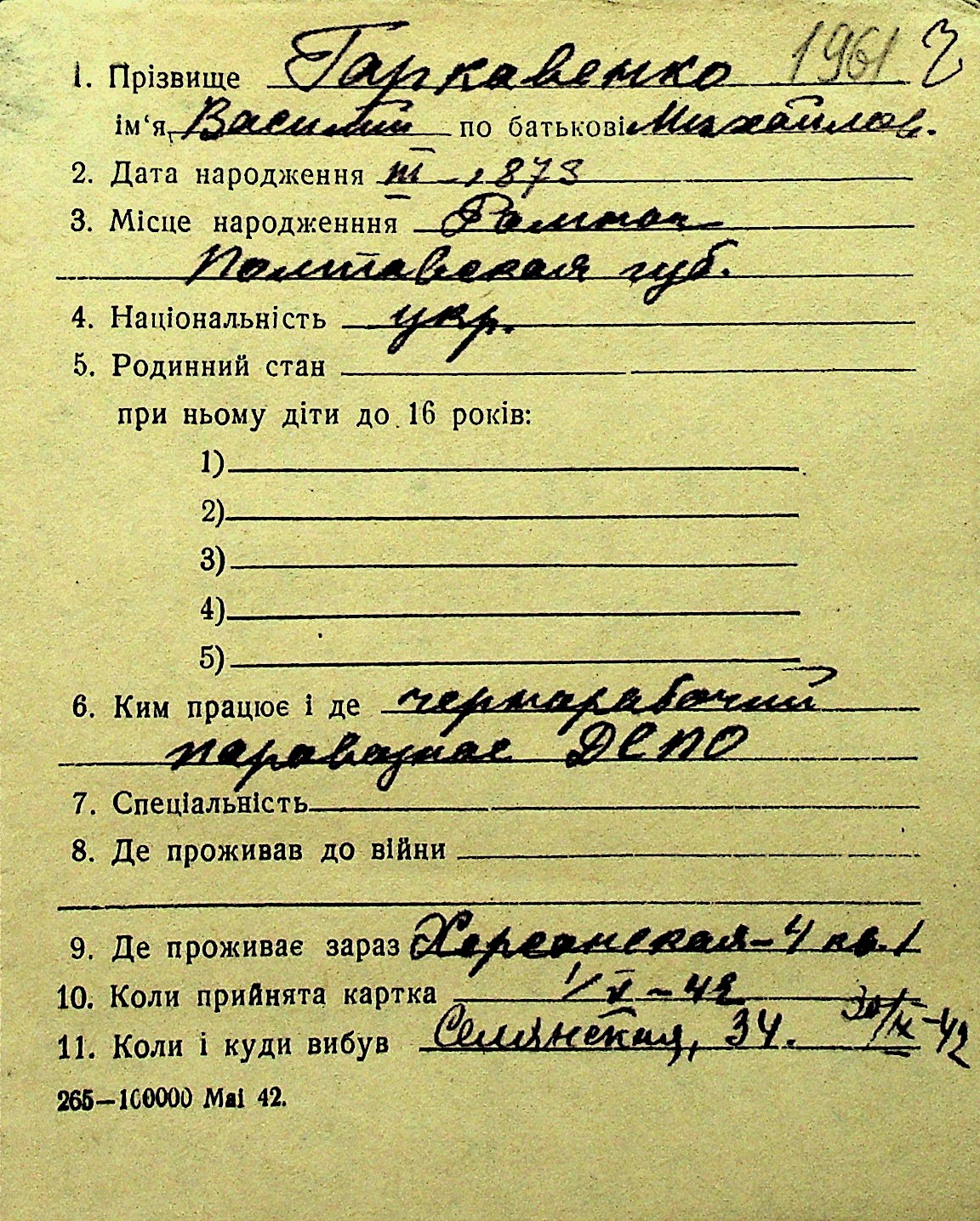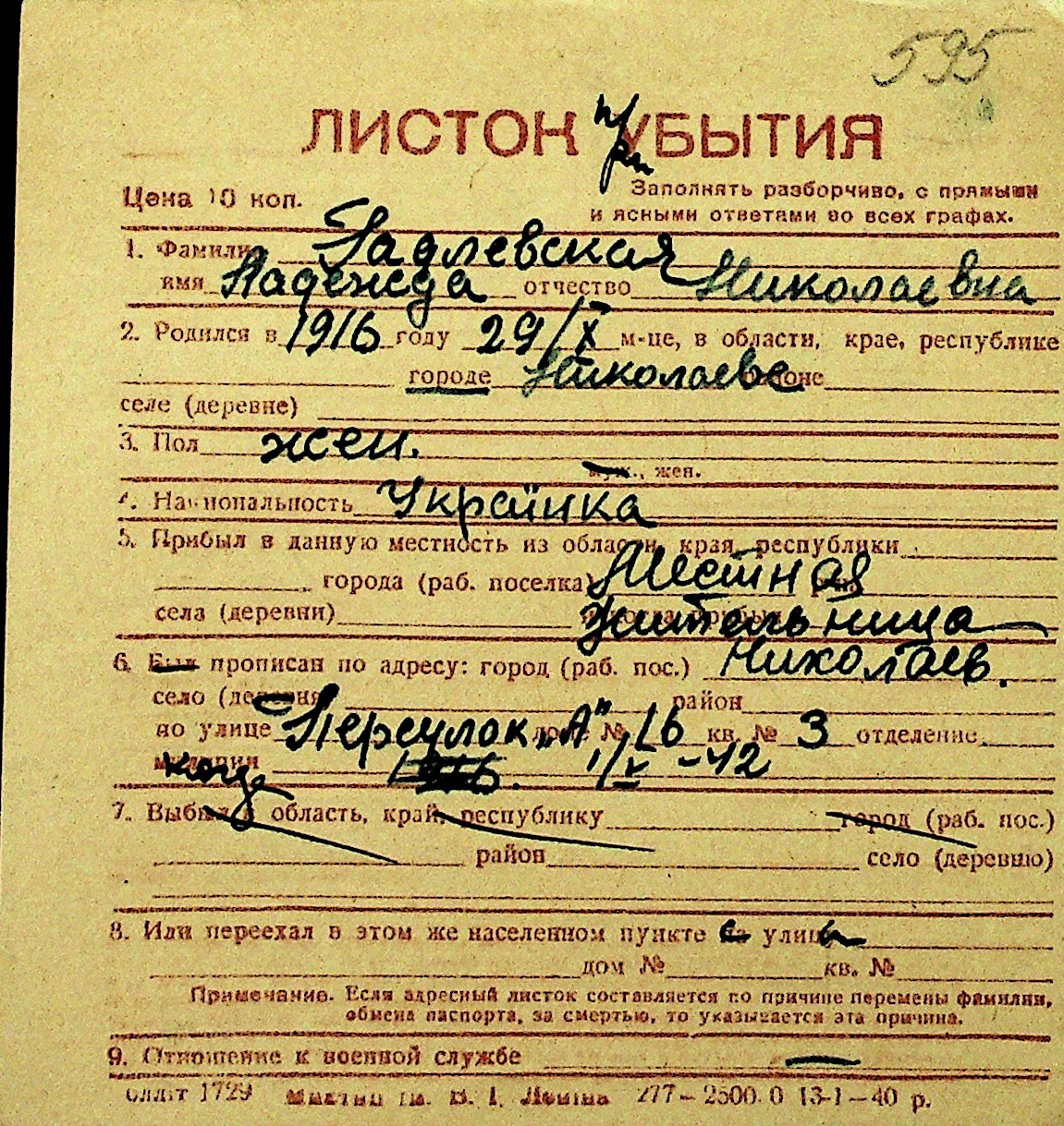 • • Перелік карток до фонду № Н-1016