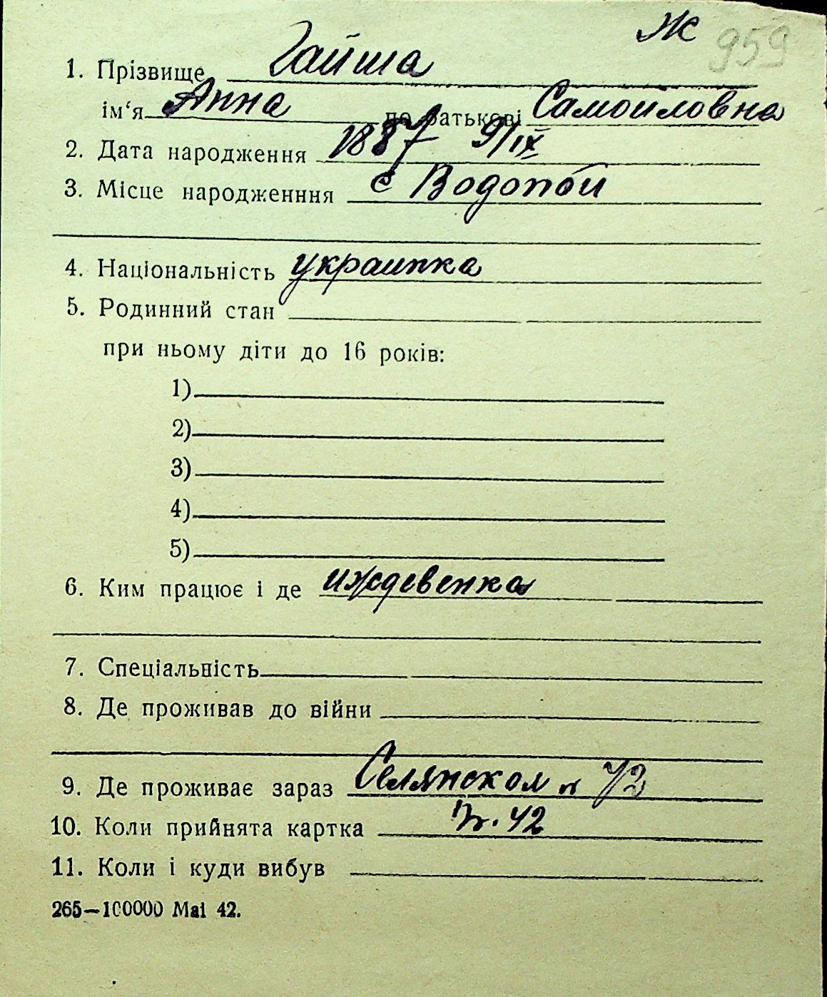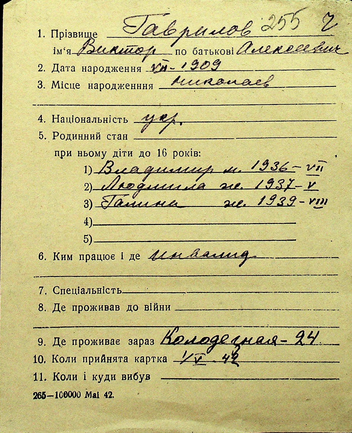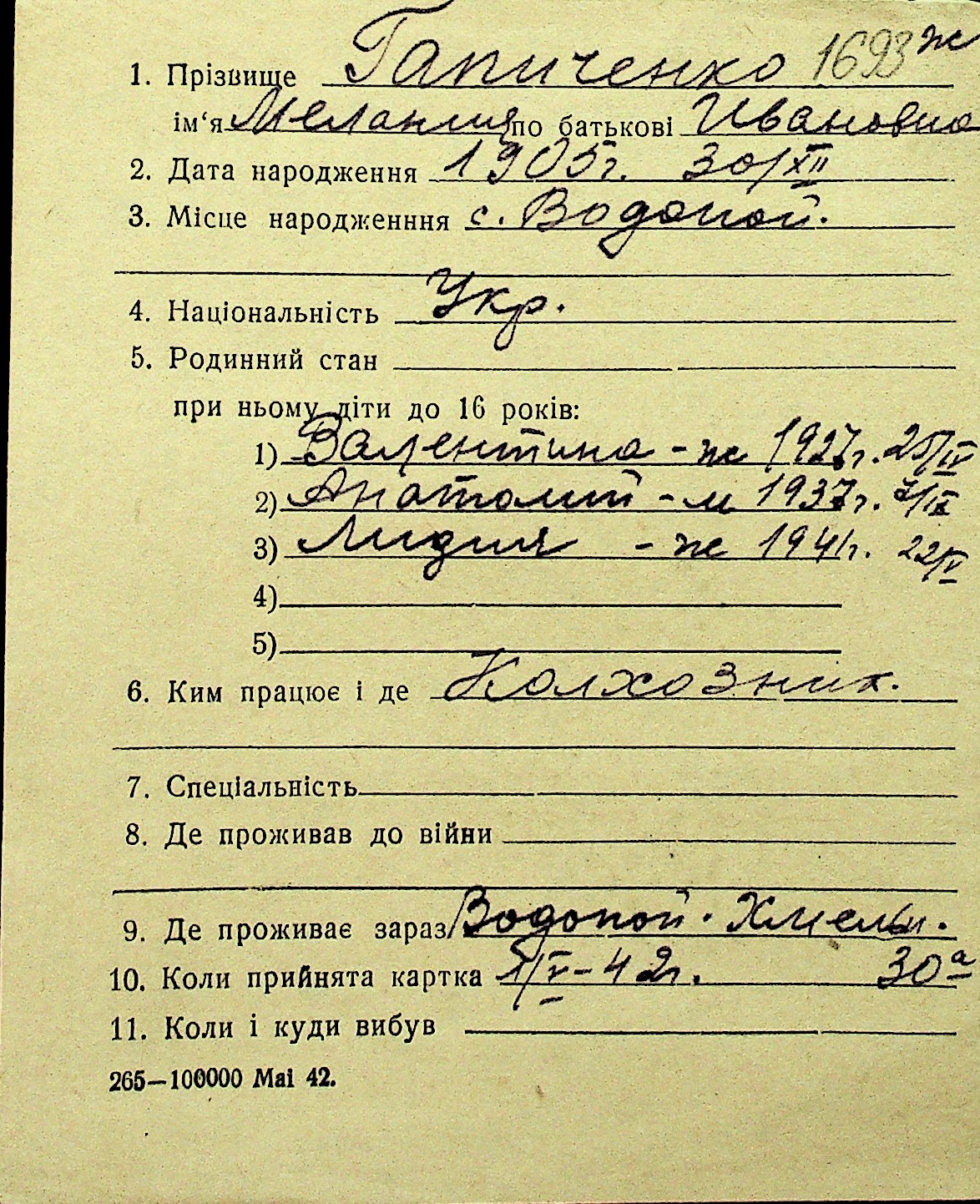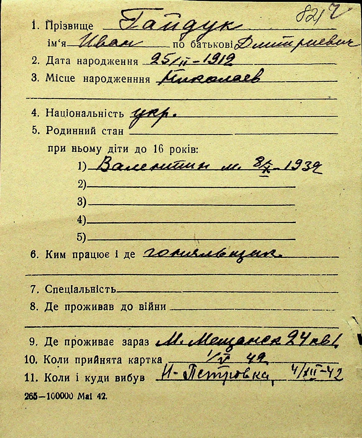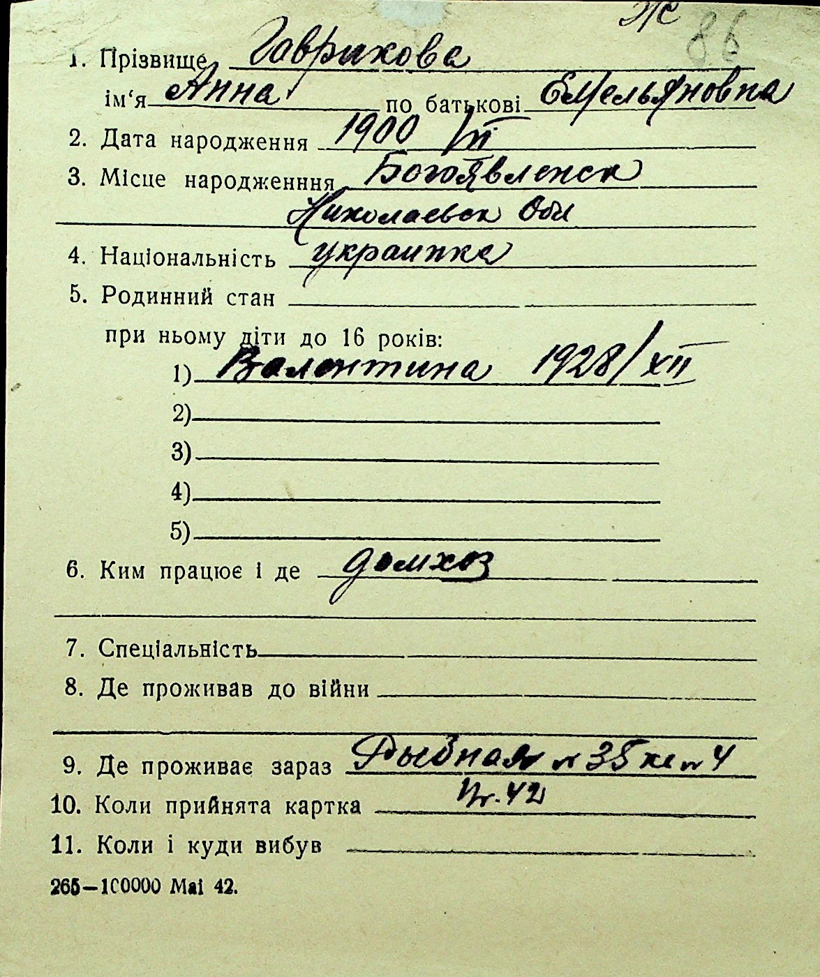 • • Перелік карток до фонду № Н-1016