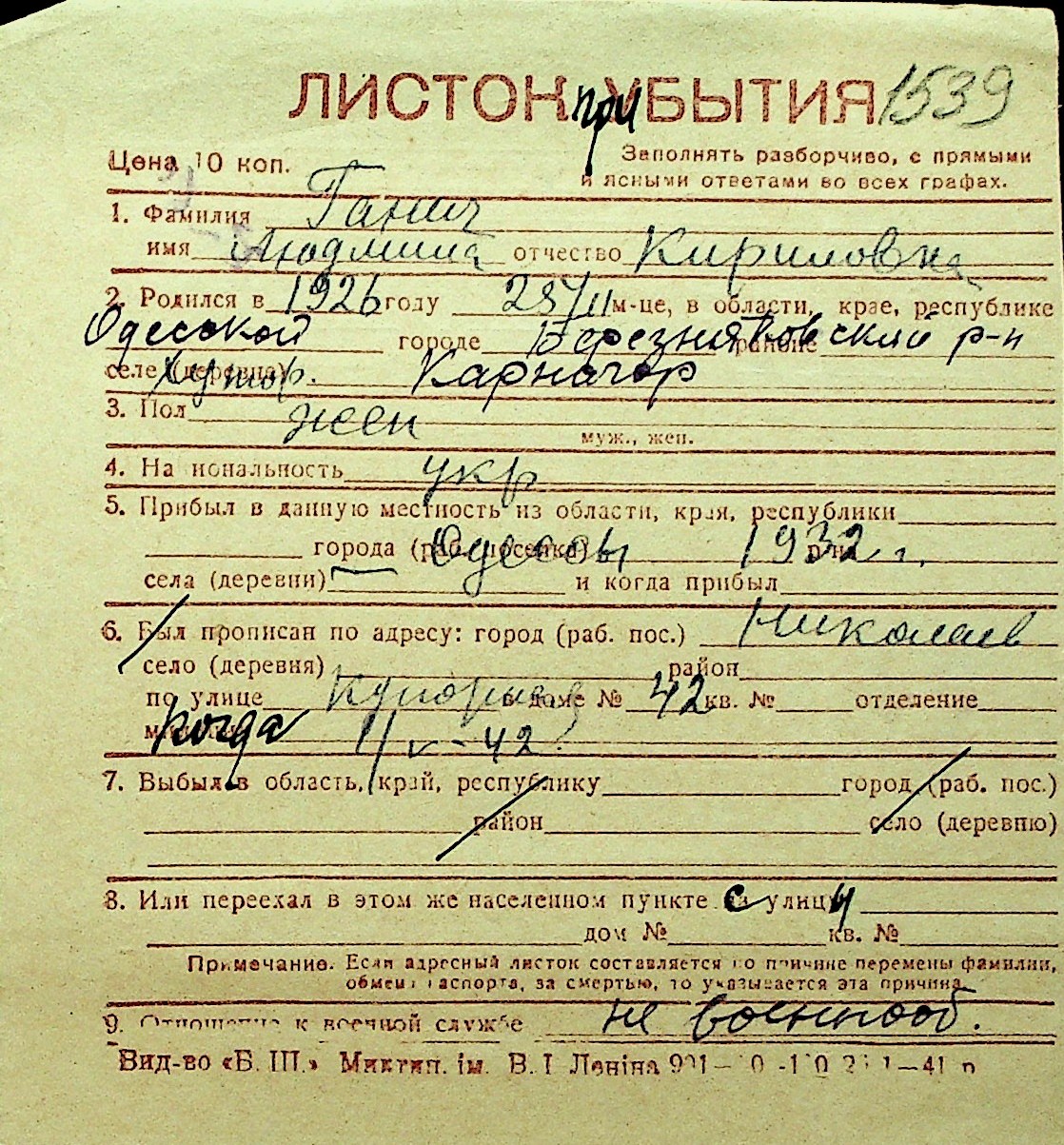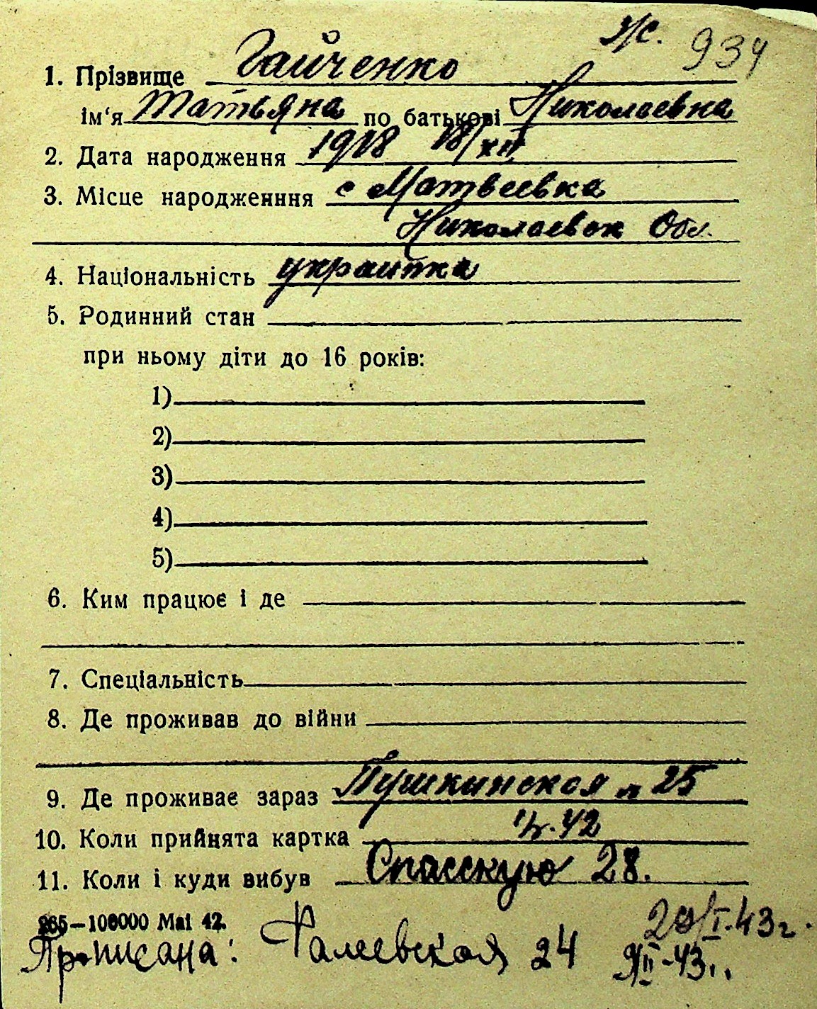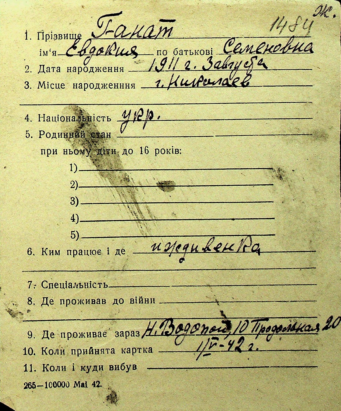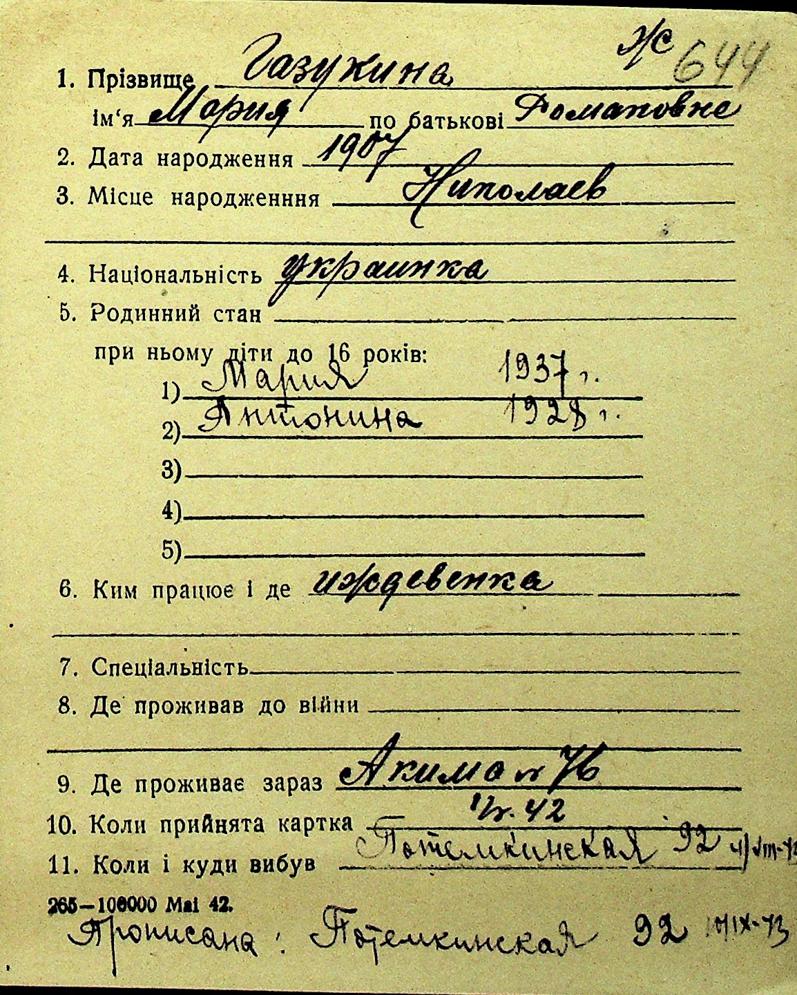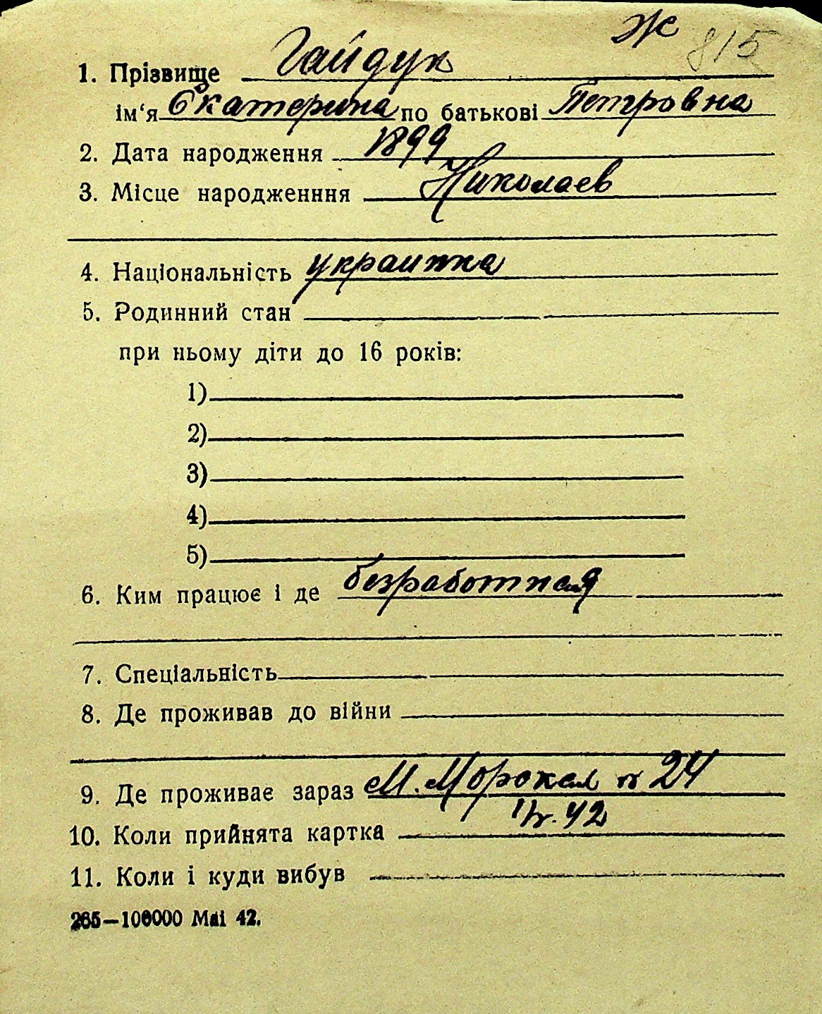 • • Перелік карток до фонду № Н-1016