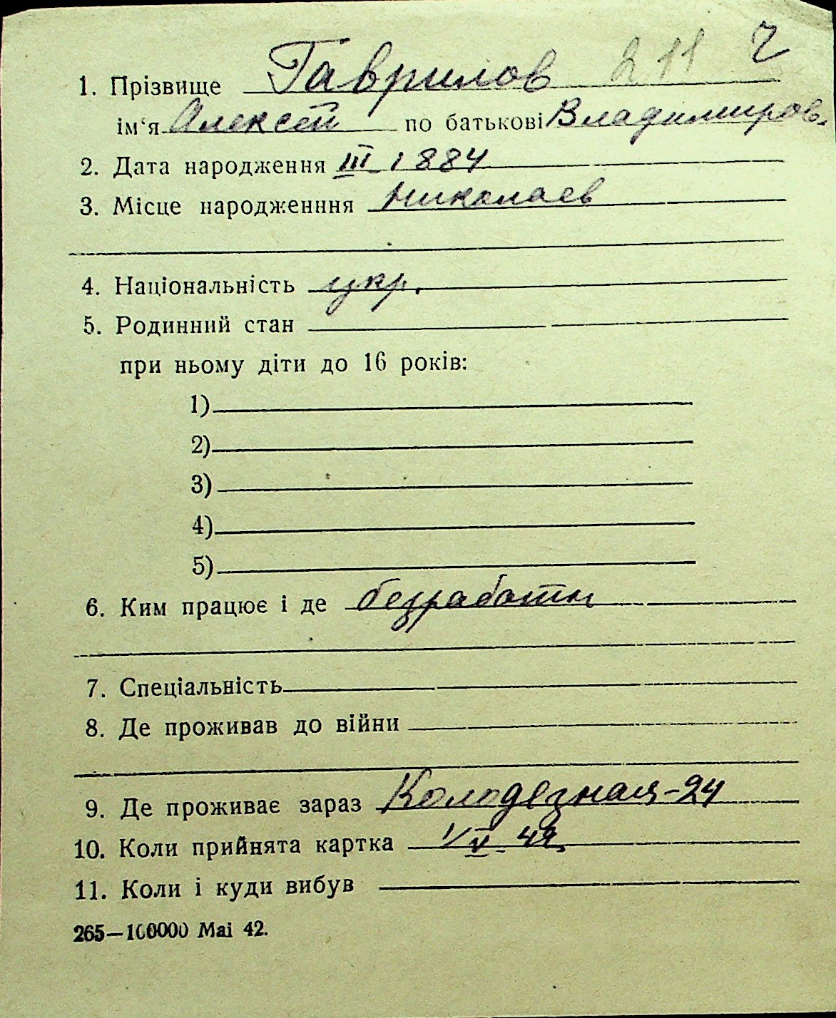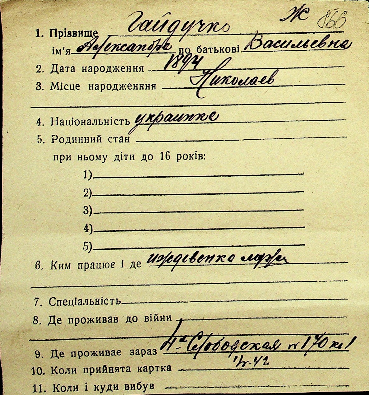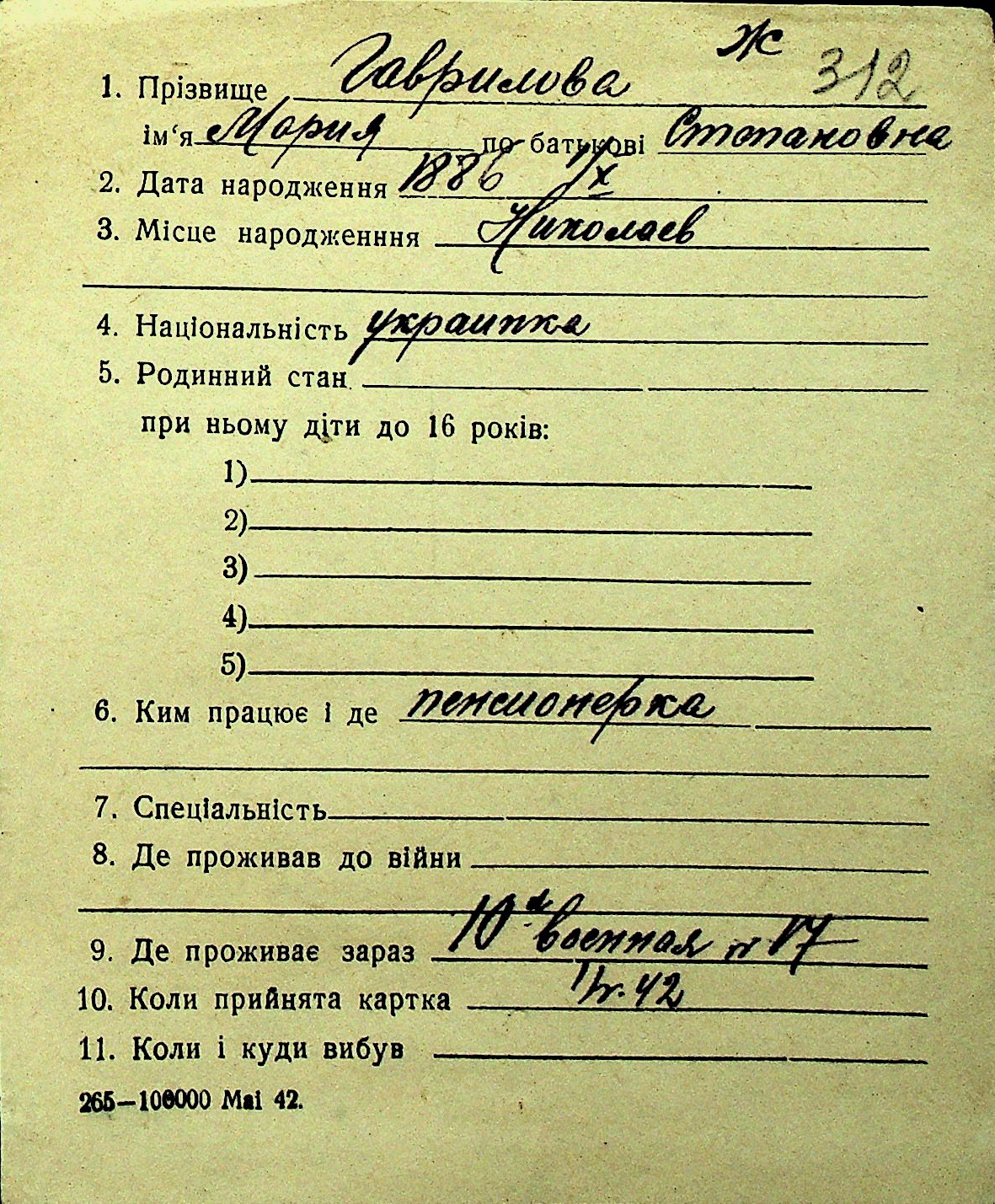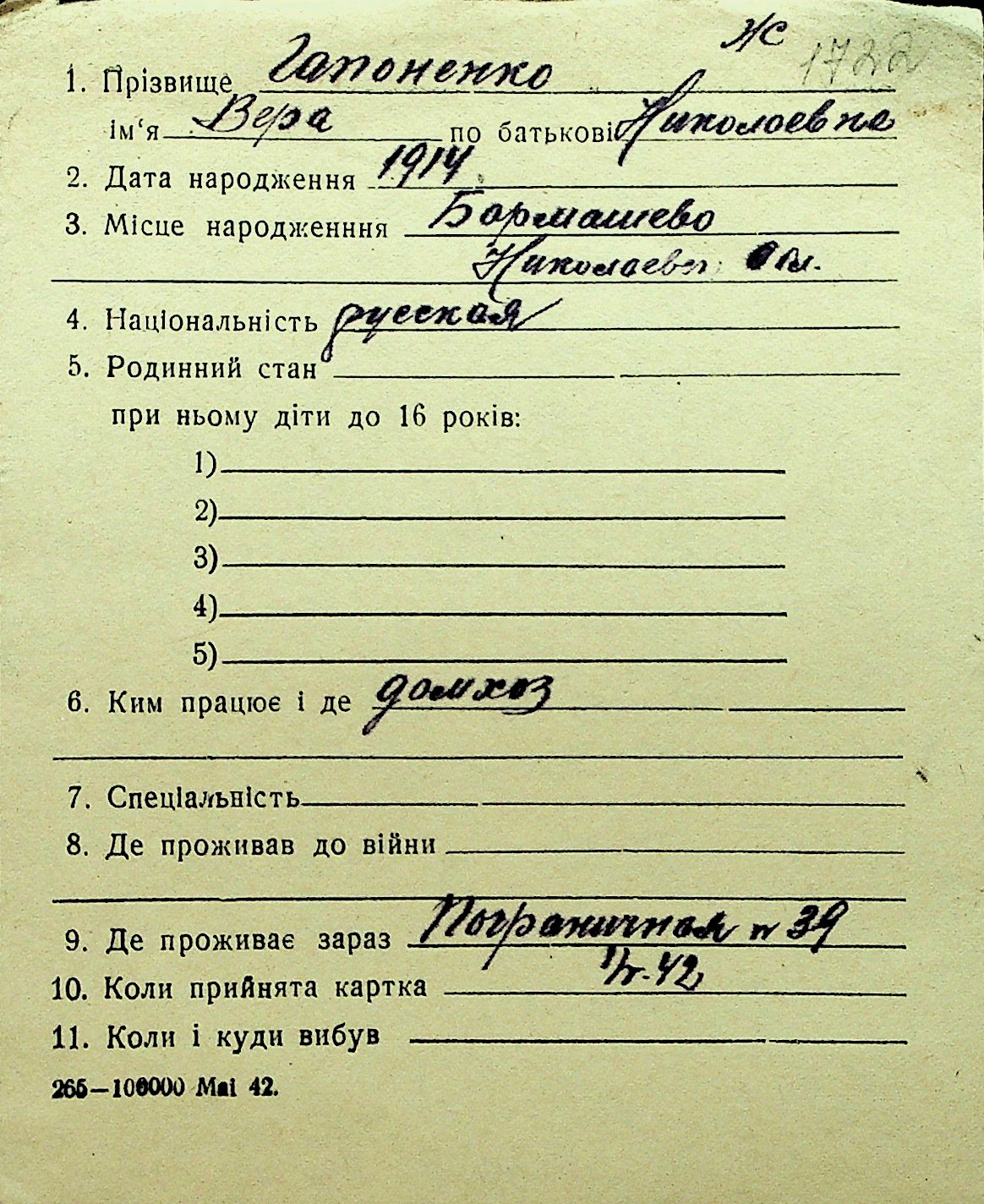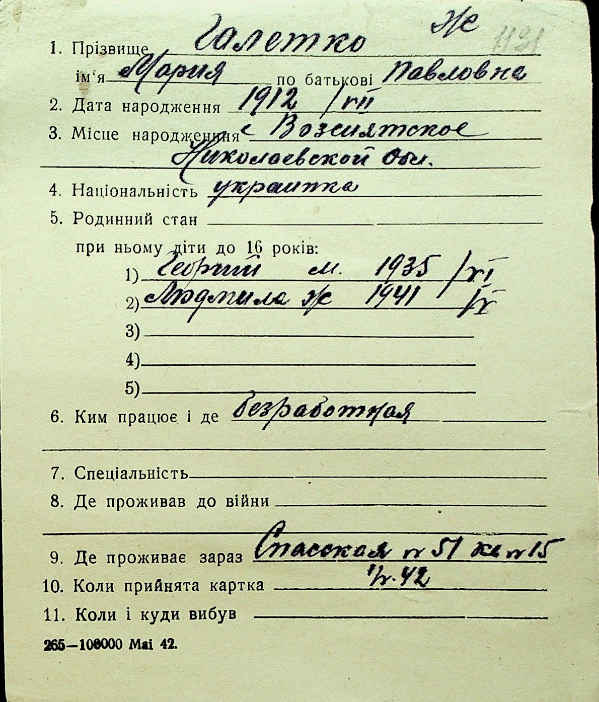 • • Перелік карток до фонду № Н-1016
