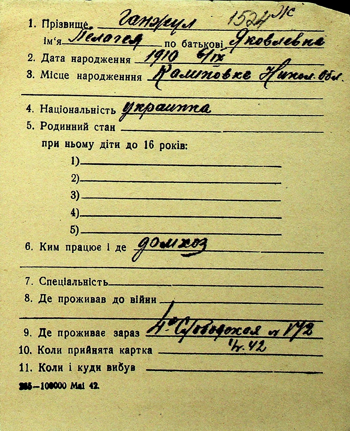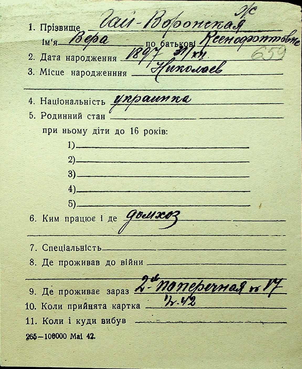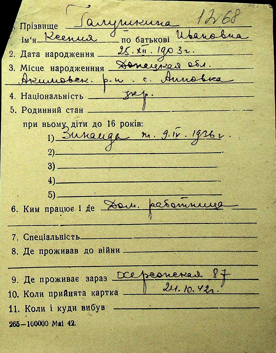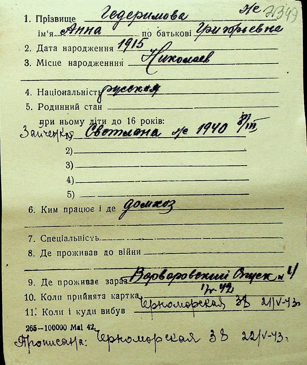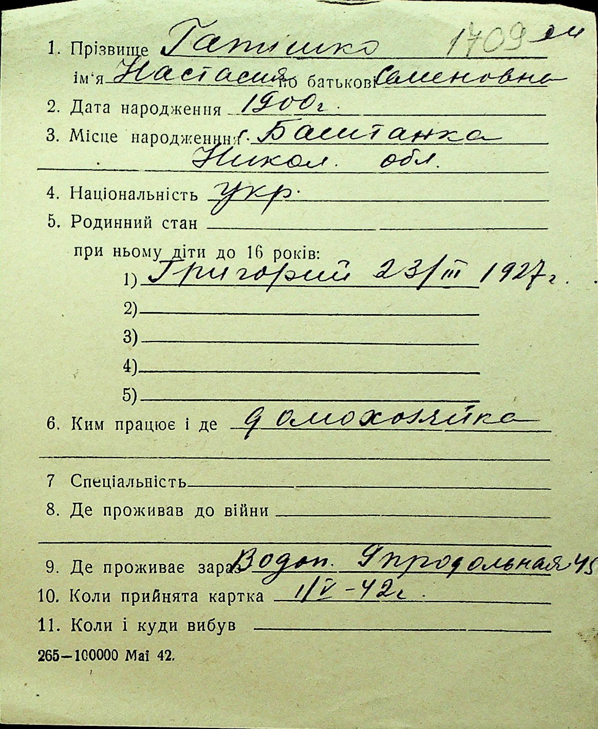 • • Перелік карток до фонду № Н-1016