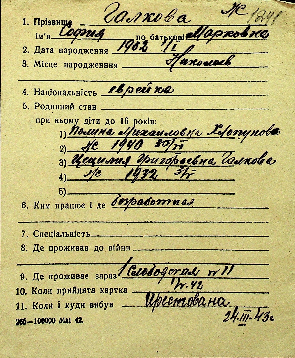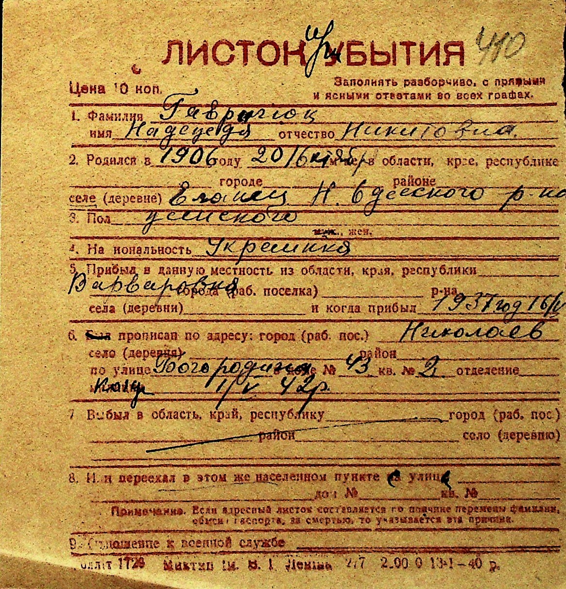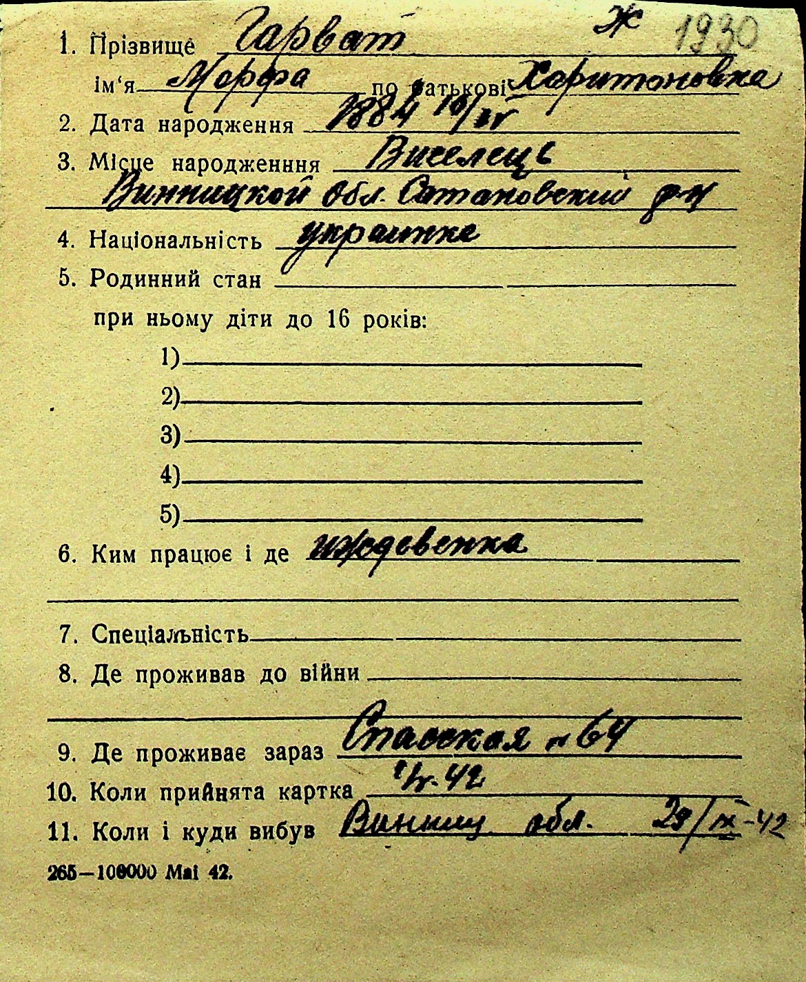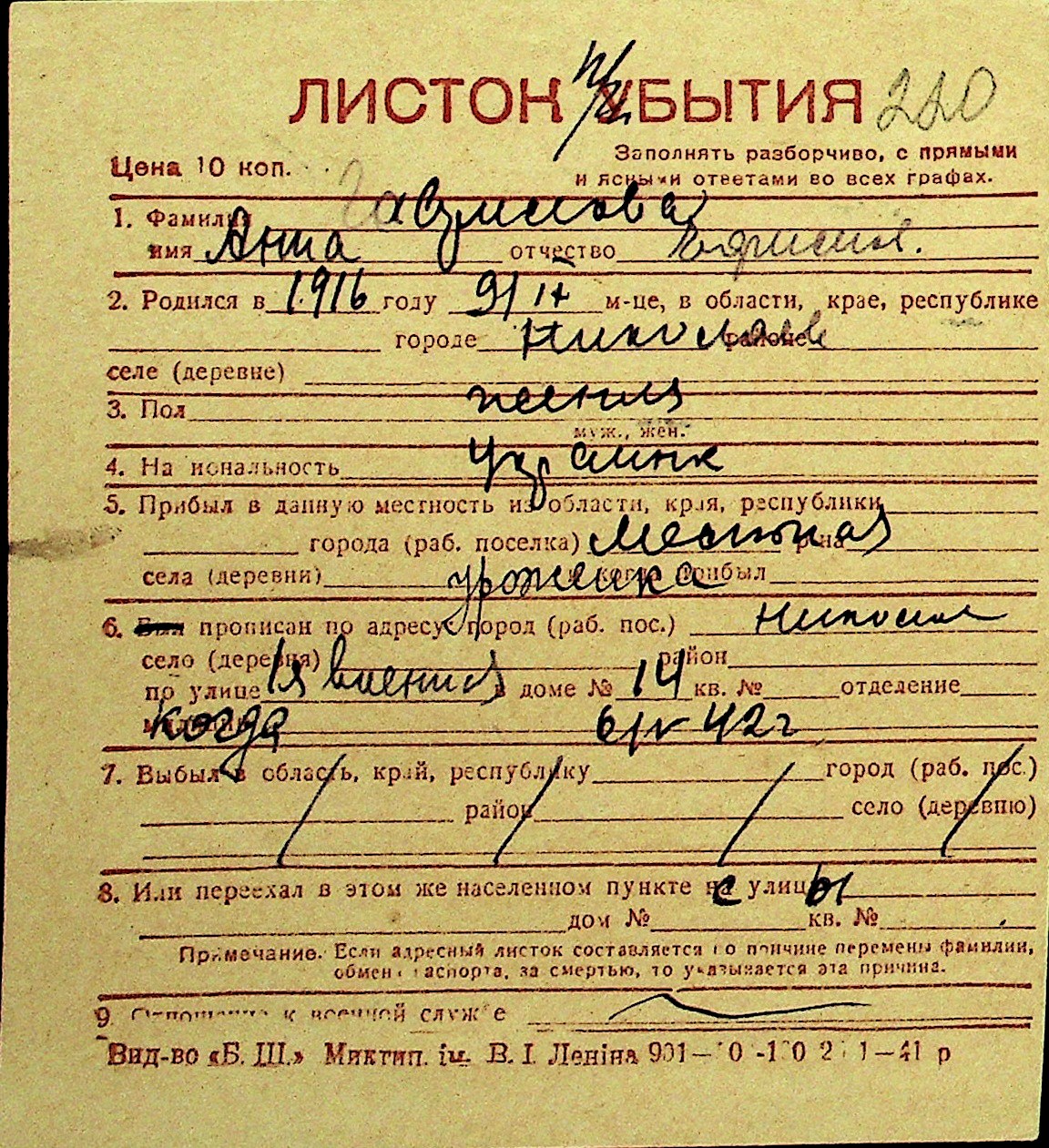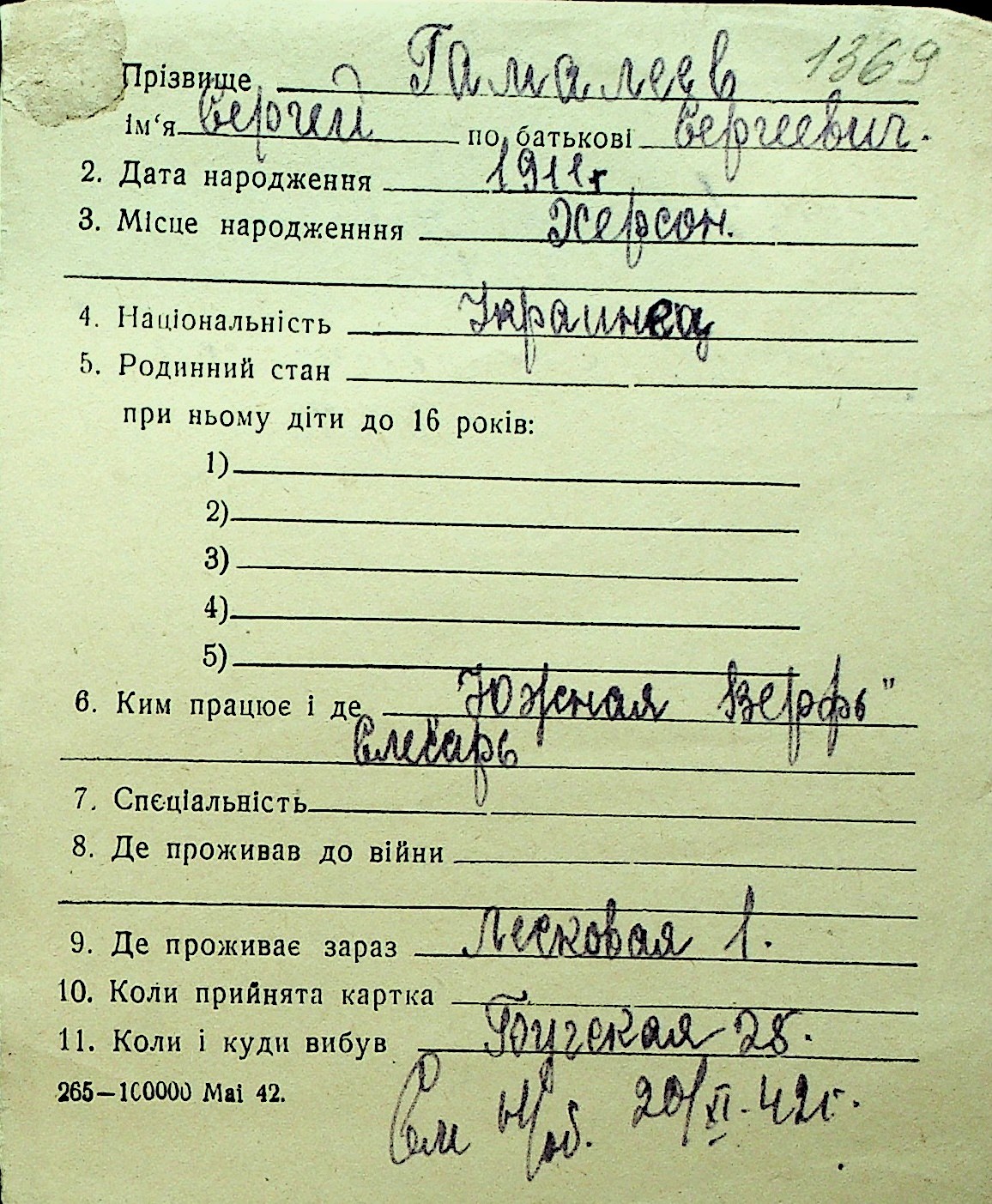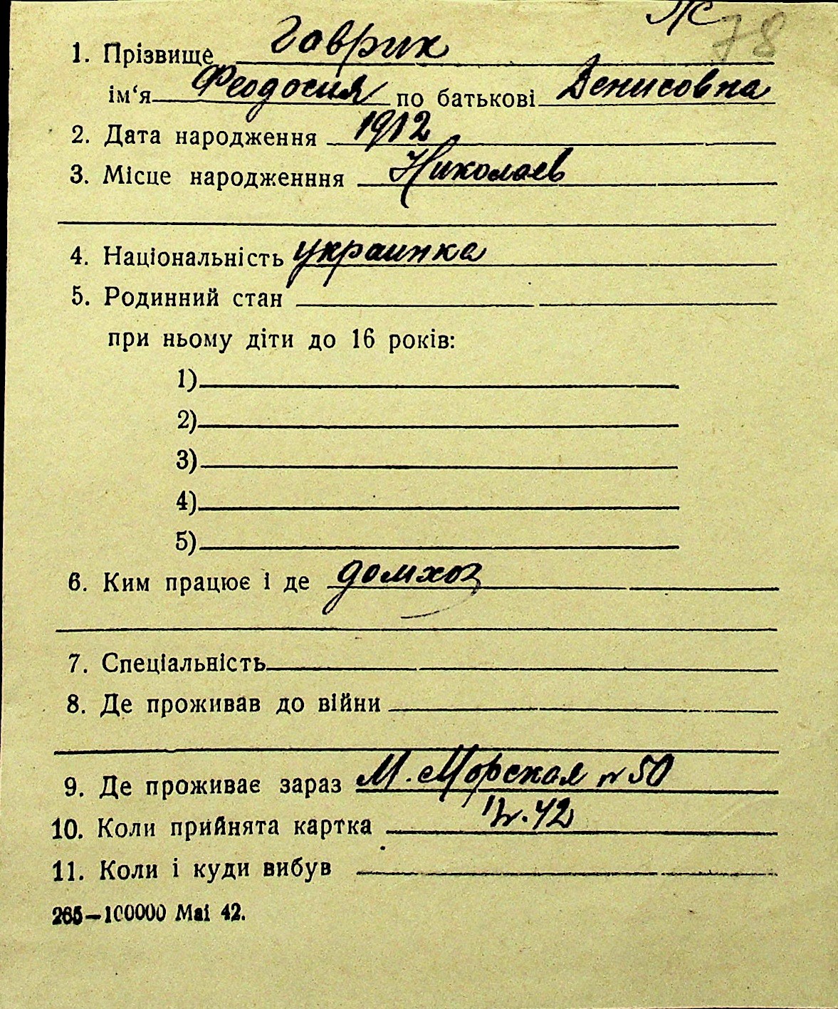 • • Перелік карток до фонду № Н-1016