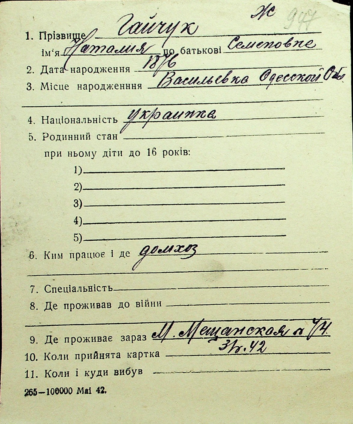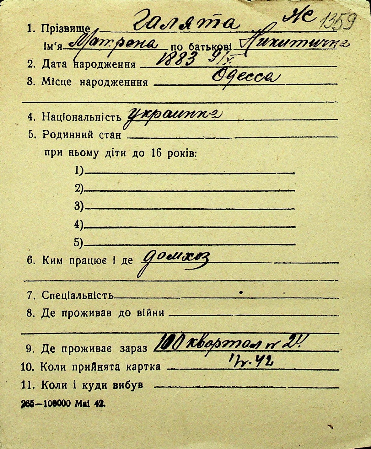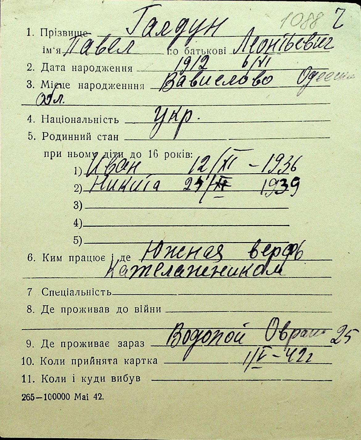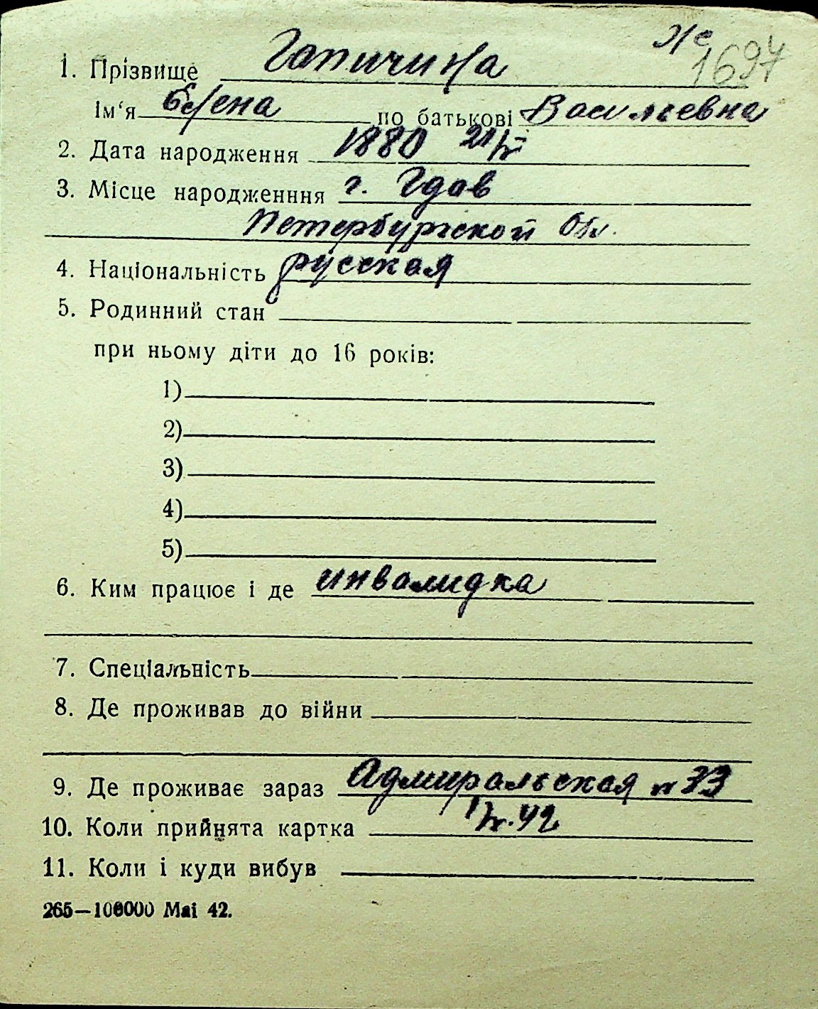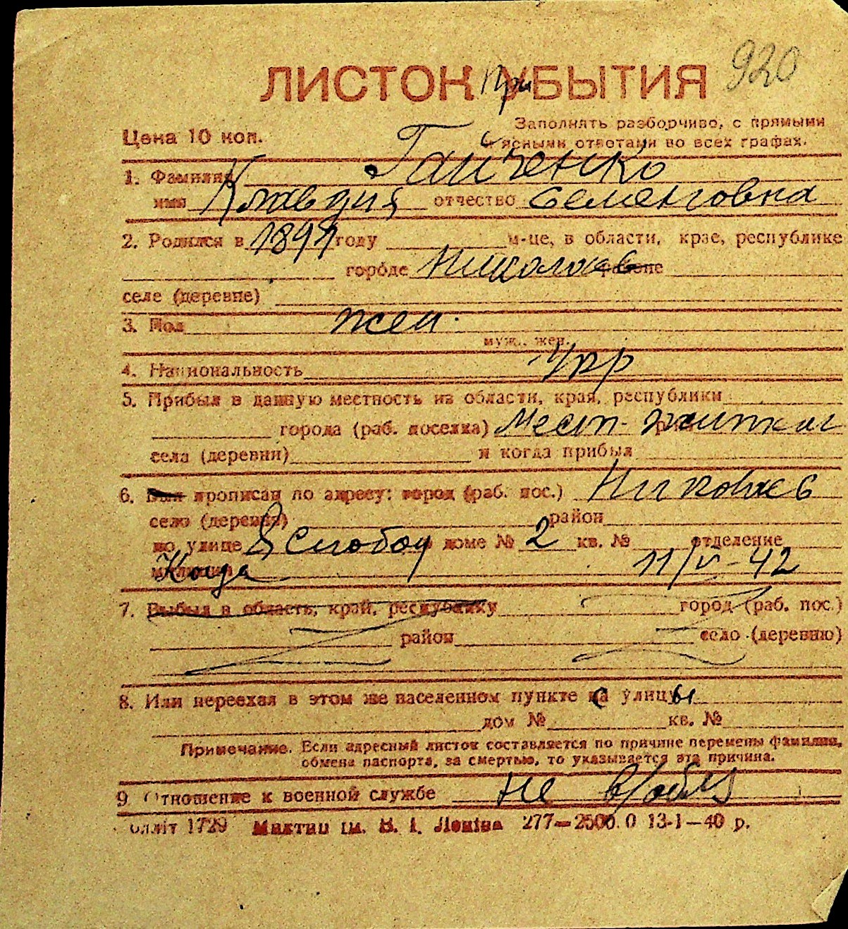 • • Перелік карток до фонду № Н-1016