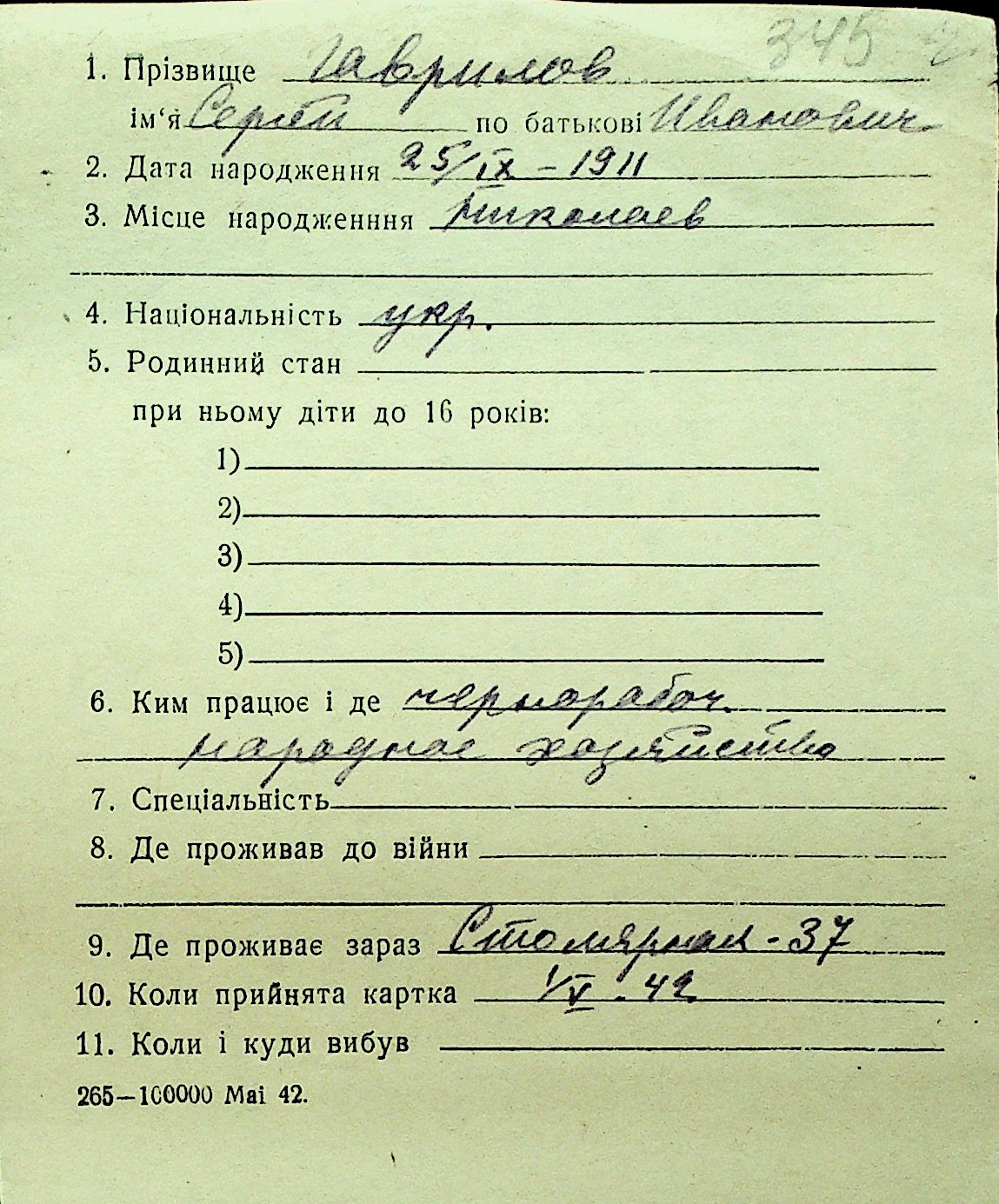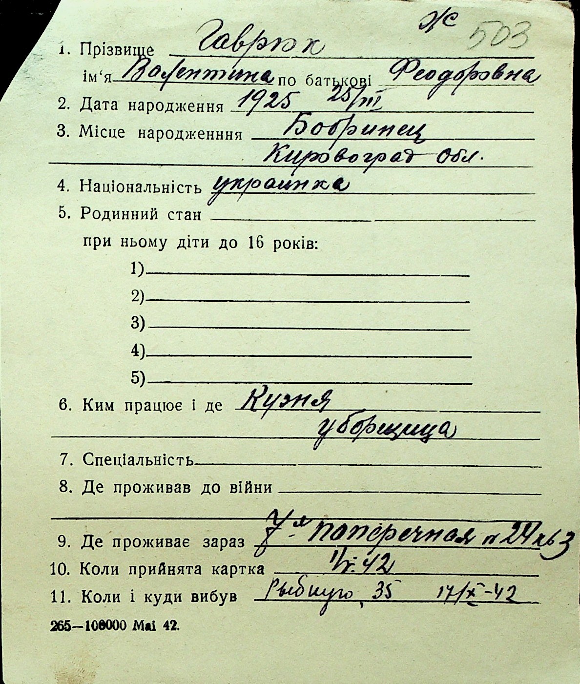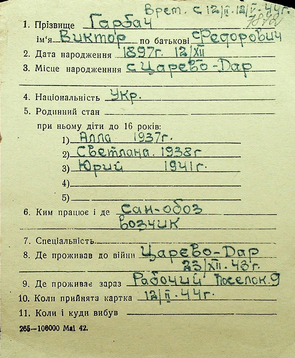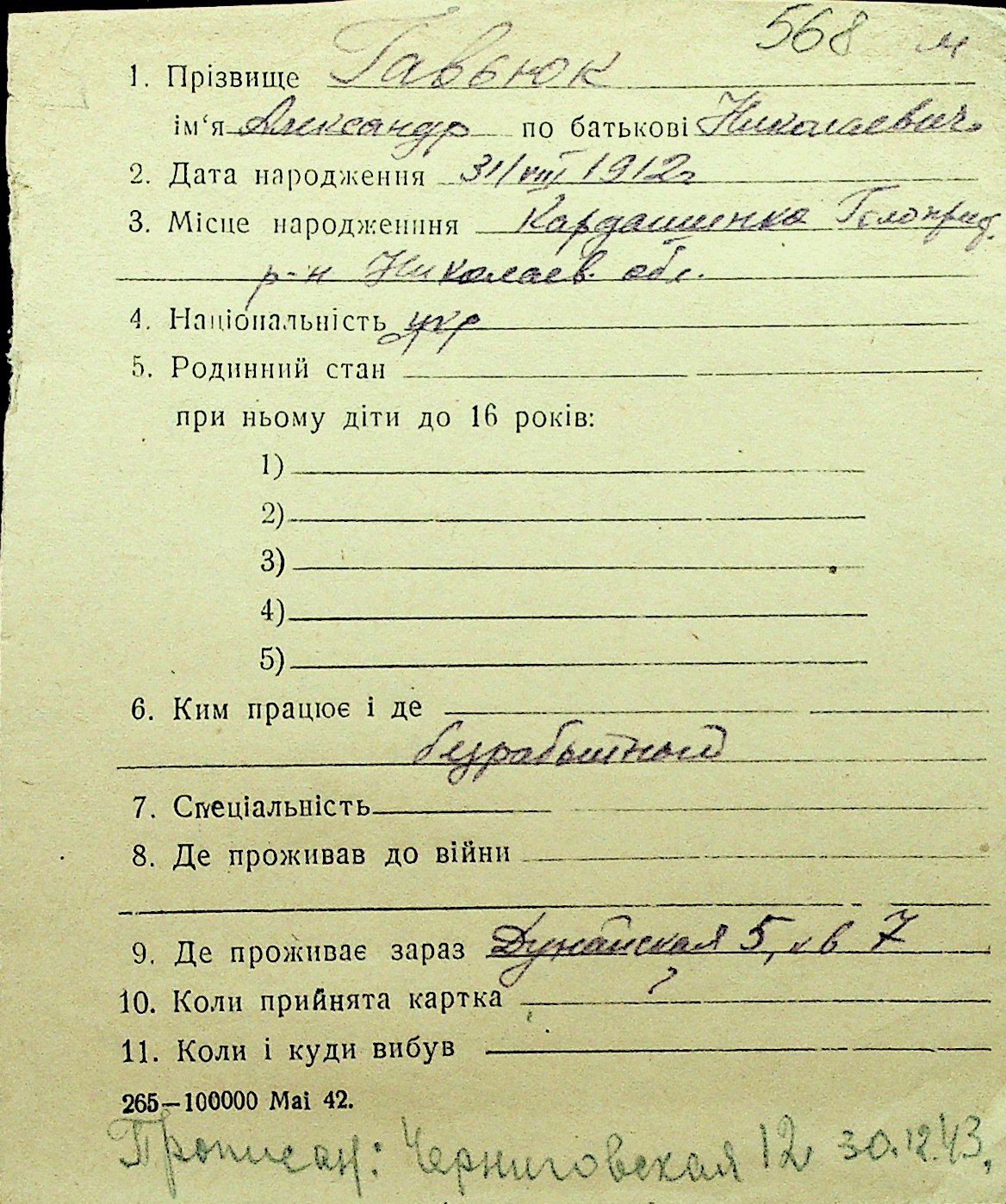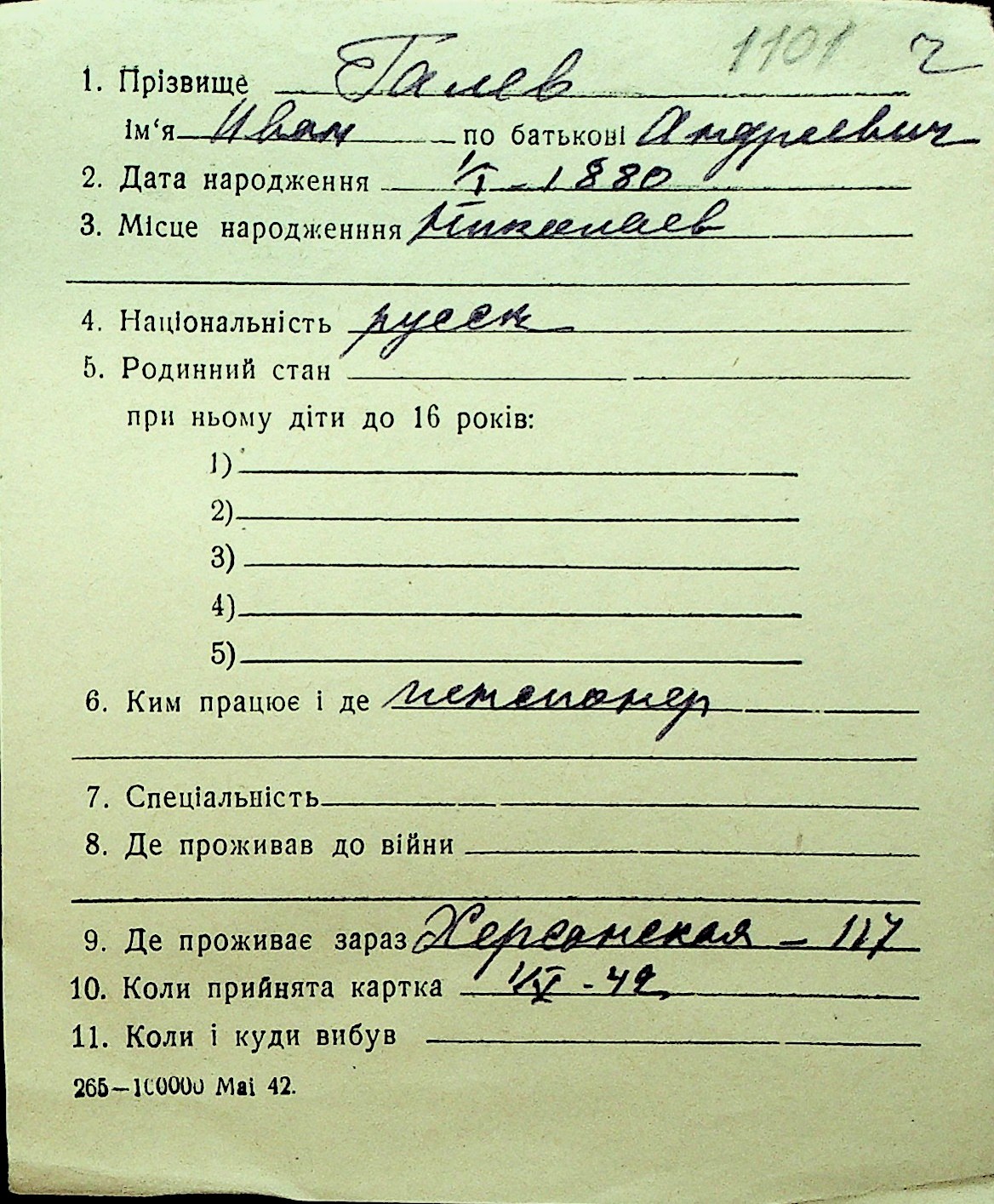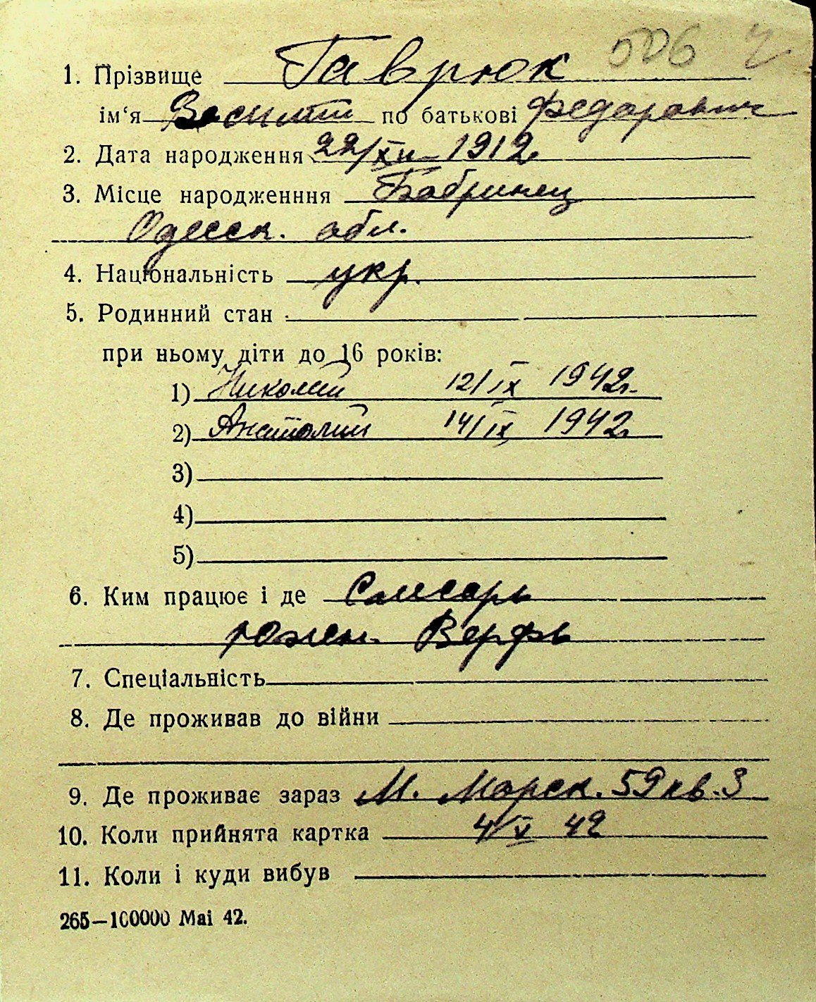 • • Перелік карток до фонду № Н-1016