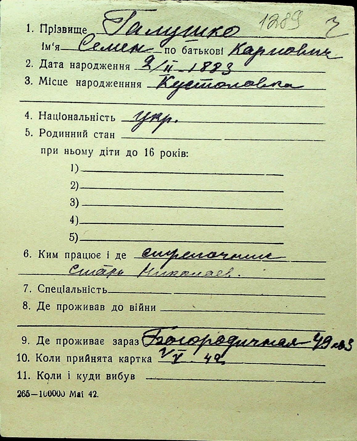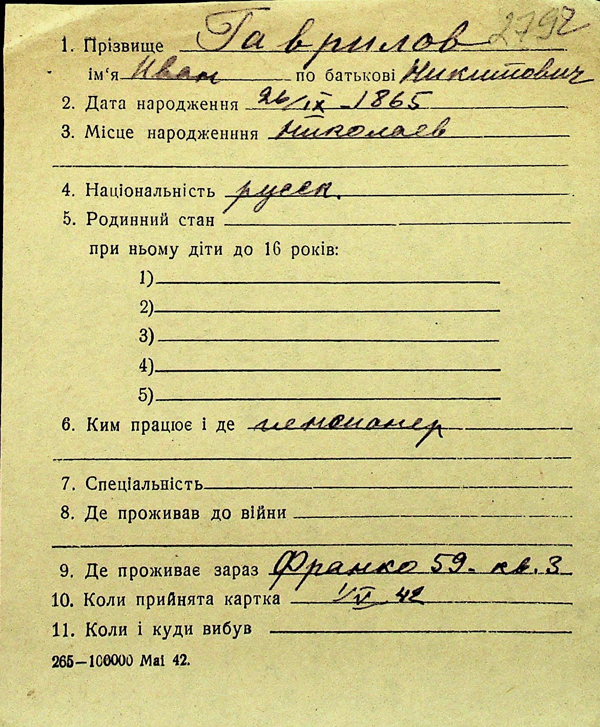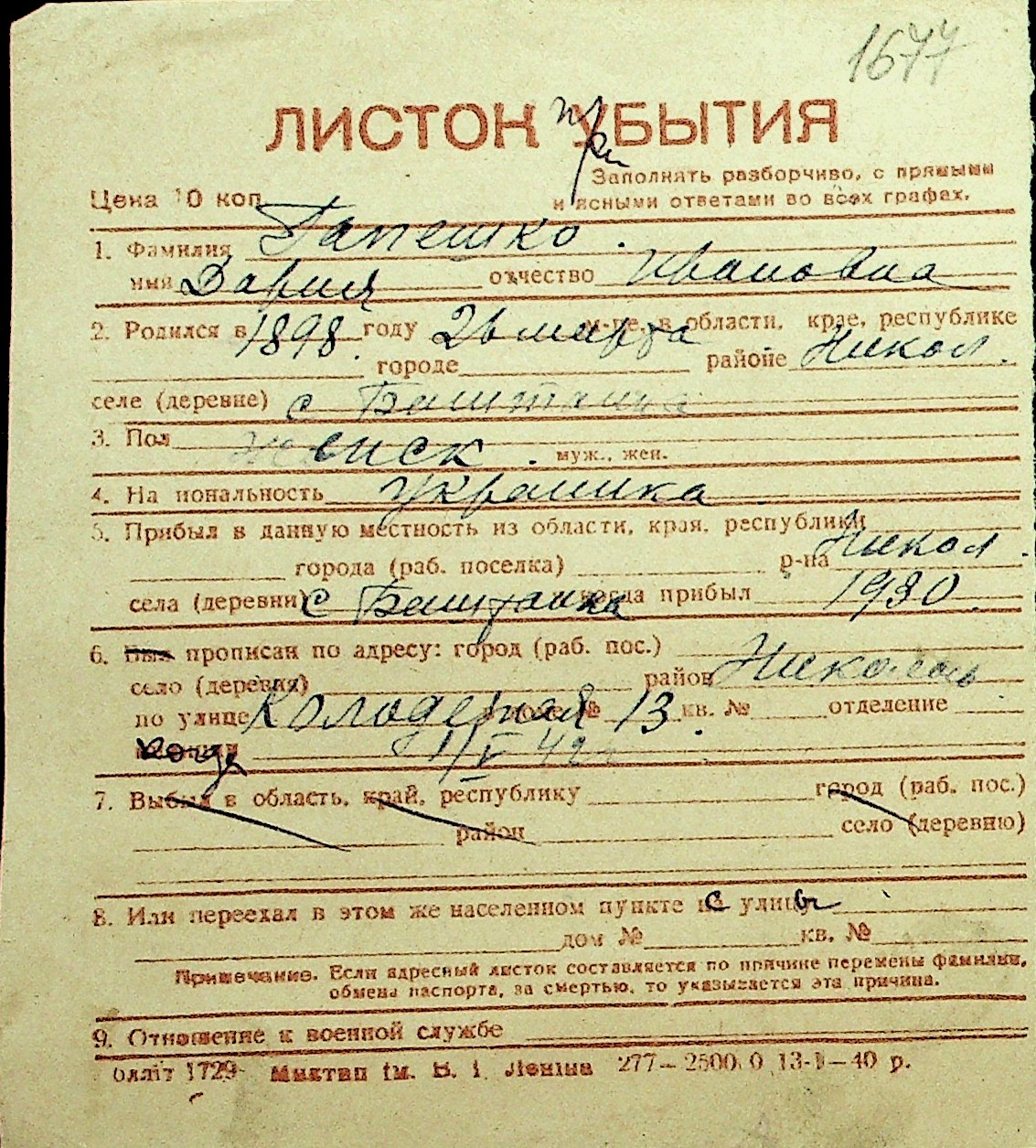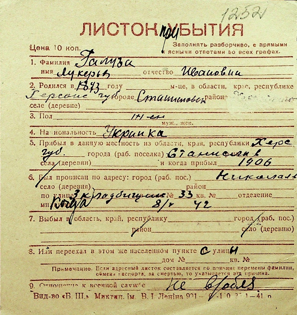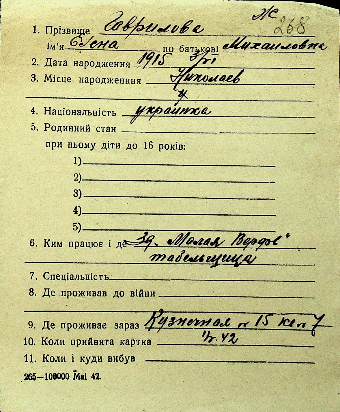 • • Перелік карток до фонду № Н-1016