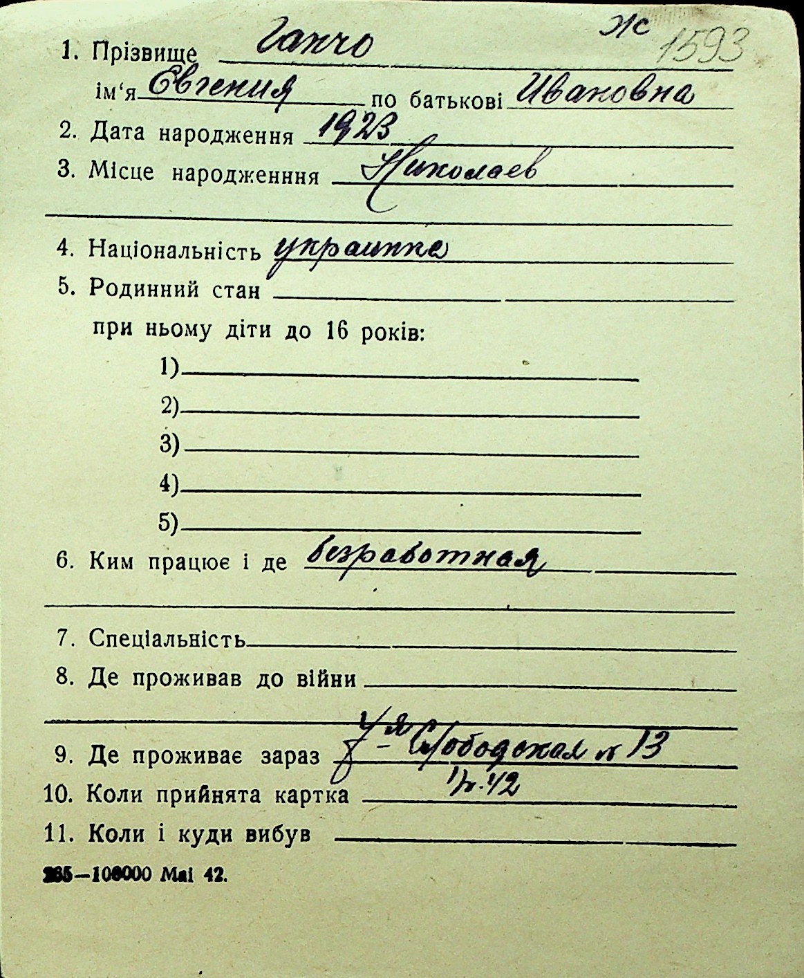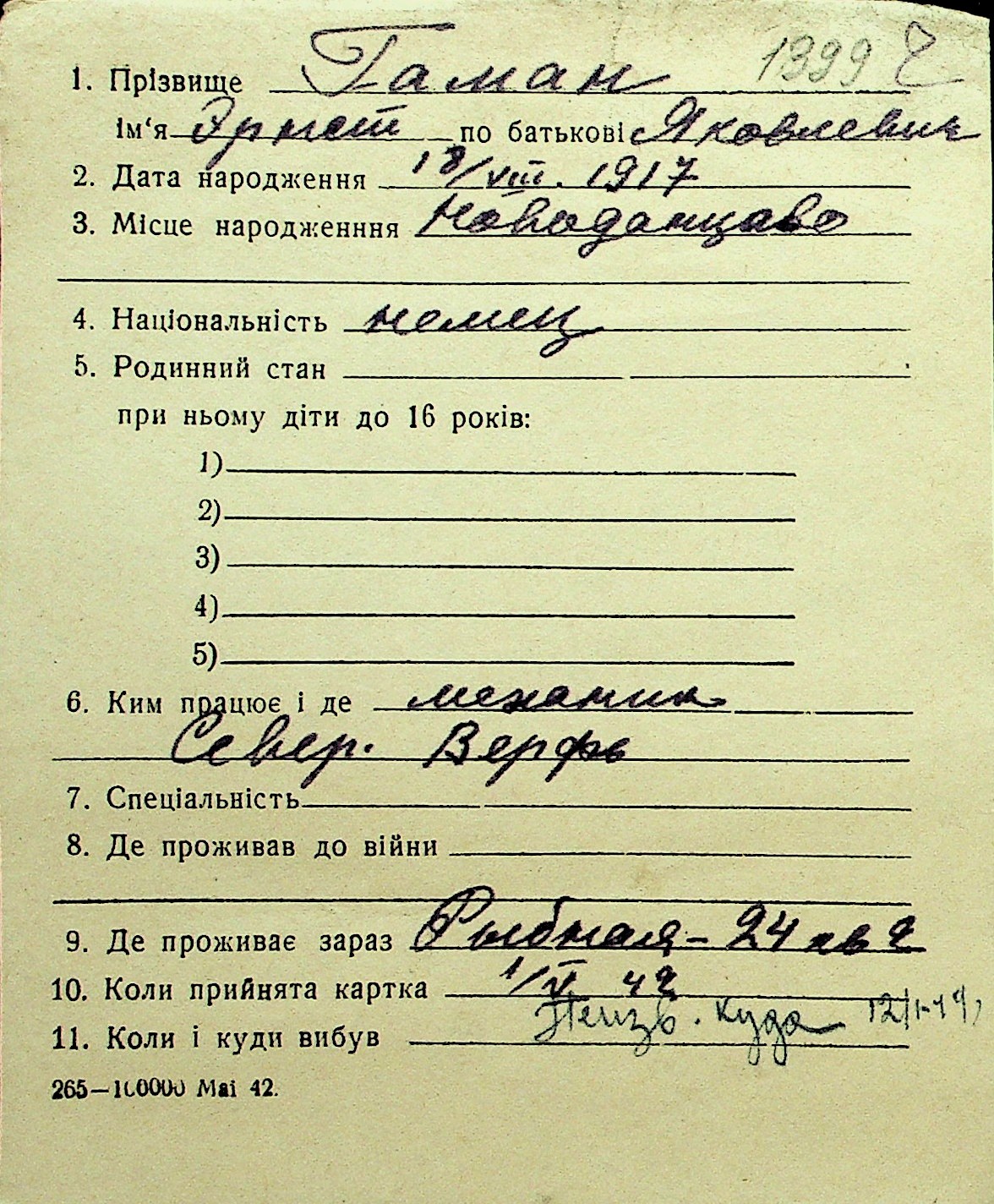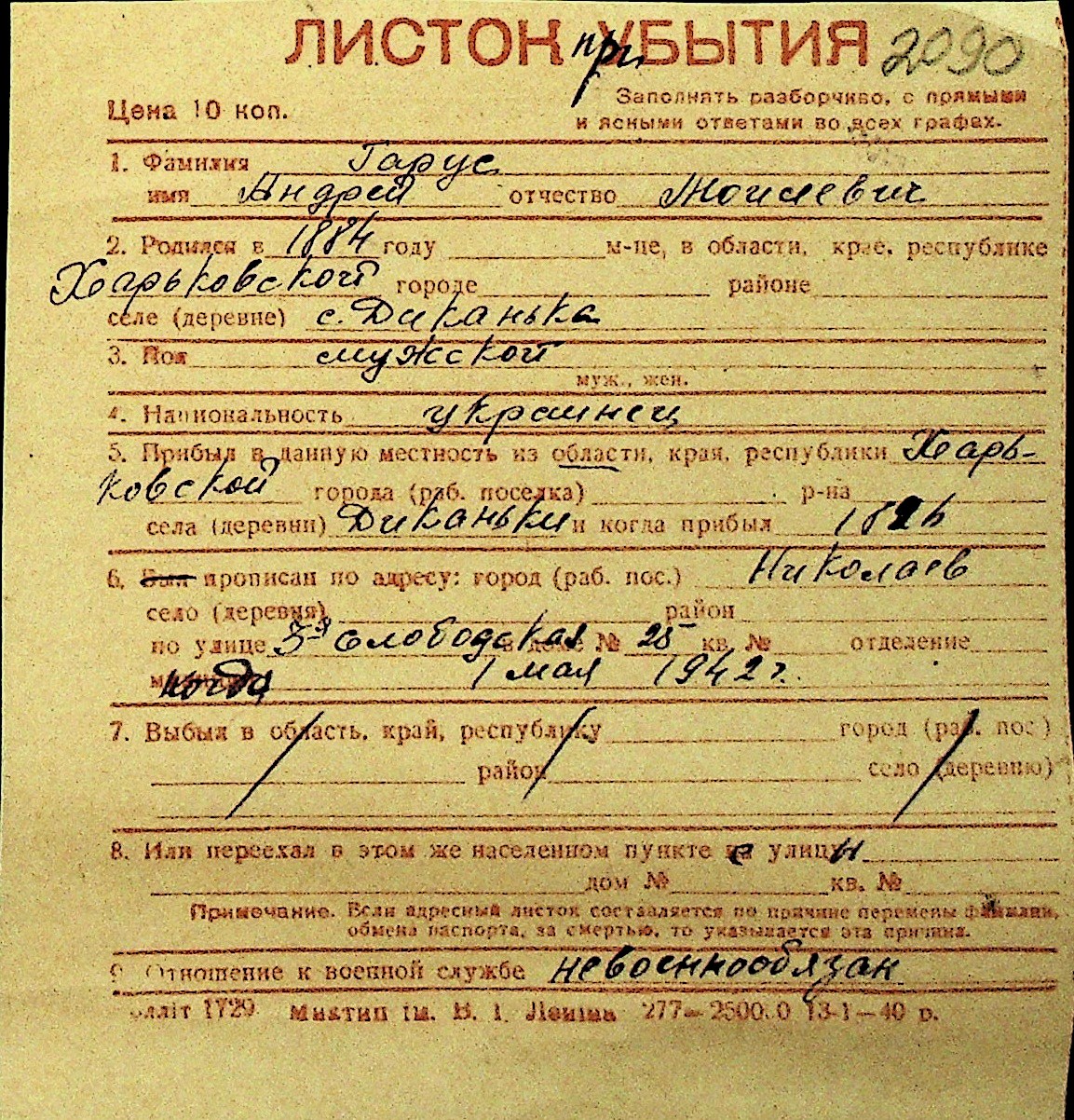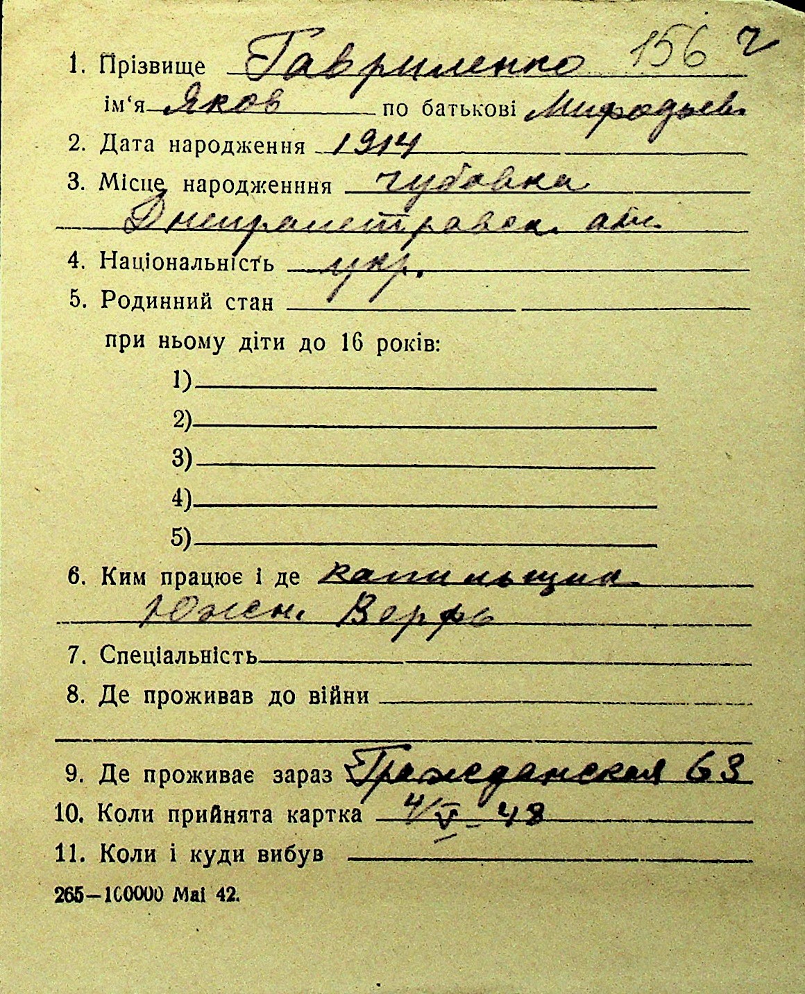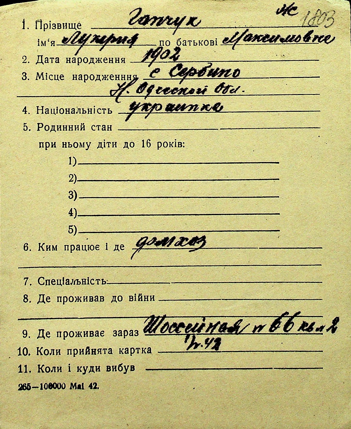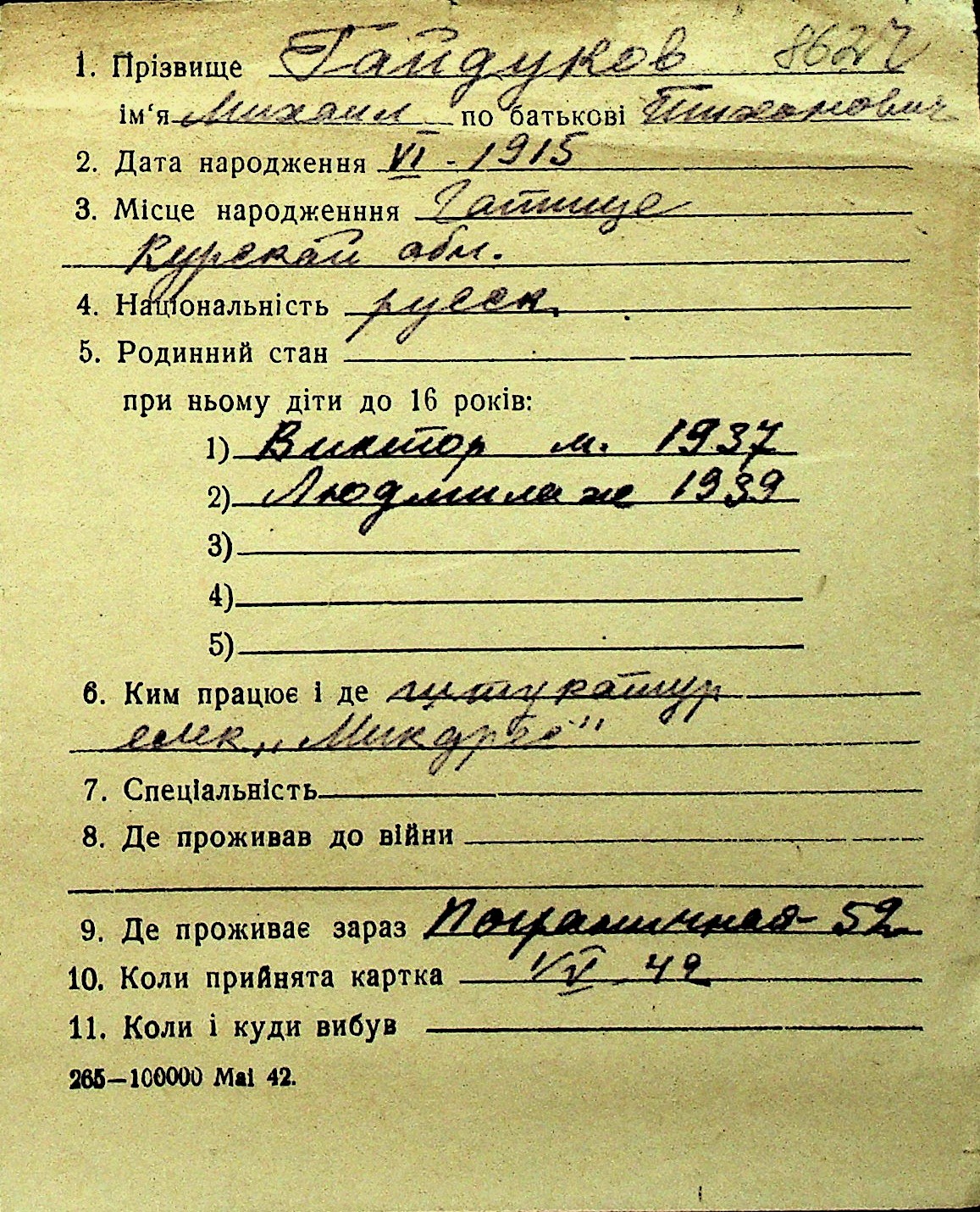 • • Перелік карток до фонду № Н-1016