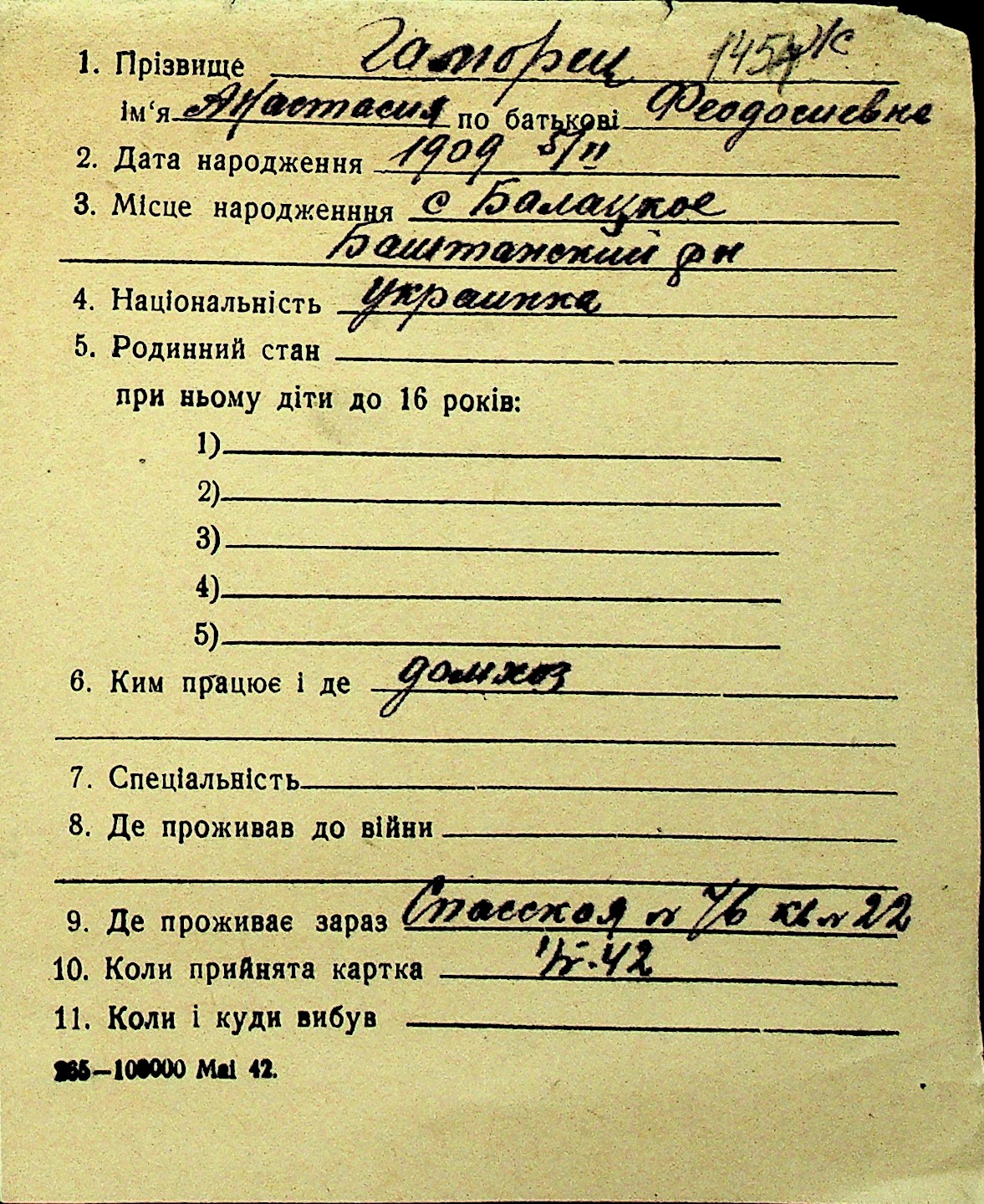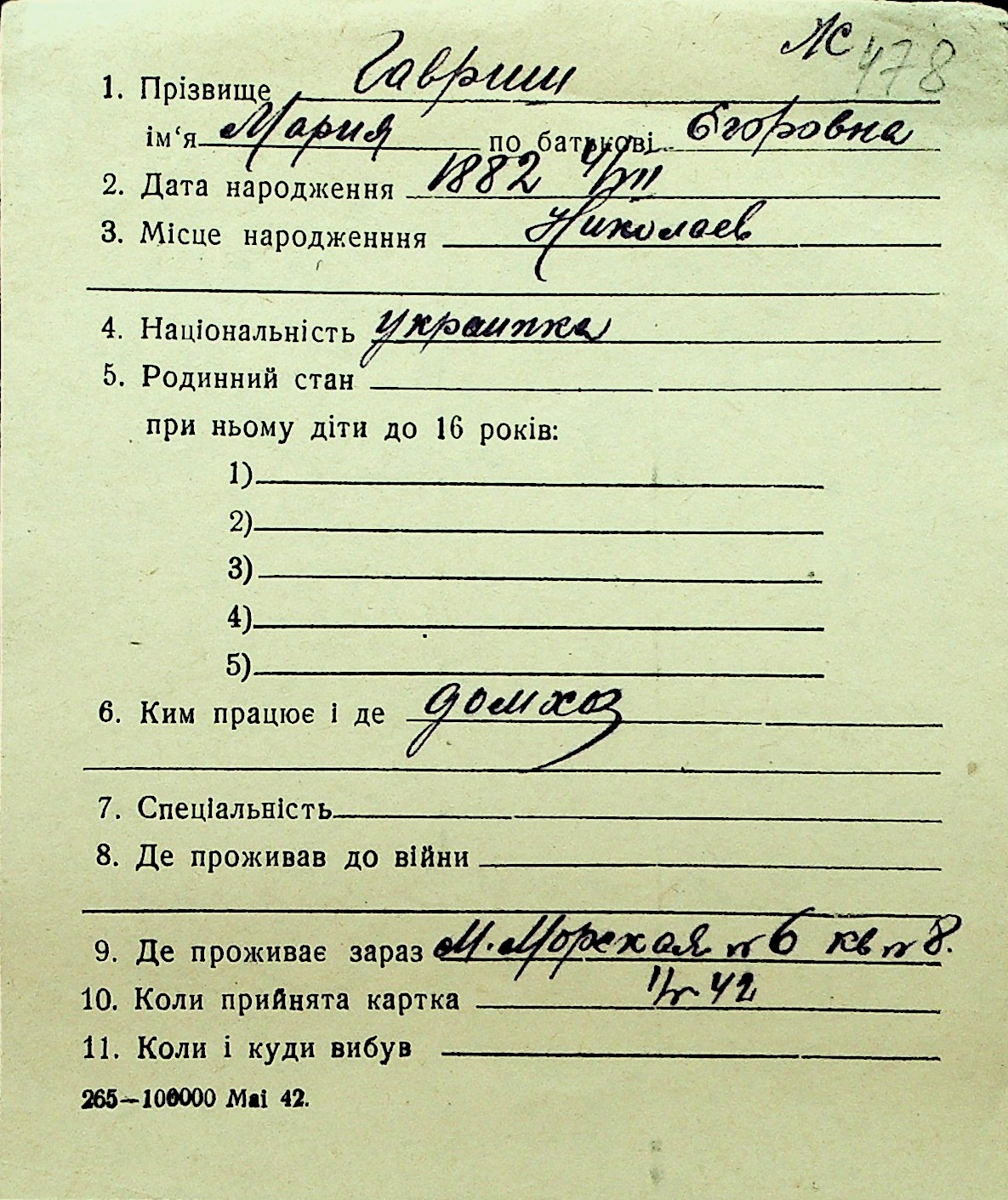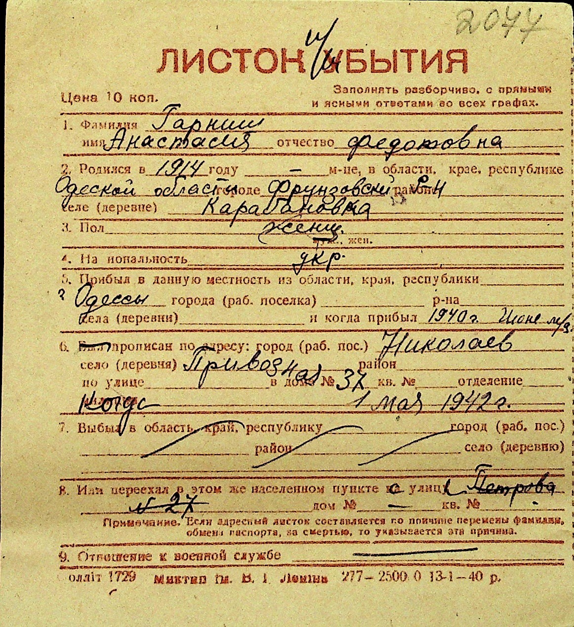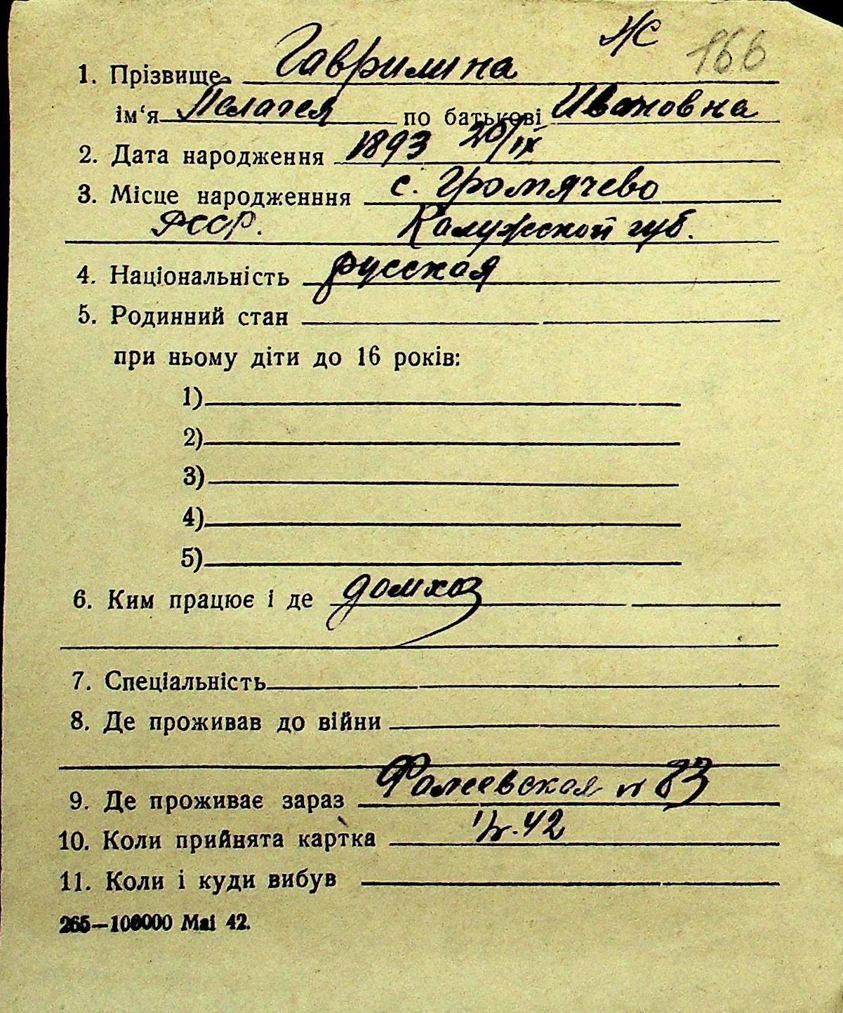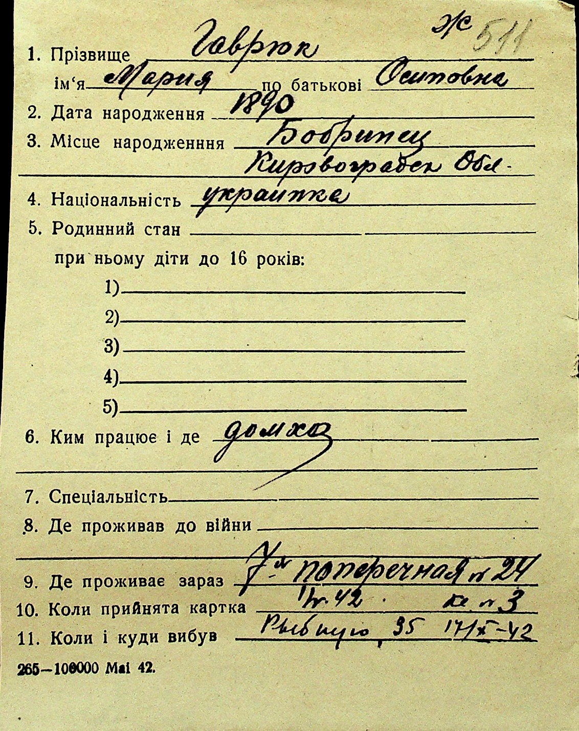 • • Перелік карток до фонду № Н-1016