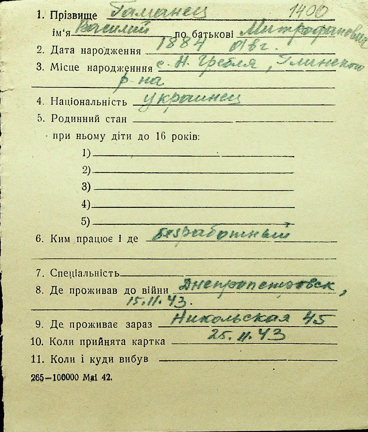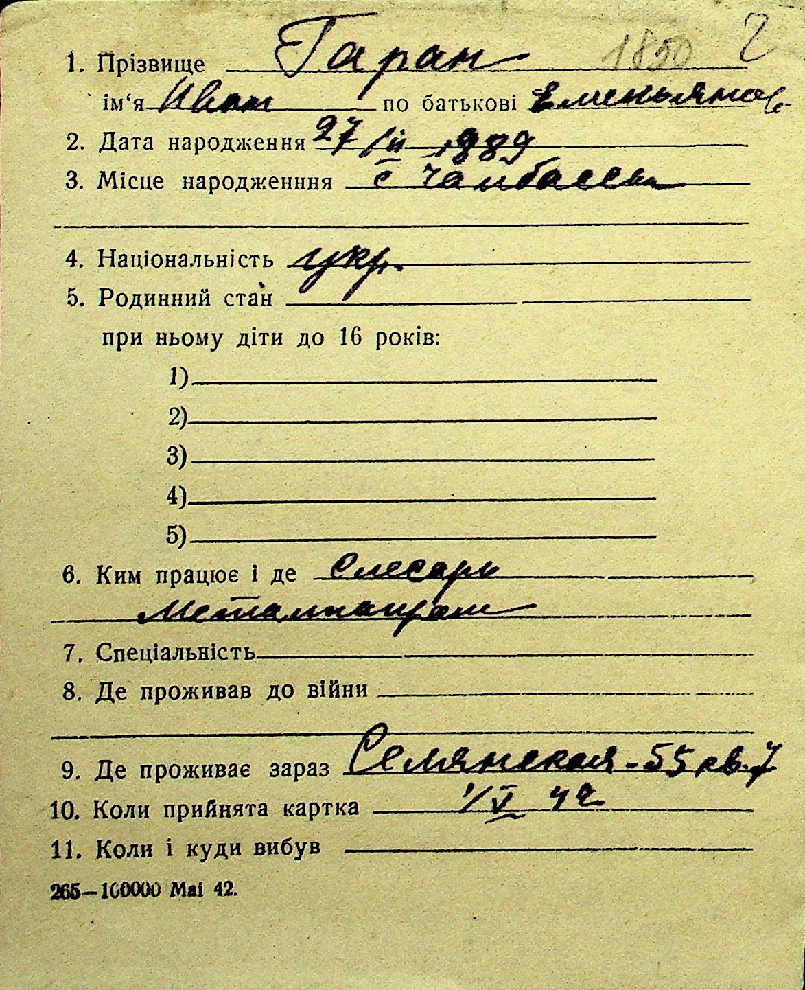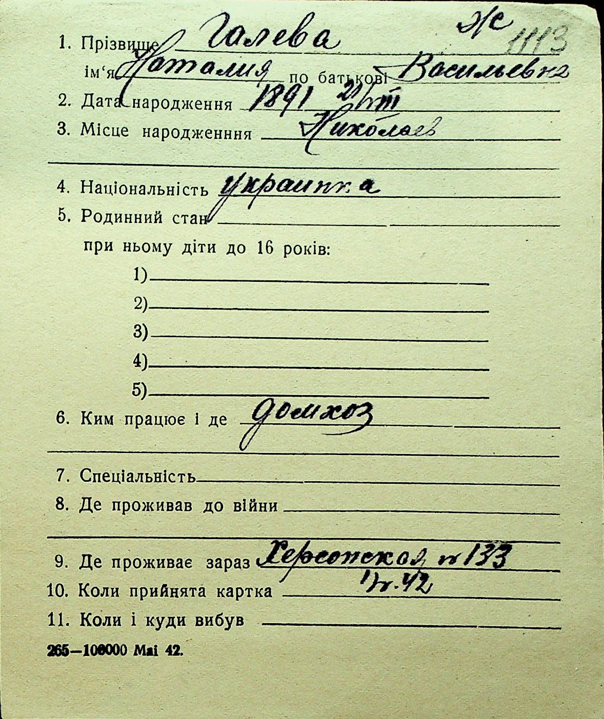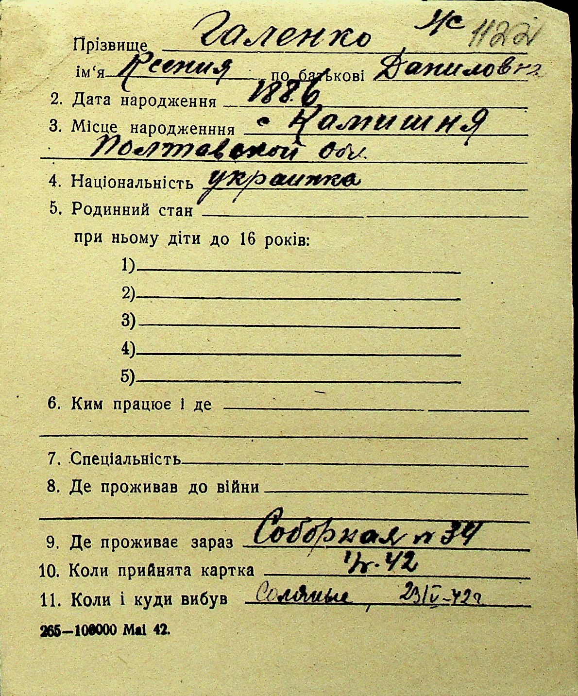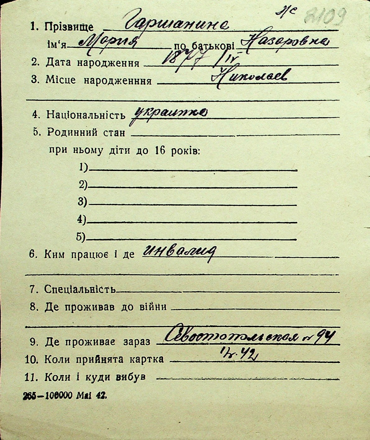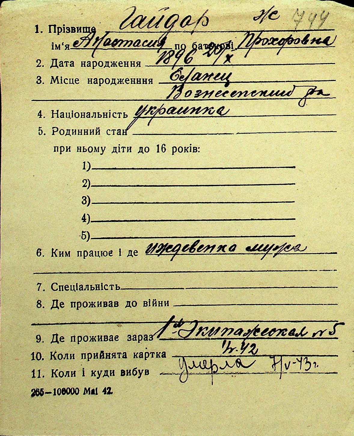 • • Перелік карток до фонду № Н-1016