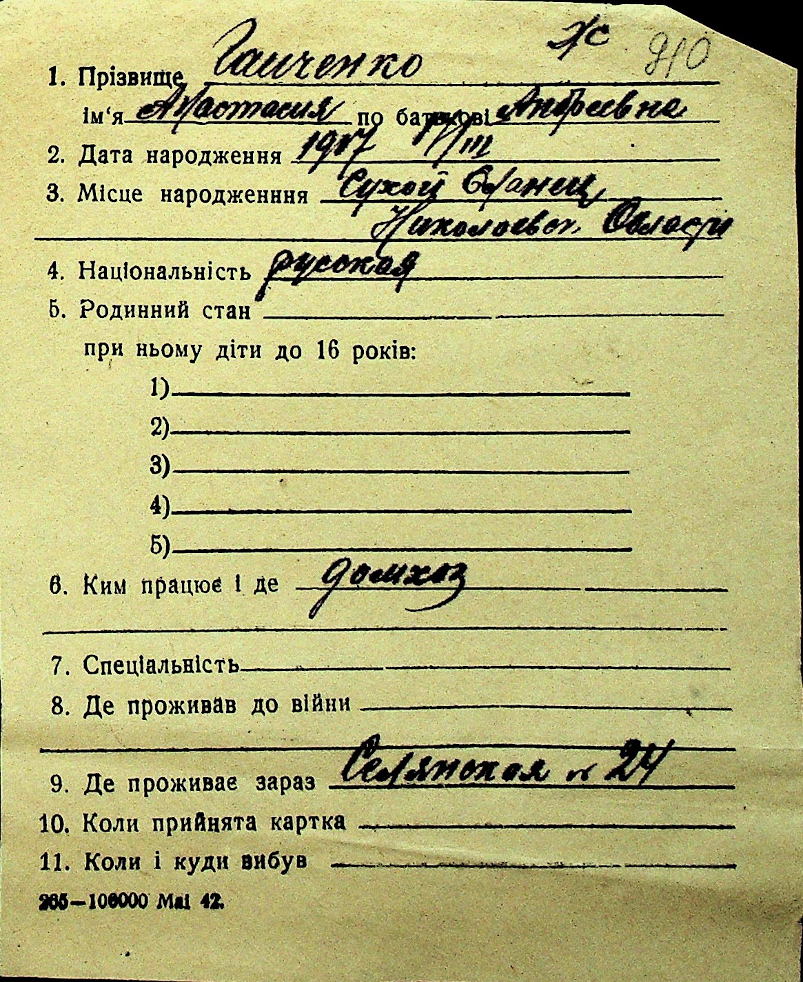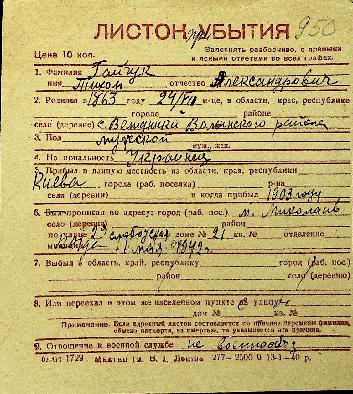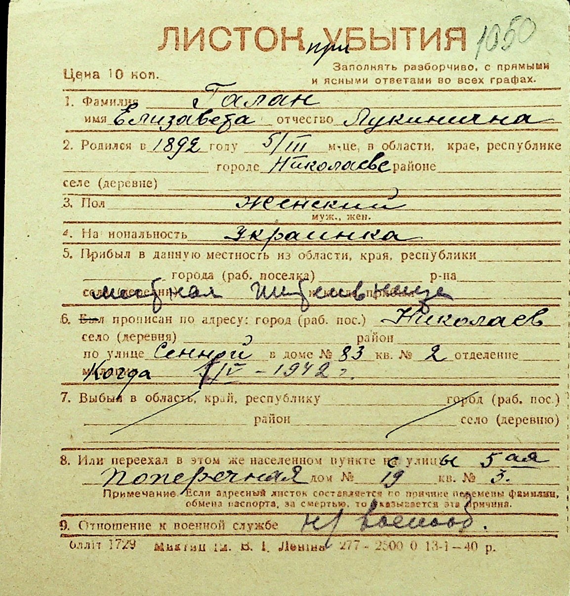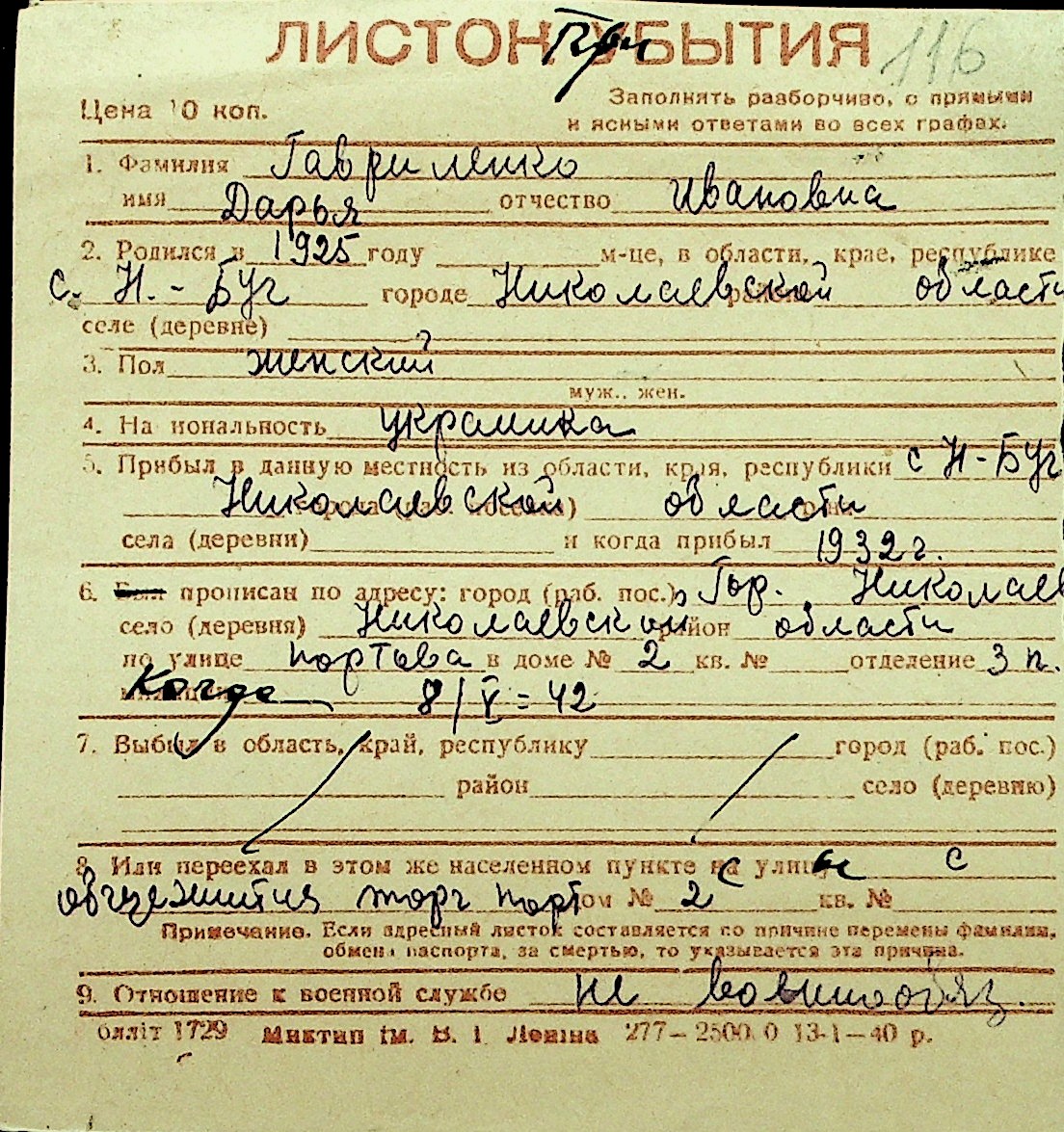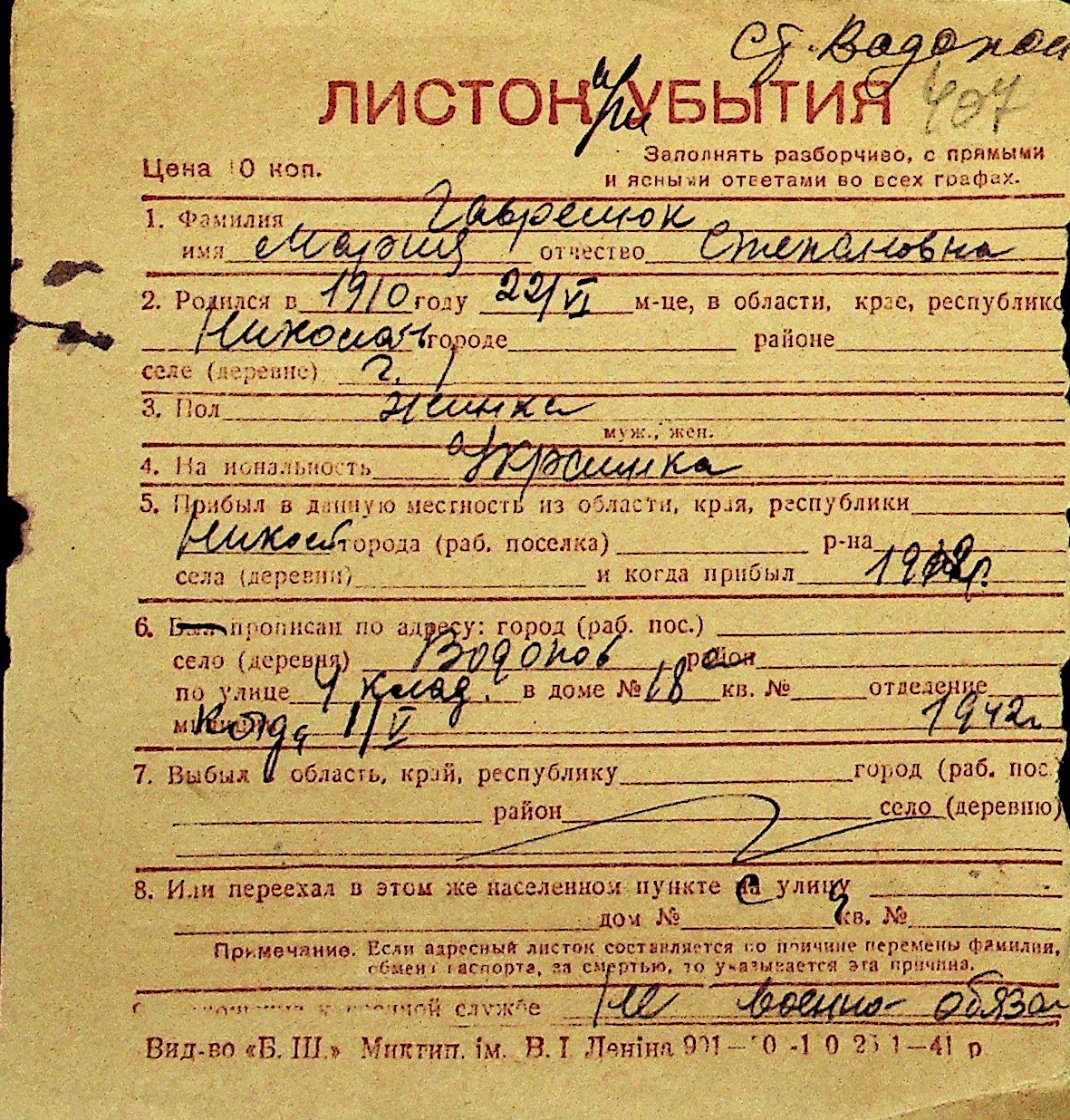 • • Перелік карток до фонду № Н-1016