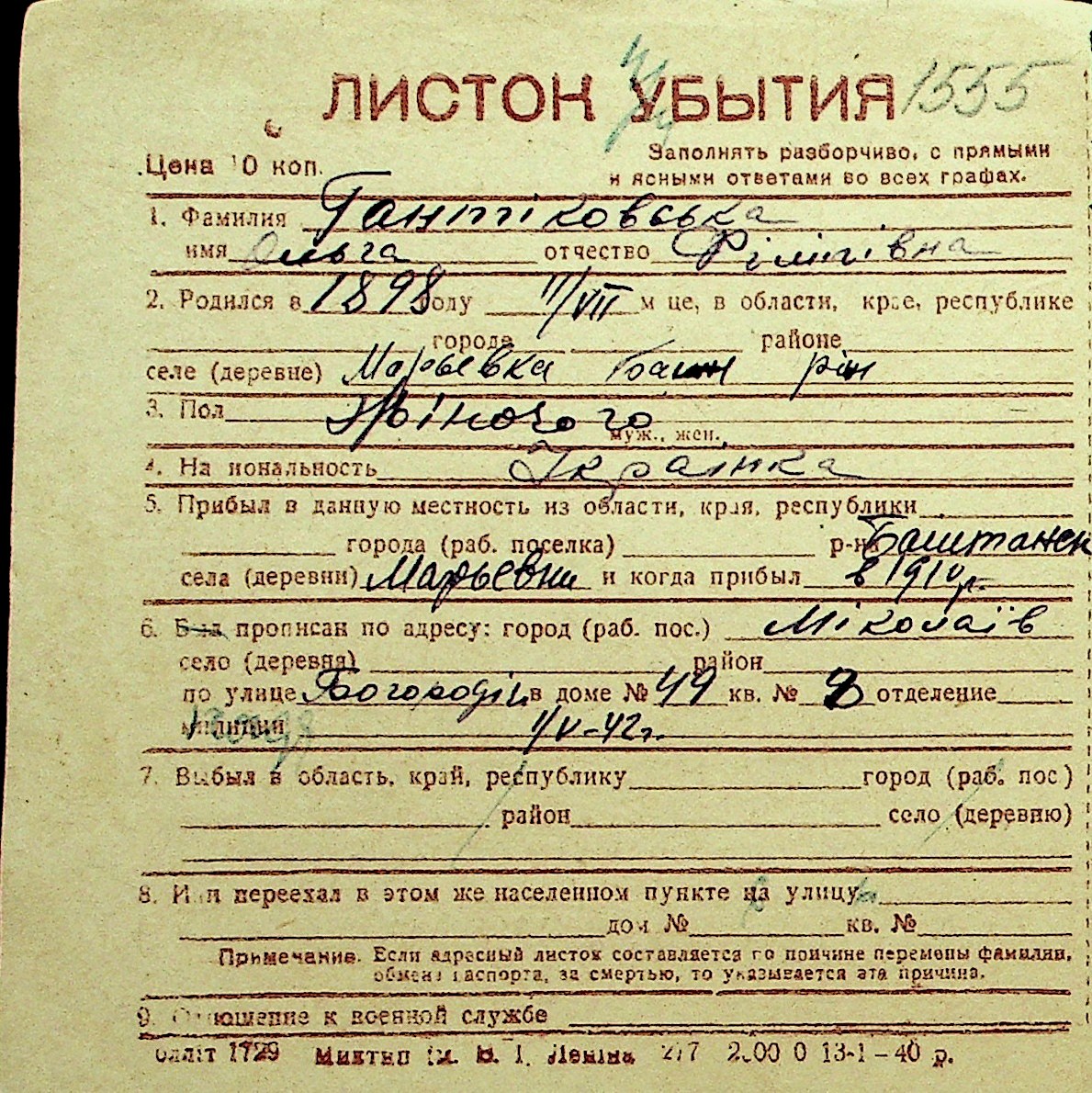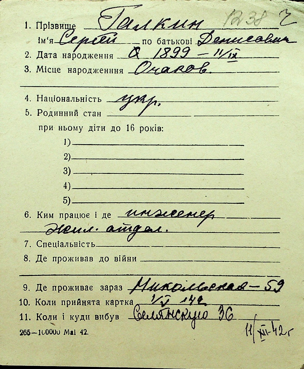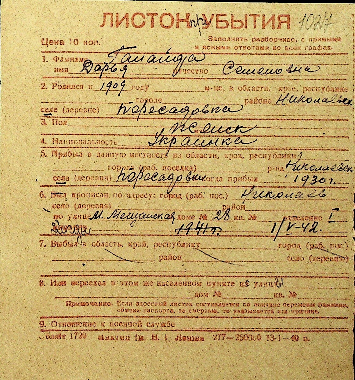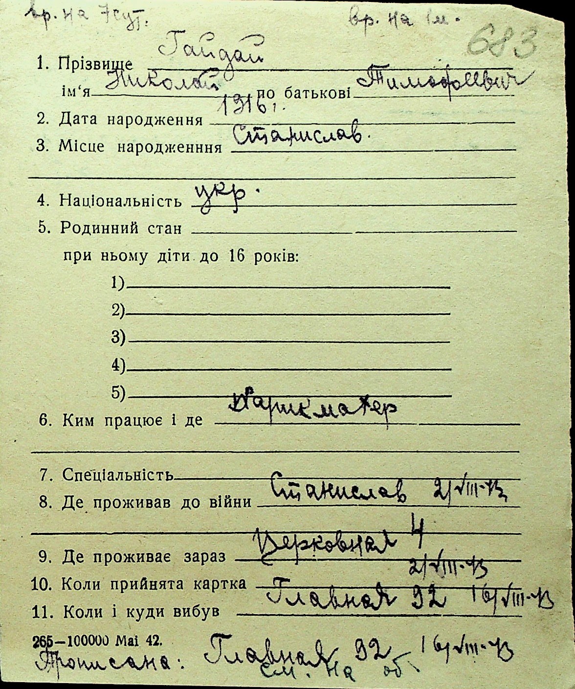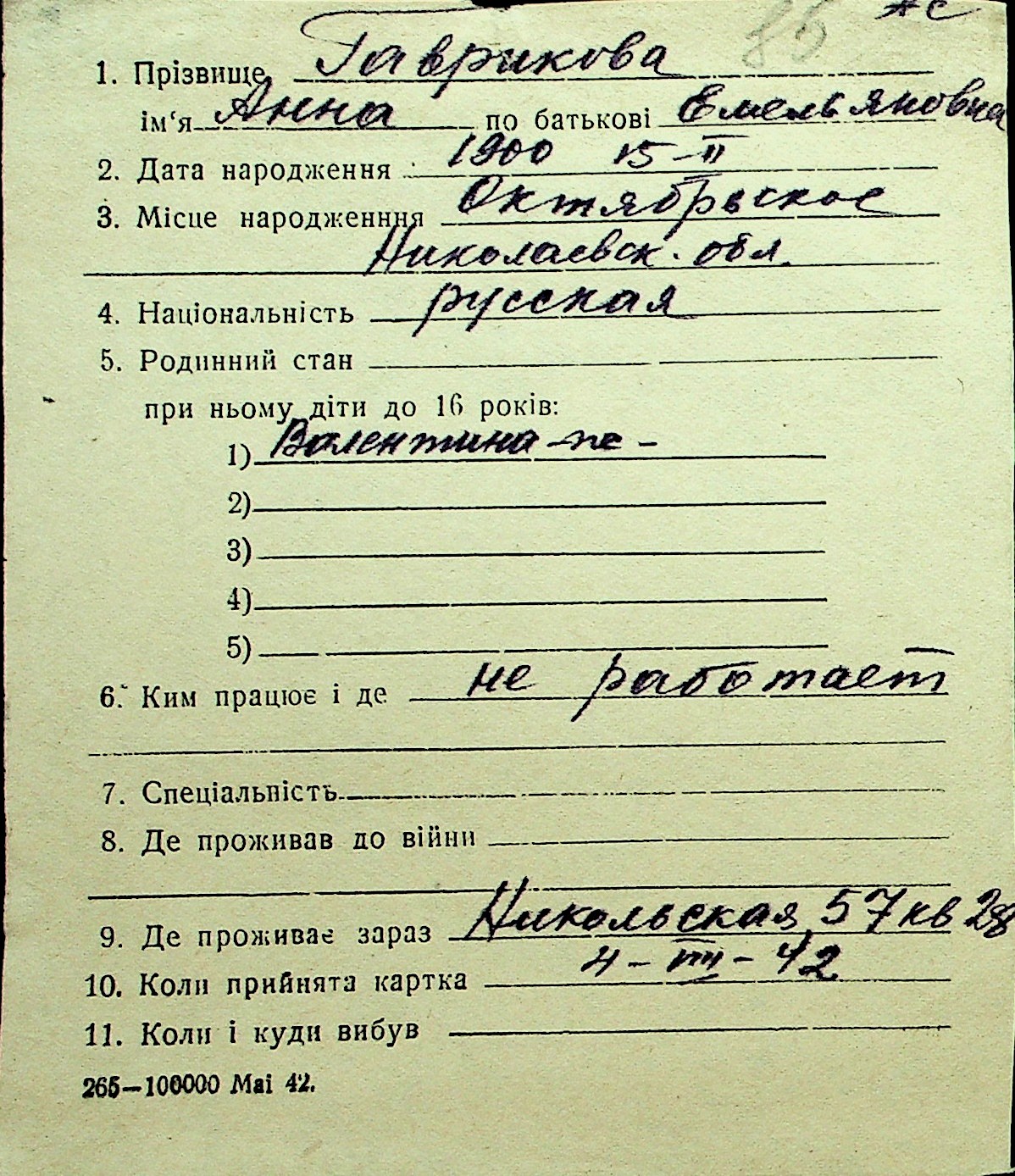• • Перелік карток до фонду № Н-1016