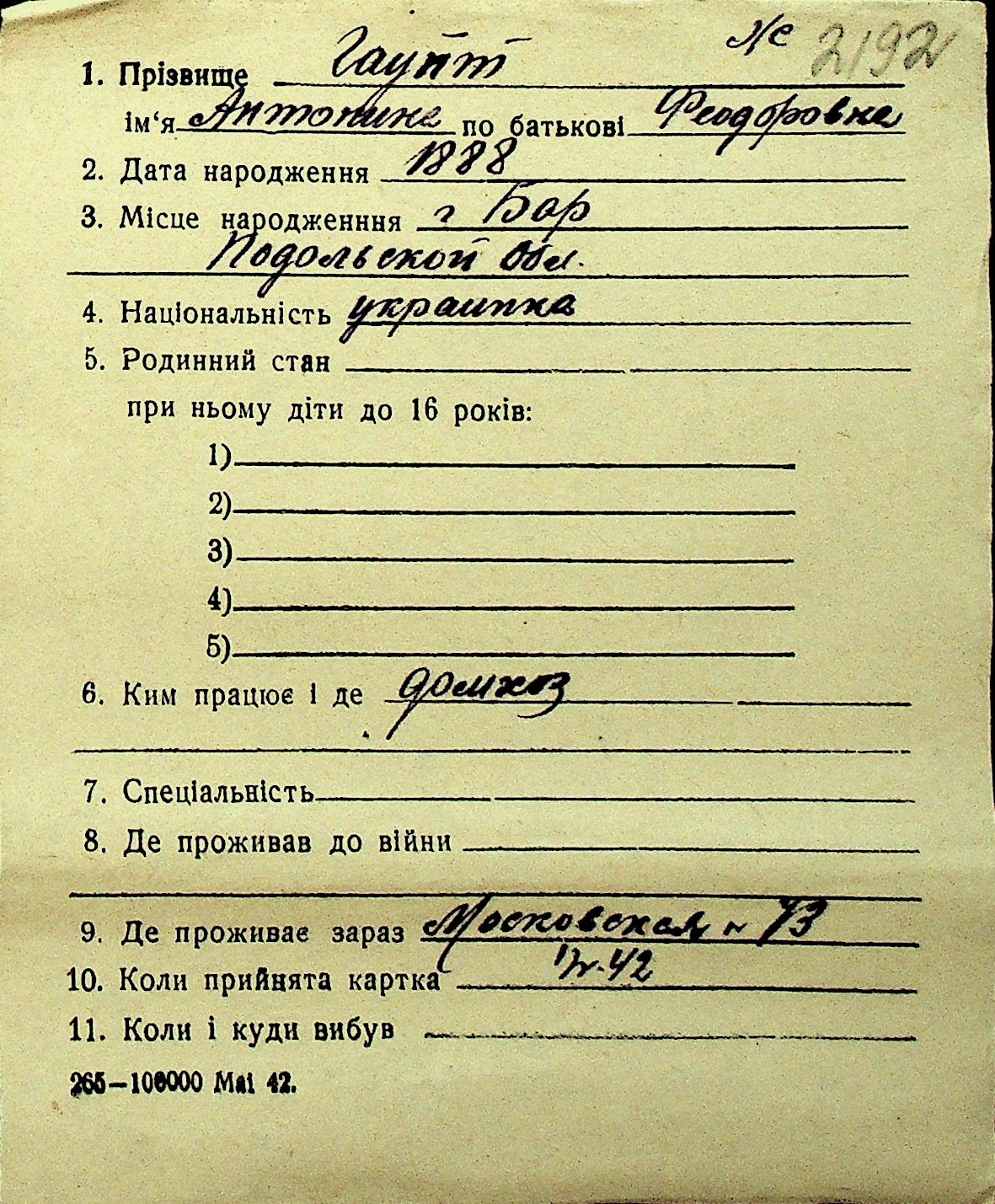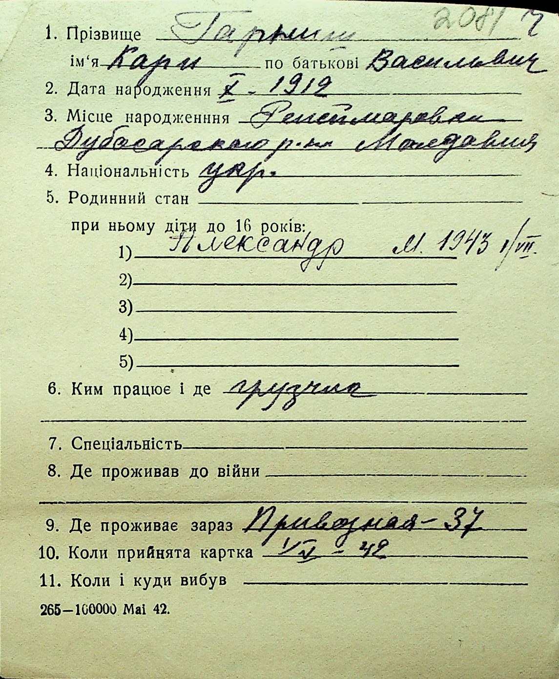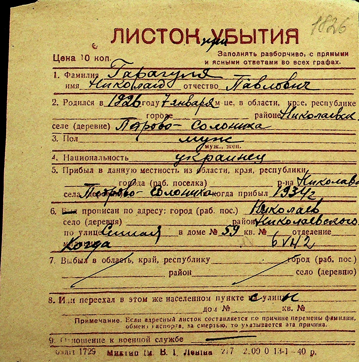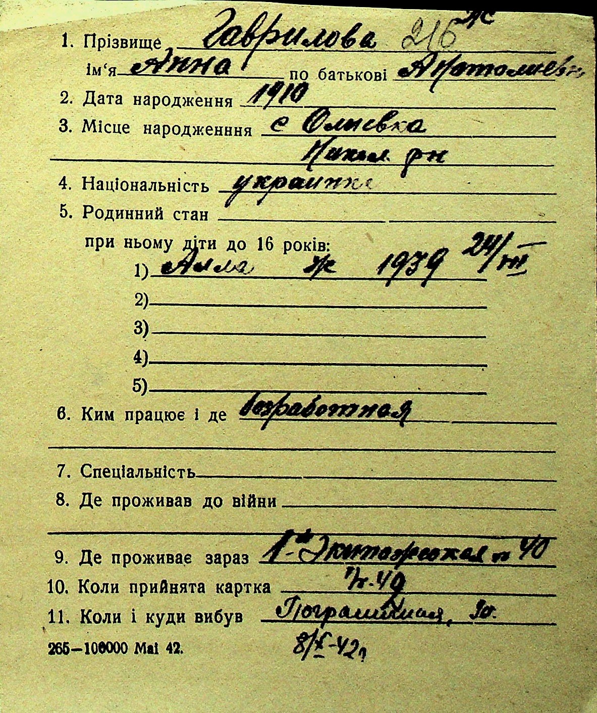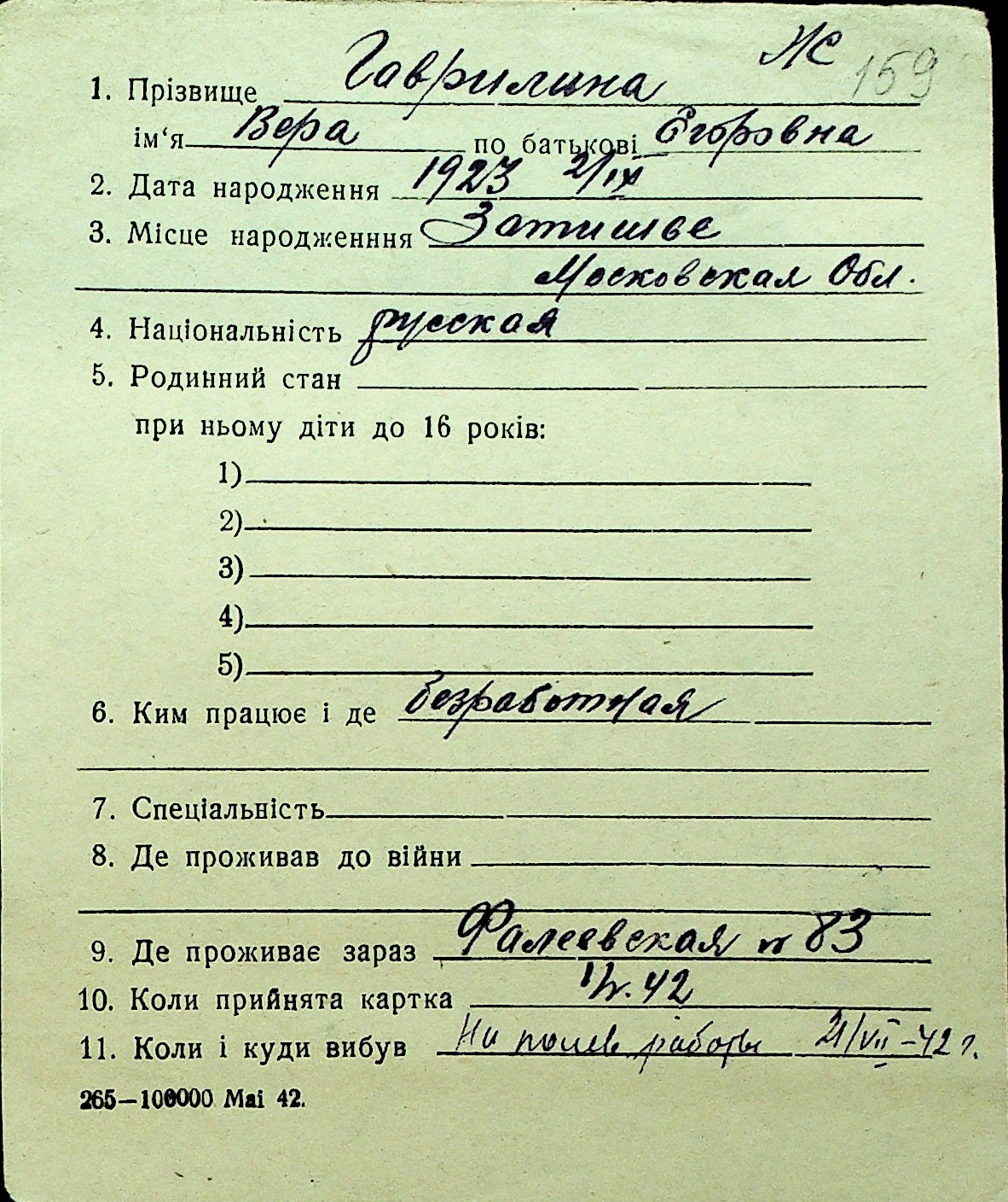 • • Перелік карток до фонду № Н-1016