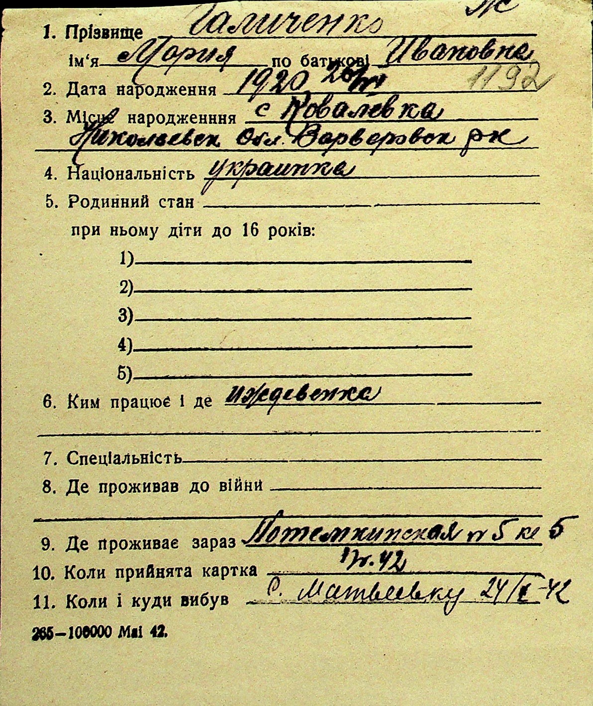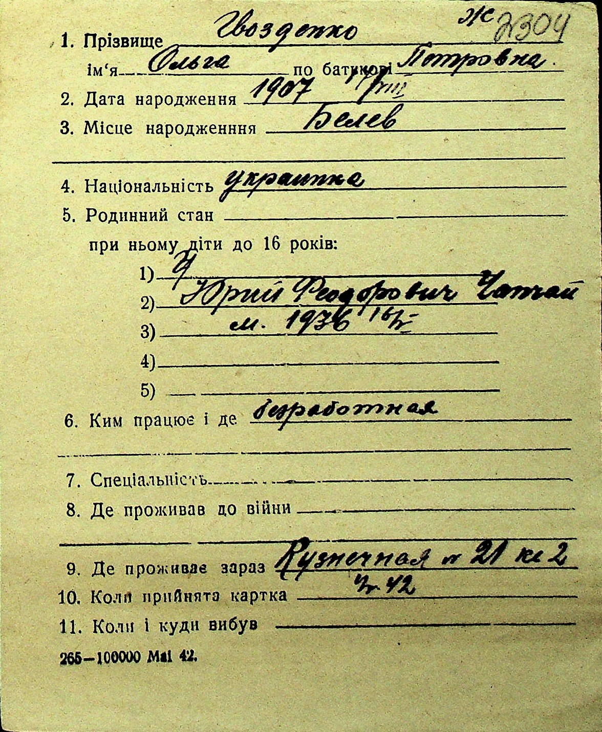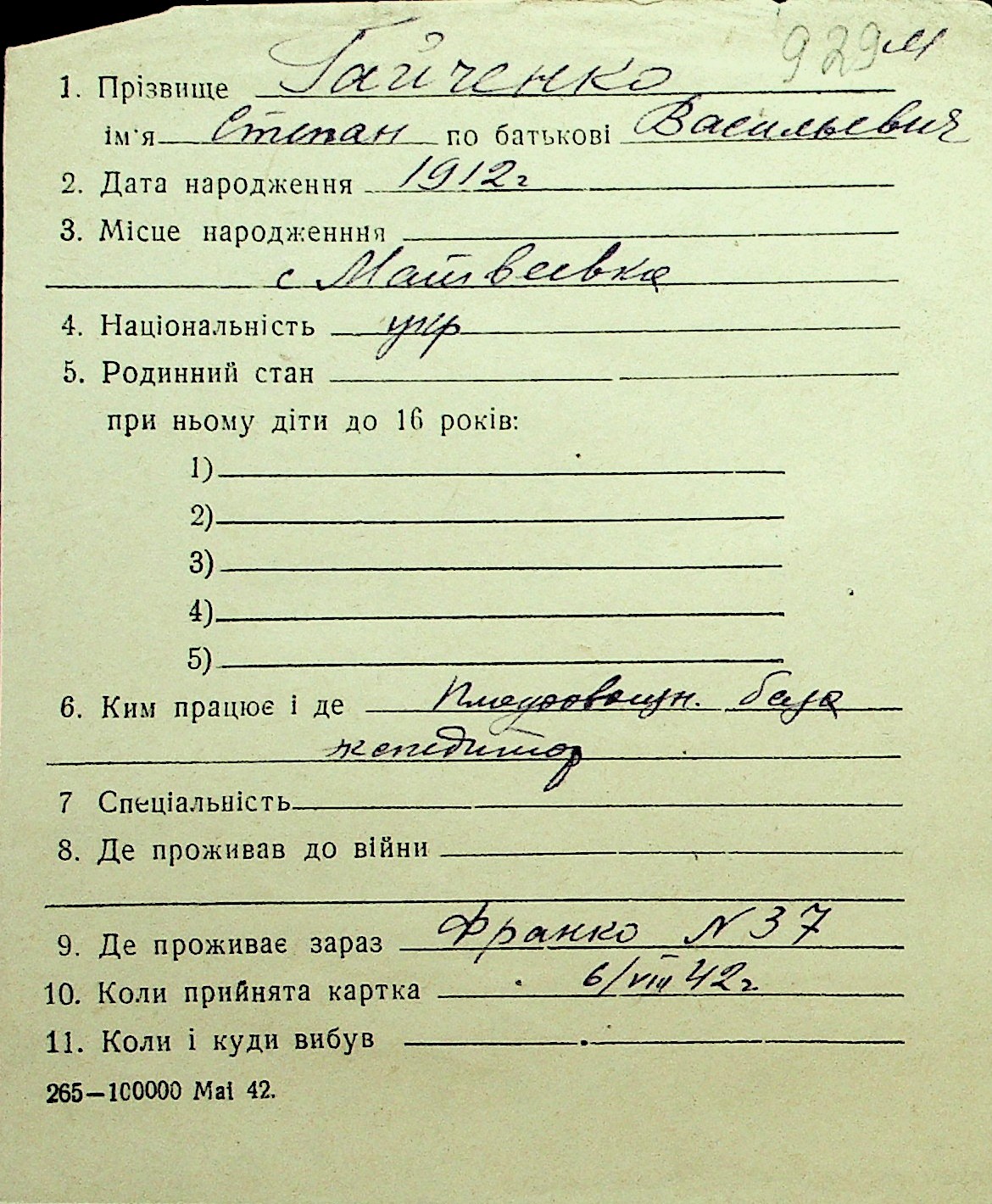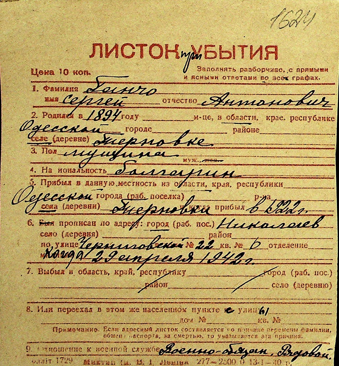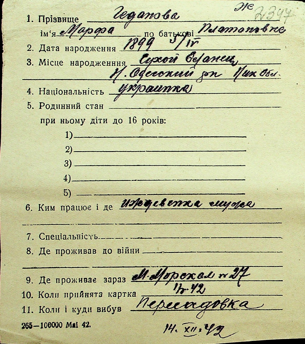 • • Перелік карток до фонду № Н-1016