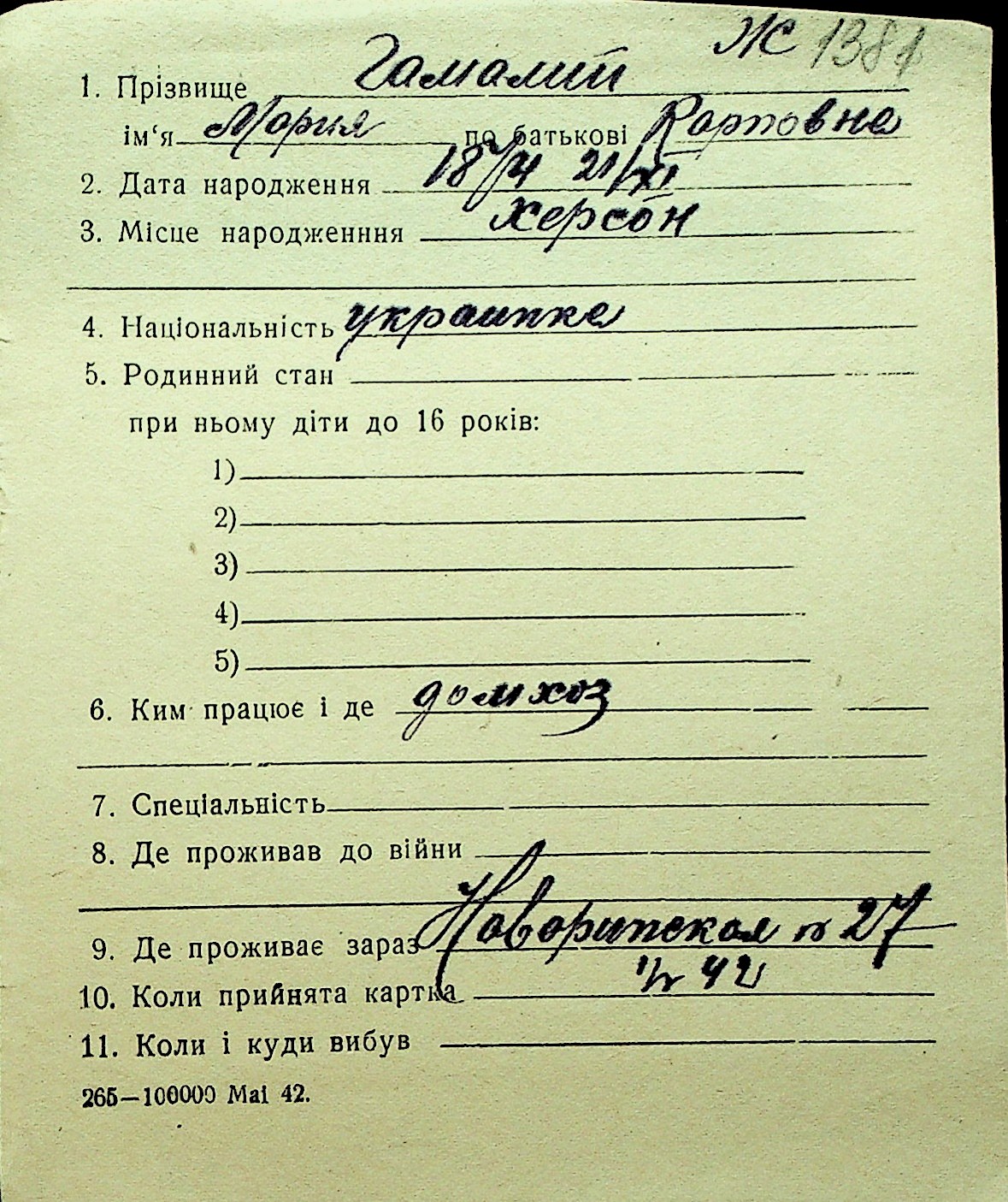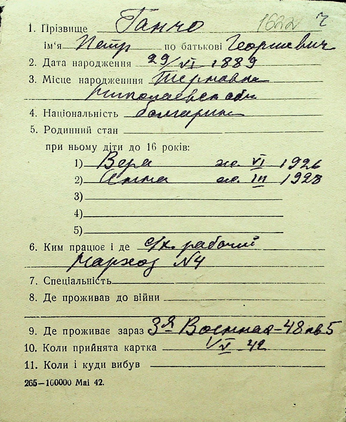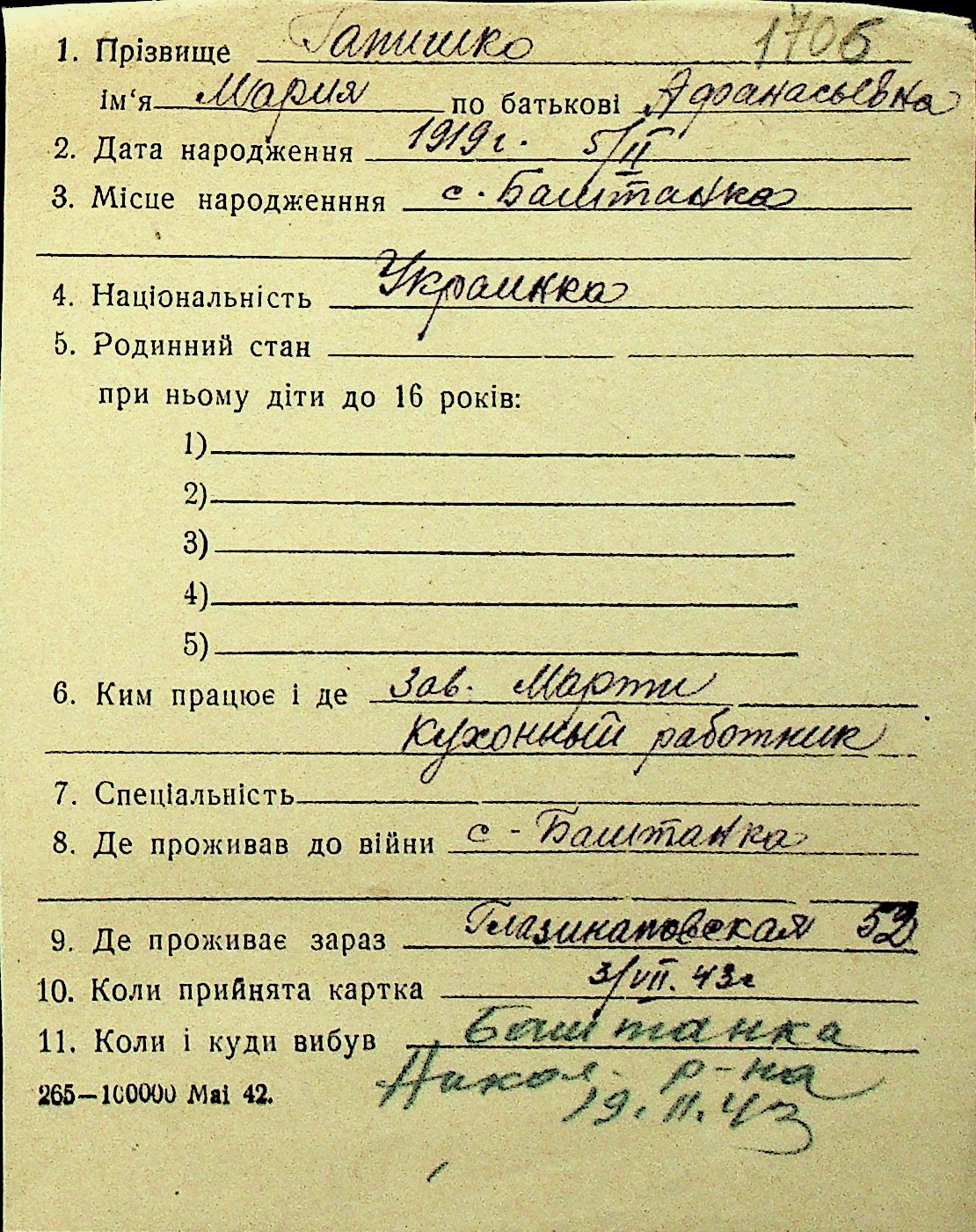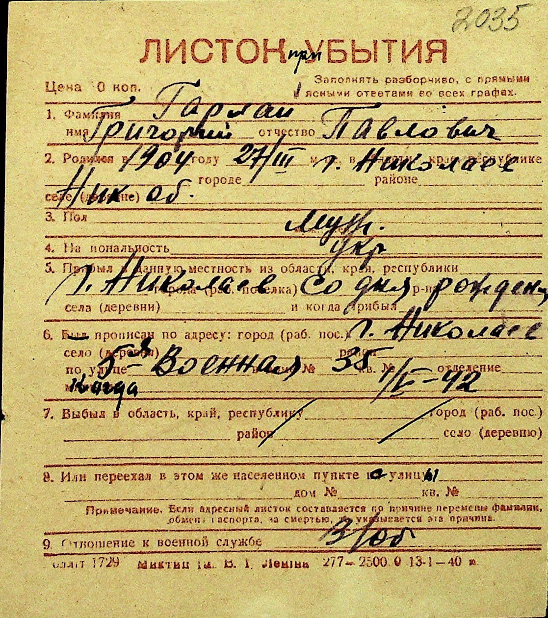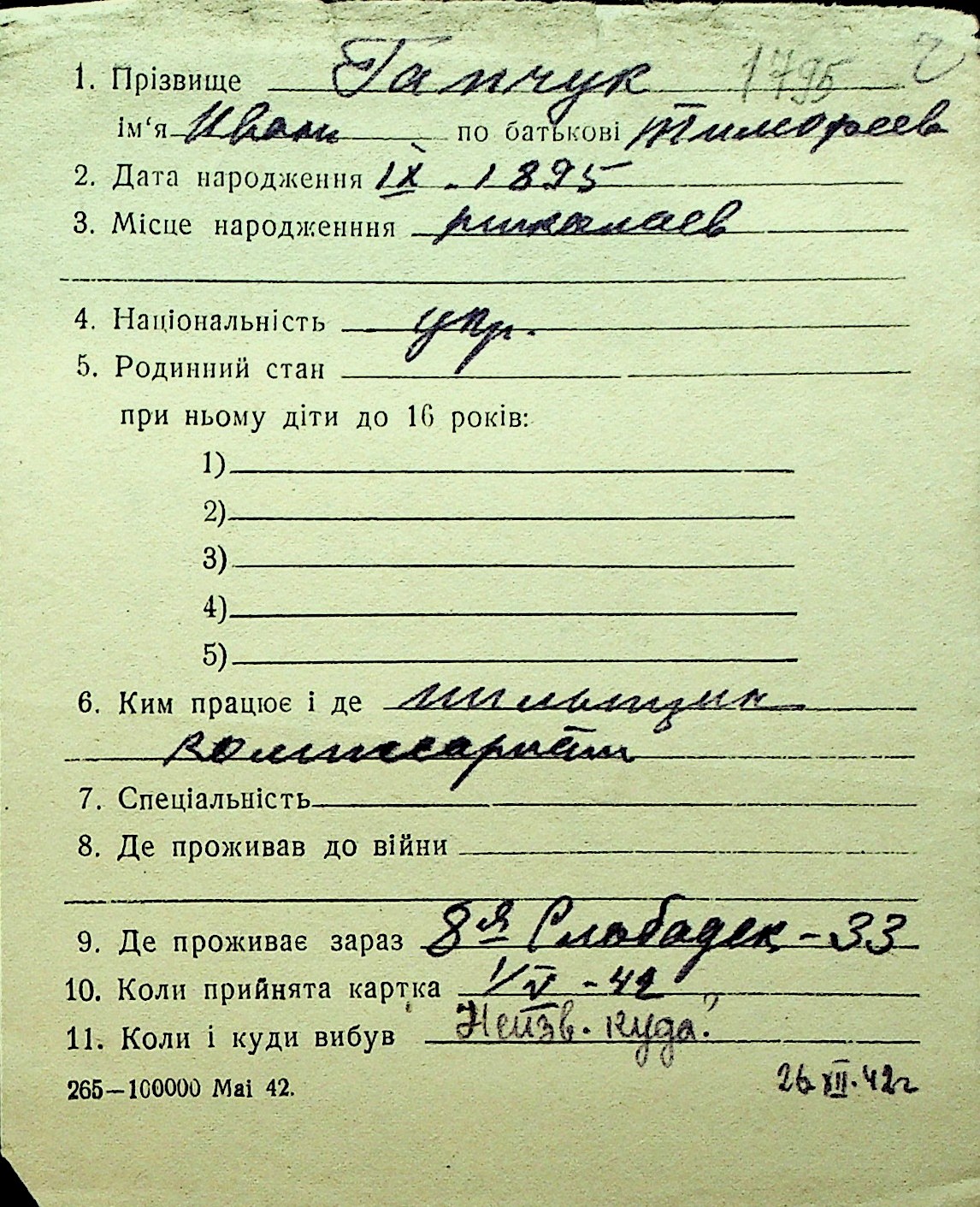 • • Перелік карток до фонду № Н-1016