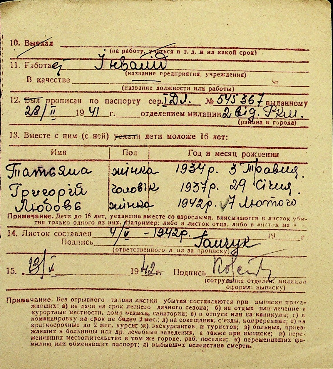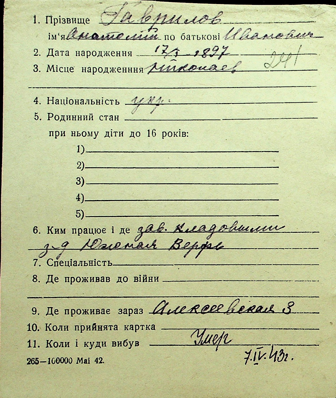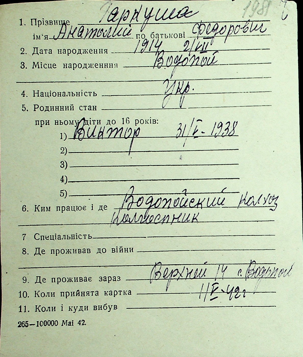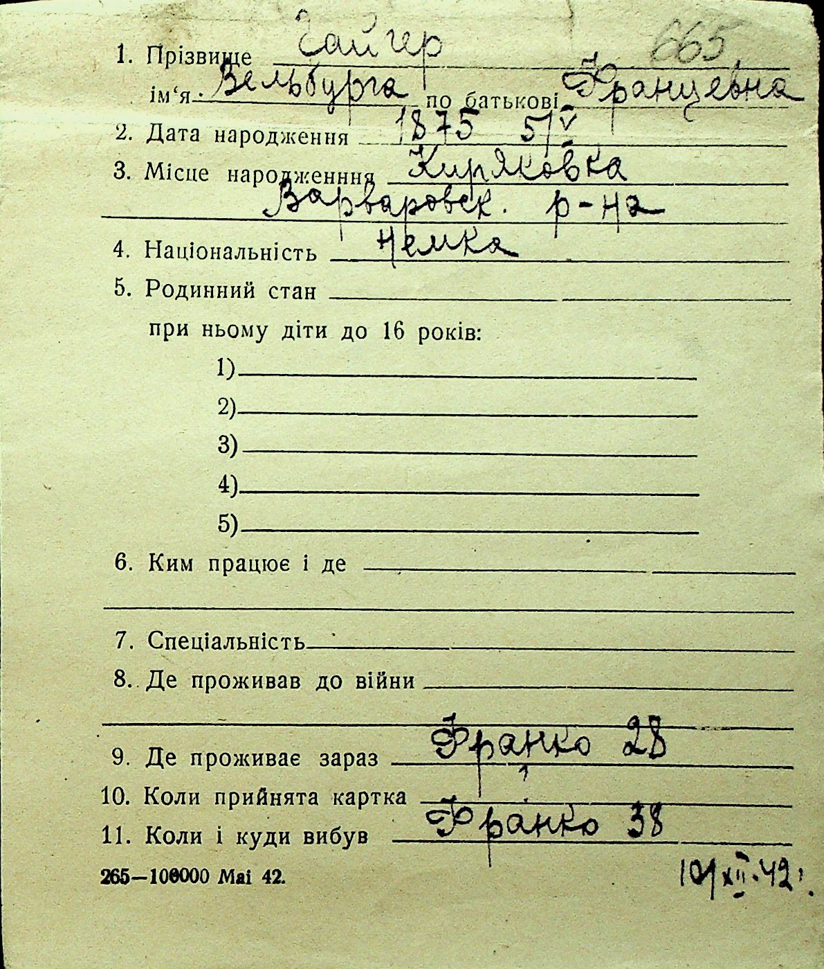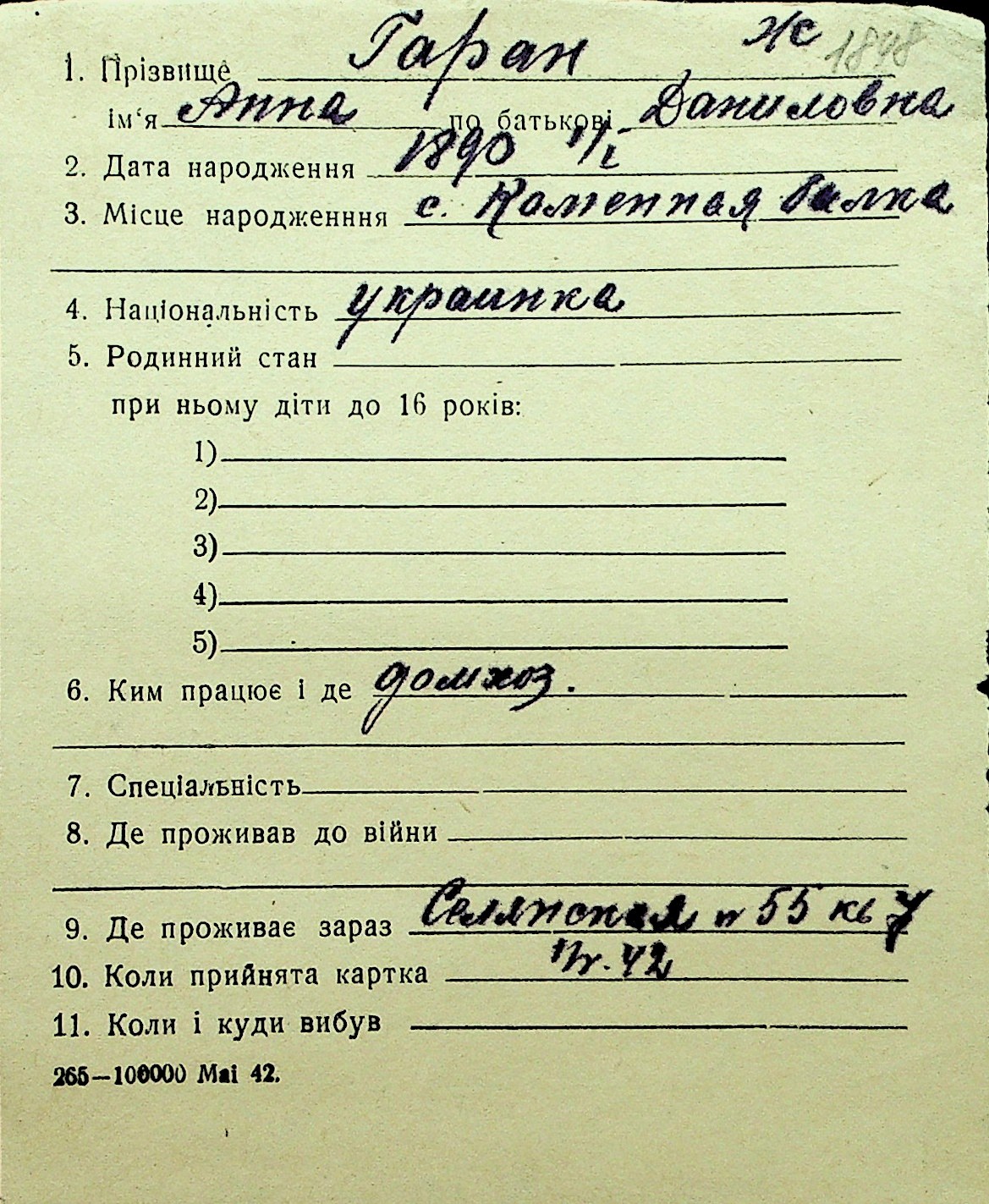 • • Перелік карток до фонду № Н-1016