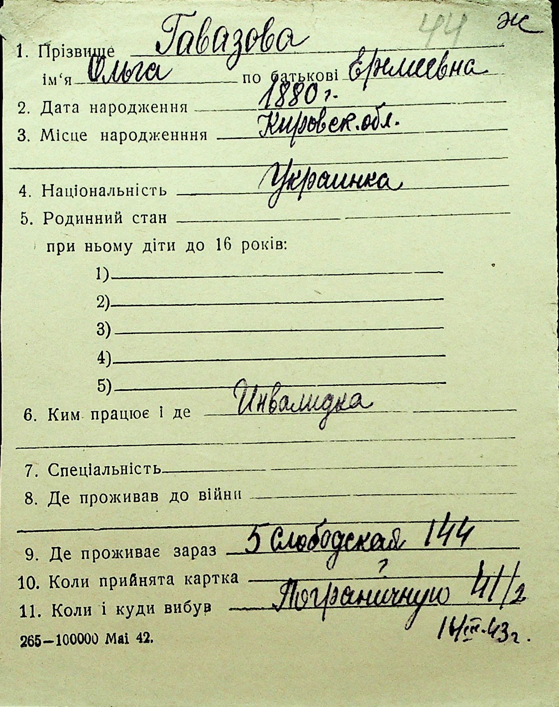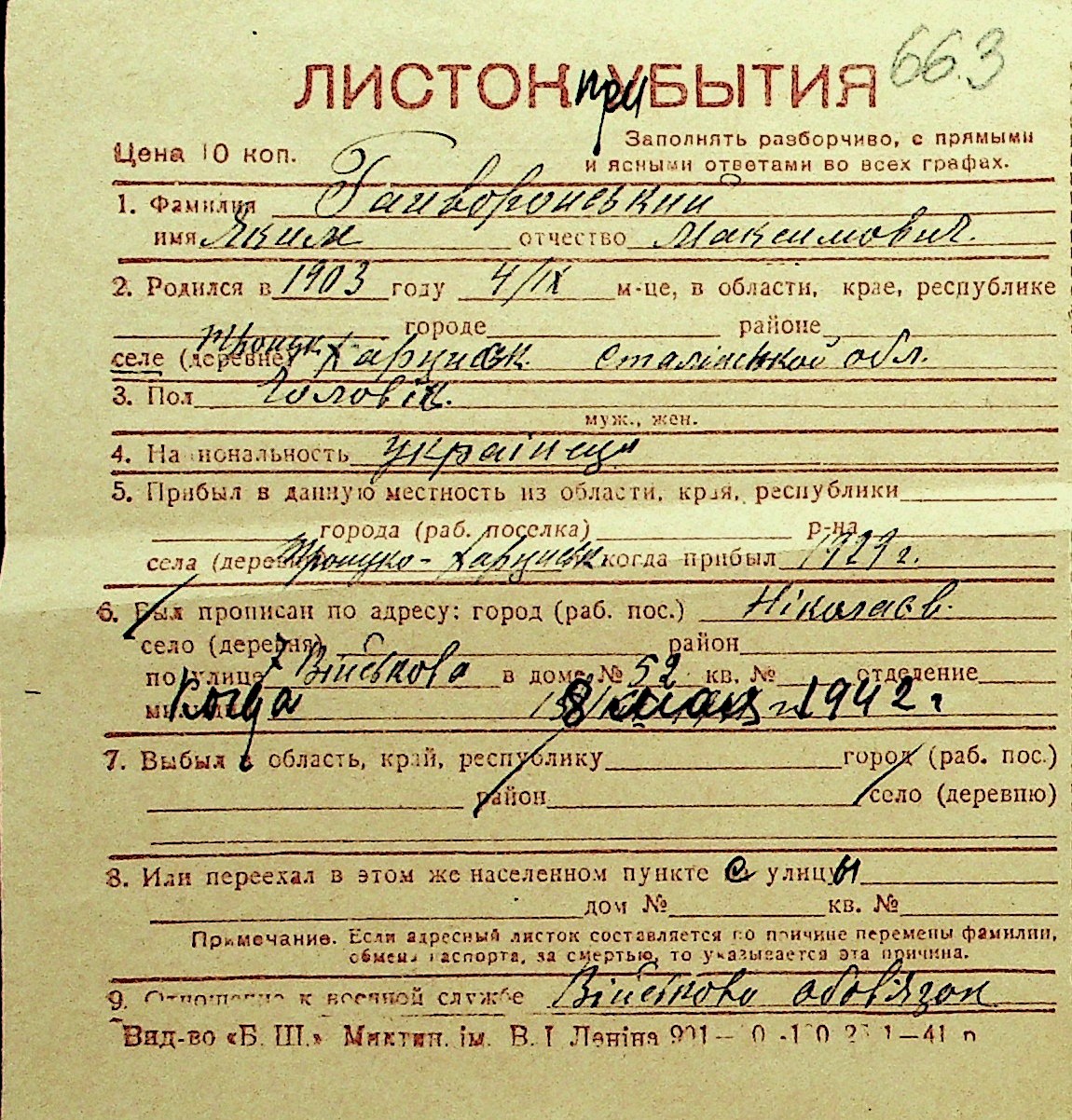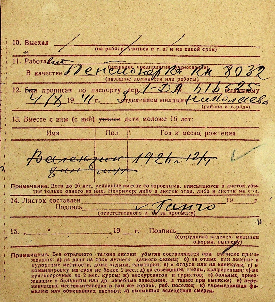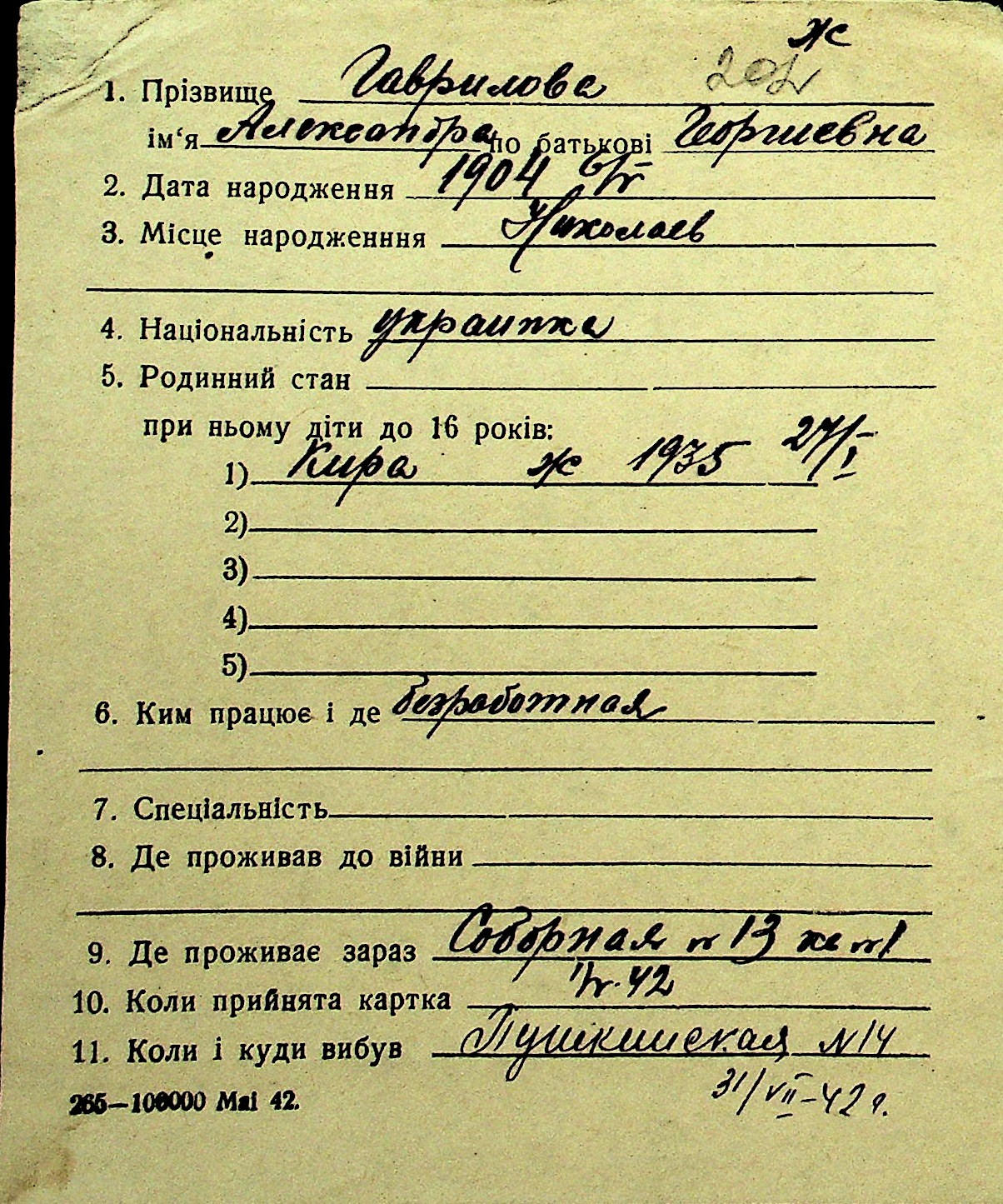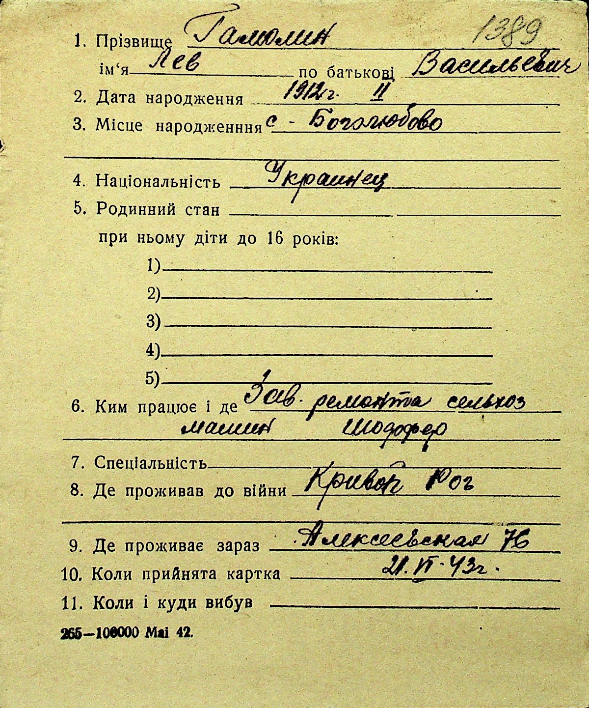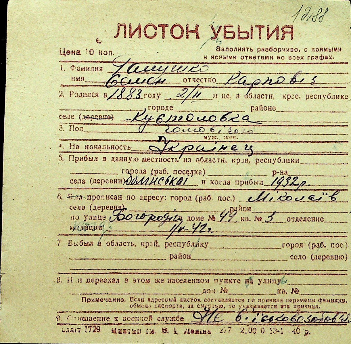 • • Перелік карток до фонду № Н-1016