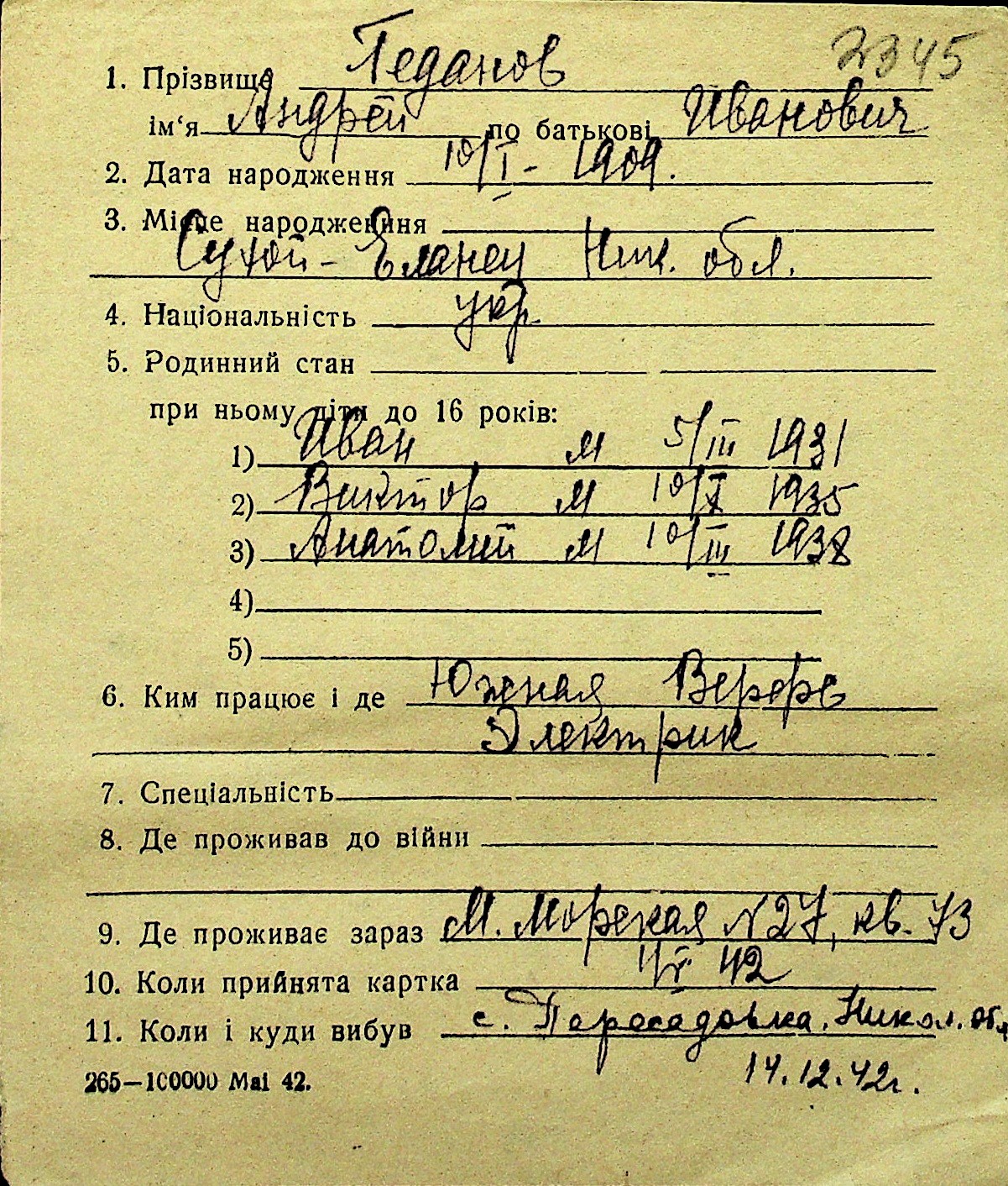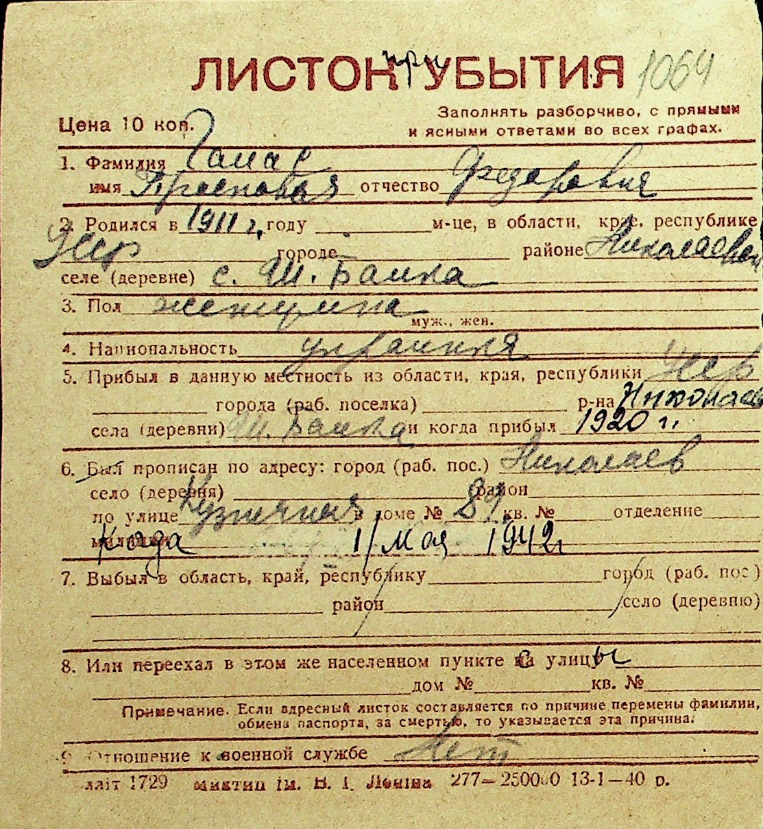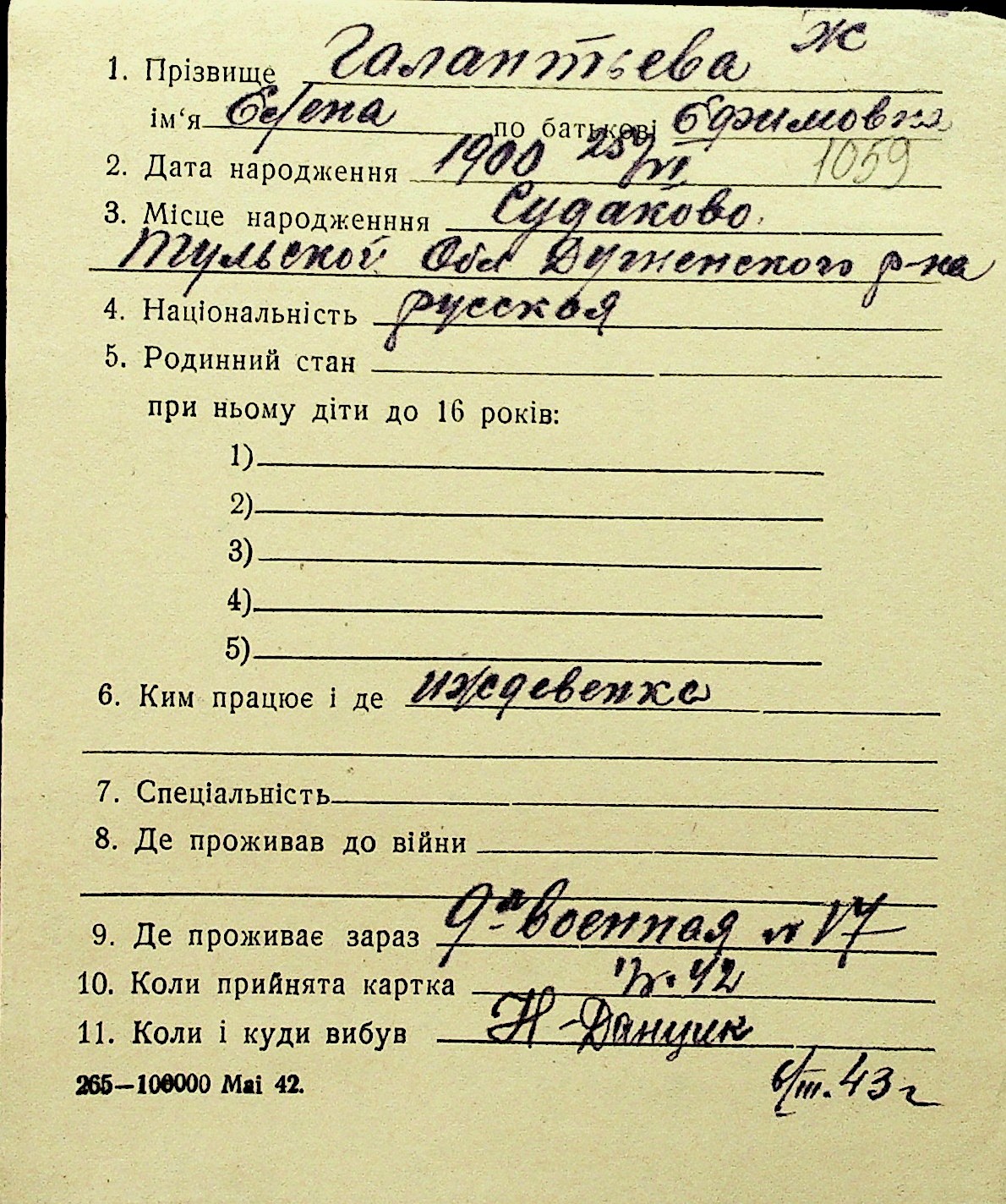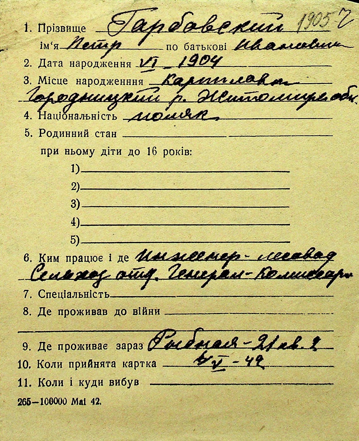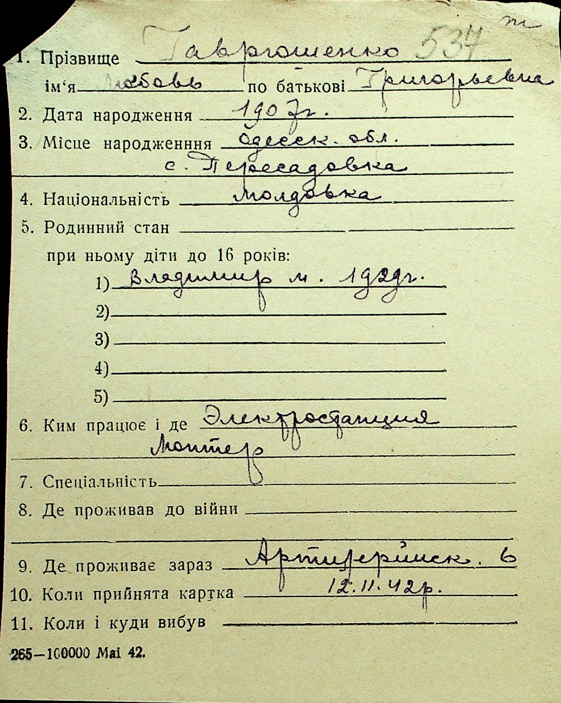 • • Перелік карток до фонду № Н-1016