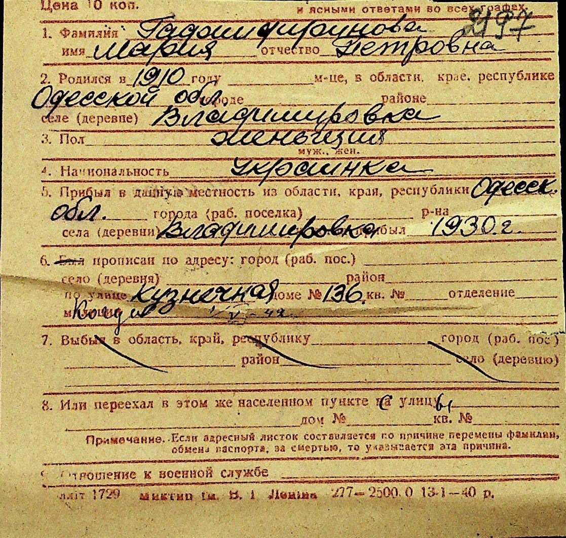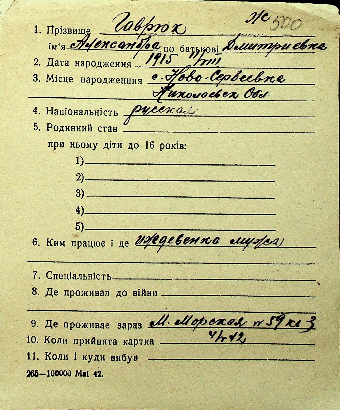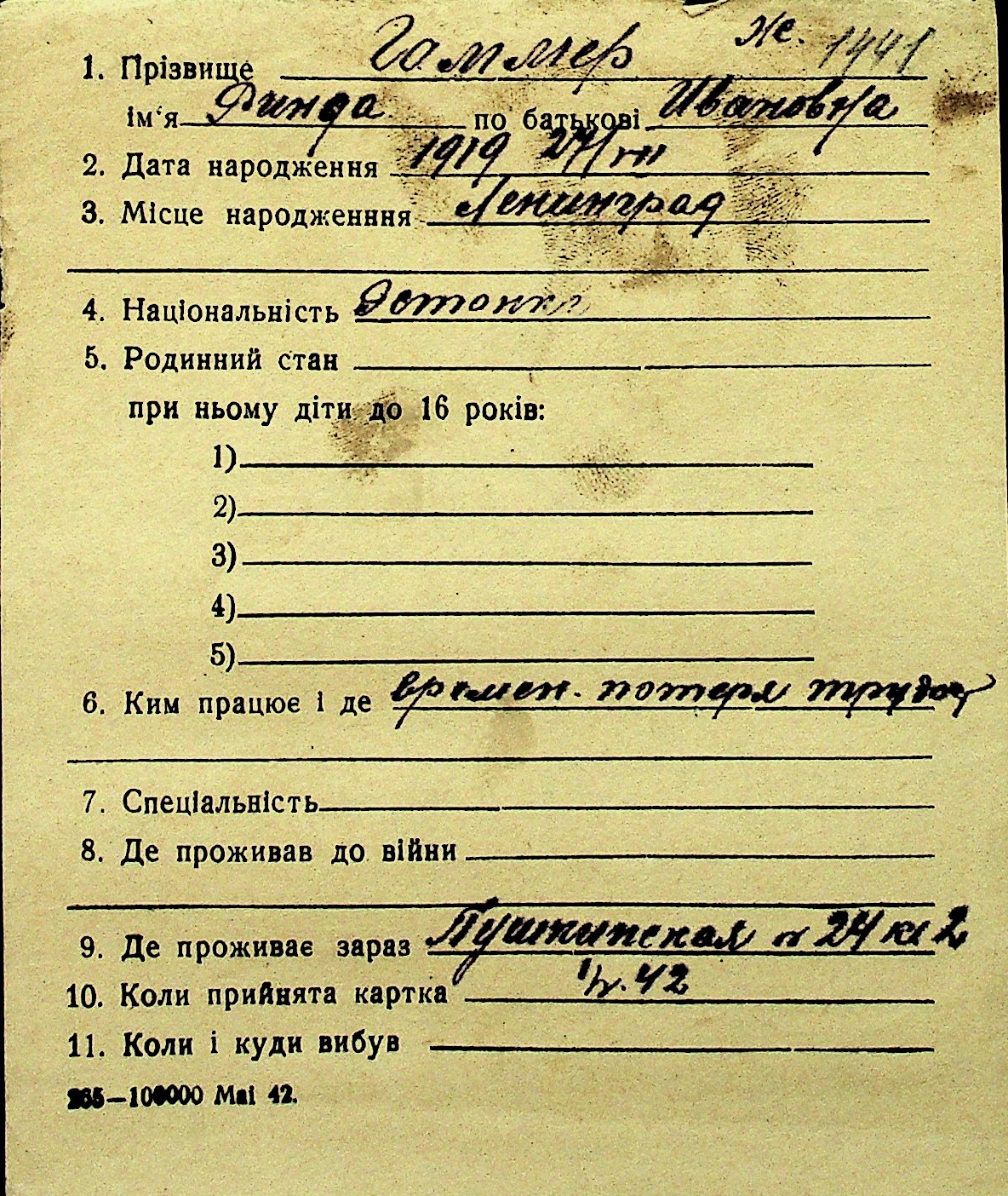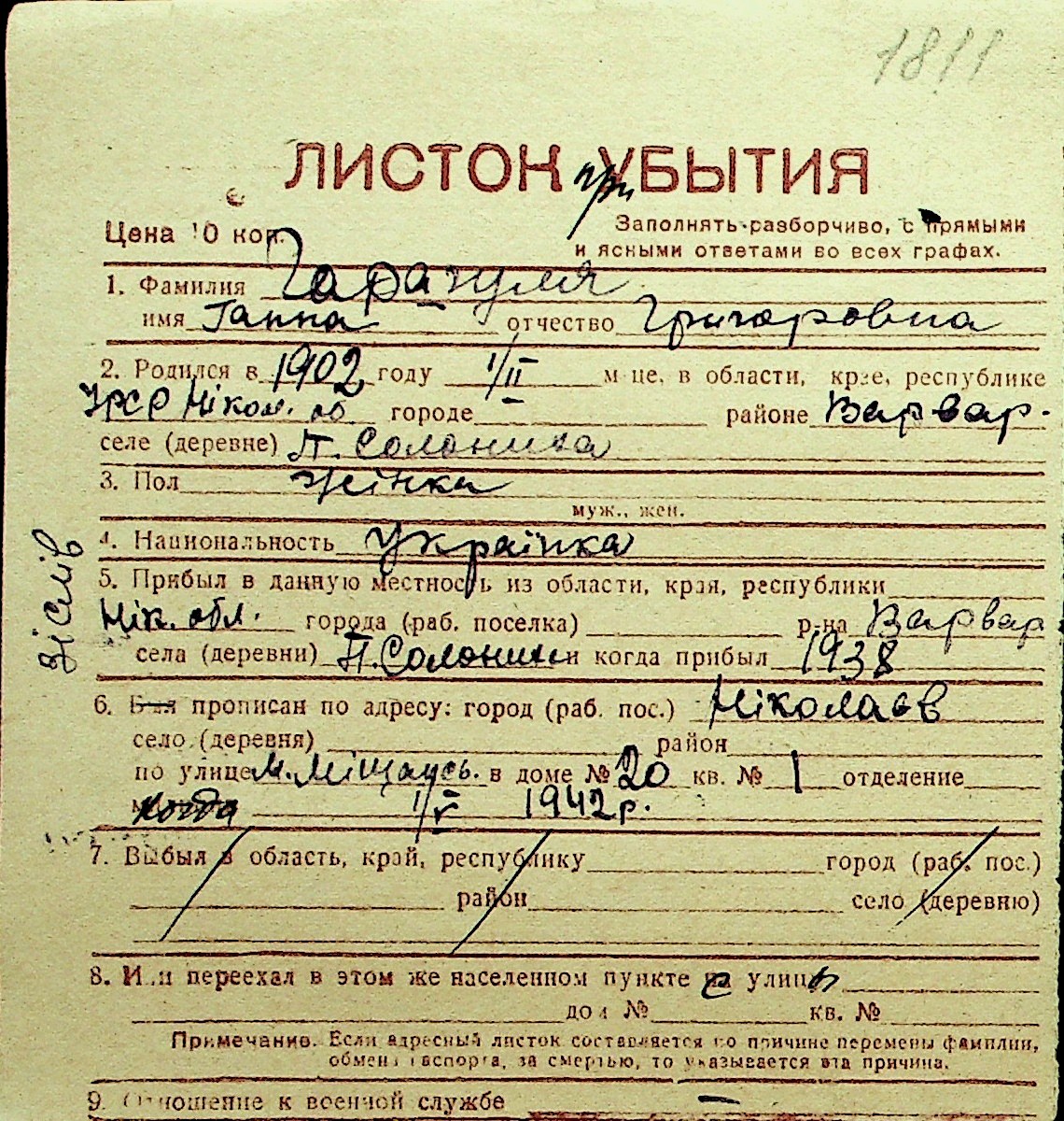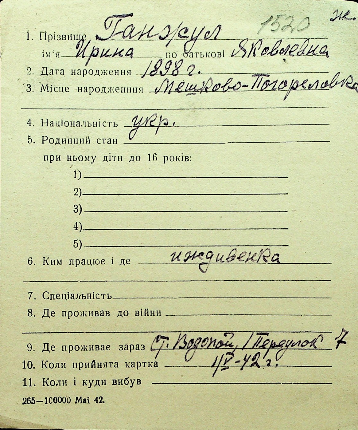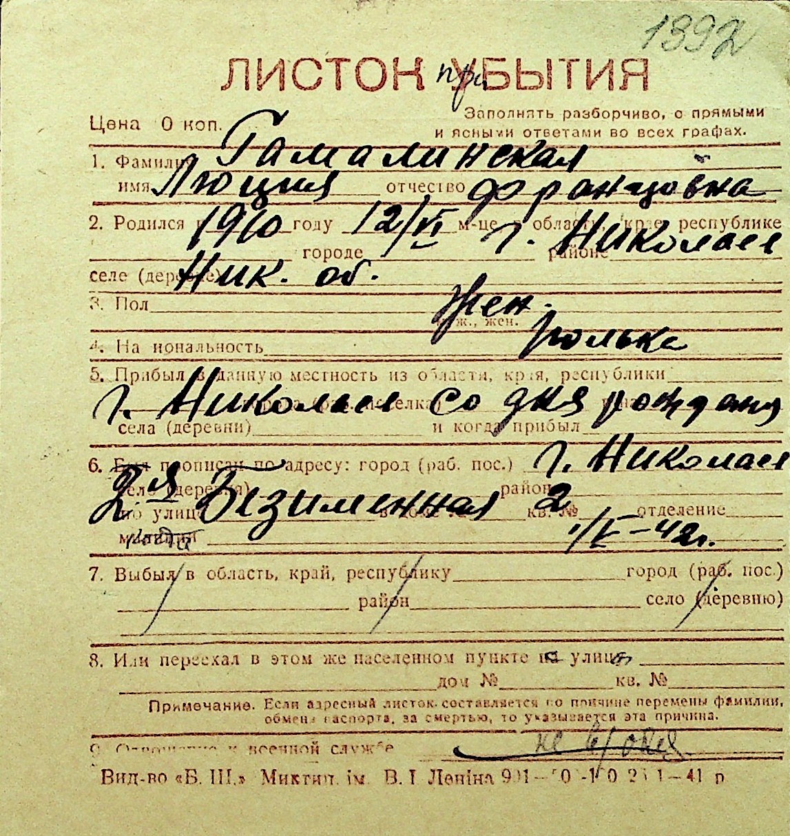 • • Перелік карток до фонду № Н-1016