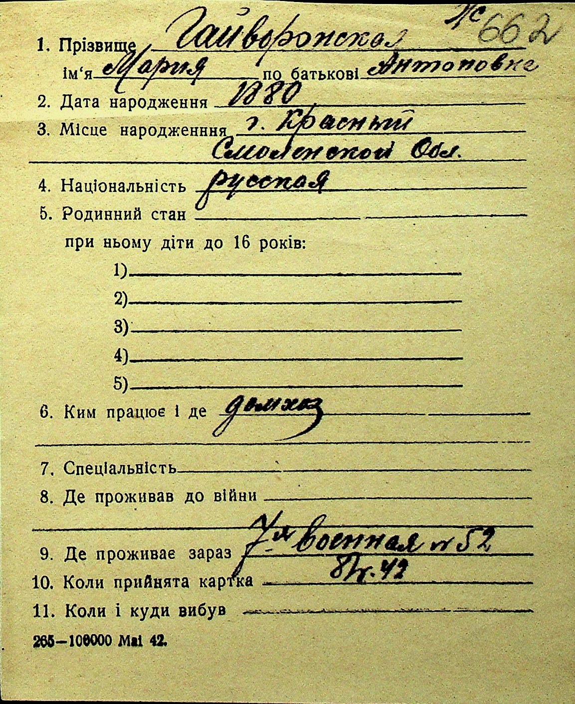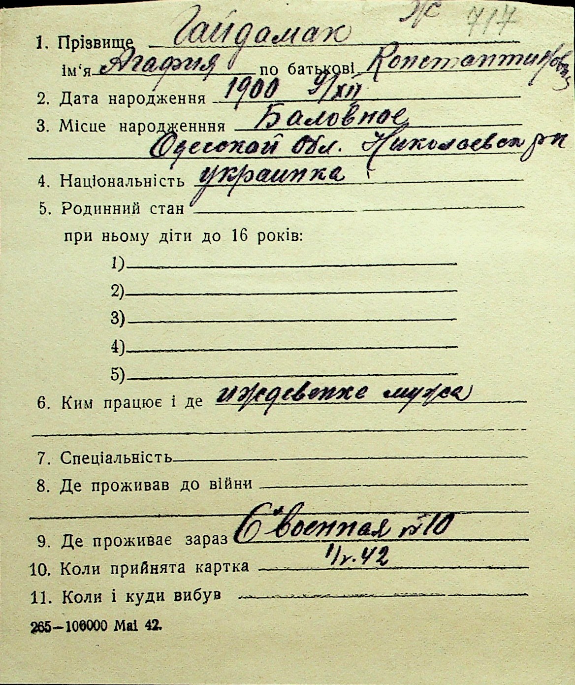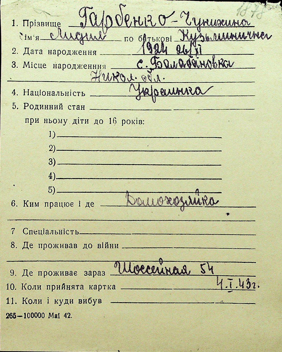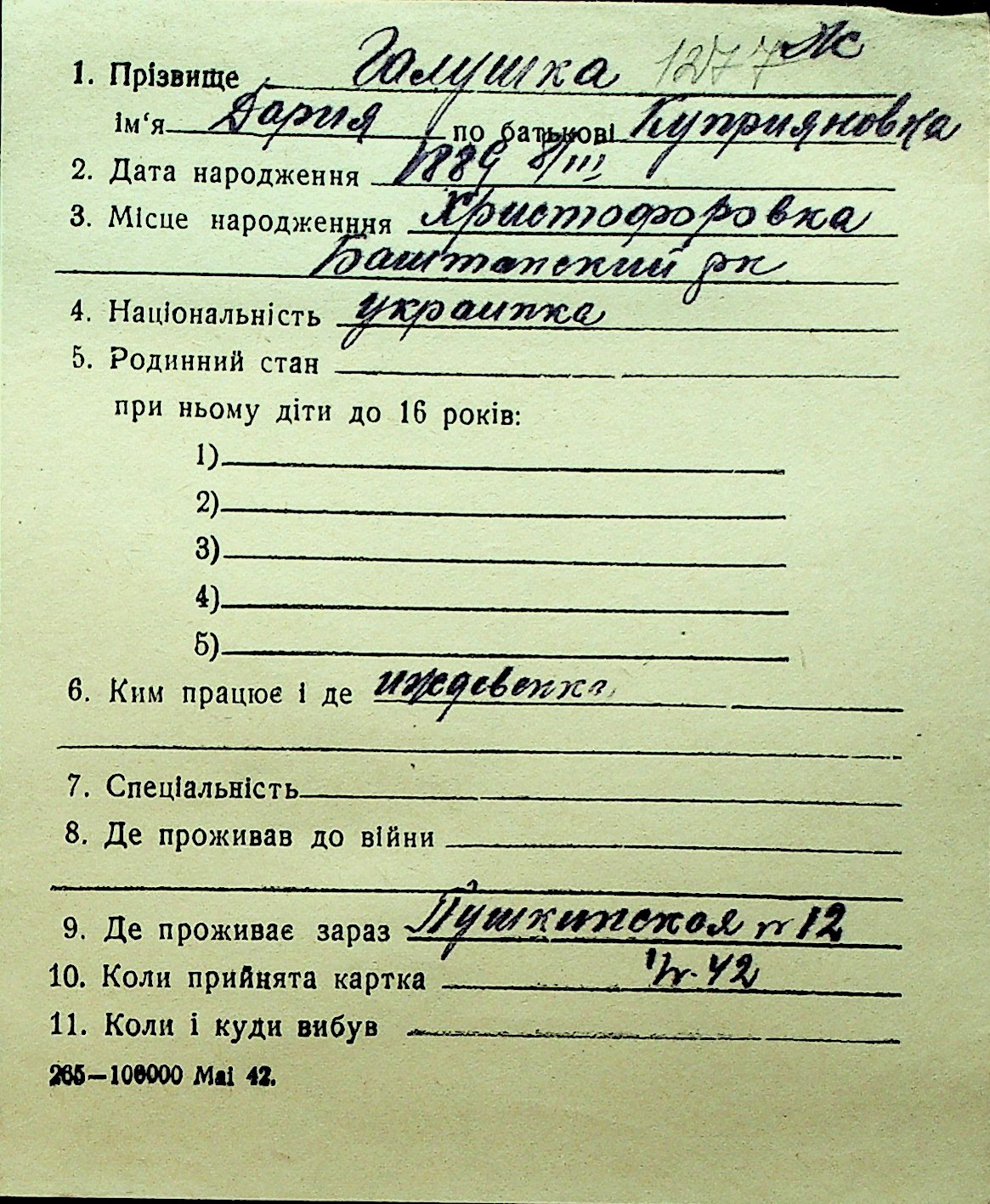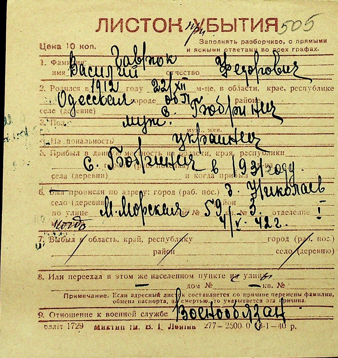 • • Перелік карток до фонду № Н-1016