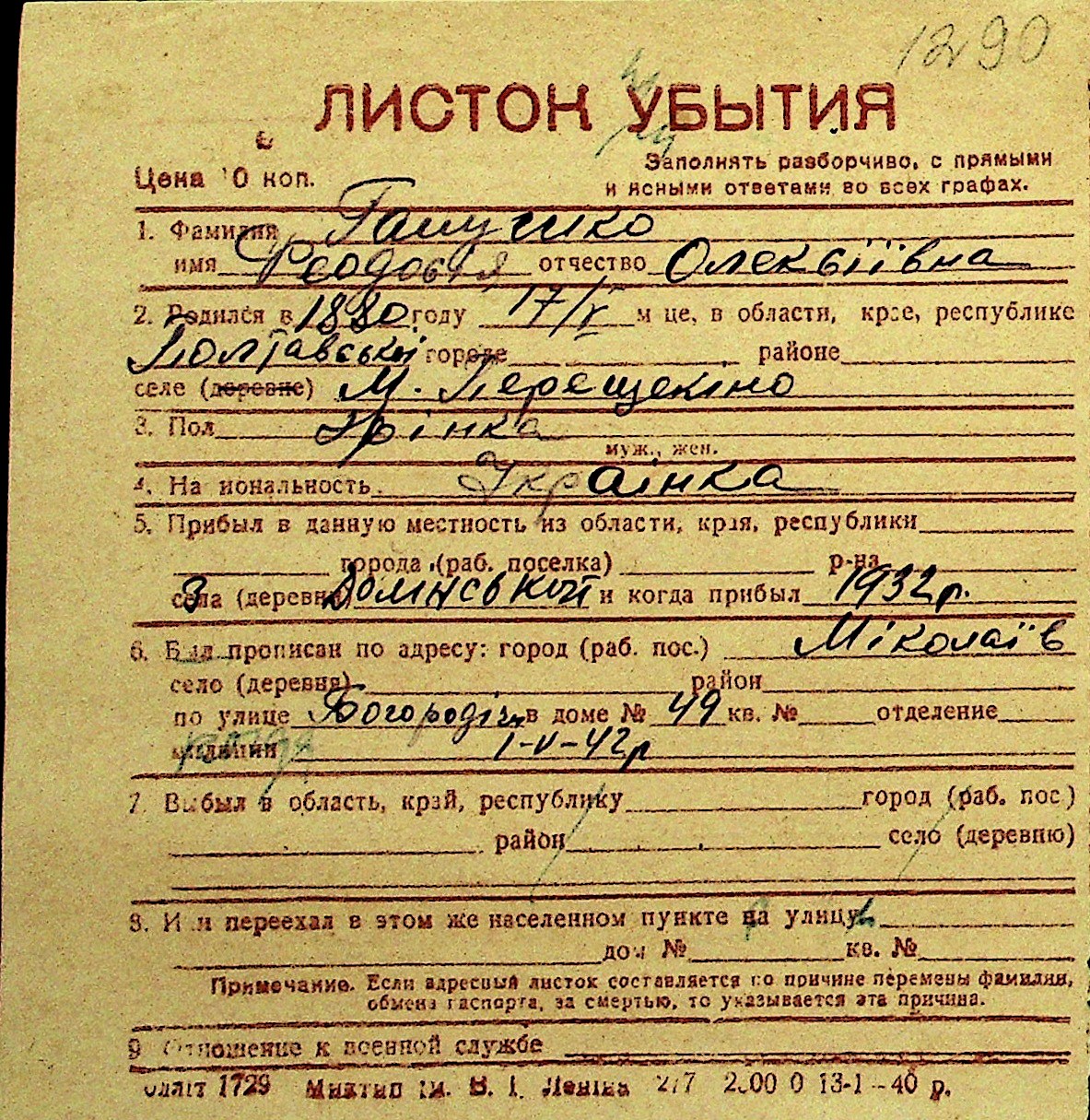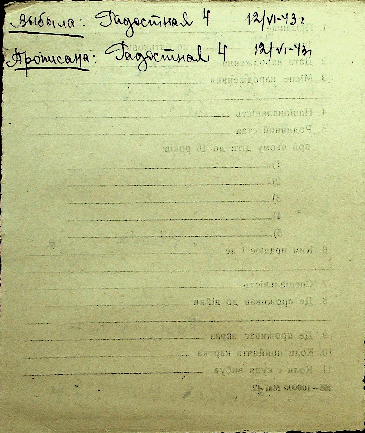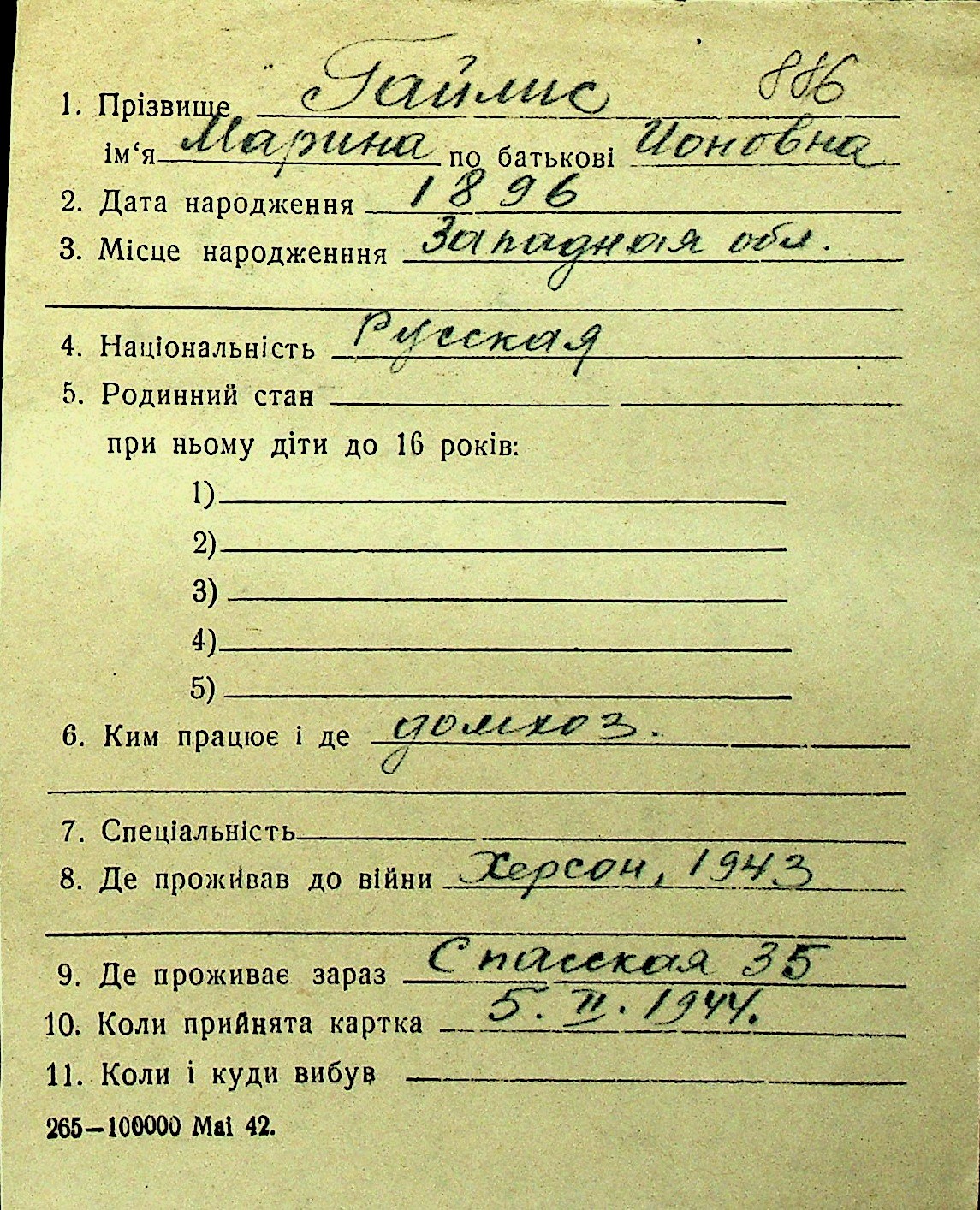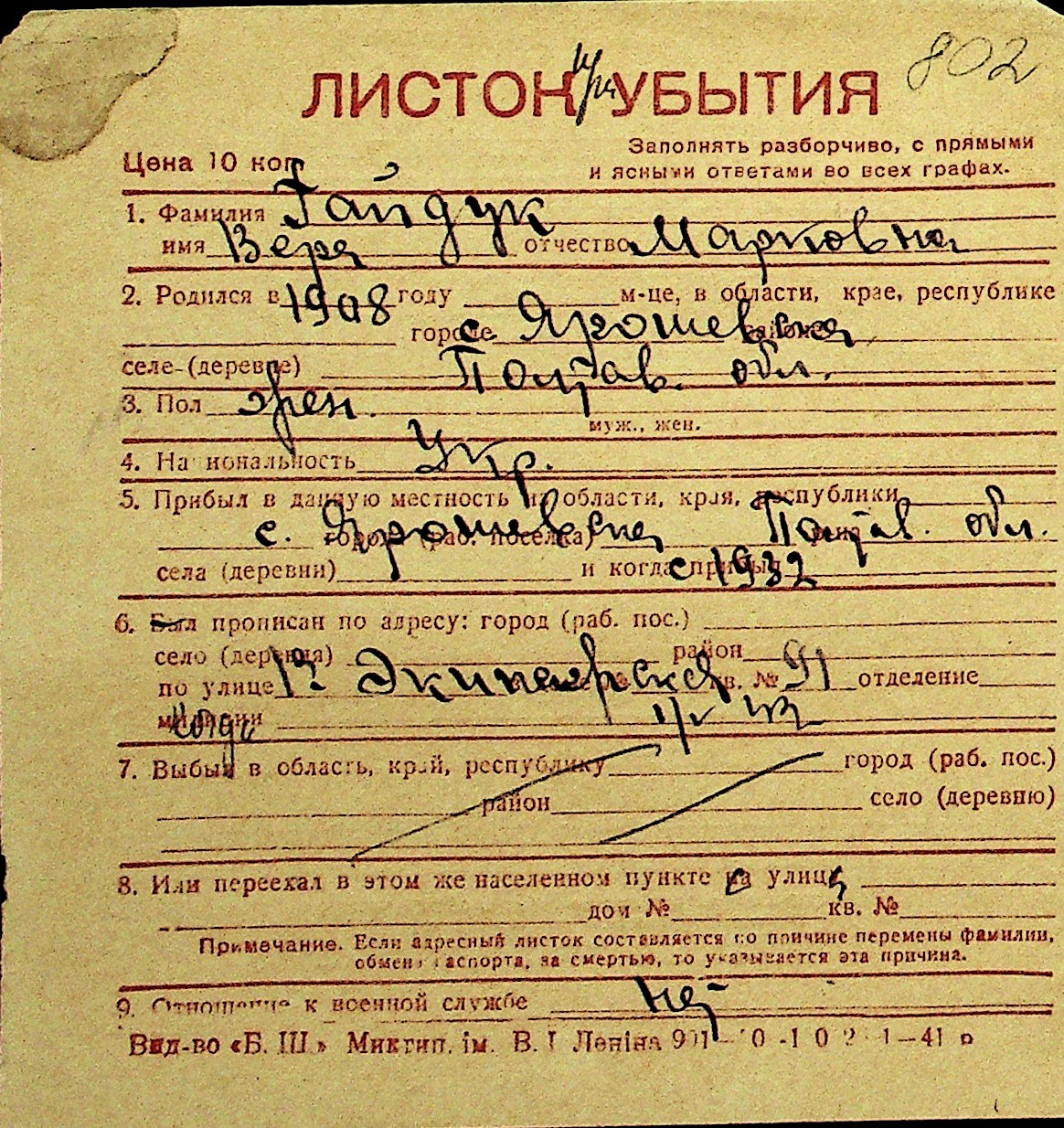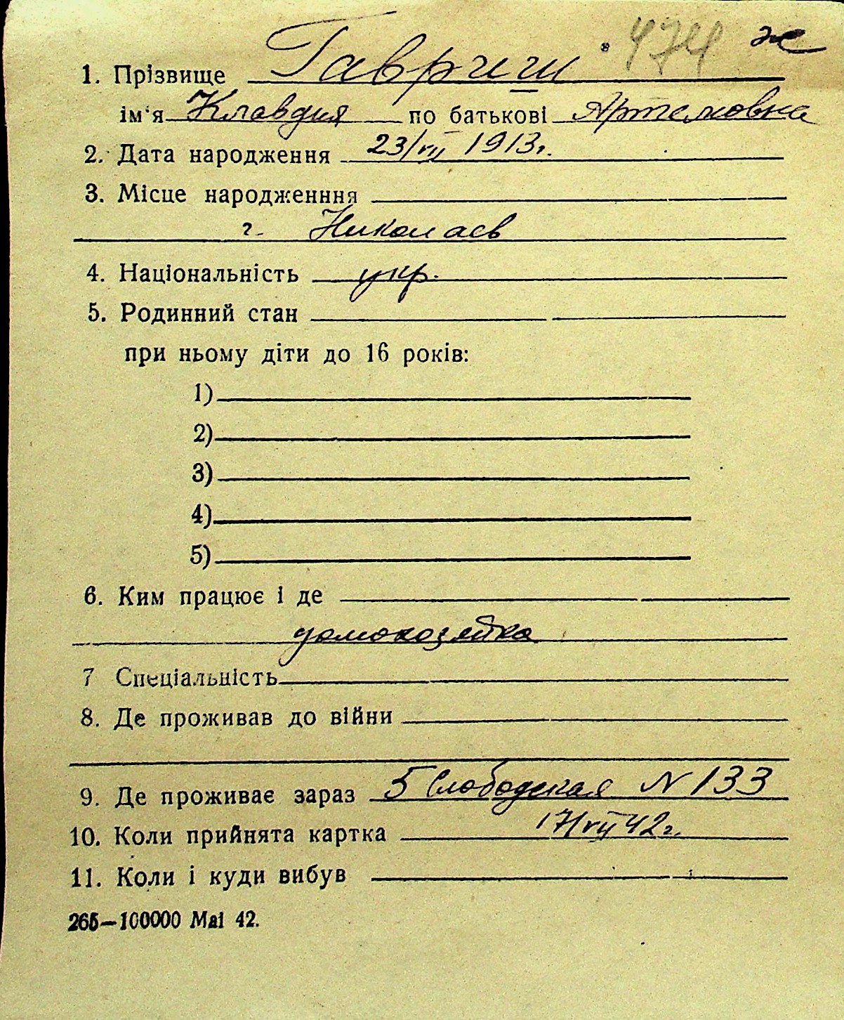 • • Перелік карток до фонду № Н-1016