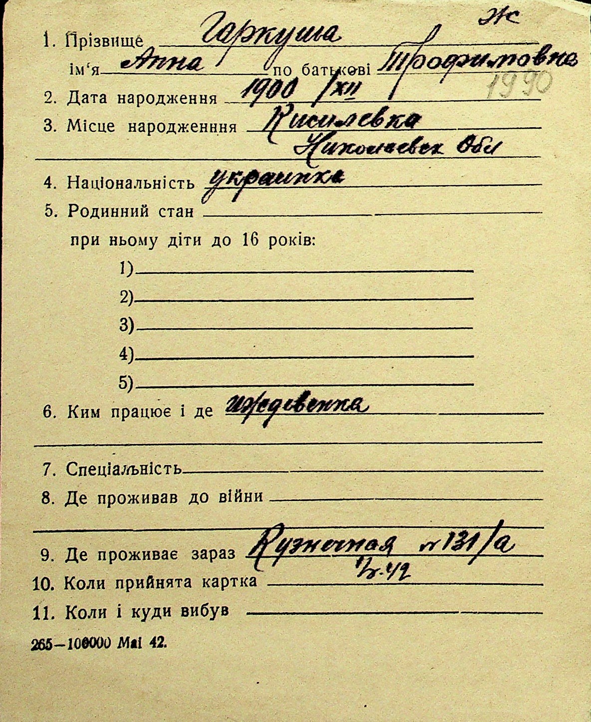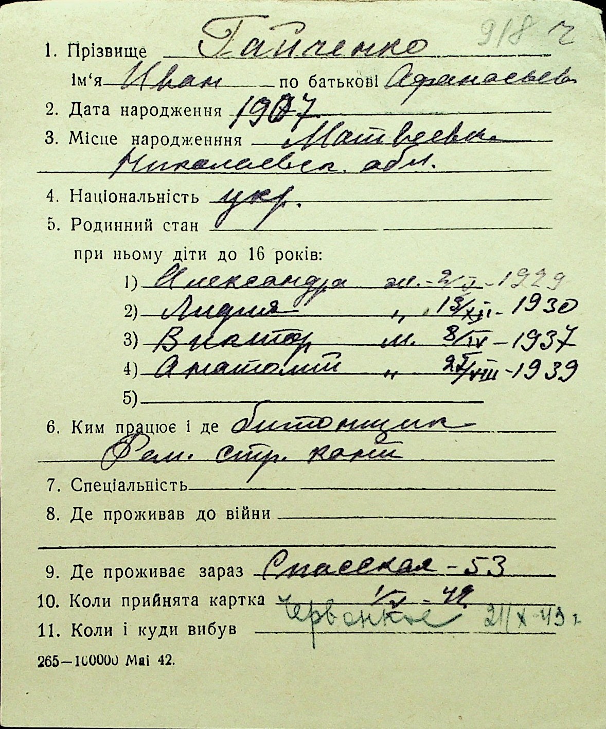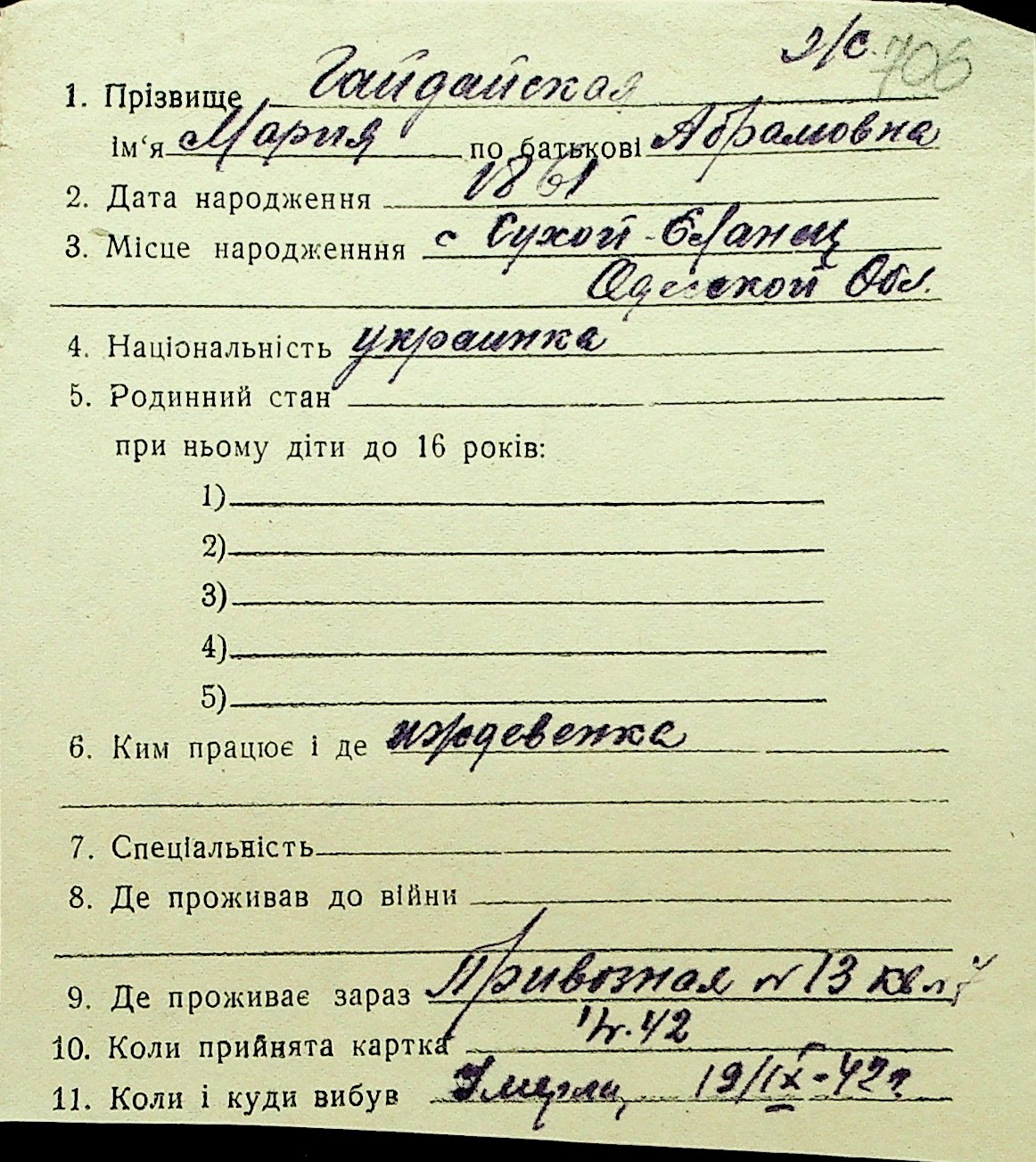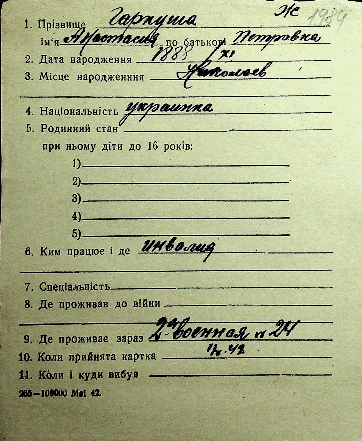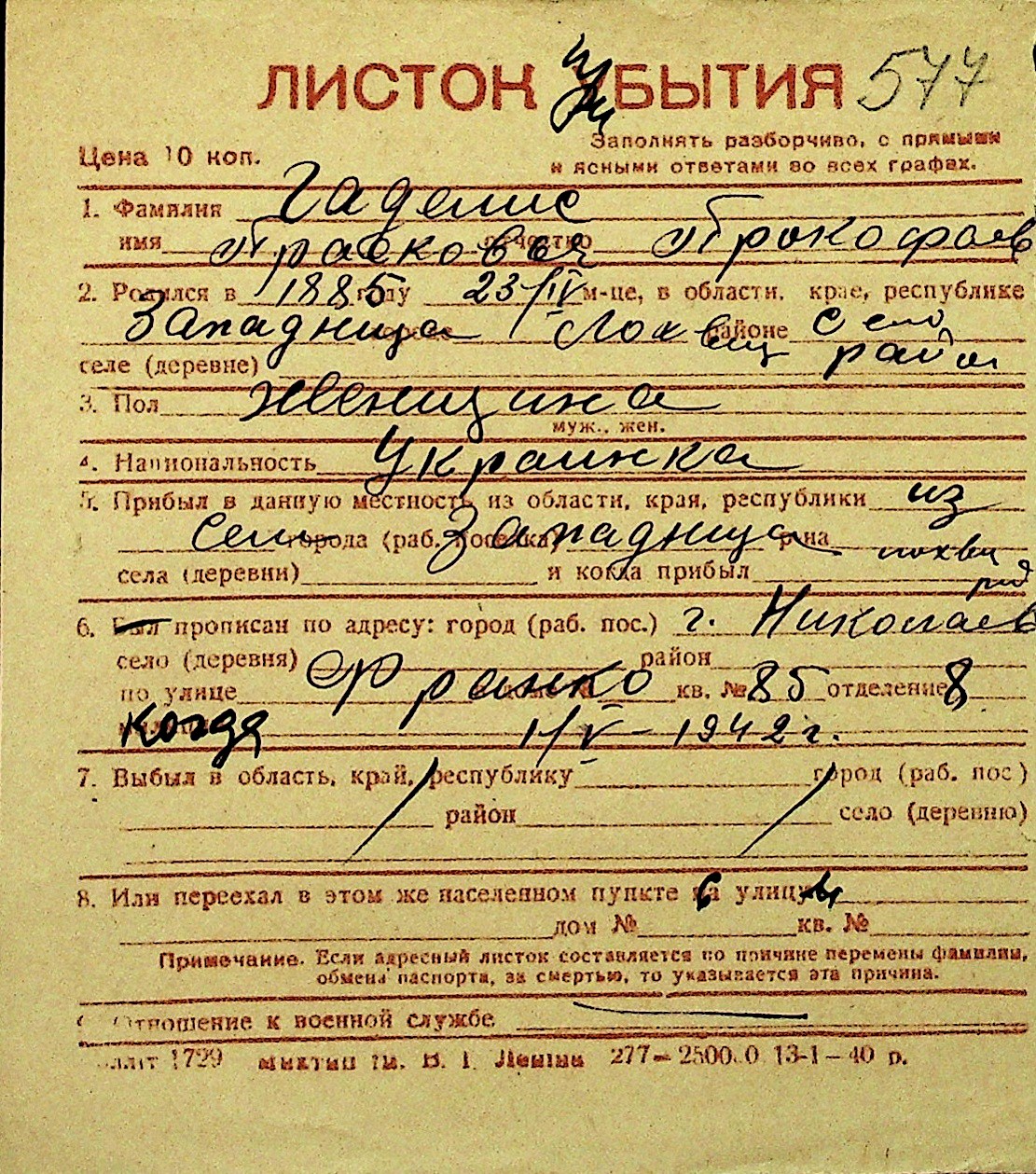 • • Перелік карток до фонду № Н-1016