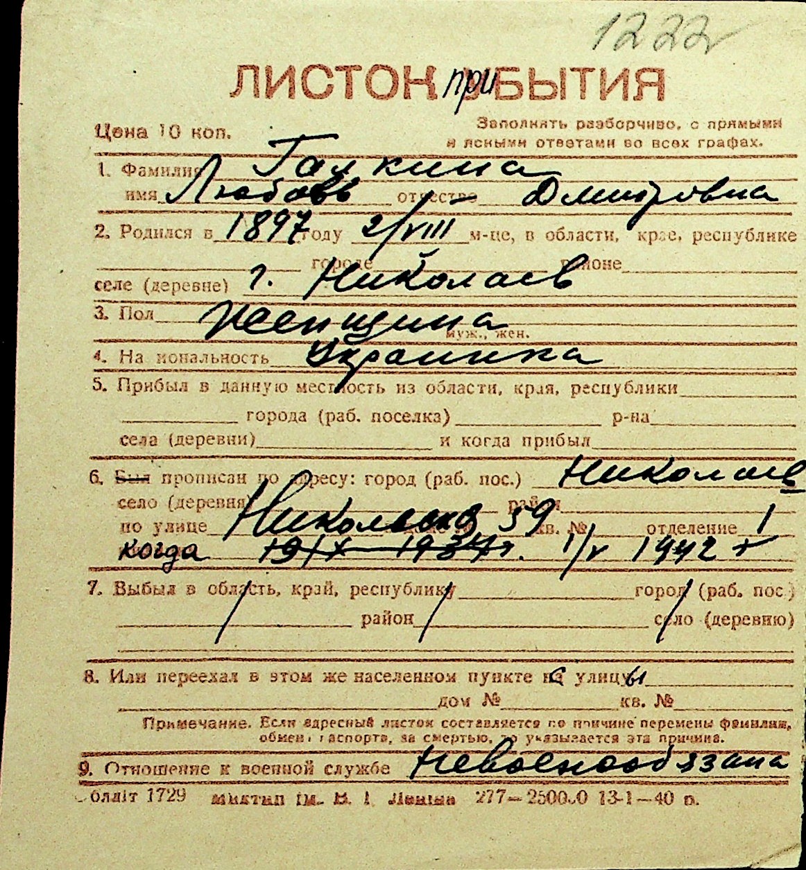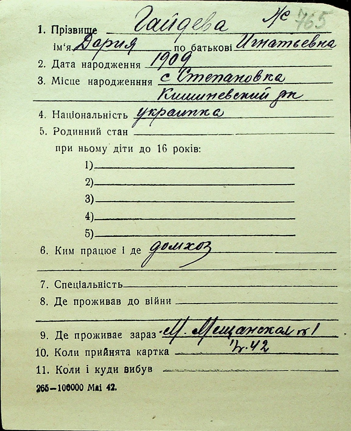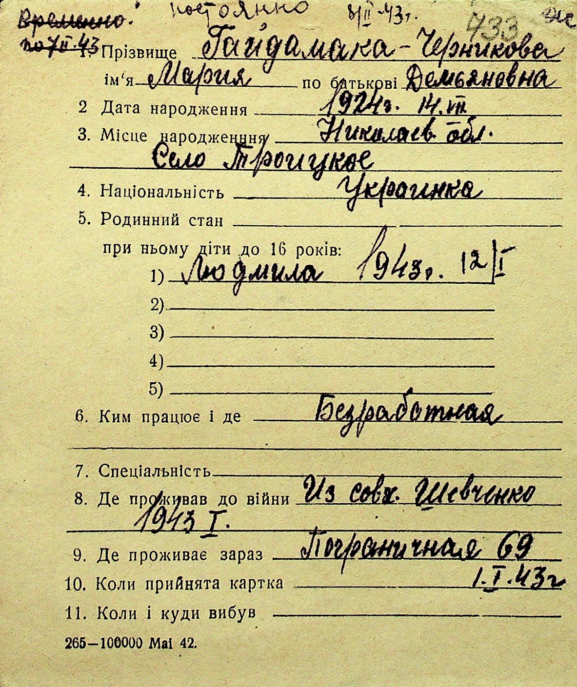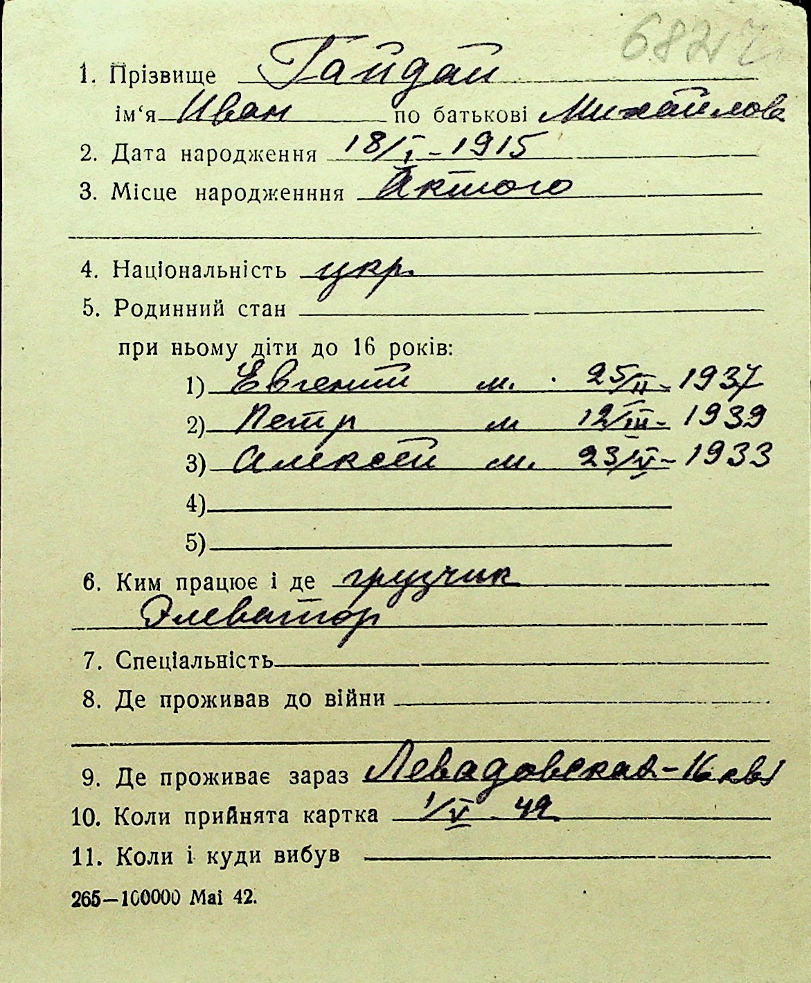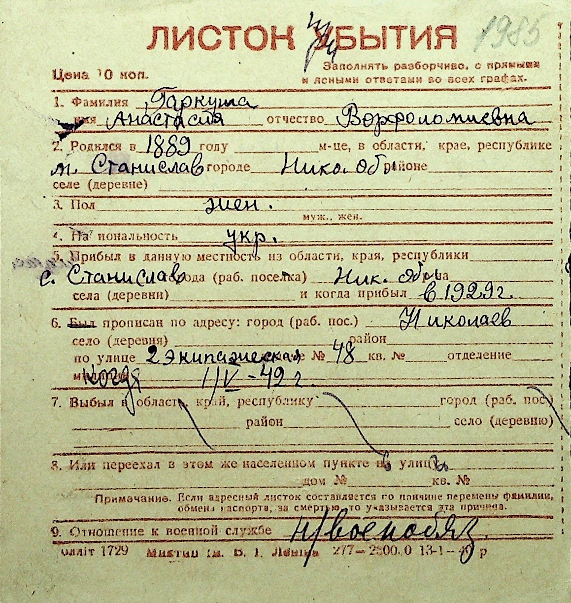 • • Перелік карток до фонду № Н-1016