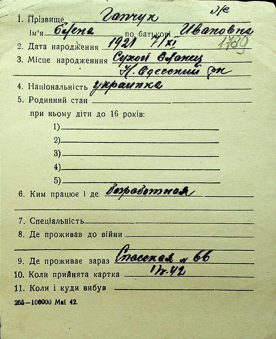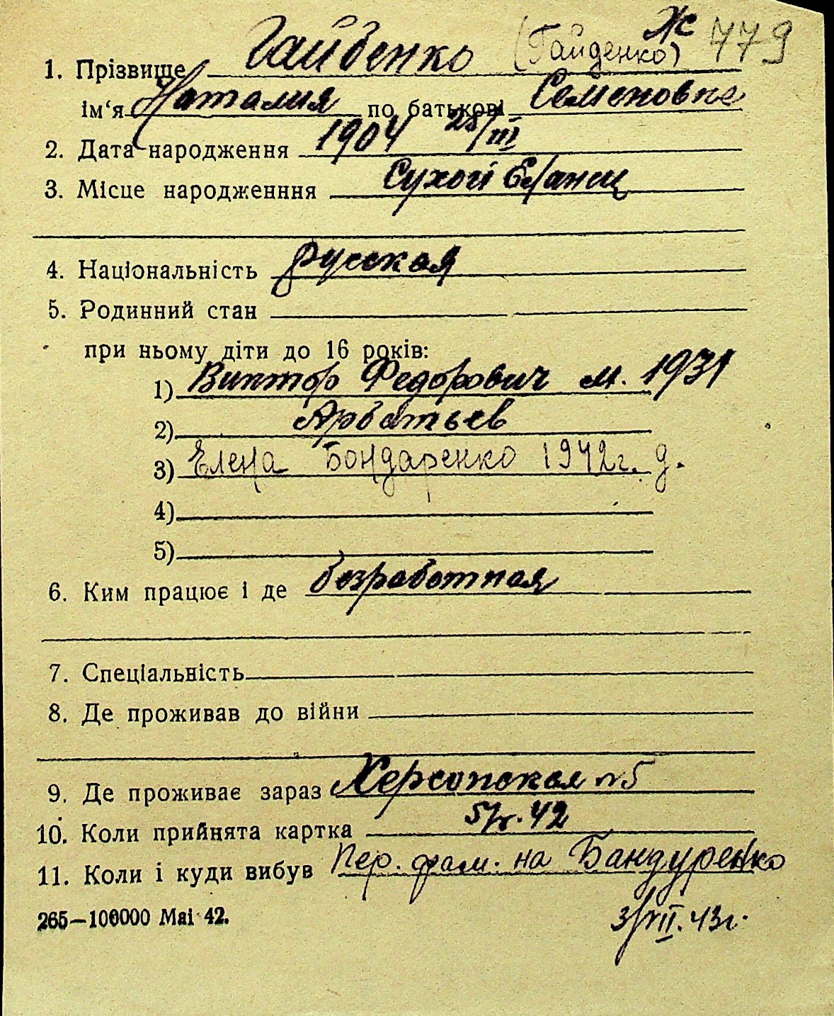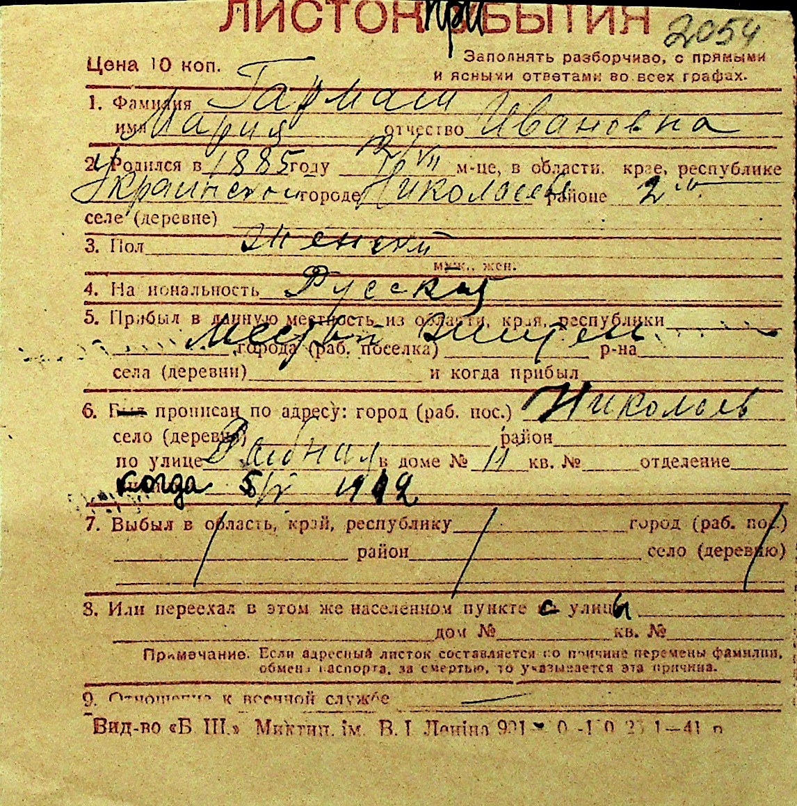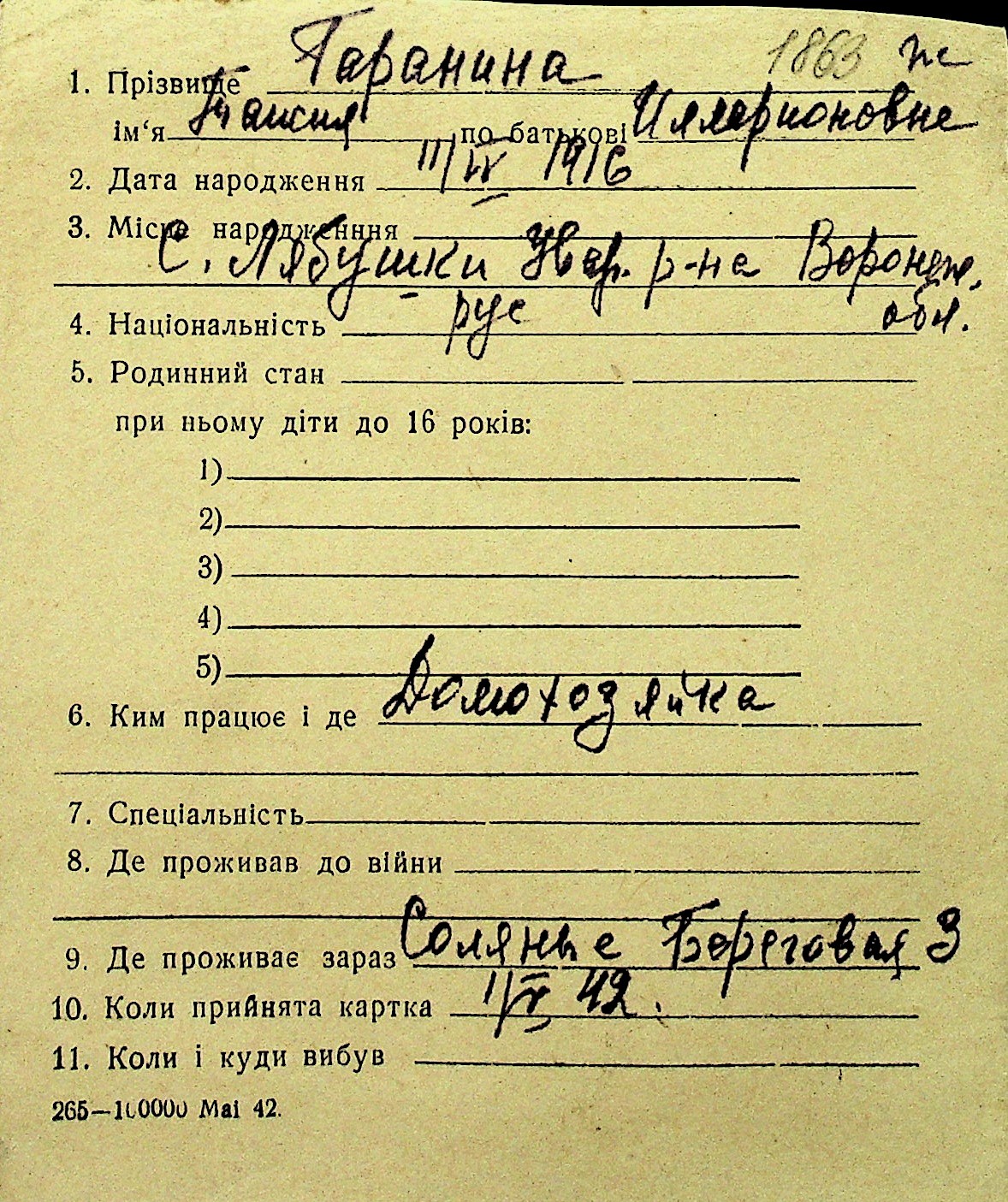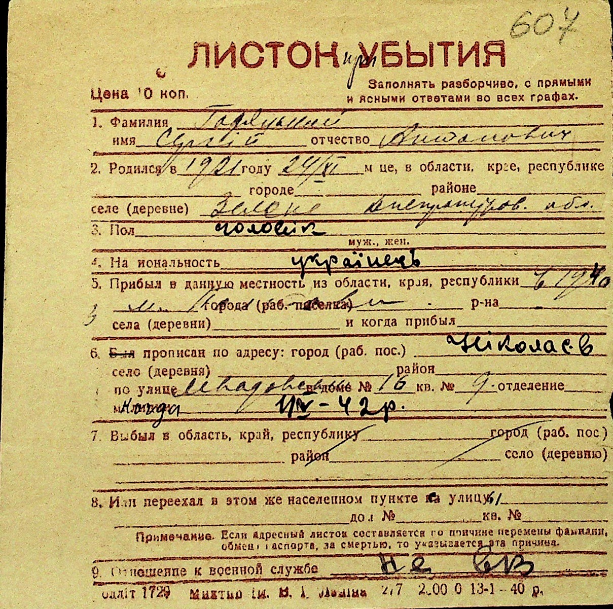 • • Перелік карток до фонду № Н-1016