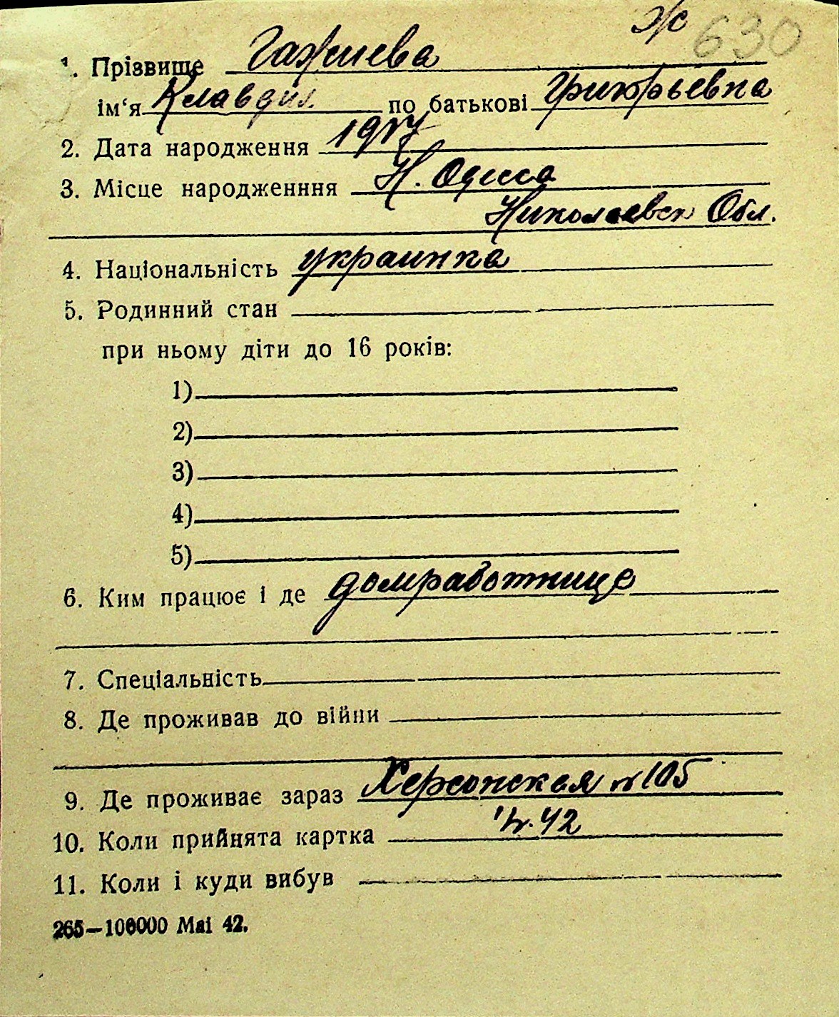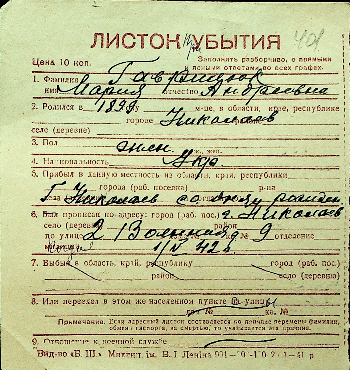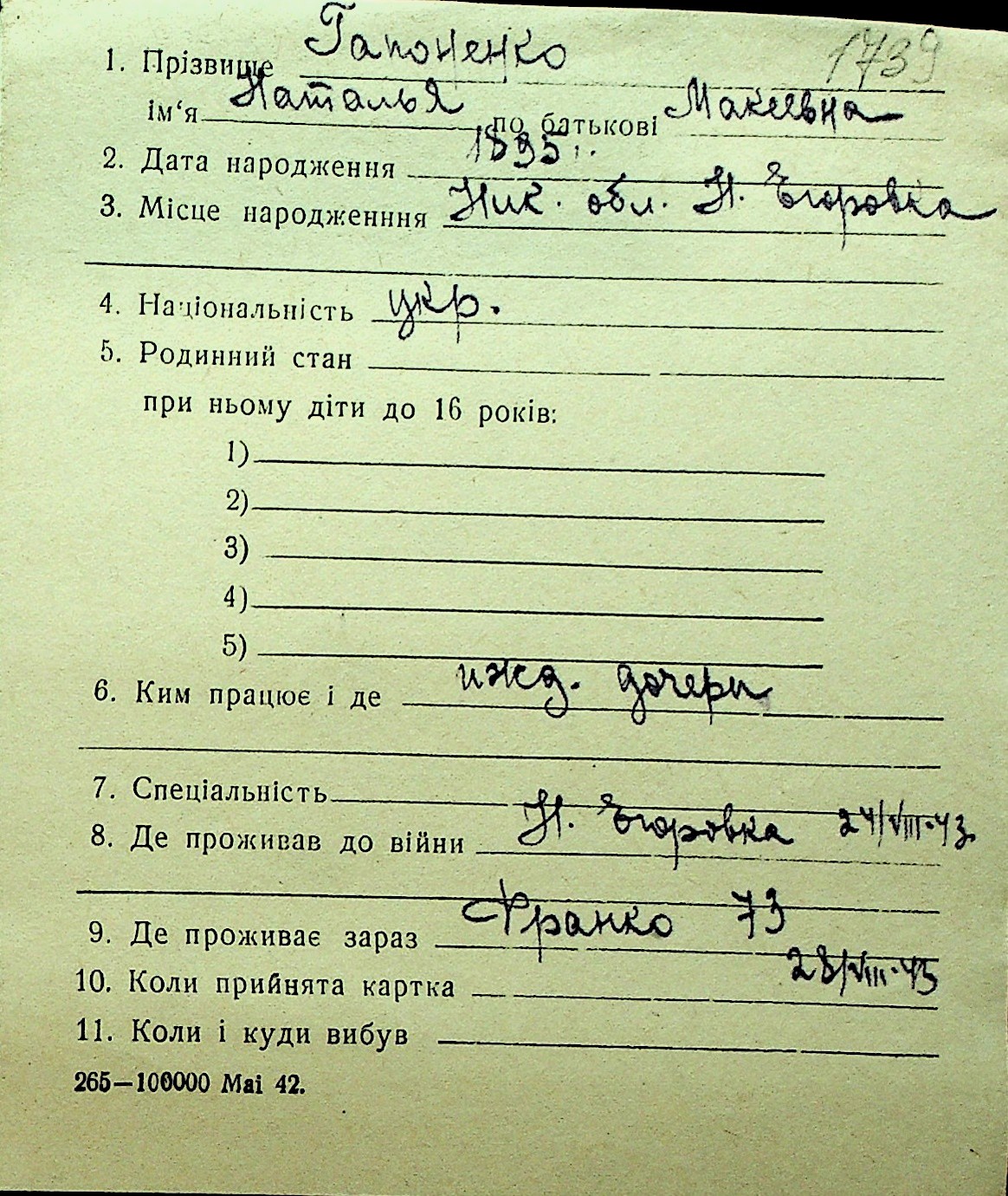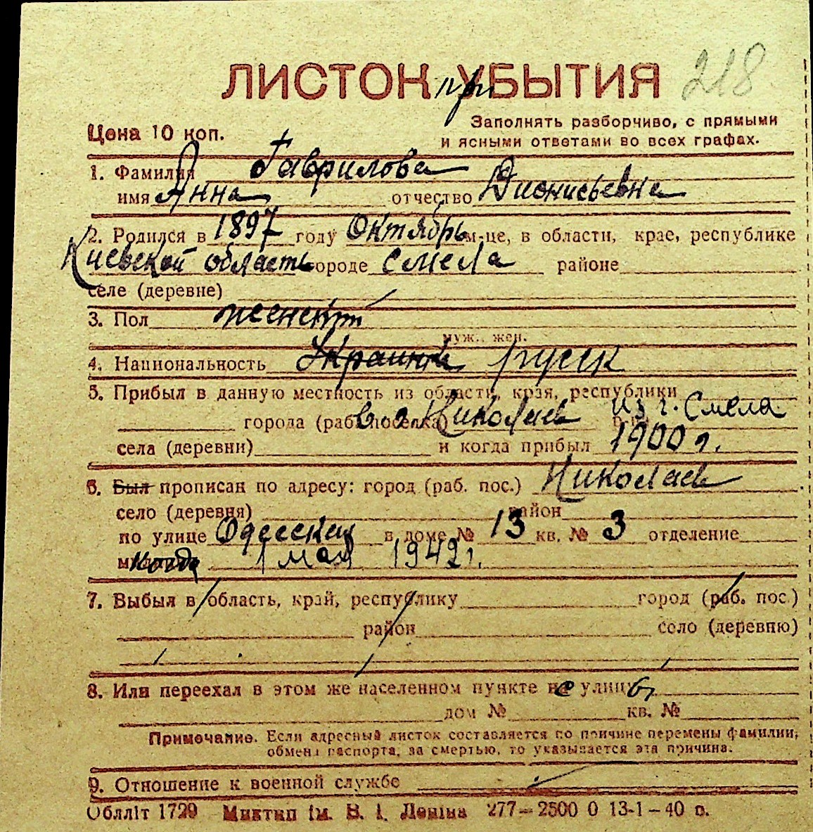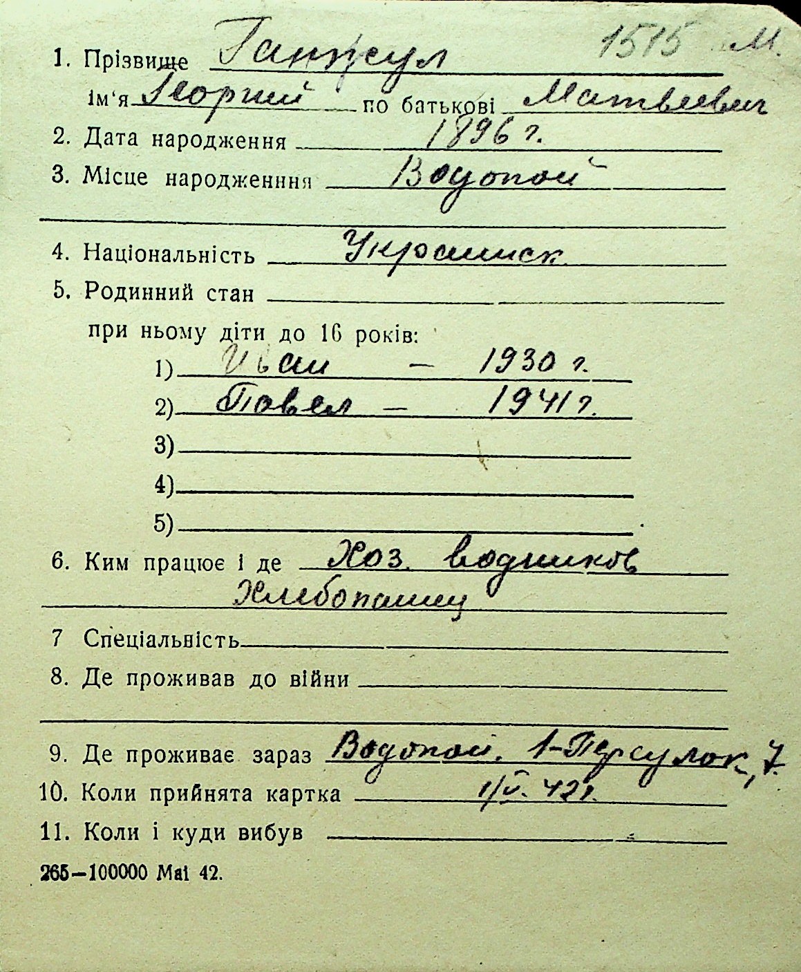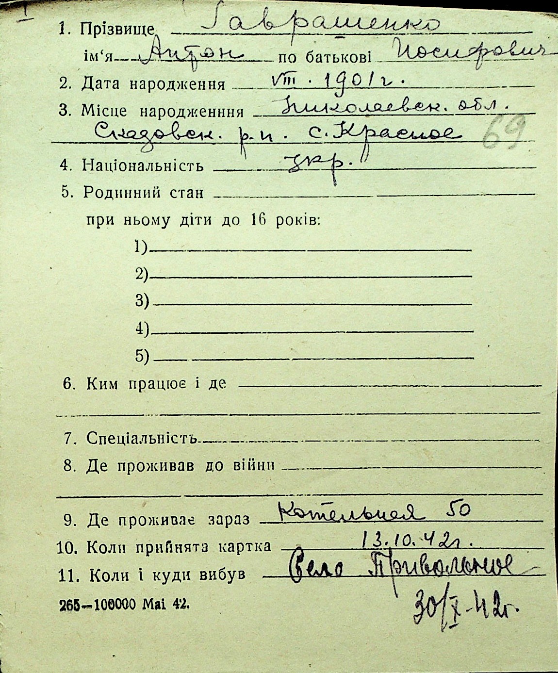 • • Перелік карток до фонду № Н-1016
