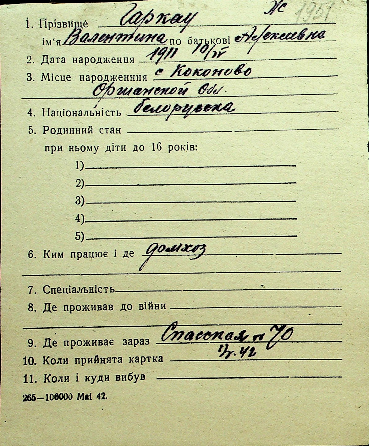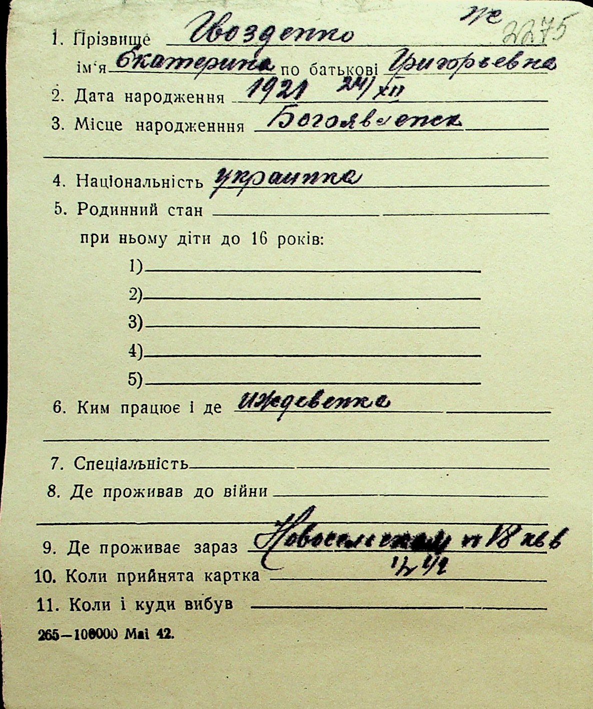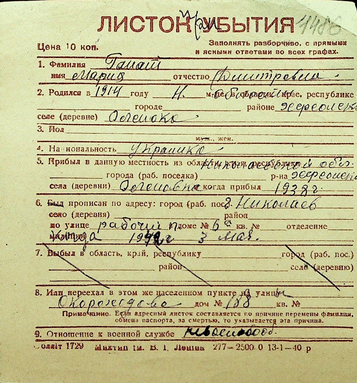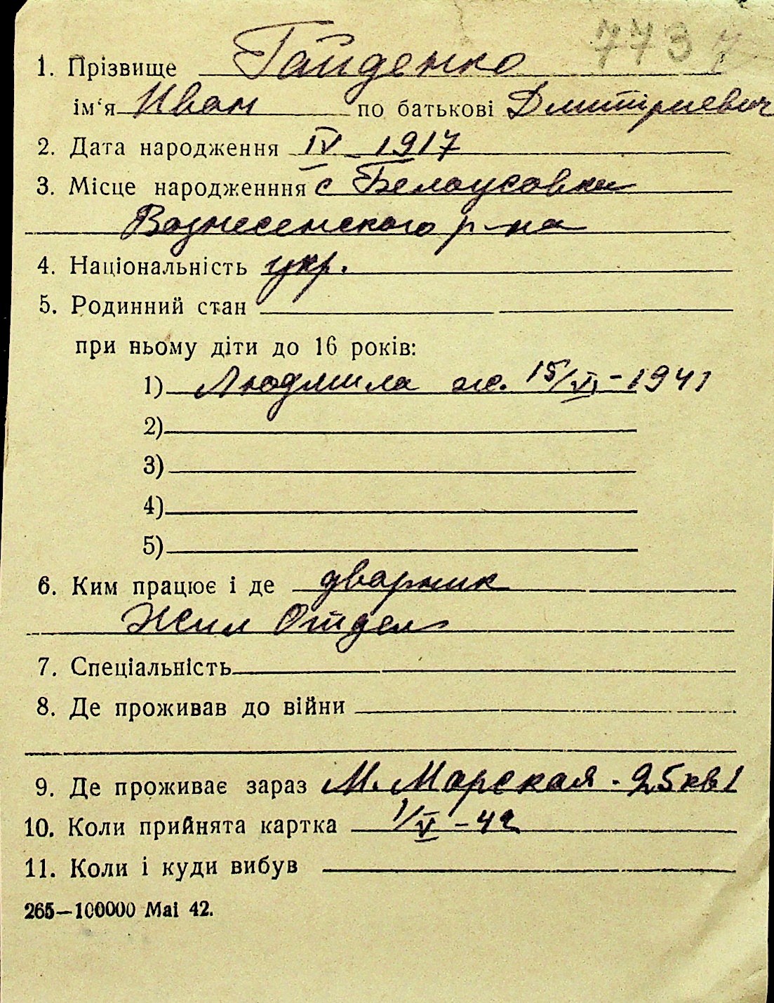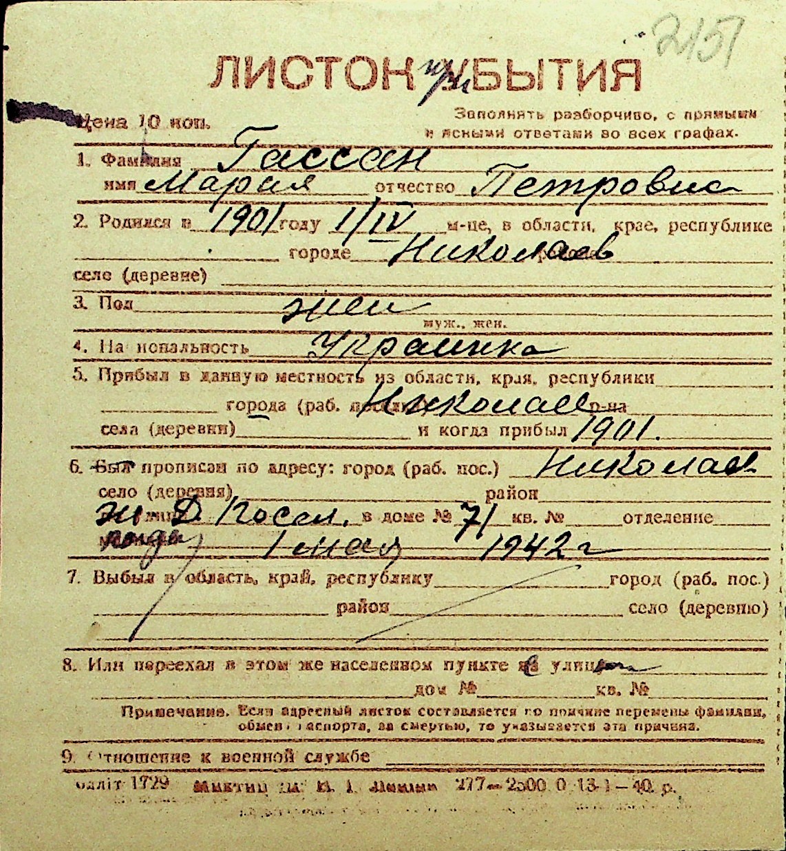 • • Перелік карток до фонду № Н-1016