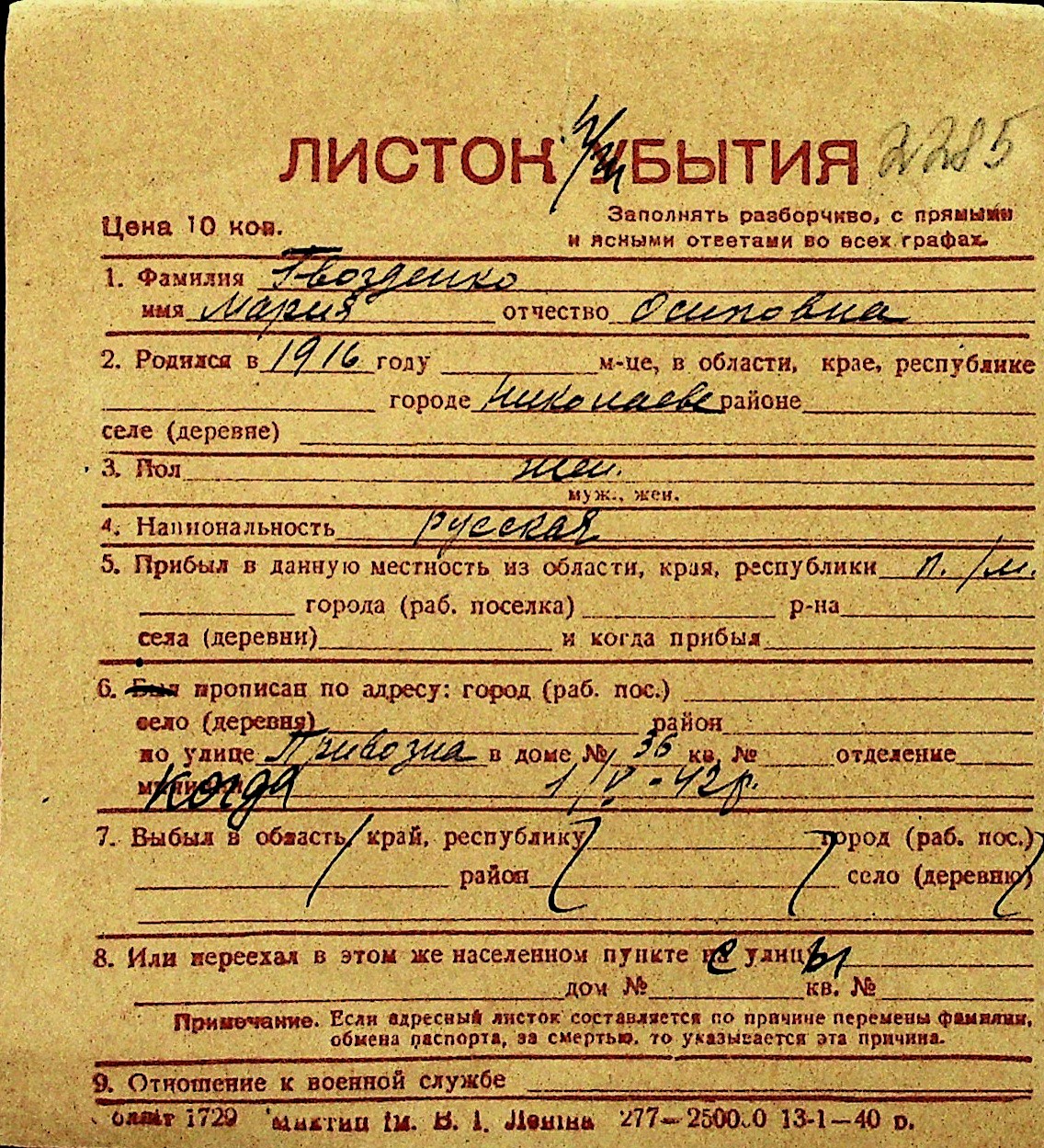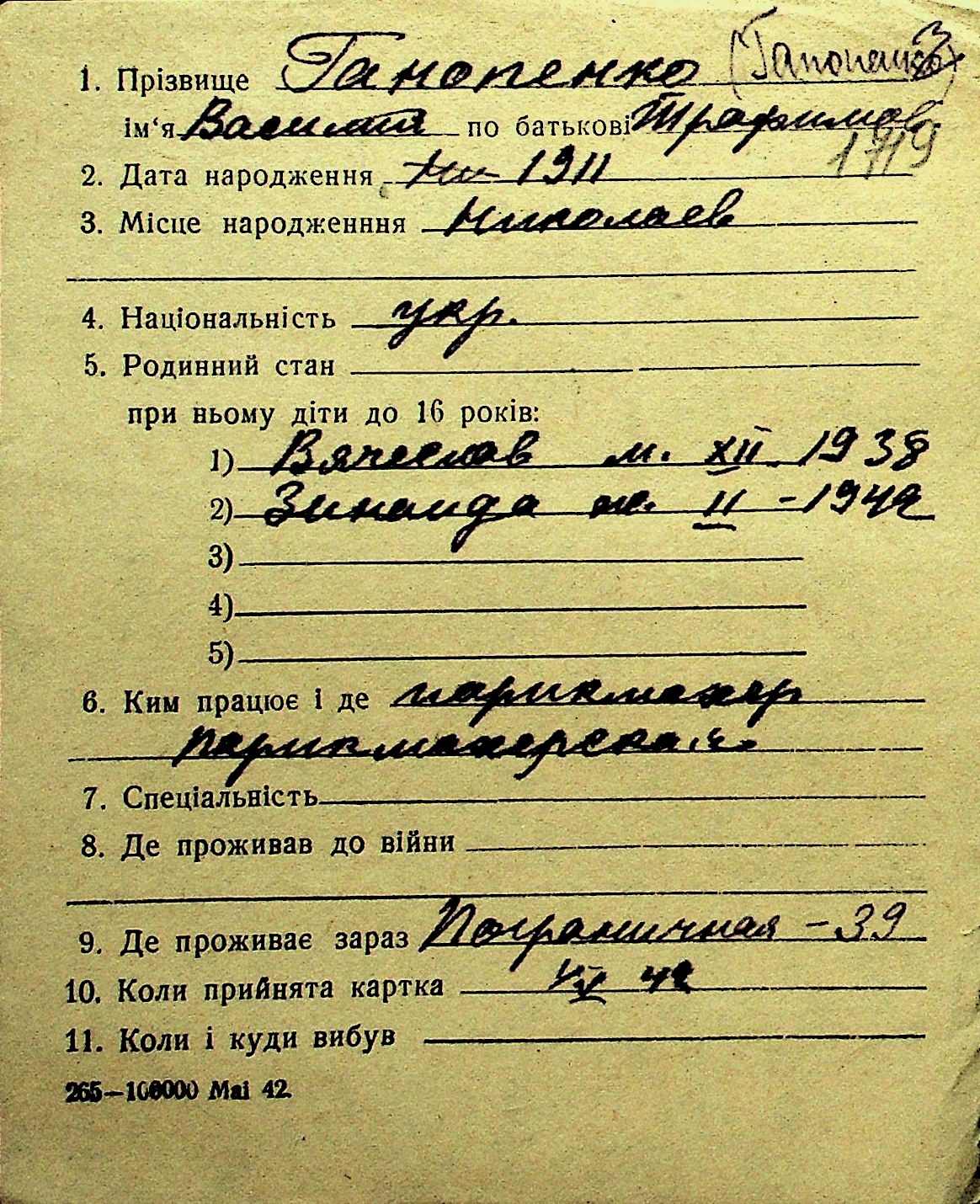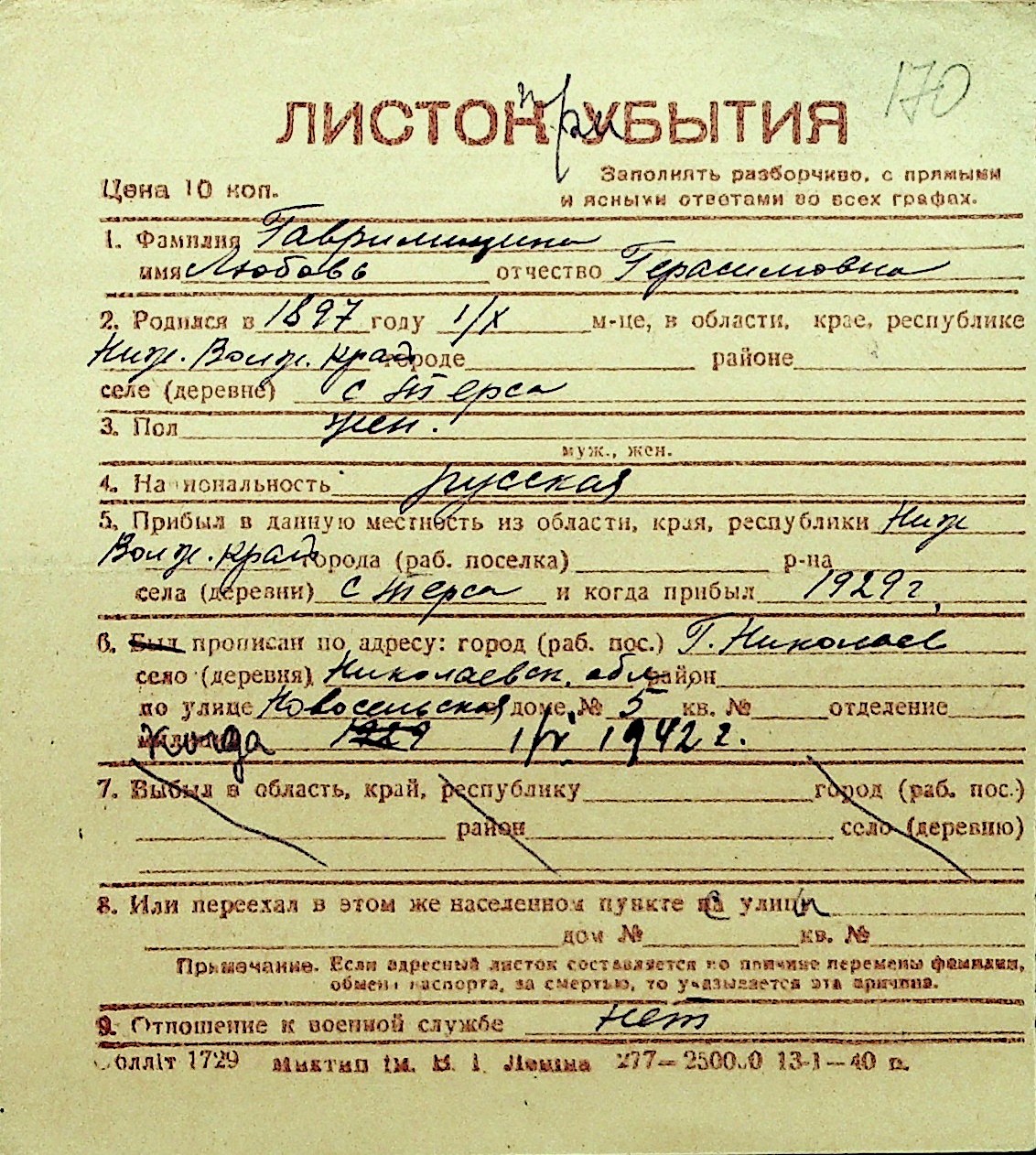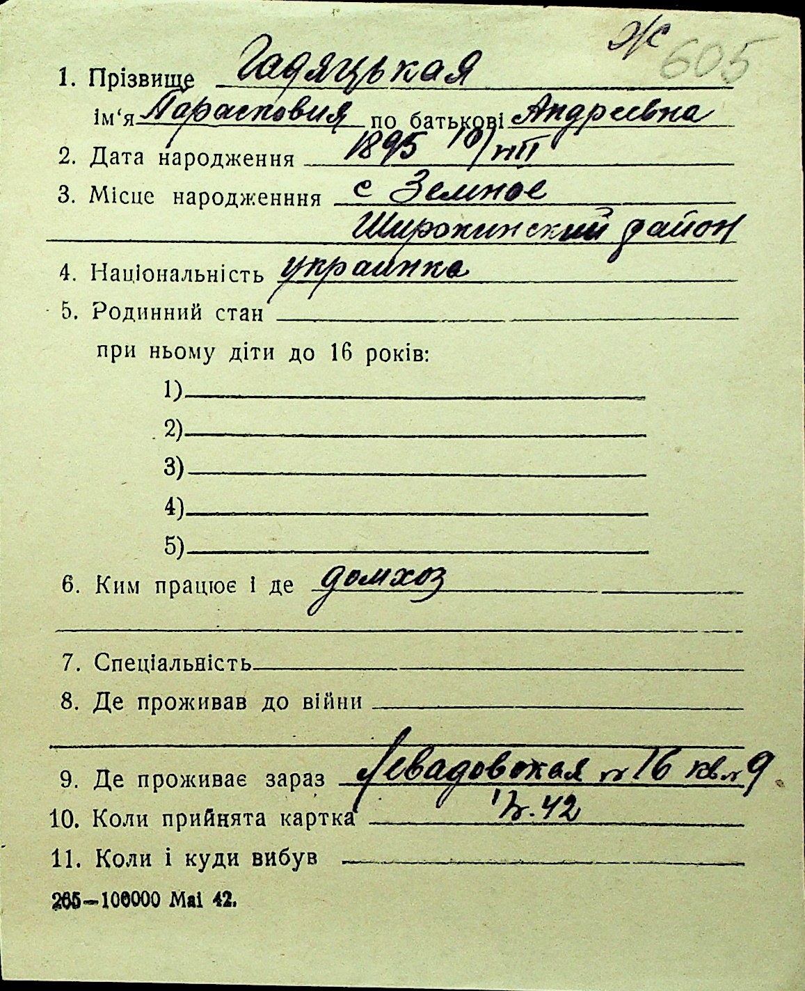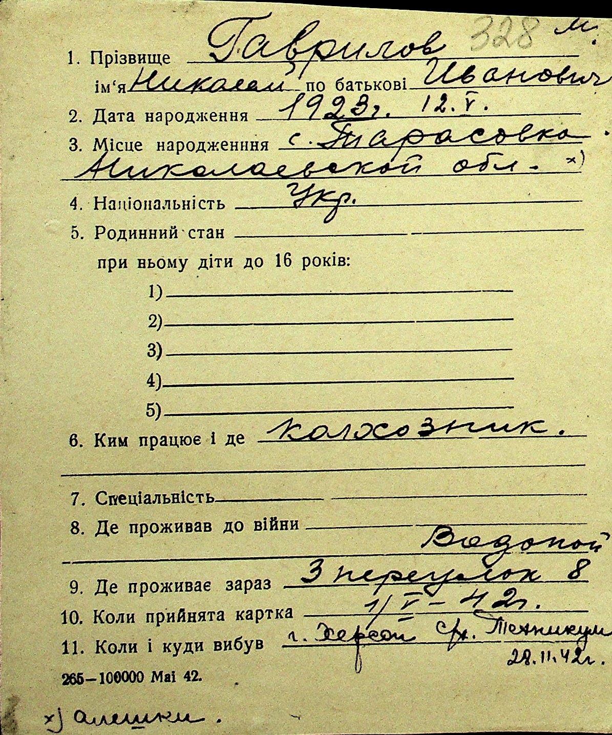 • • Перелік карток до фонду № Н-1016
