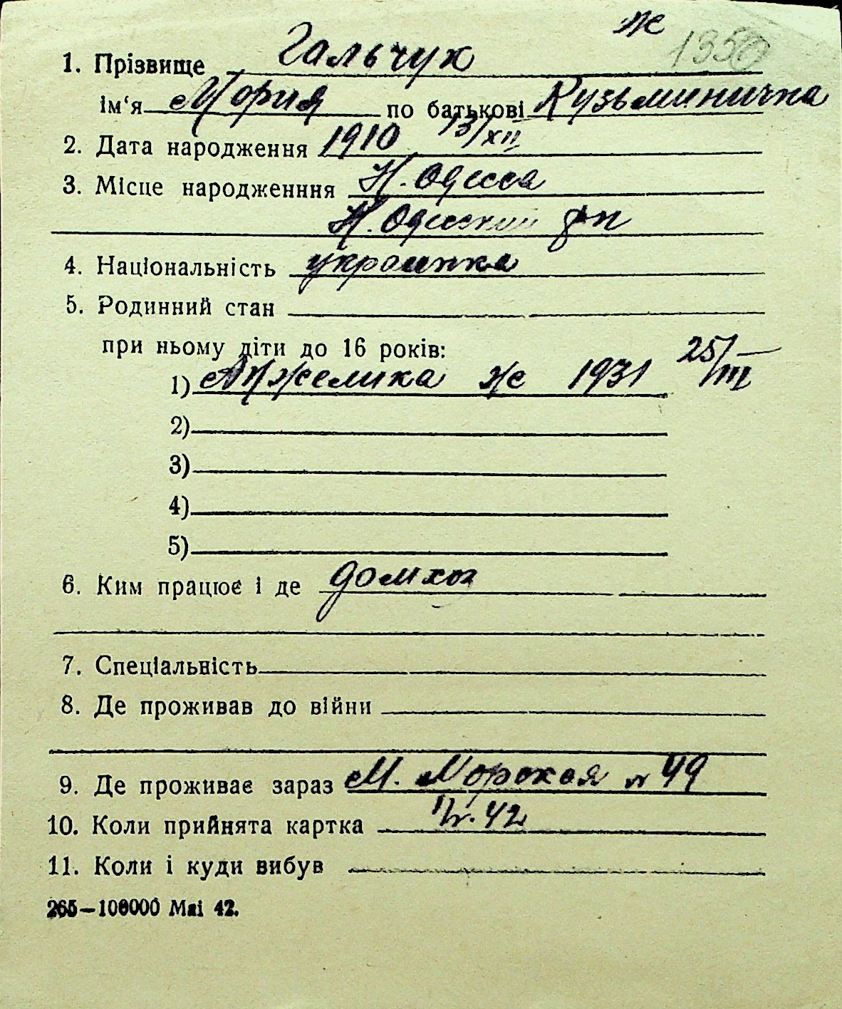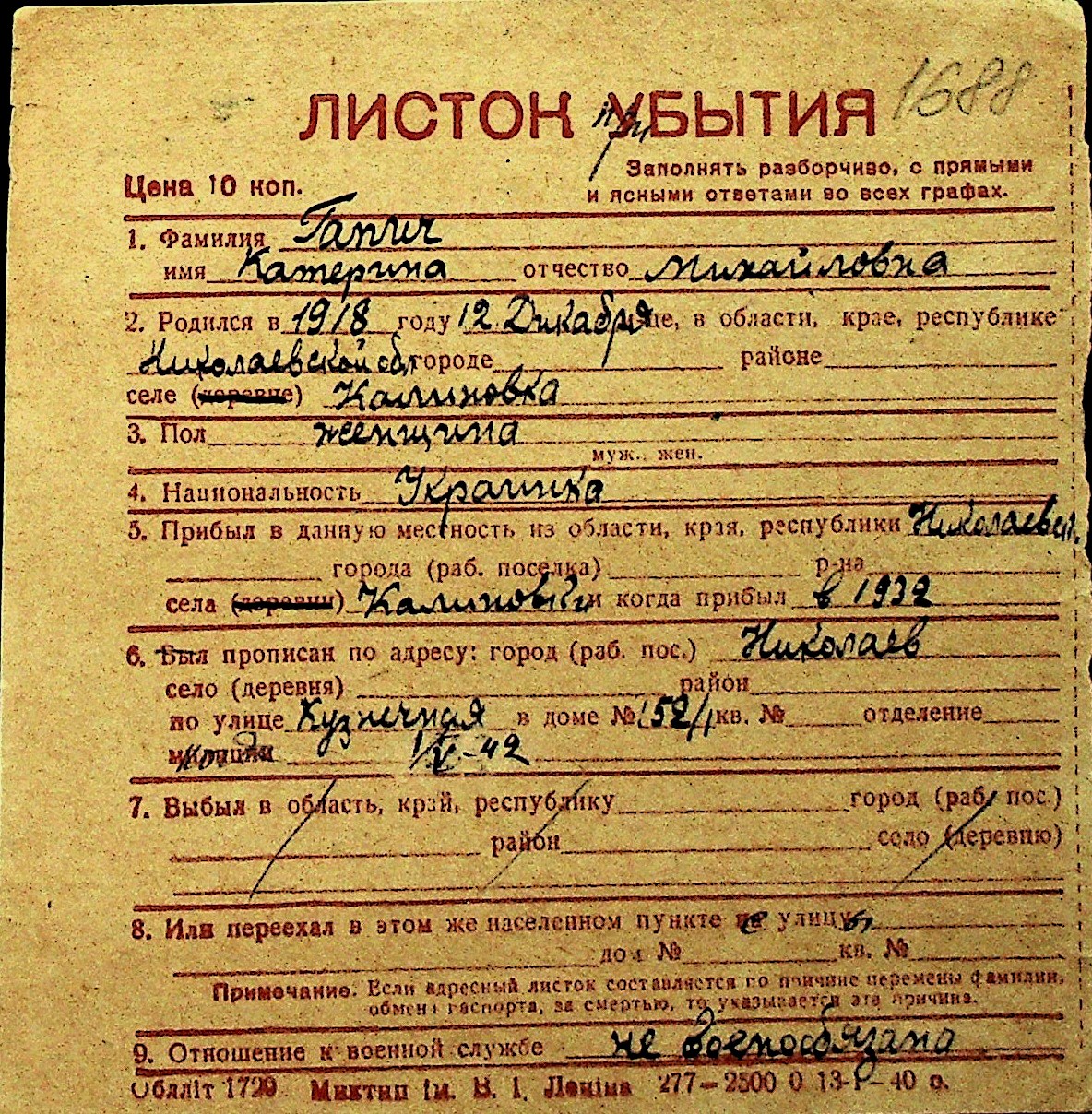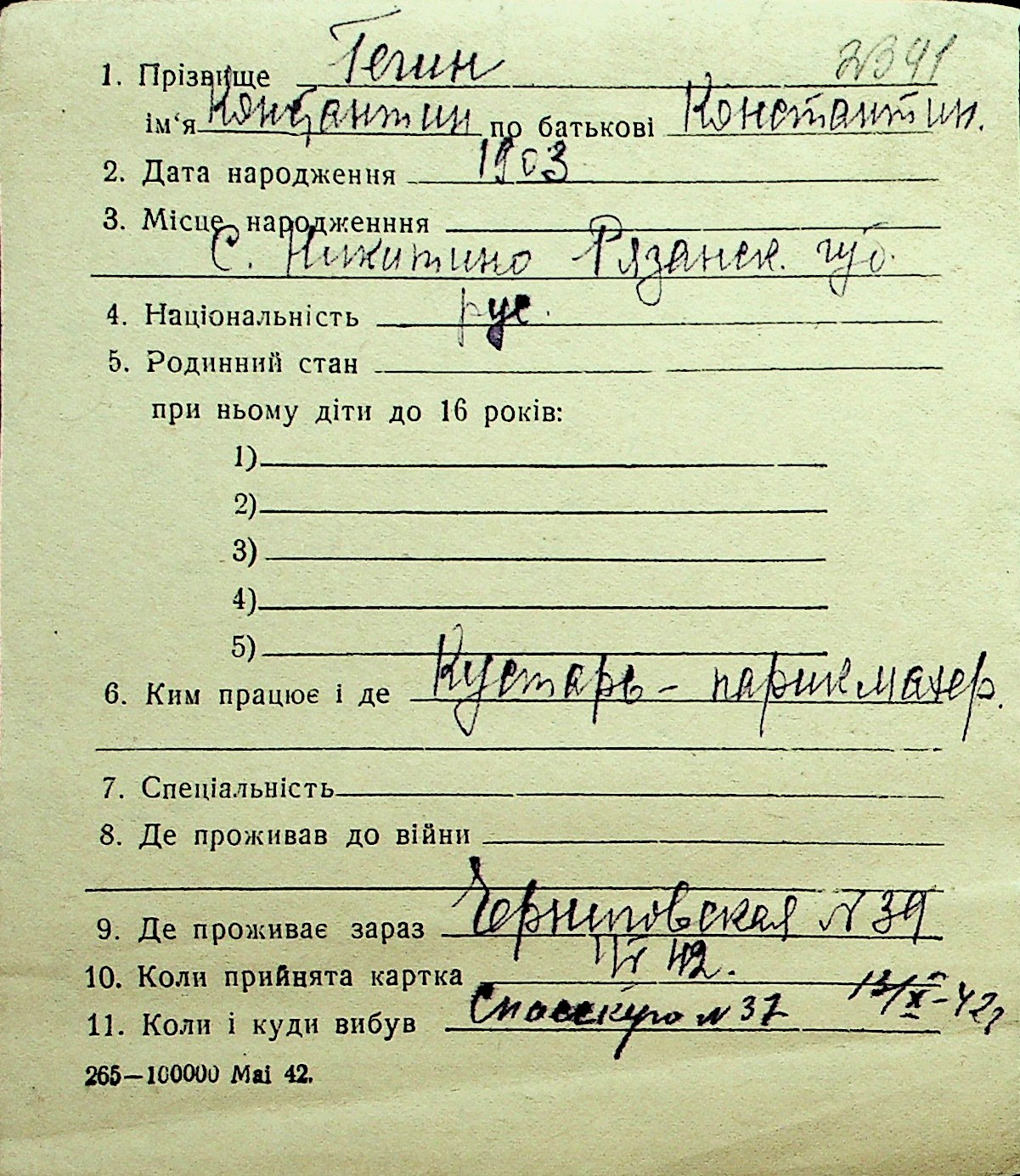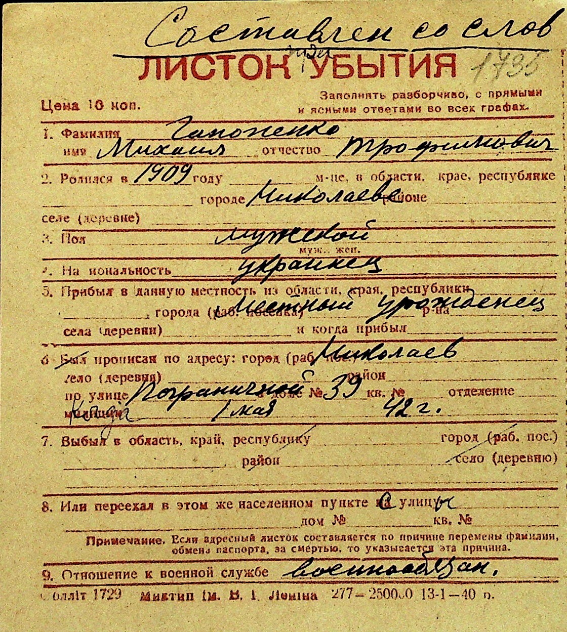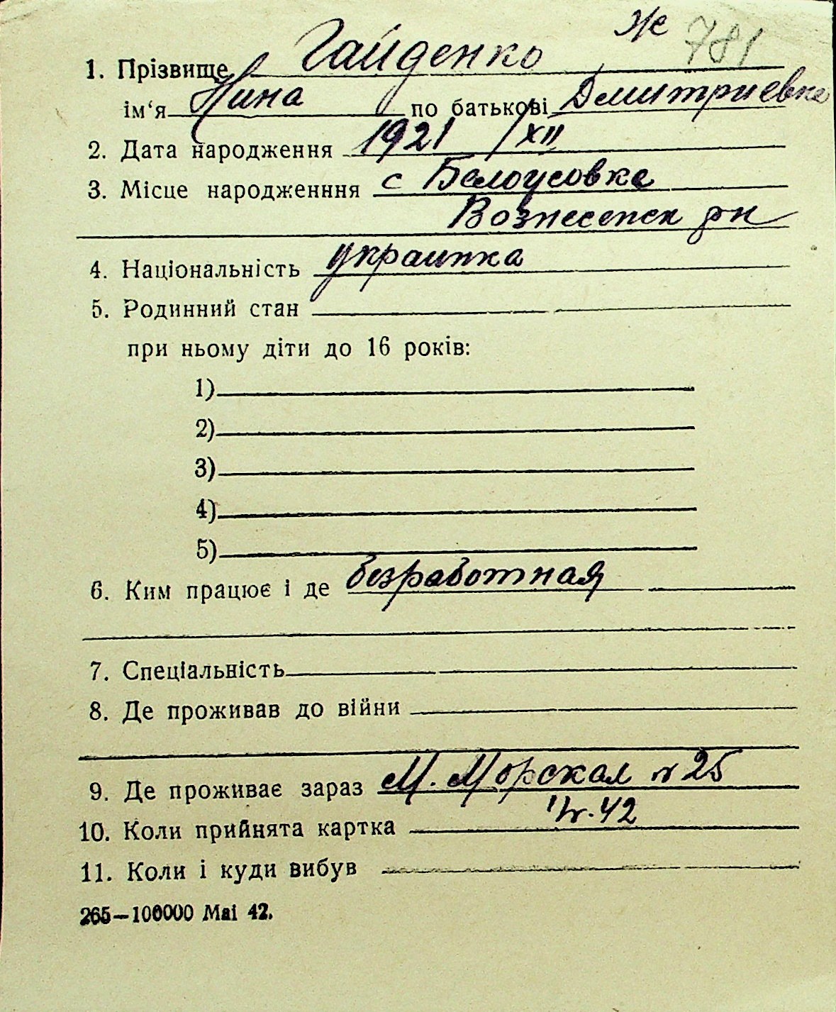 • • Перелік карток до фонду № Н-1016