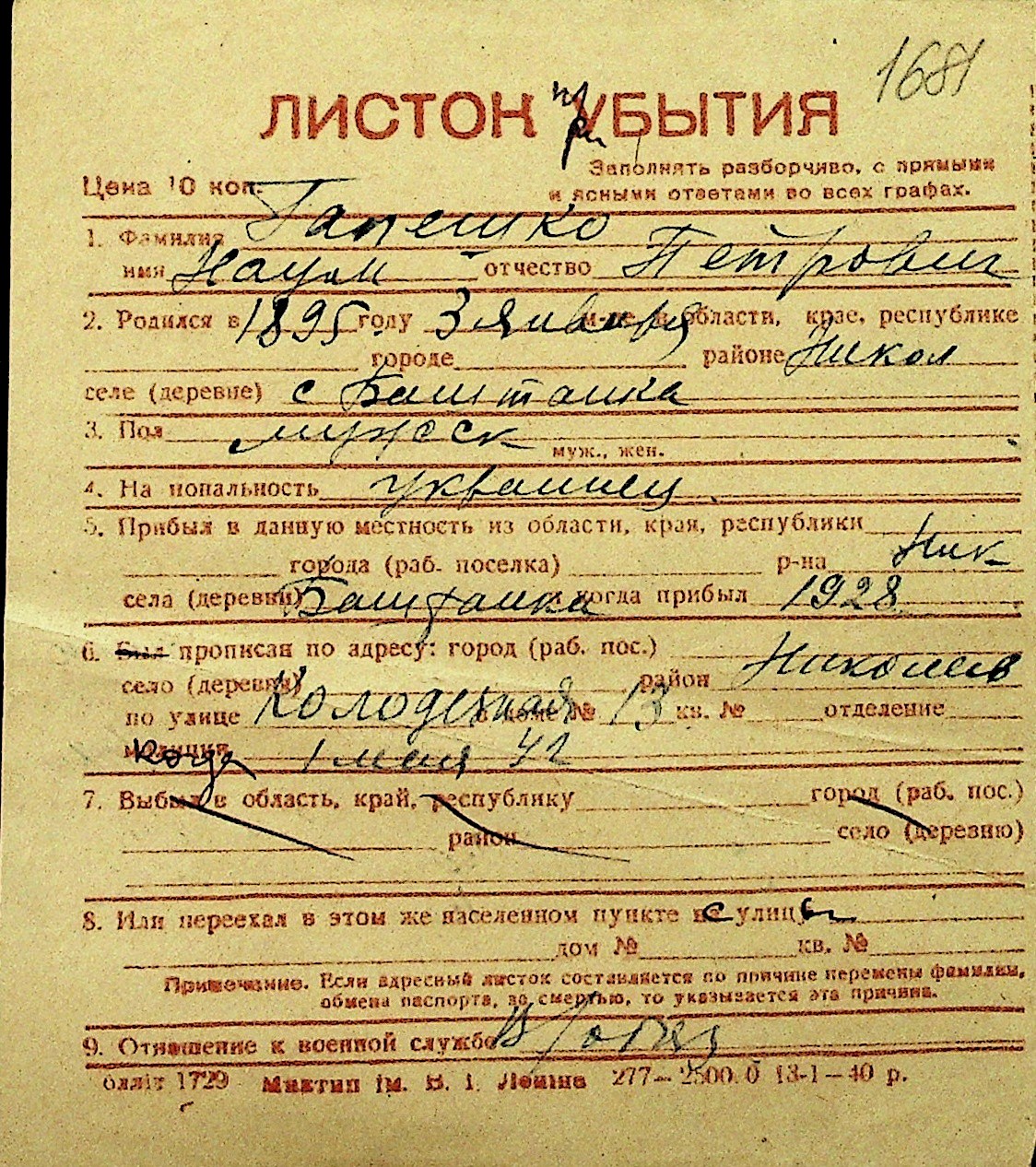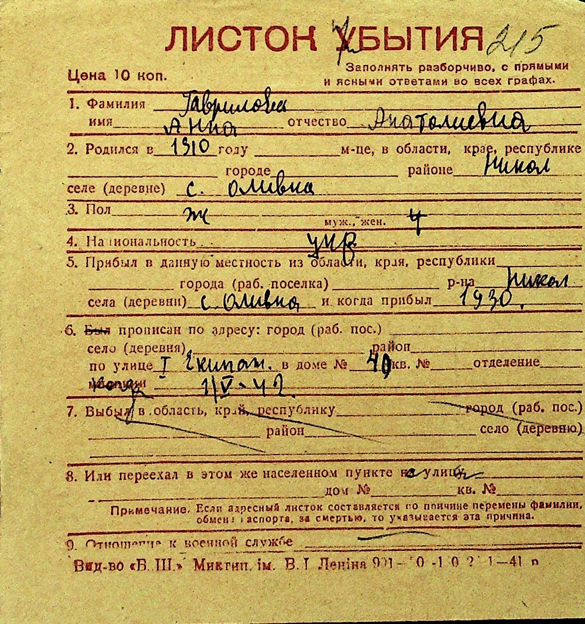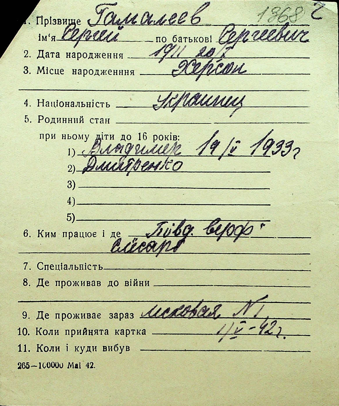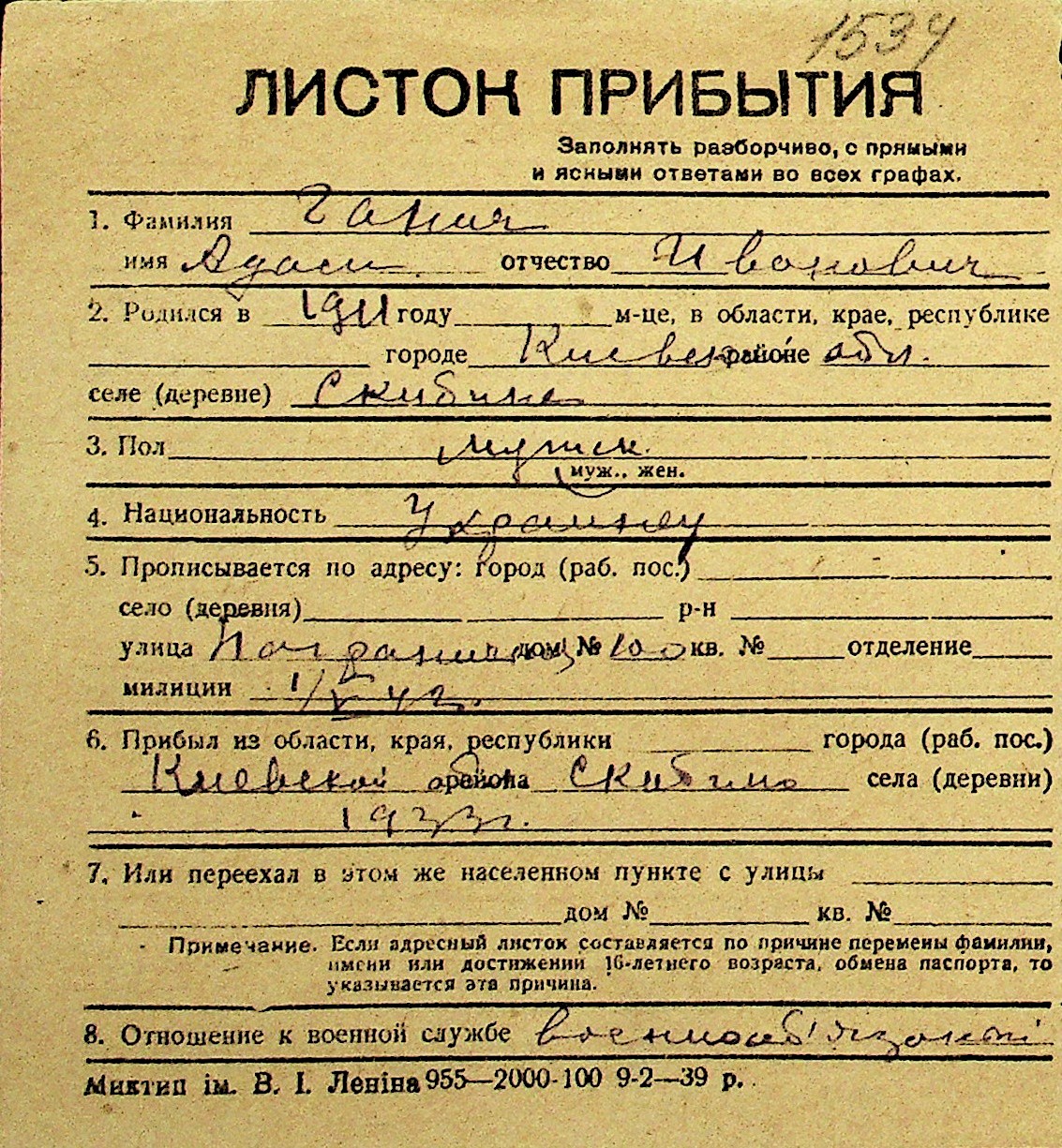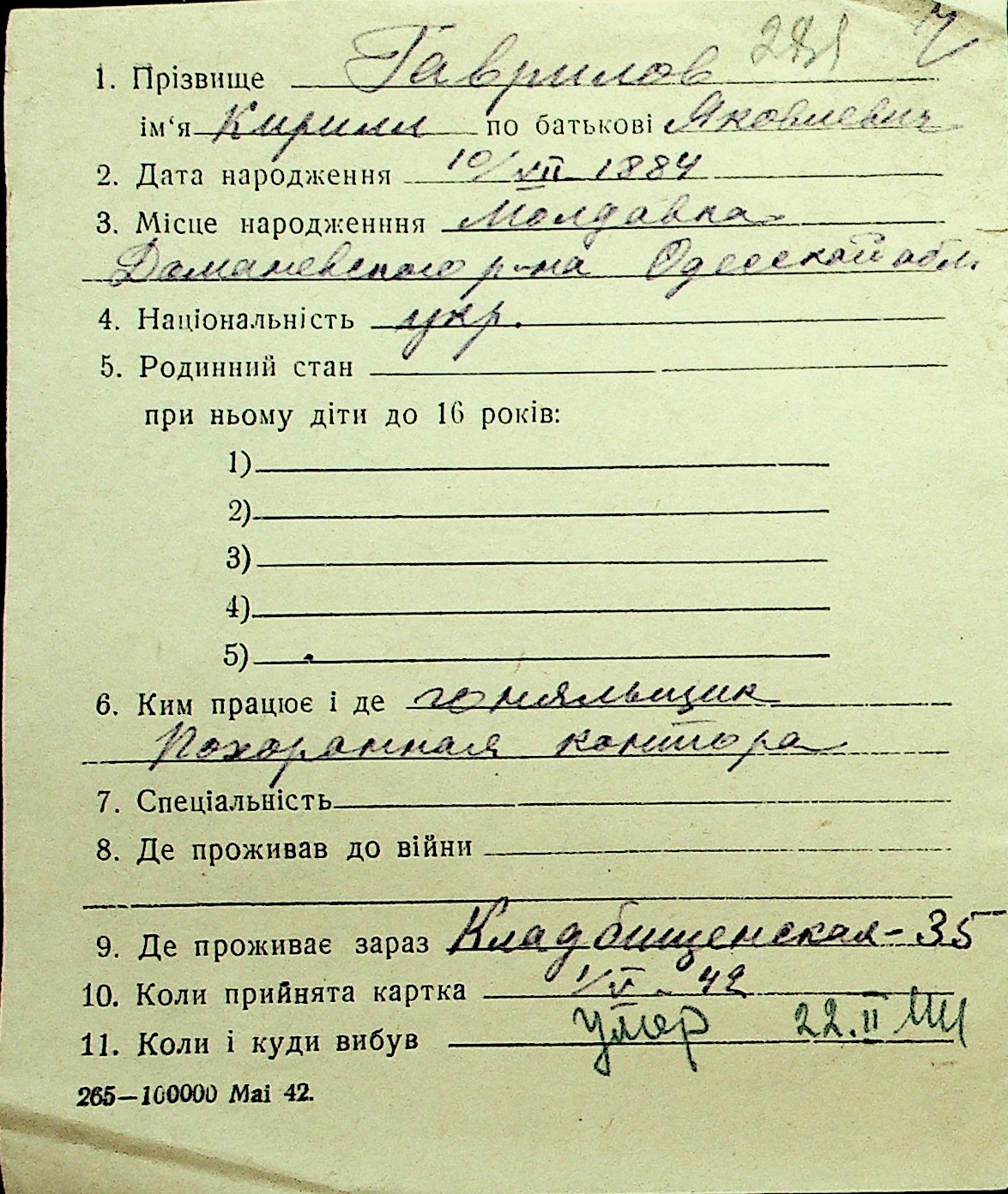• • Перелік карток до фонду № Н-1016