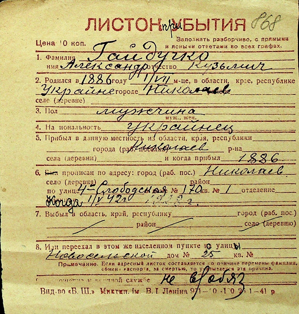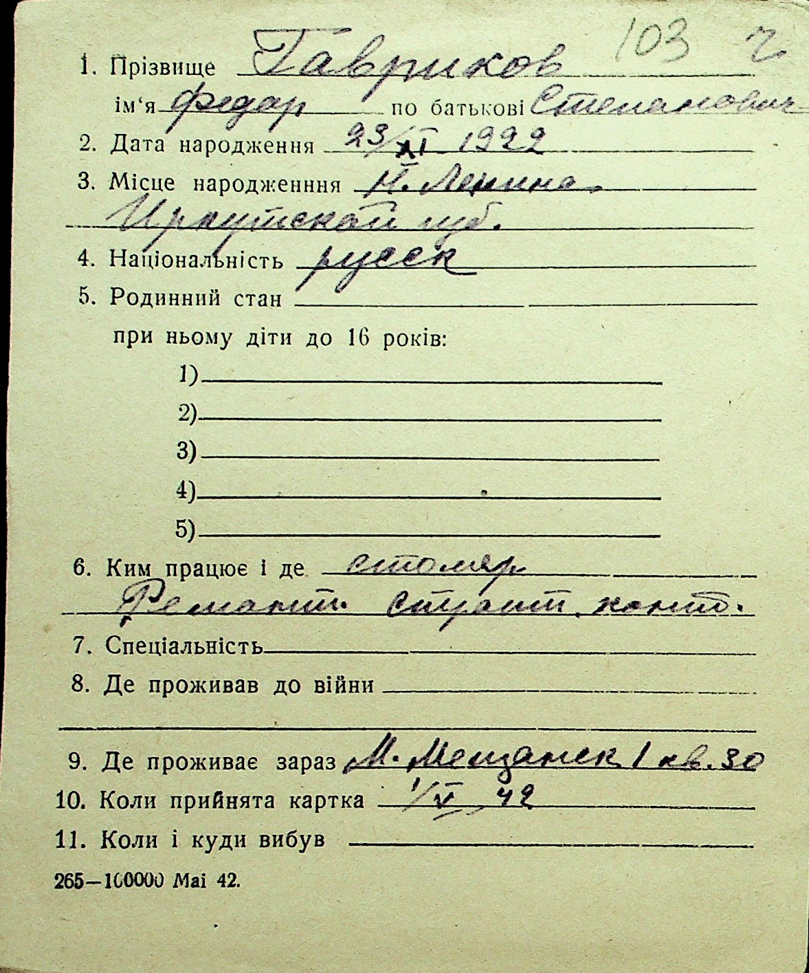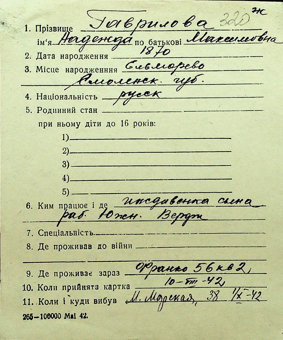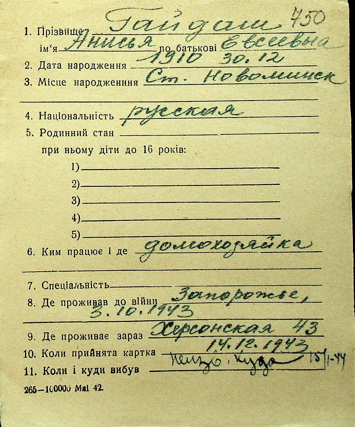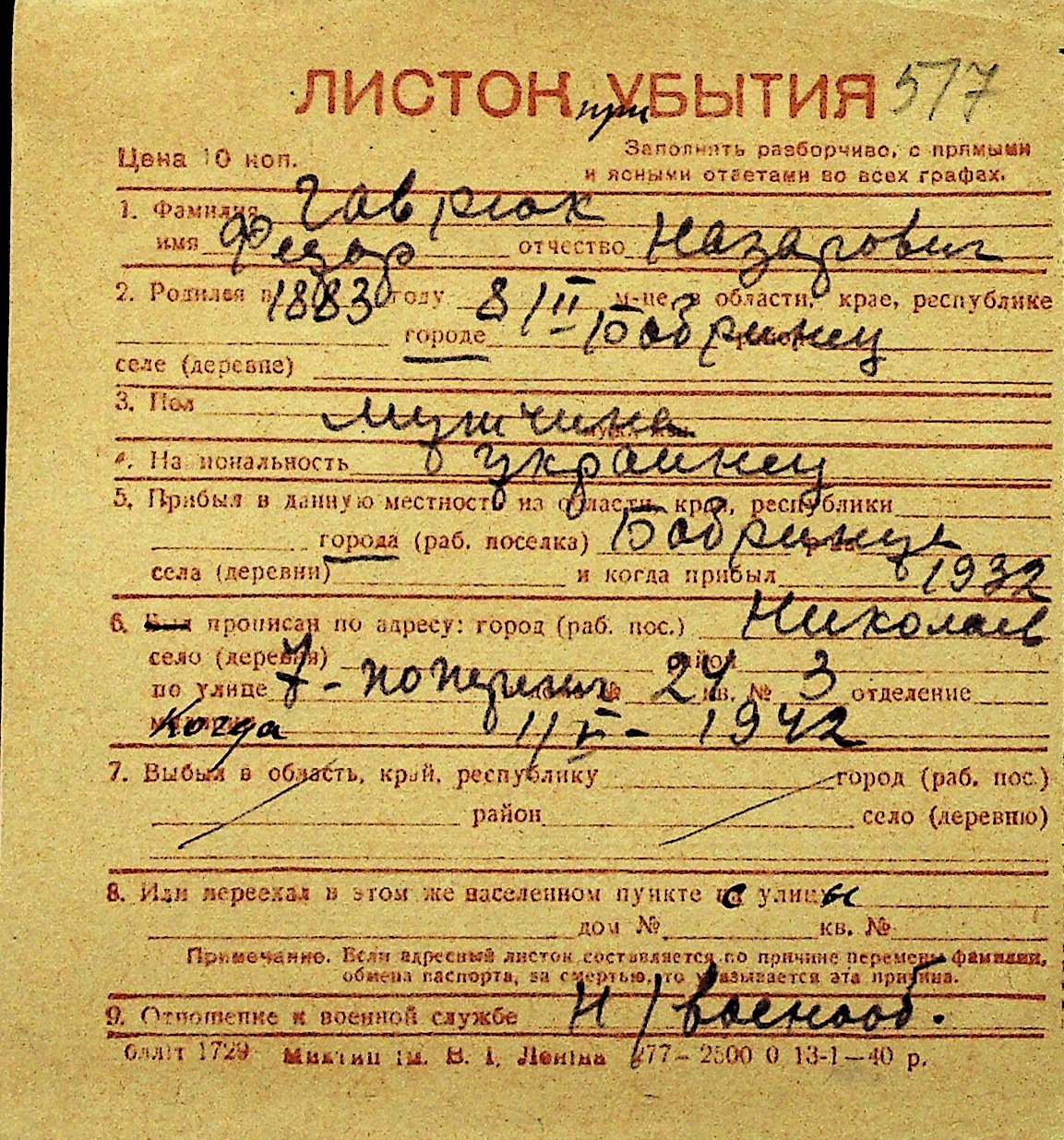 • • Перелік карток до фонду № Н-1016