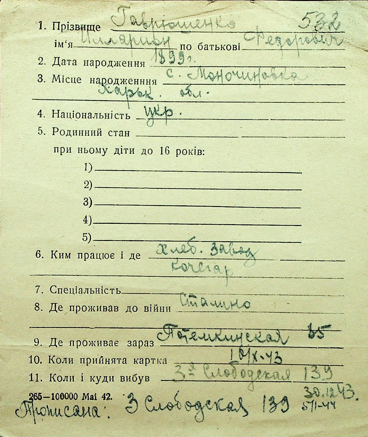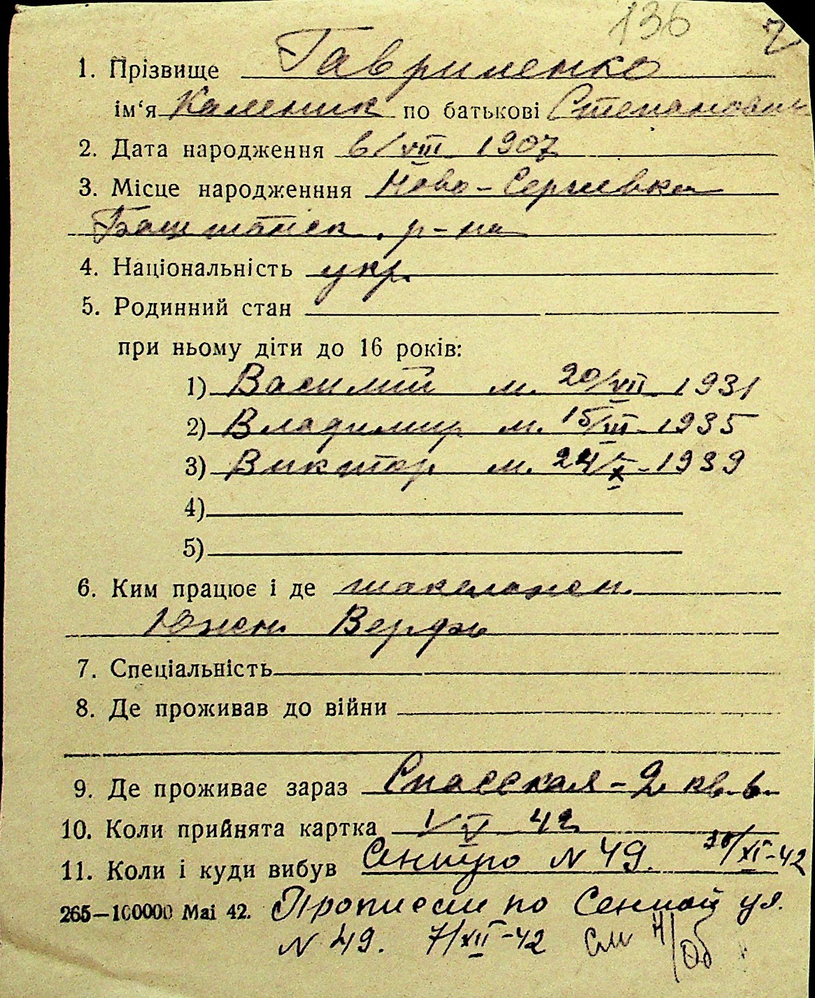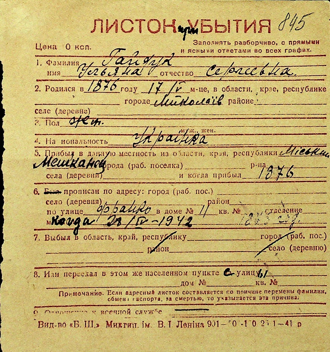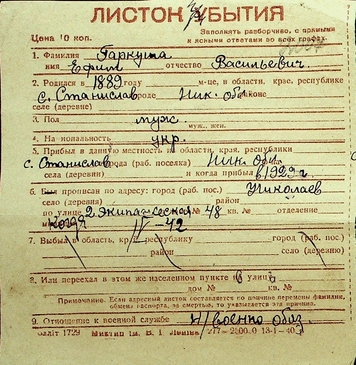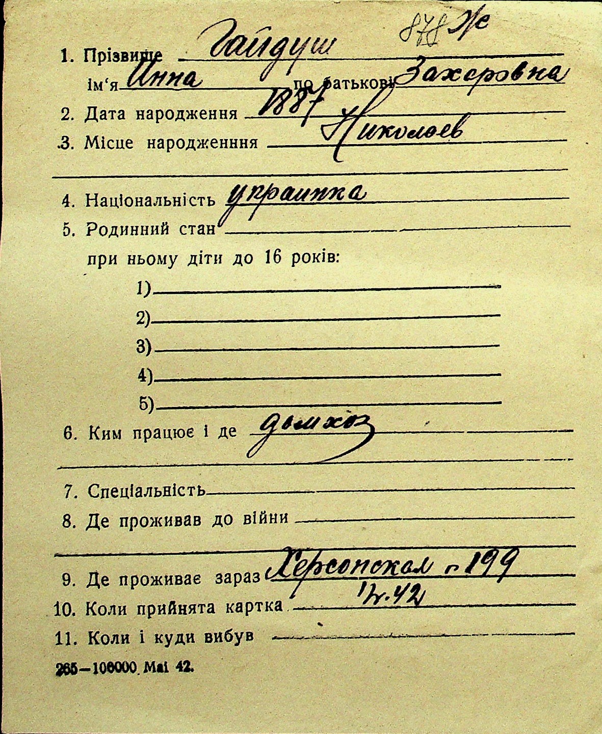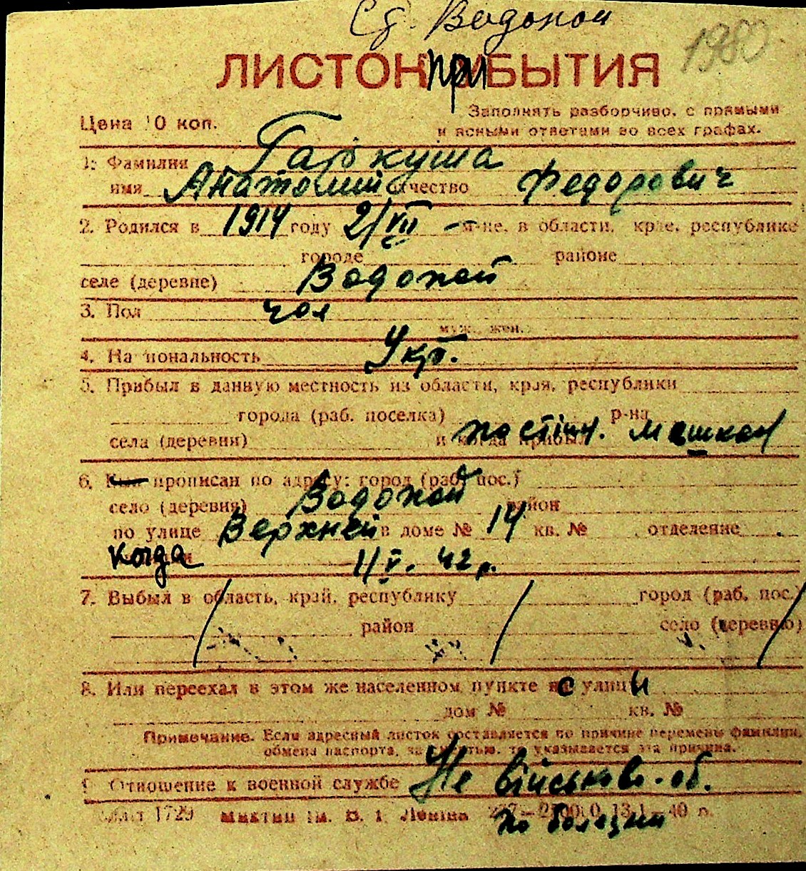 • • Перелік карток до фонду № Н-1016