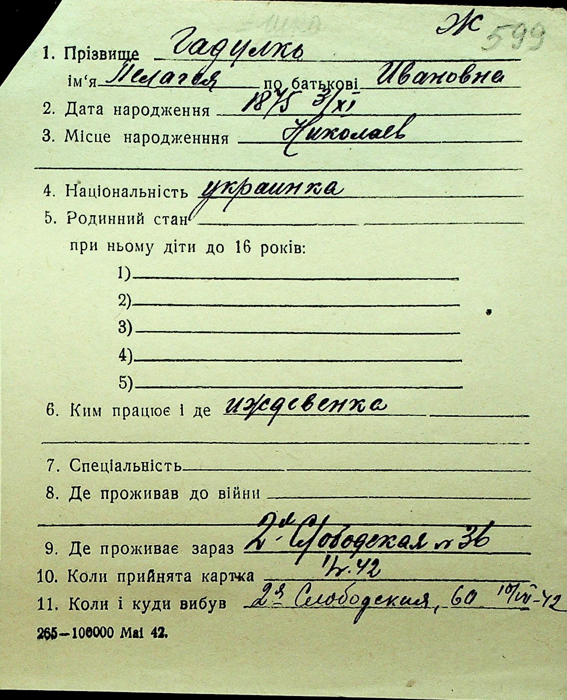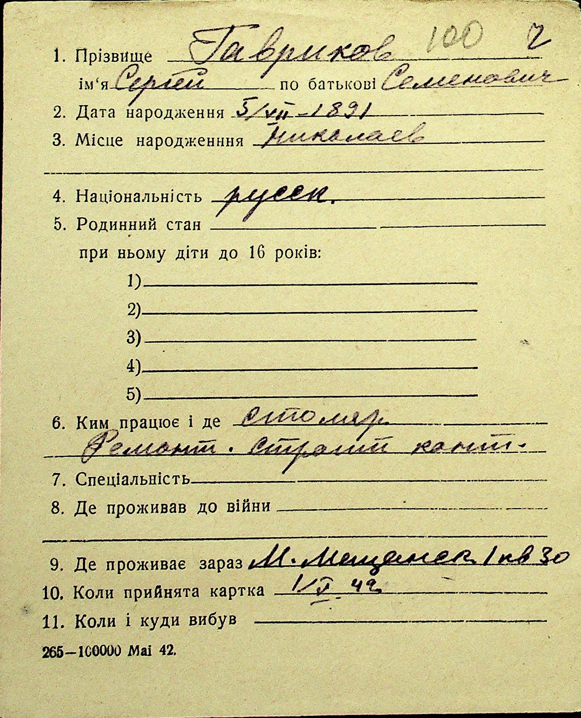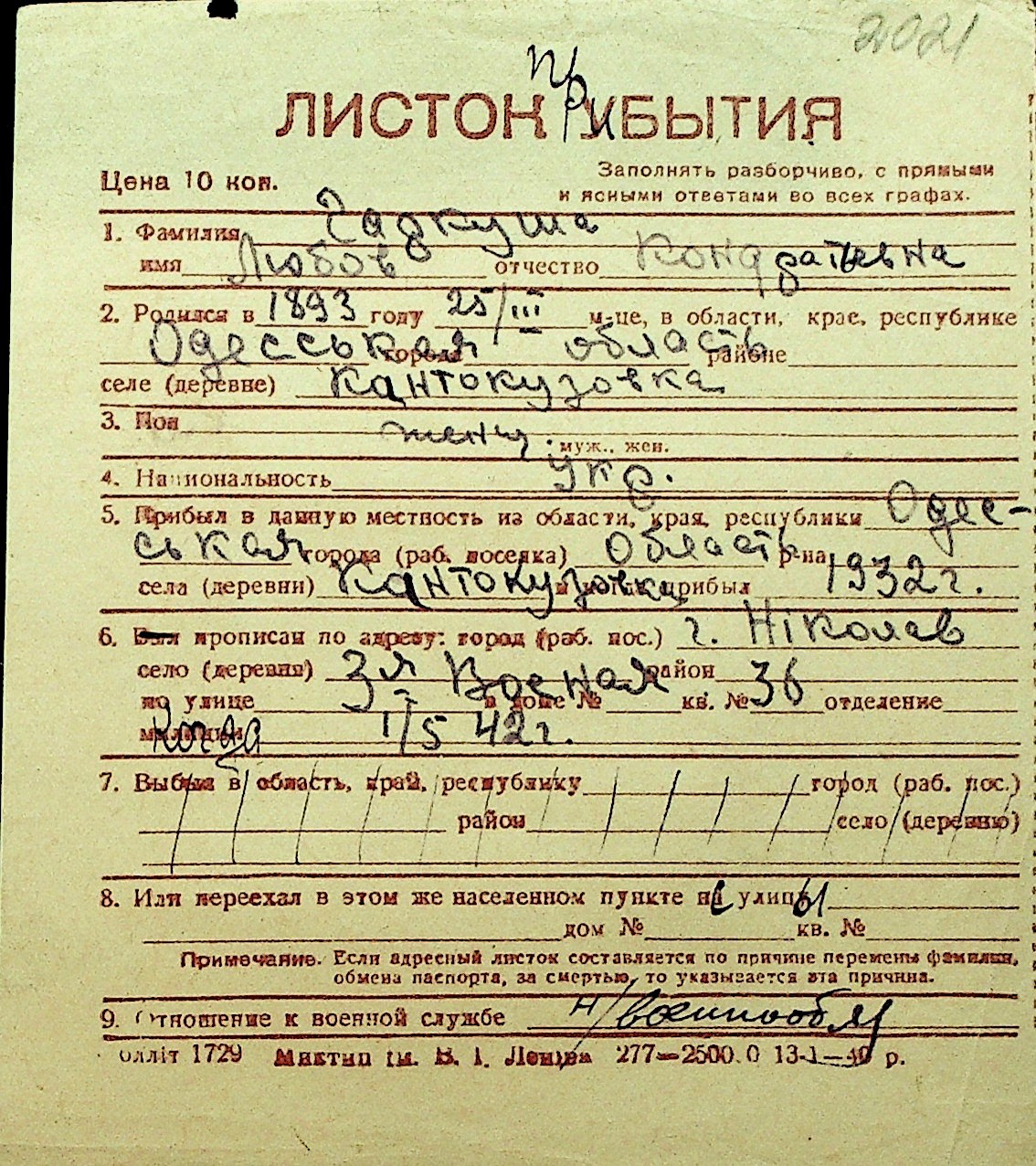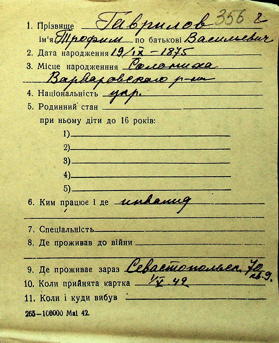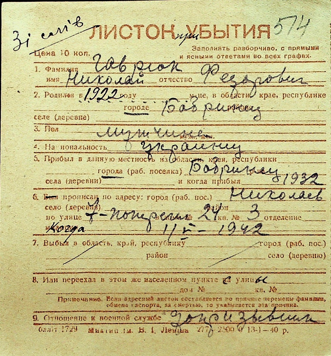 • • Перелік карток до фонду № Н-1016